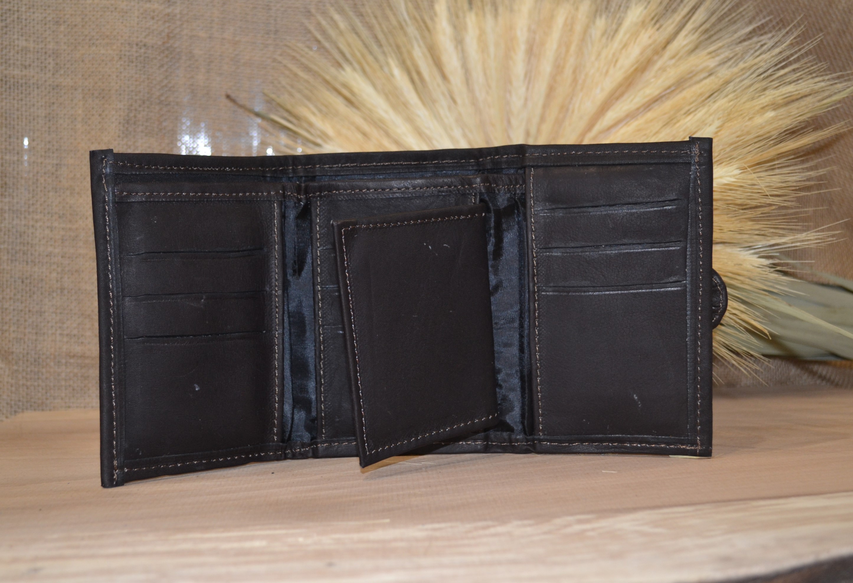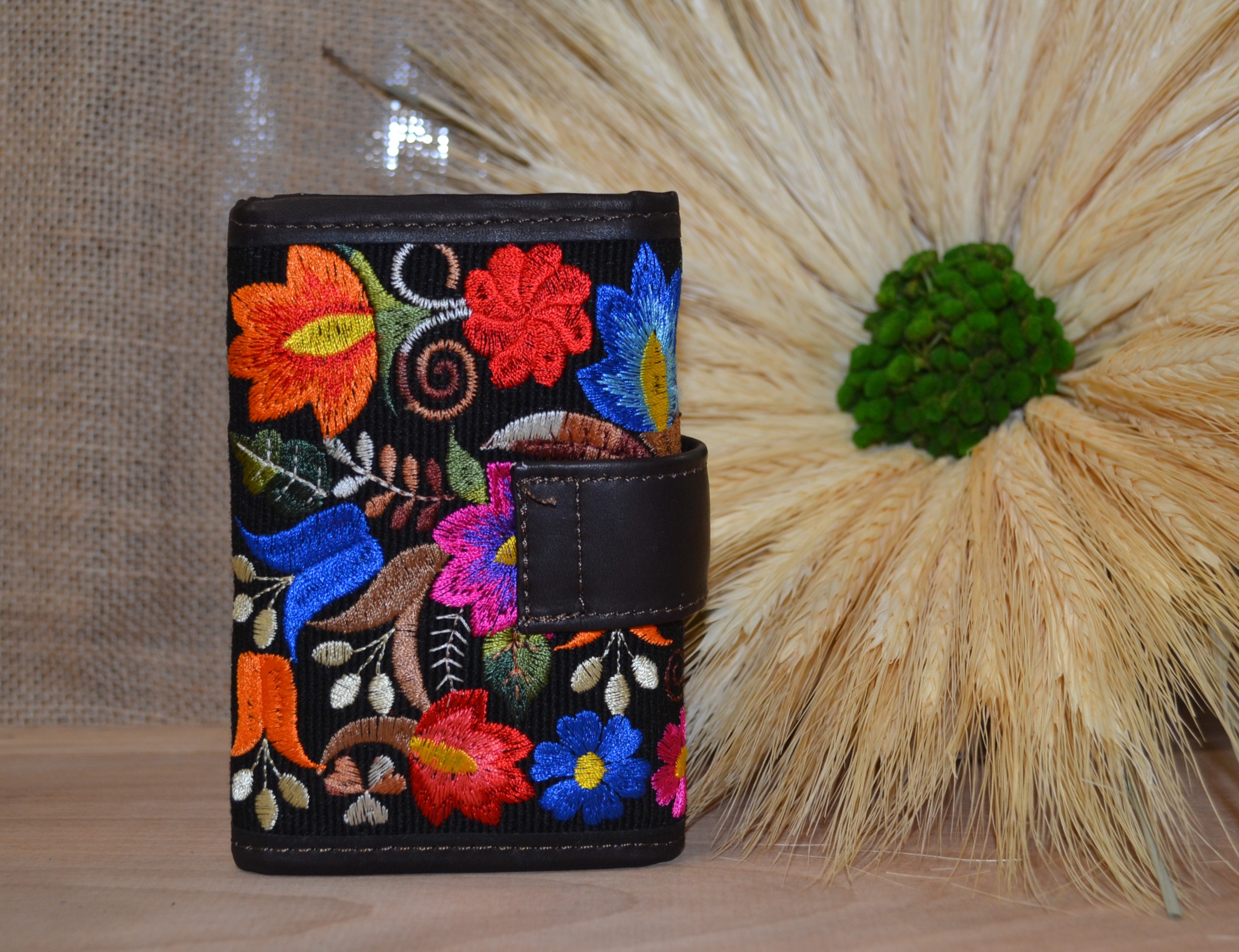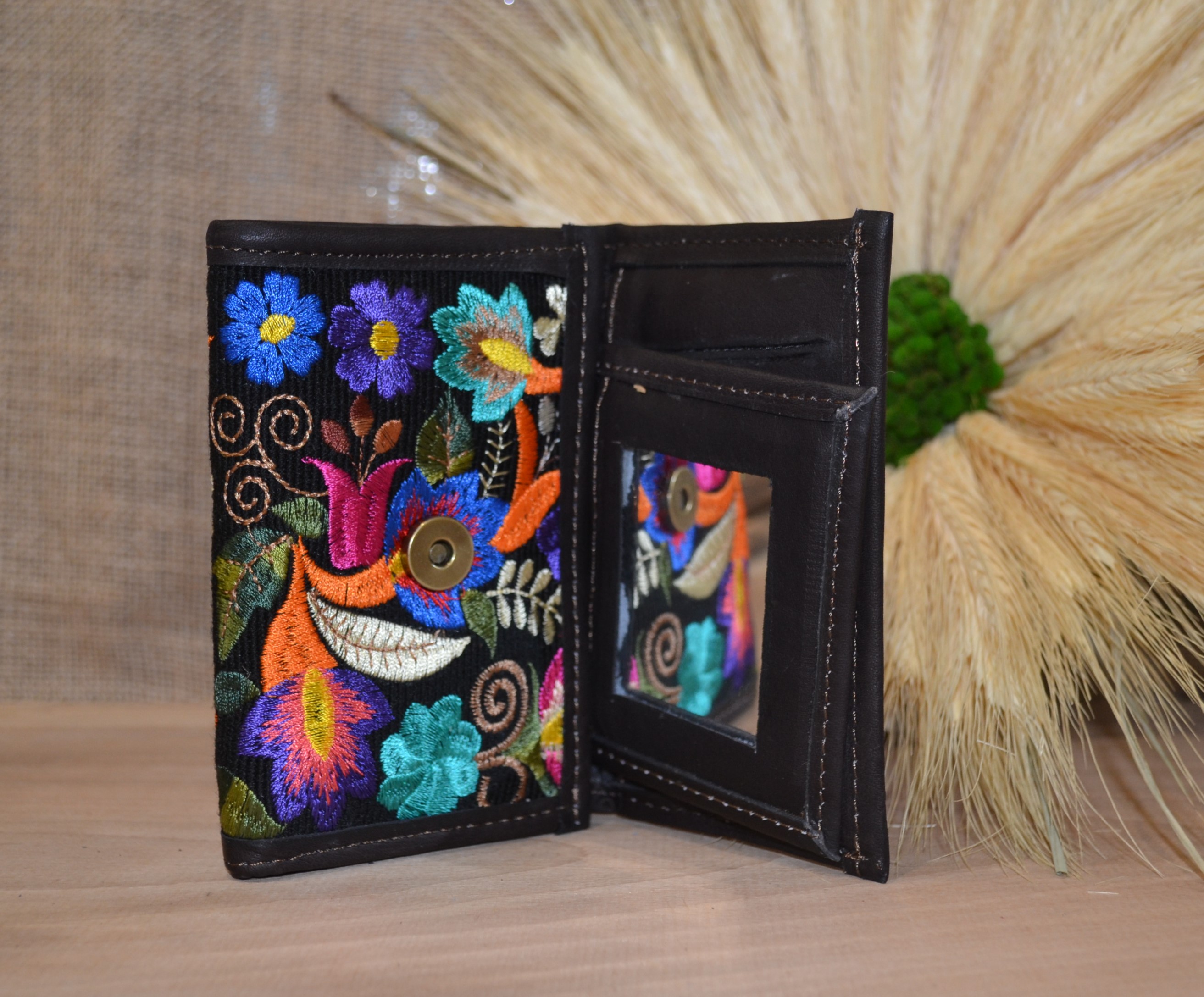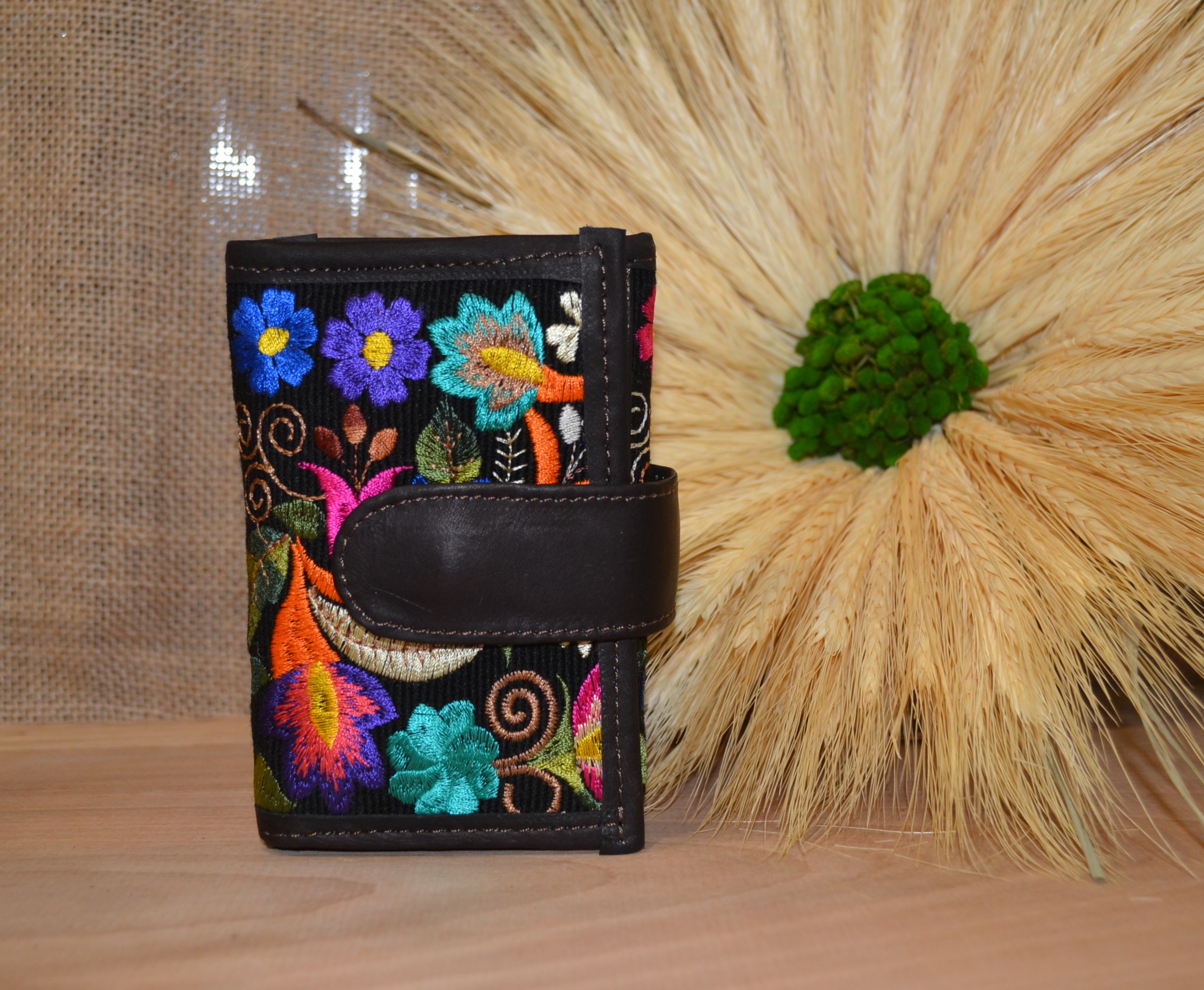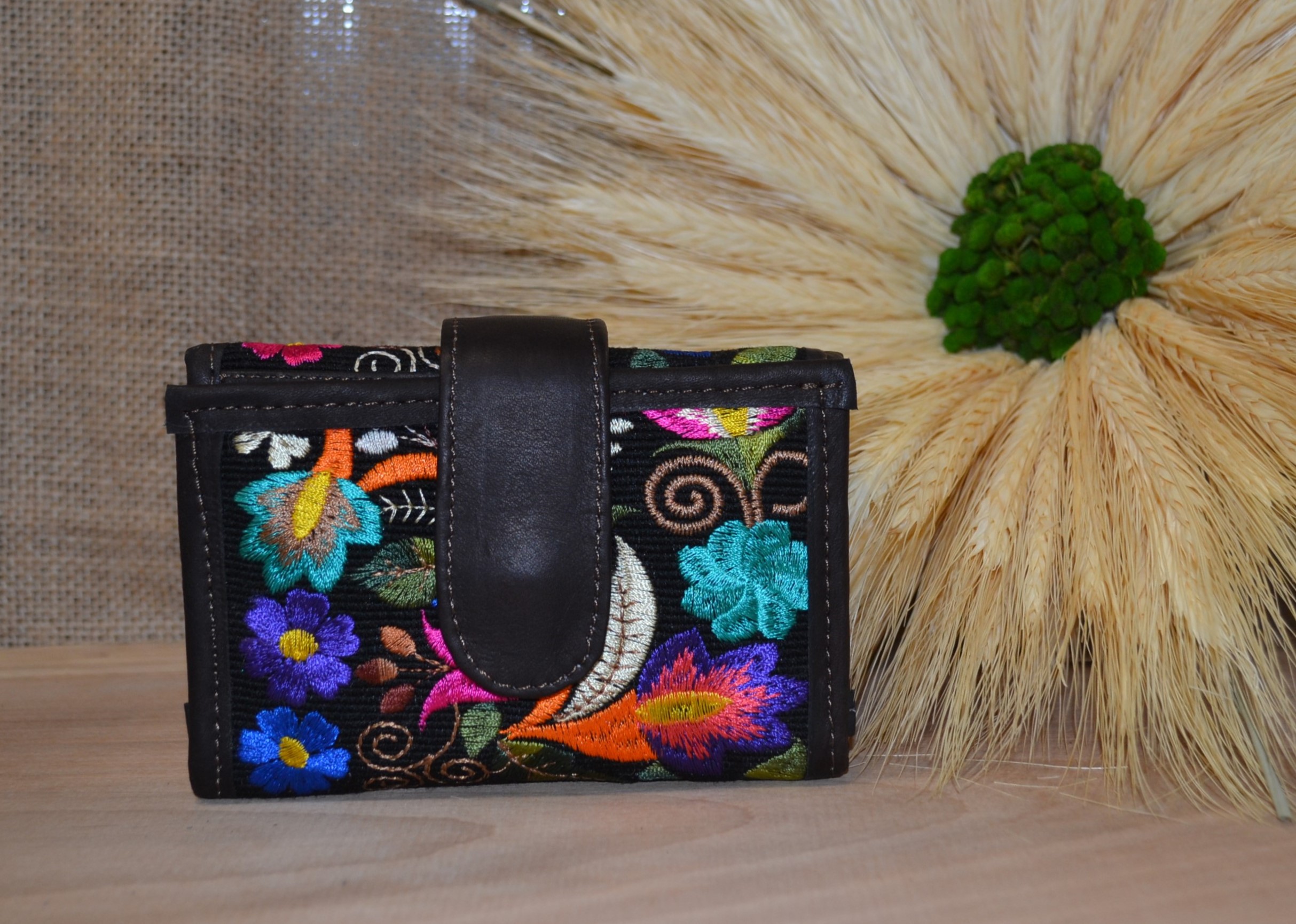 Jeśli szukasz małego zgrabnego portfela z portmonetką to ten model jest dla ciebie . 100 % naturalna ciemnobrązowa skóra pokryta kwiatowym kolorowym haftem . Zaprojektowany i uszyty wysoko w Ekwadorskich Andach przez mały rzemieślniczy warsztat kaletniczy. Portfel posiada przegrodę na banknoty i na monety a także kieszonki na karty płatnicze.