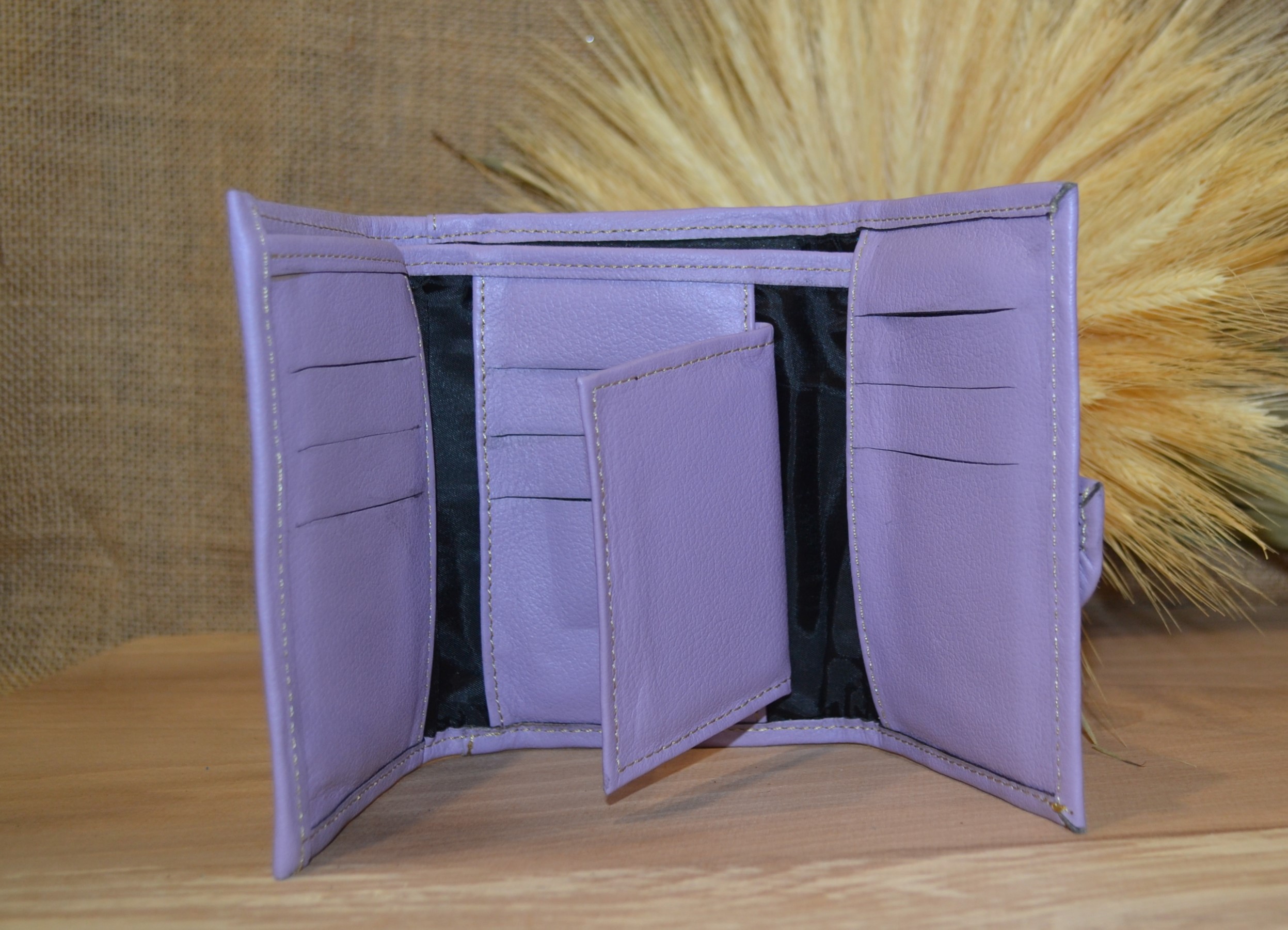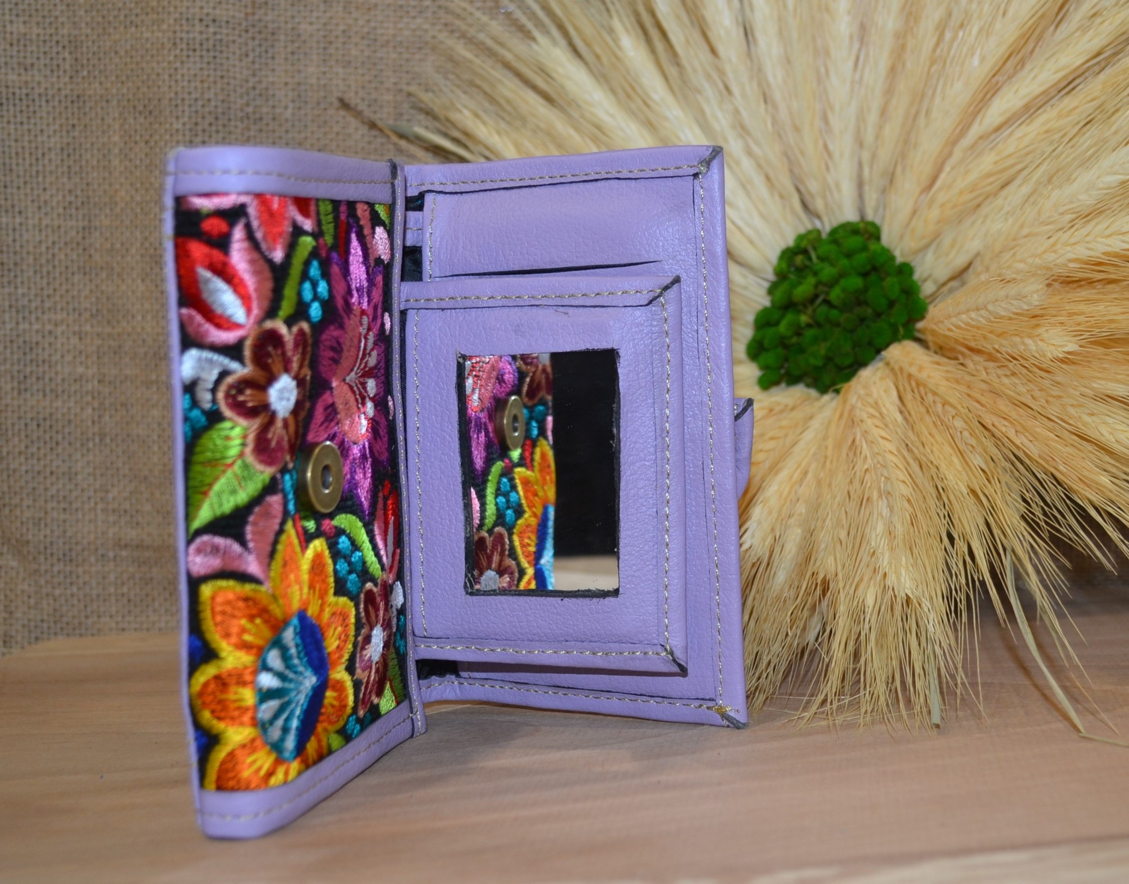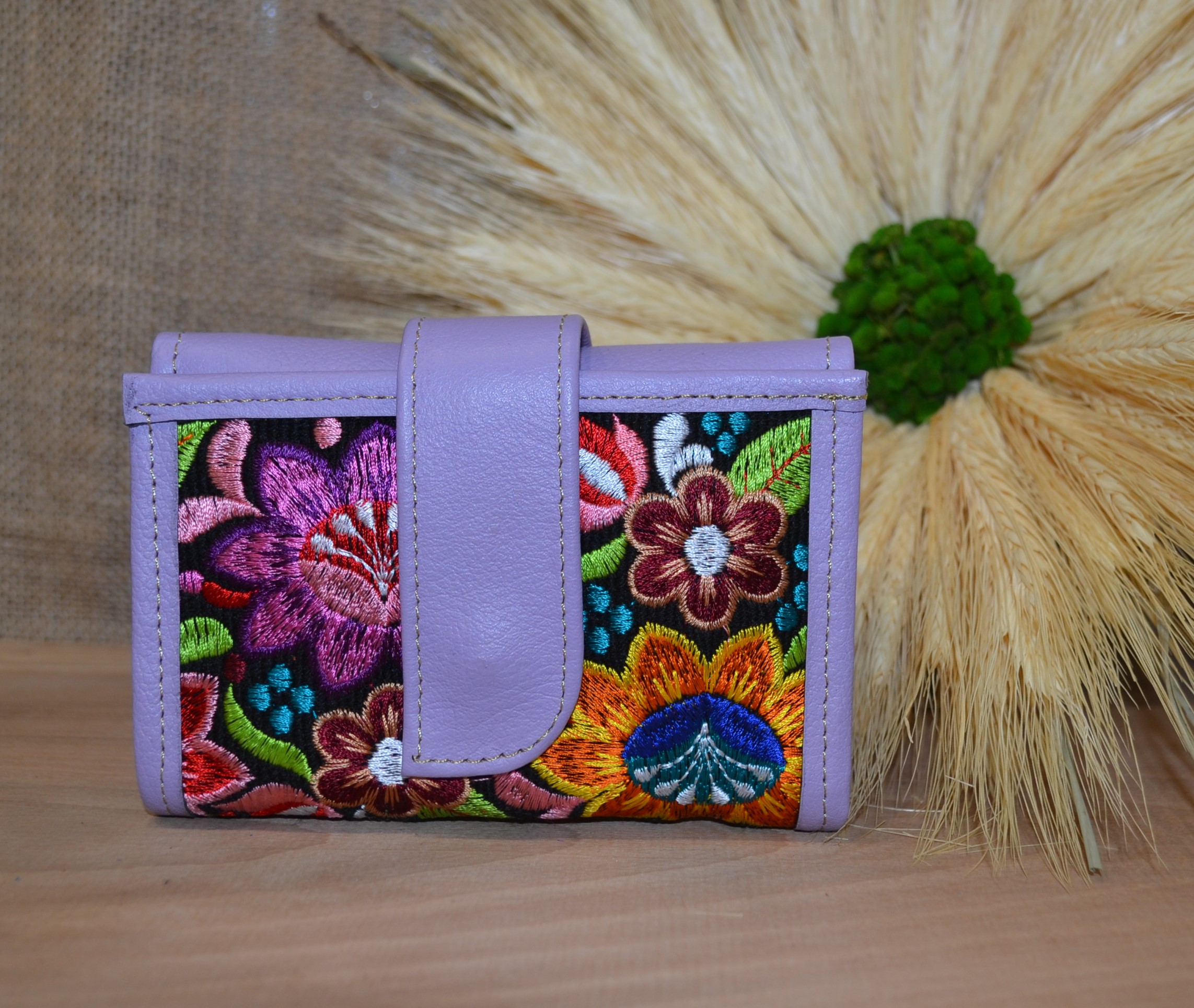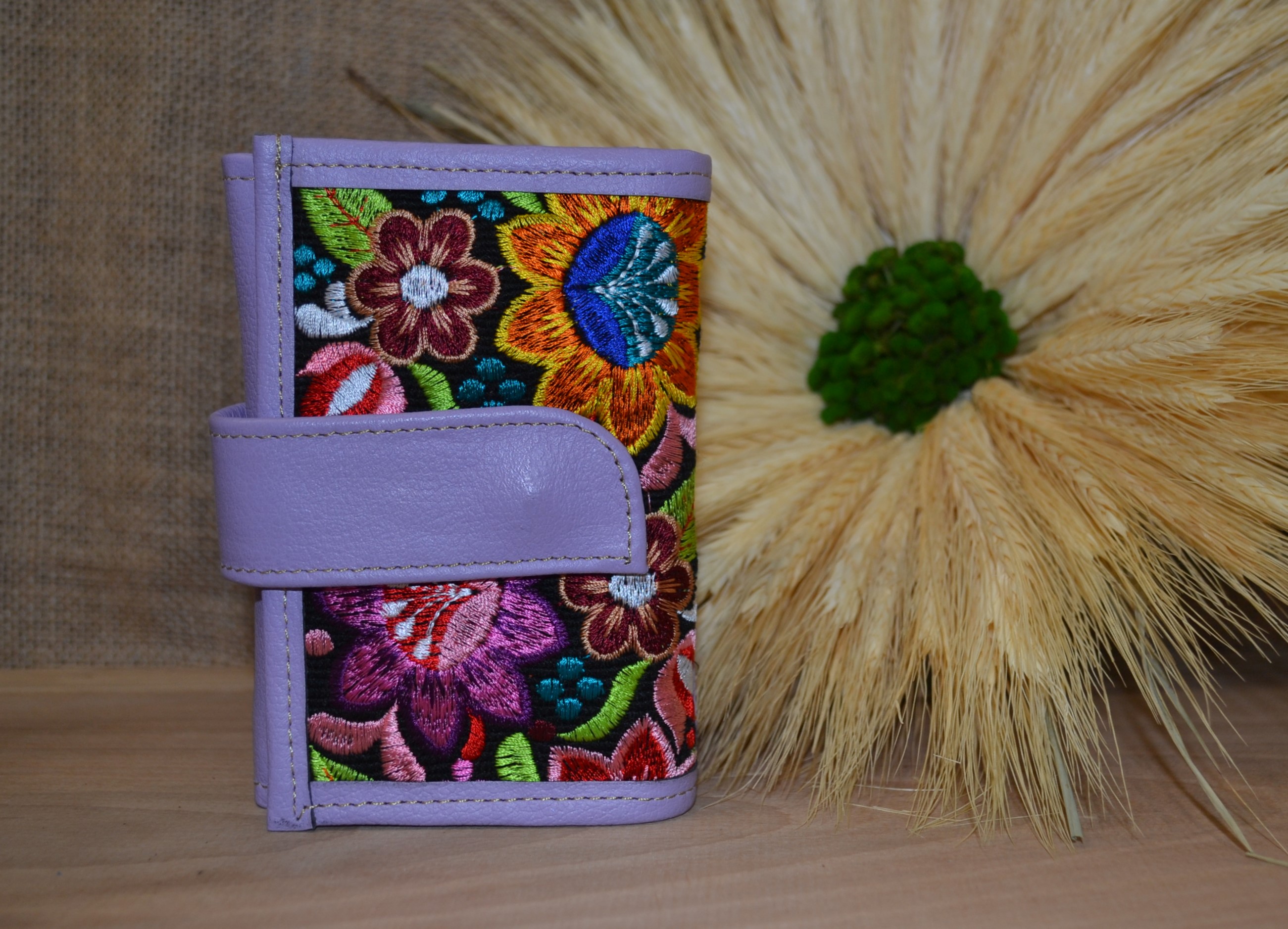 Jeśli szukasz małego zgrabnego portfela z portmonetką to ten model jest dla ciebie . 100 % naturalna fioletowa skóra pokryta kwiatowym kolorowym haftem . Zaprojektowany i uszyty wysoko w Ekwadorskich Andach przez mały rzemieślniczy warsztat kaletniczy. Portfel posiada przegrodę na banknoty i na monety a także kieszonki na karty płatnicze.