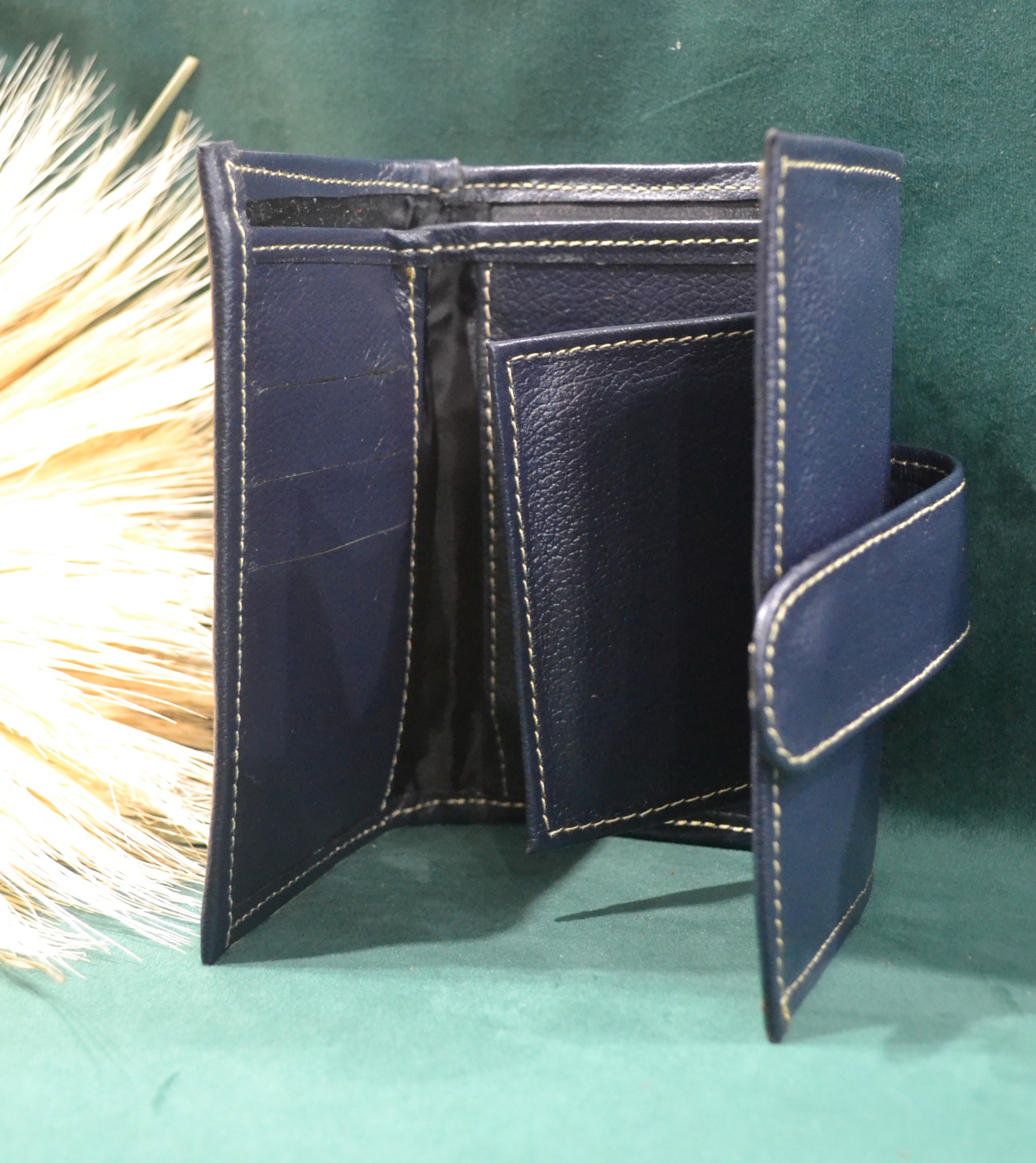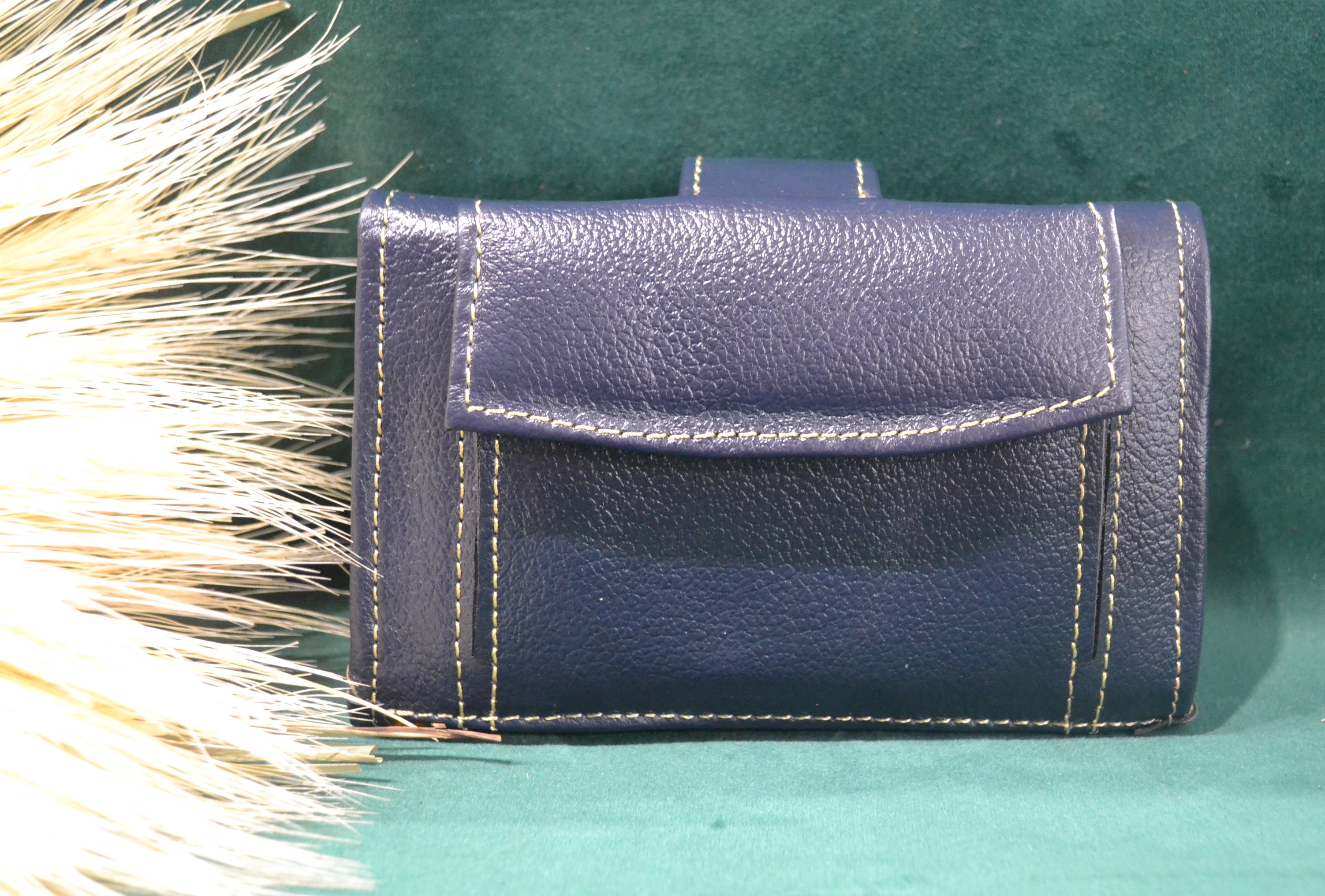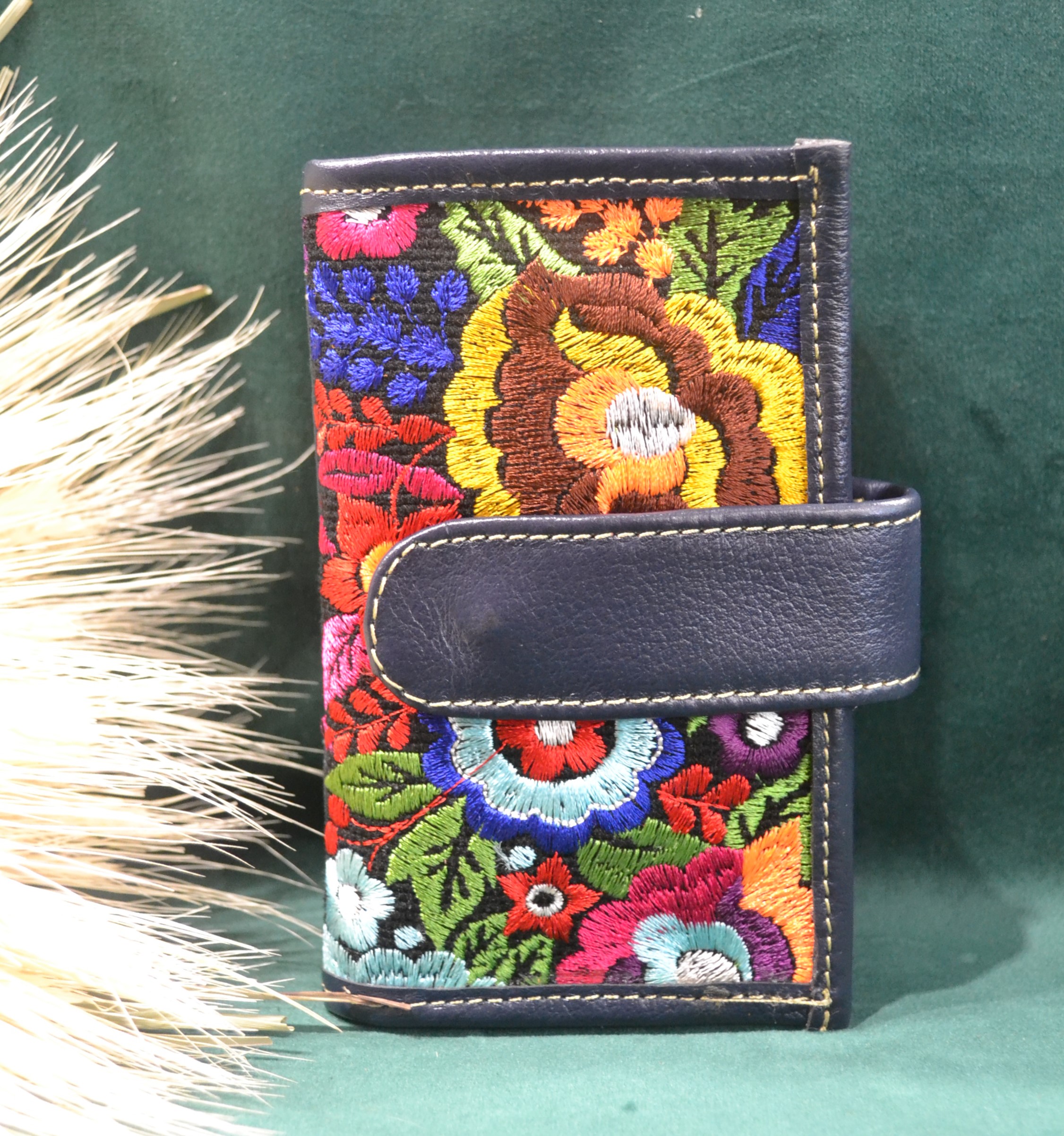 Jeśli szukasz małego zgrabnego portfela z portmonetką to ten model jest dla ciebie . 100% naturalna granatowa skóra pokryta kwiatowym kolorowym haftem . Zaprojektowany i uszyty wysoko w Ekwadorskich Andach przez mały rzemieślniczy warsztat kaletniczy. Portfel posiada przegrodę na banknoty i na monety a także kieszonki na karty płatnicze.