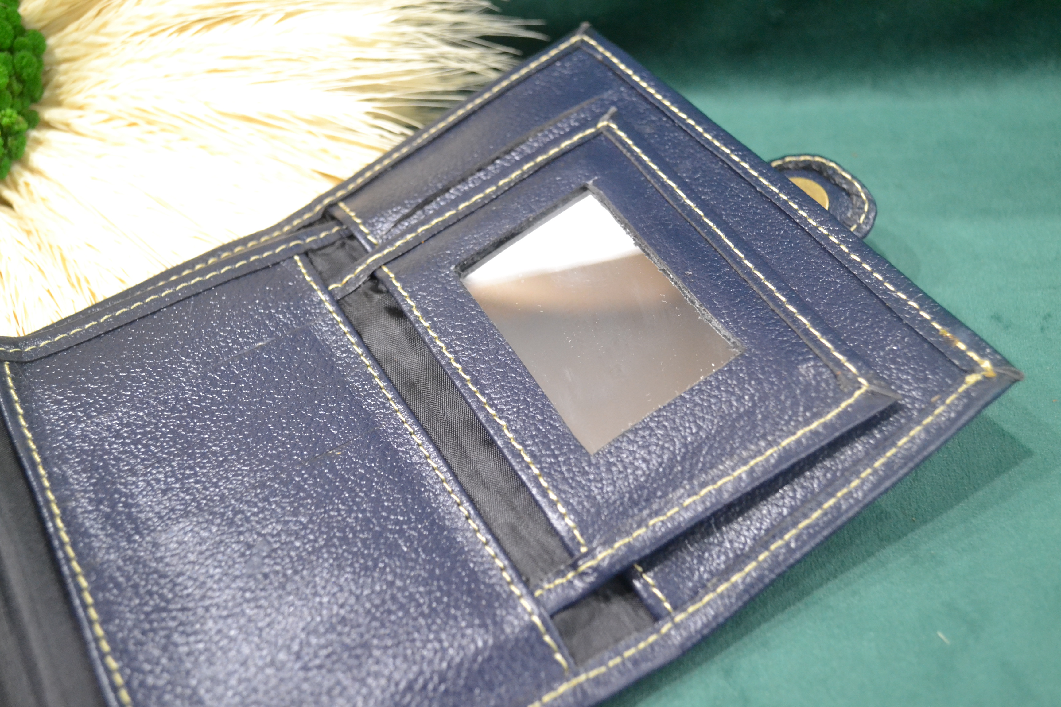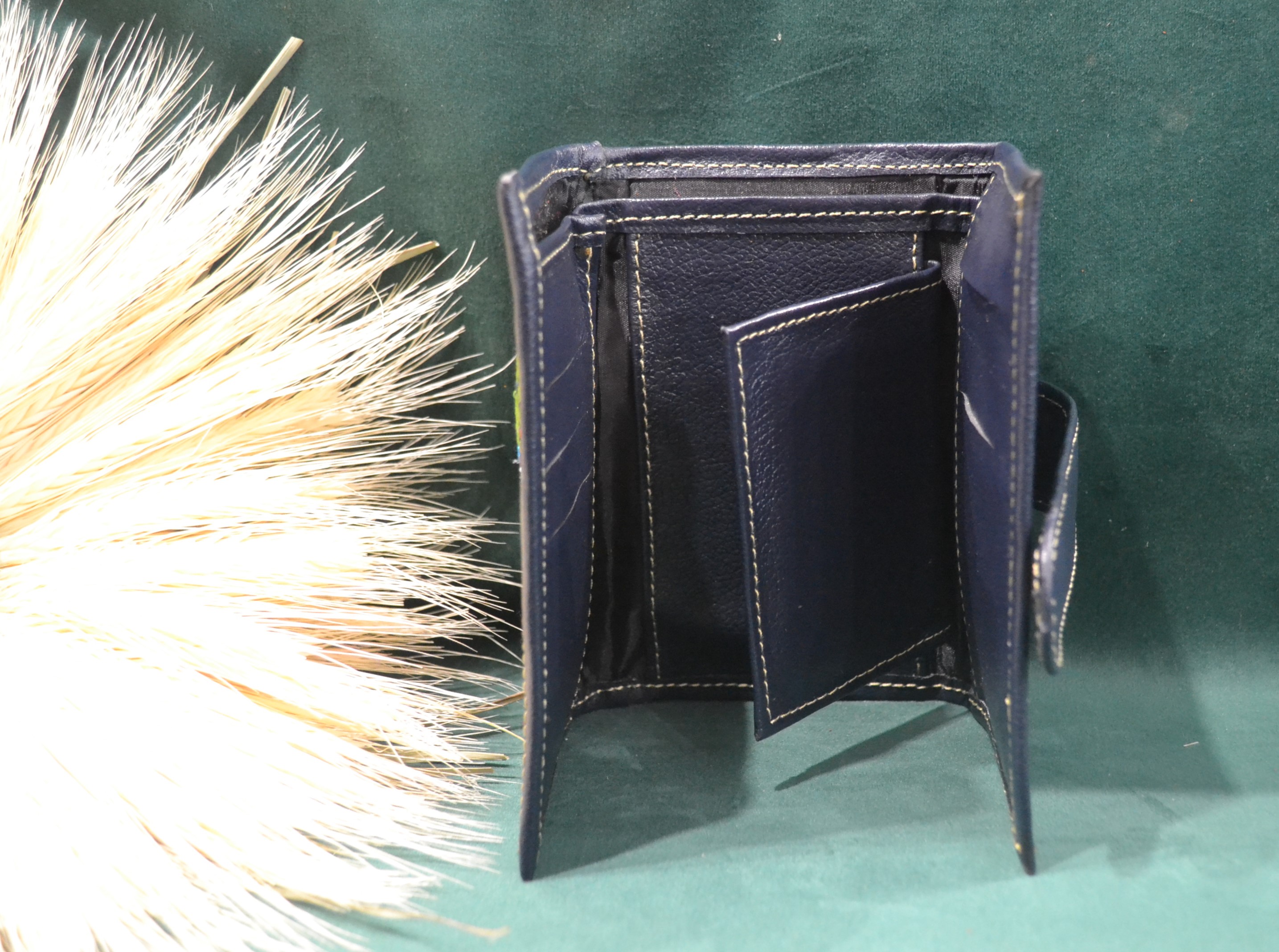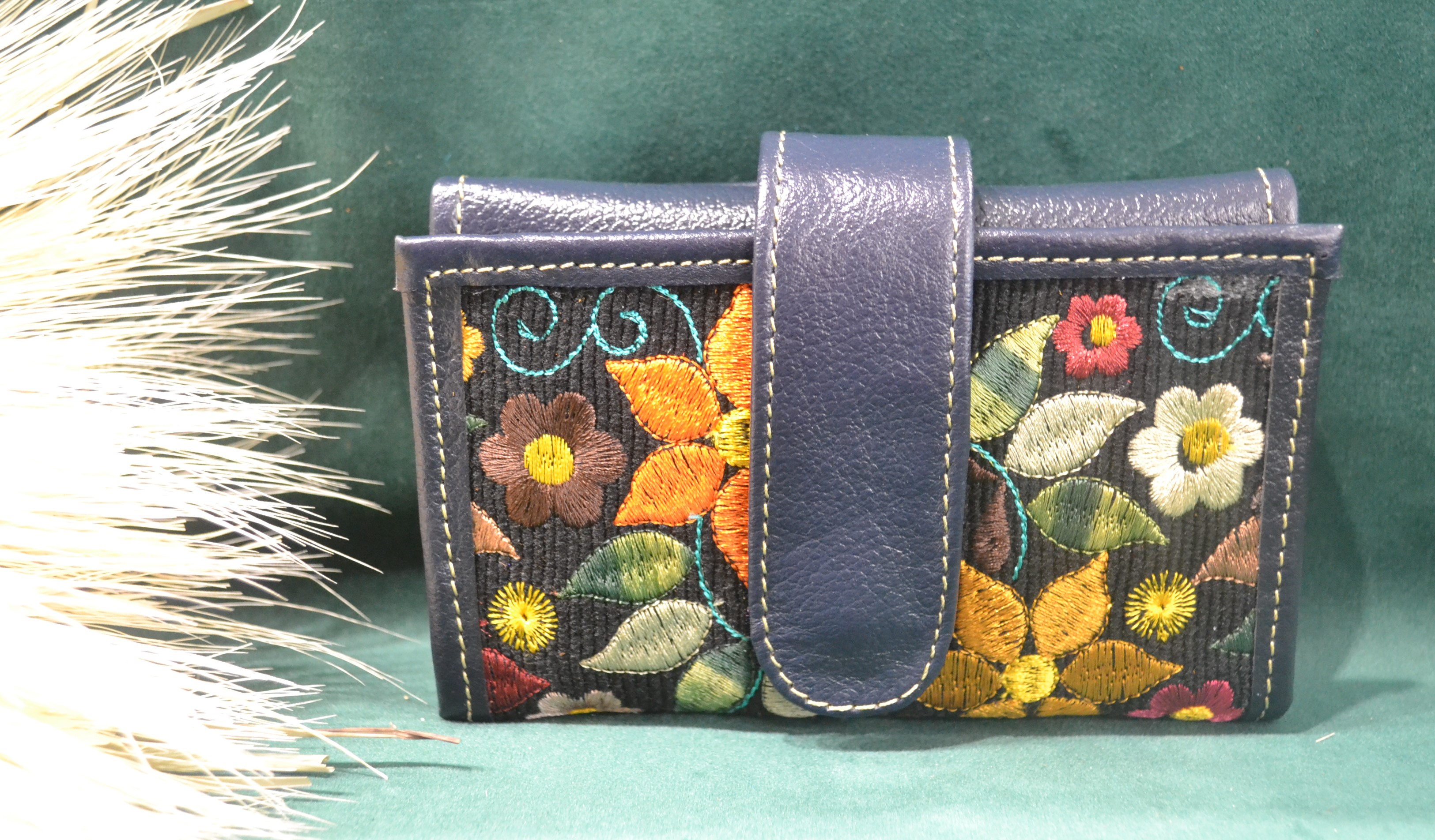 Jeśli szukasz małego zgrabnego portfela z portmonetką to ten model jest dla ciebie . 100 % naturalna granatowa skóra pokryta kwiatowym kolorowym haftem . Zaprojektowany i uszyty wysoko w Ekwadorskich Andach przez mały rzemieślniczy warsztat kaletniczy. Portfel posiada przegrodę na banknoty i na monety a także kieszonki na karty płatnicze.