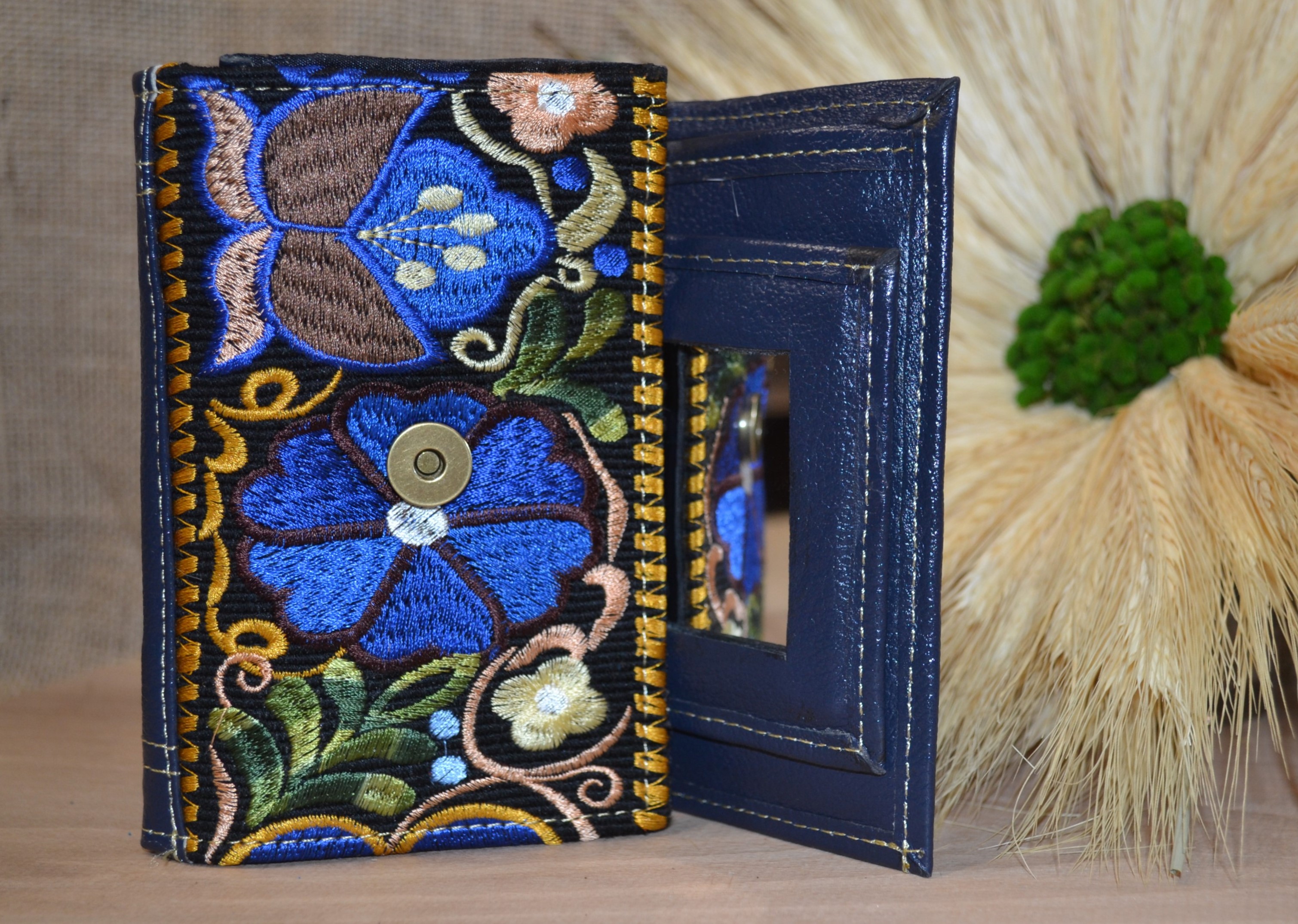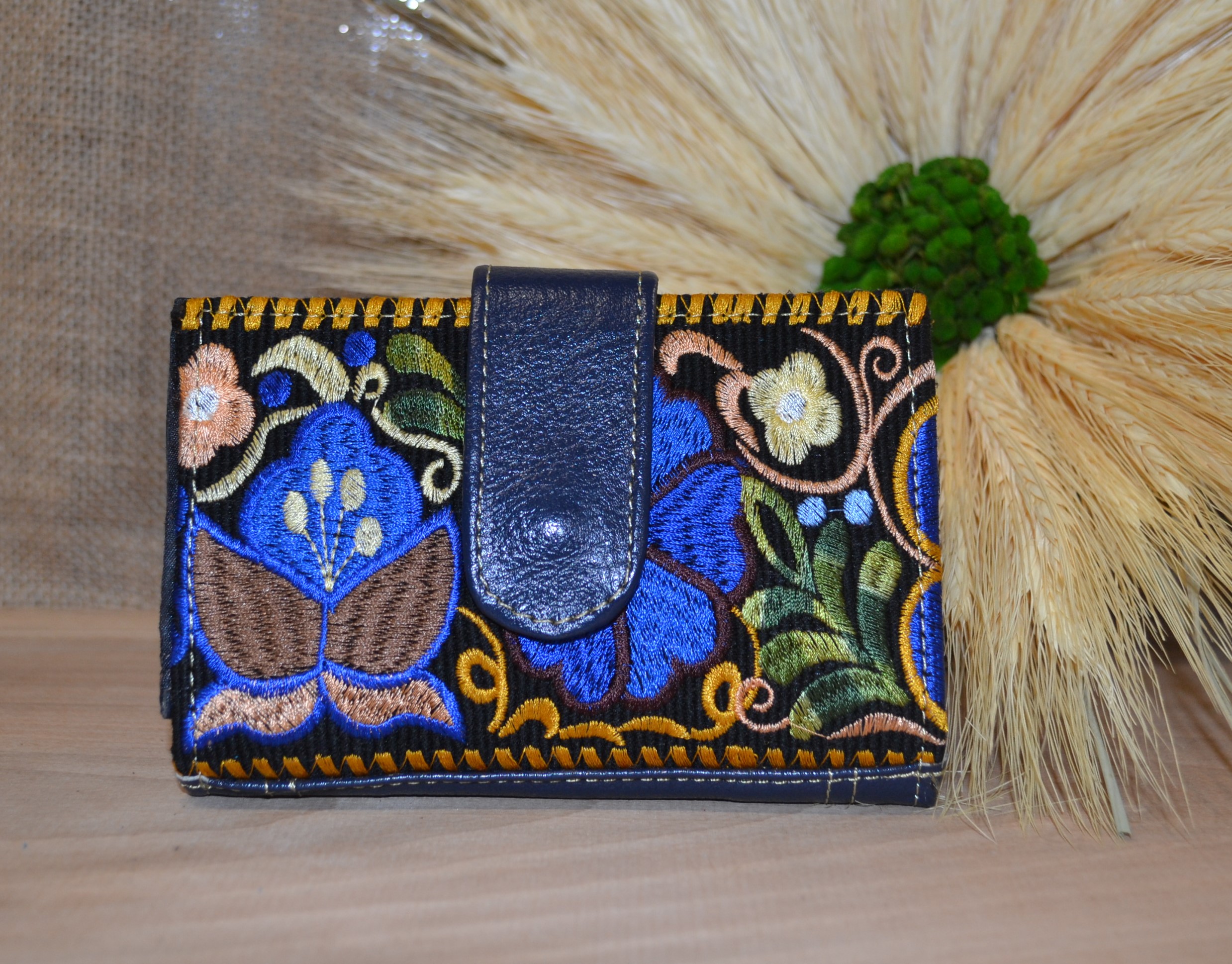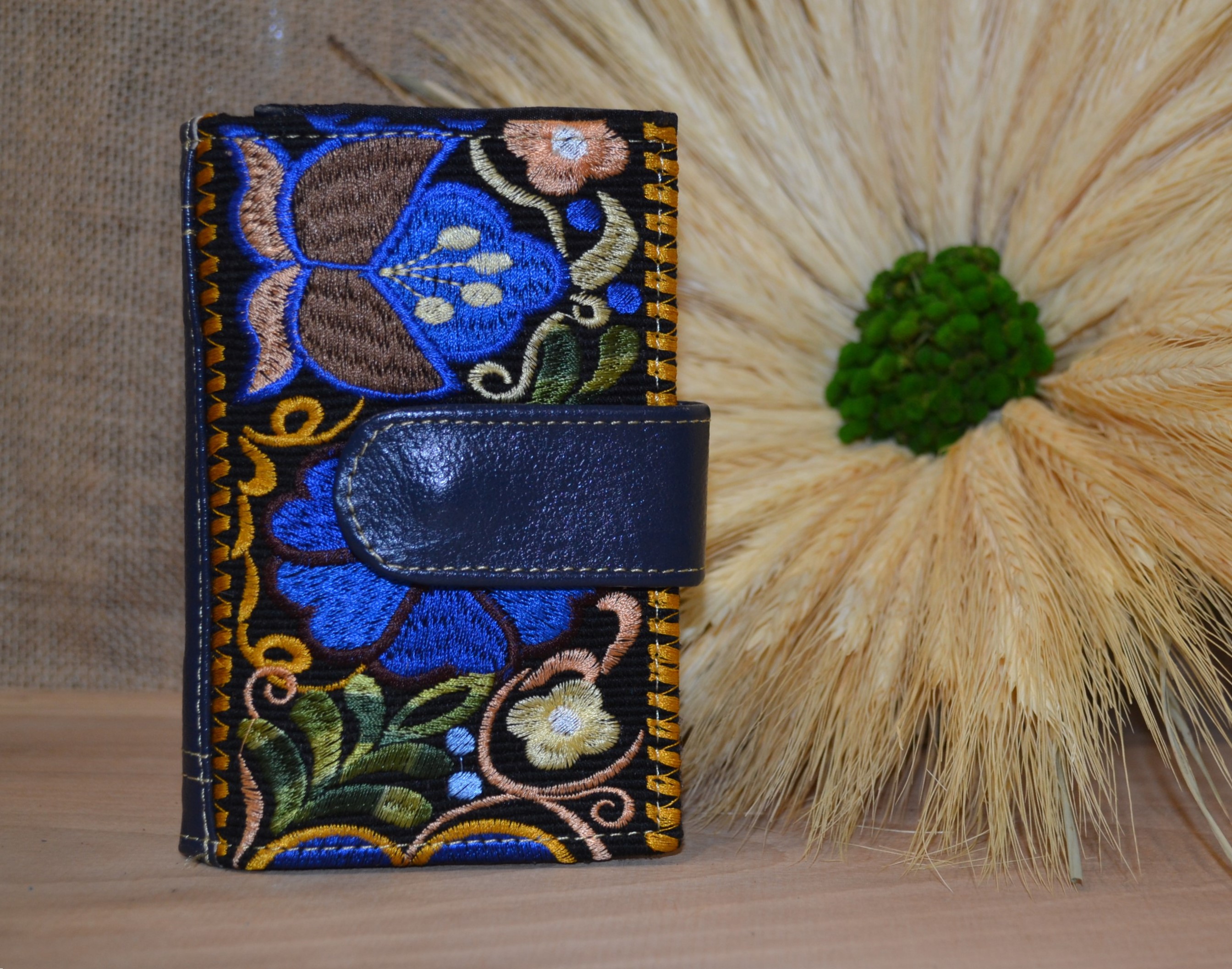 Jeśli szukasz małego zgrabnego portfela z portmonetką to ten model jest dla ciebie . 100 % naturalna granatowa skóra pokryta kwiatowym kolorowym haftem . Zaprojektowany i uszyty wysoko w Ekwadorskich Andach przez mały rzemieślniczy warsztat kaletniczy. Portfel posiada przegrodę na banknoty i na monety a także kieszonki na karty płatnicze.