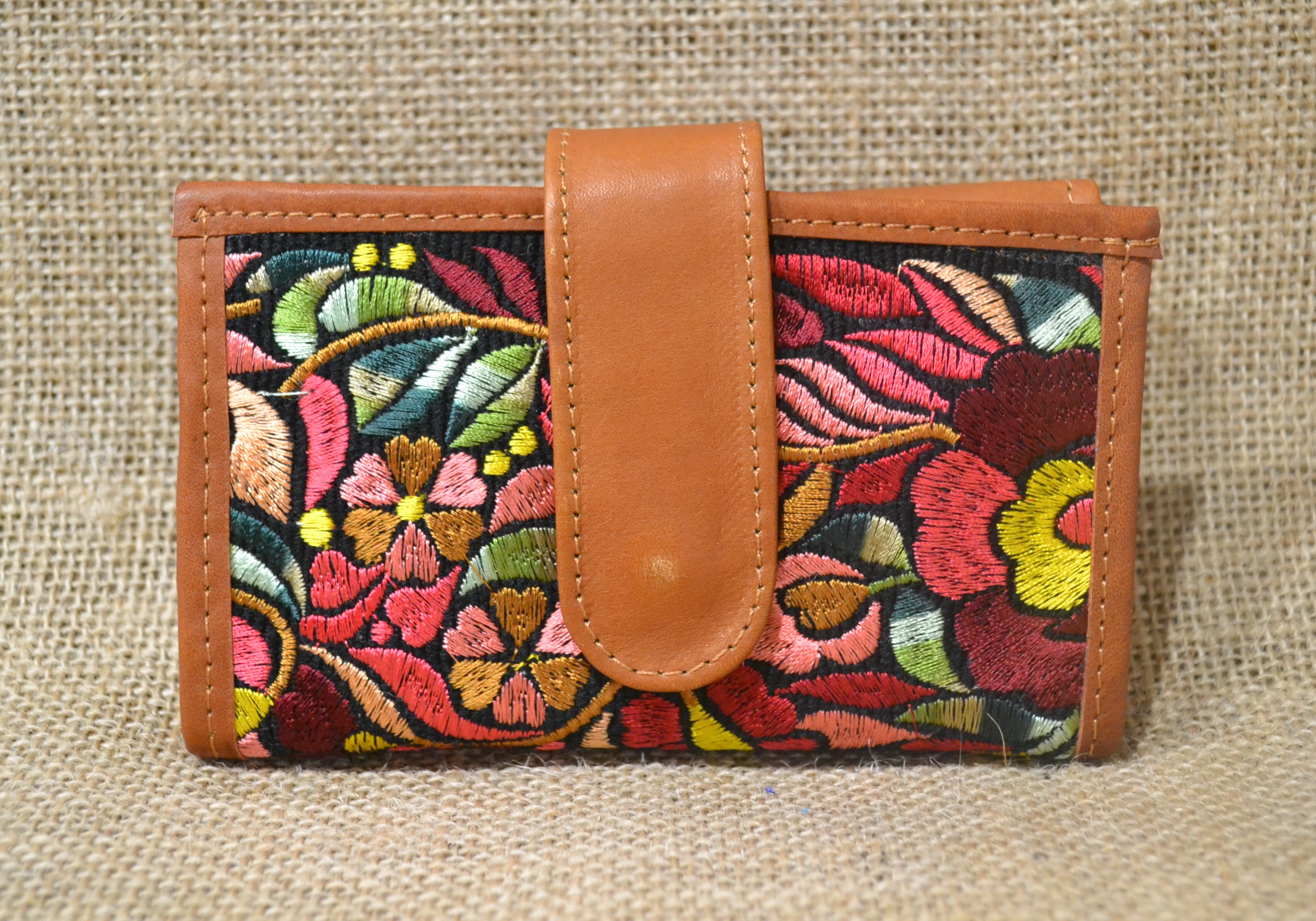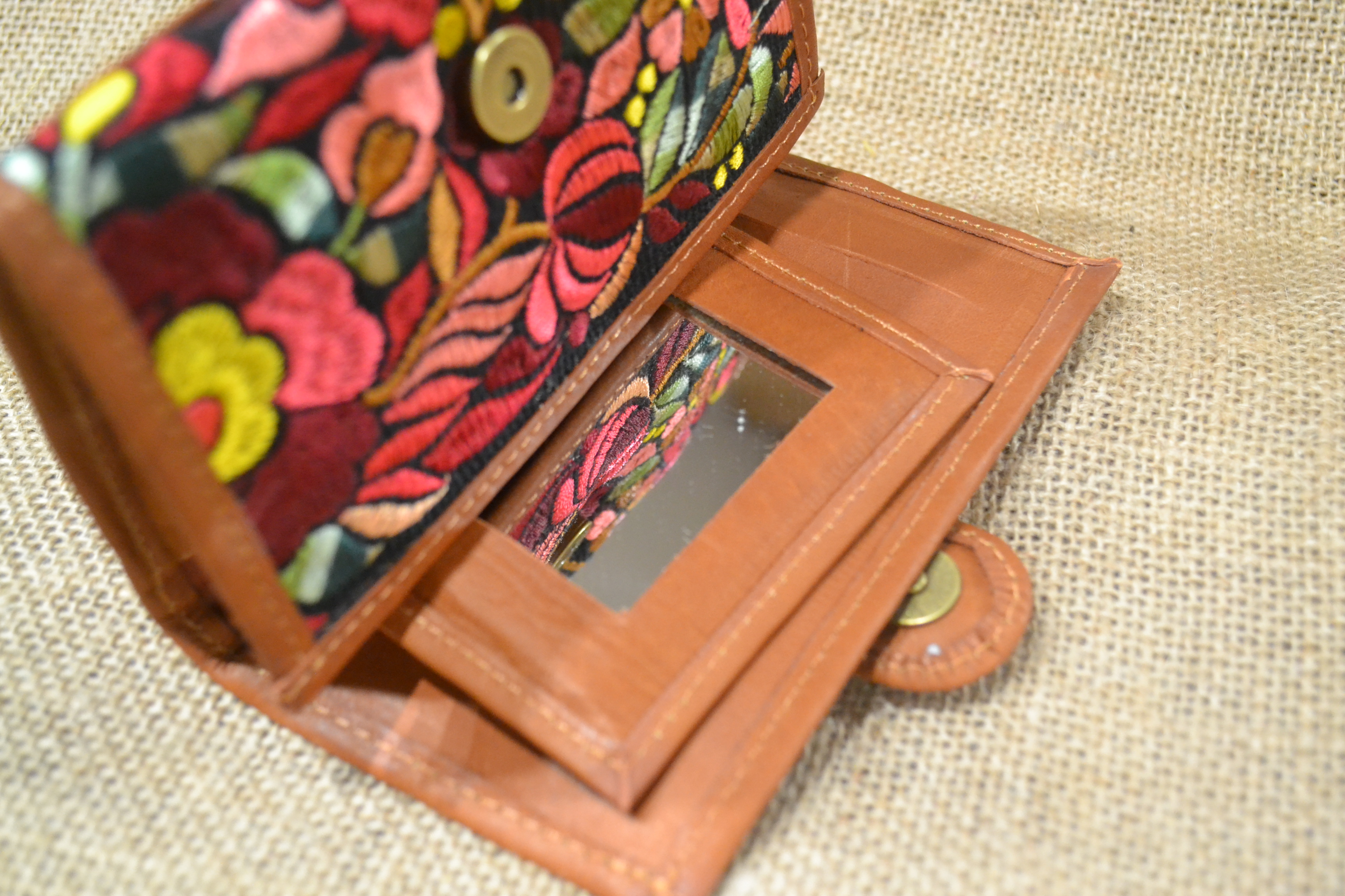 Jeśli szukasz małego zgrabnego portfela z portmonetką to ten model jest dla ciebie . Naturalna 100% jasnobrązowa skóra pokryta kwiatowym kolorowym haftem. Zaprojektowany i uszyty wysoko w Ekwadorskich Andach przez mały rzemieślniczy warsztat kaletniczy. Portfel posiada przegrodę na banknoty i na monety a także kieszonki na karty płatnicze.