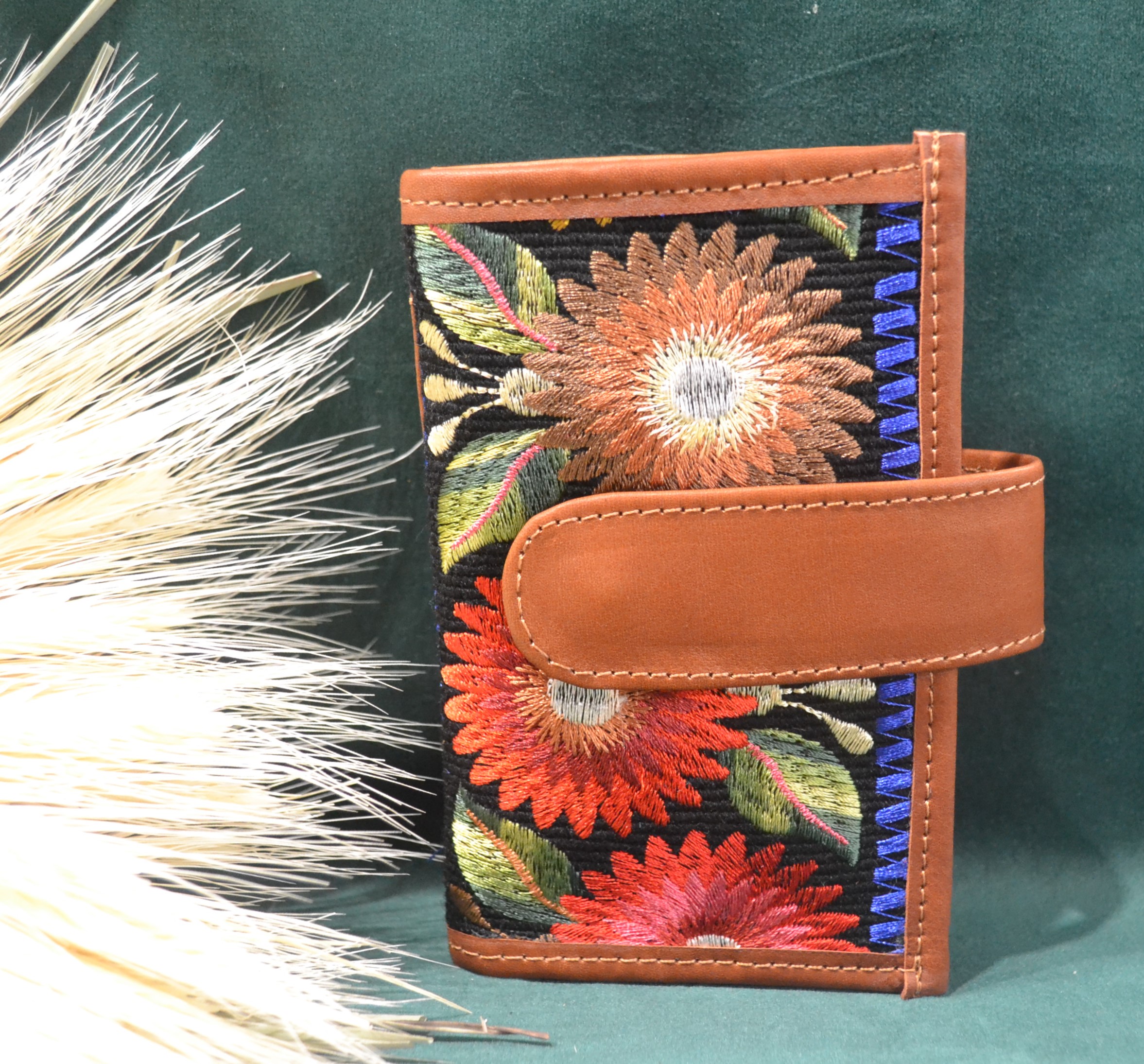 Jeśli szukasz małego zgrabnego portfela z portmonetką to ten model jest dla ciebie . 100 % naturalna jasnobrazowa skóra pokryta kwiatowym kolorowym haftem . Zaprojektowany i uszyty wysoko w Ekwadorskich Andach przez mały rzemieślniczy warsztat kaletniczy. Portfel posiada przegrodę na banknoty i na monety a także kieszonki na karty płatnicze.