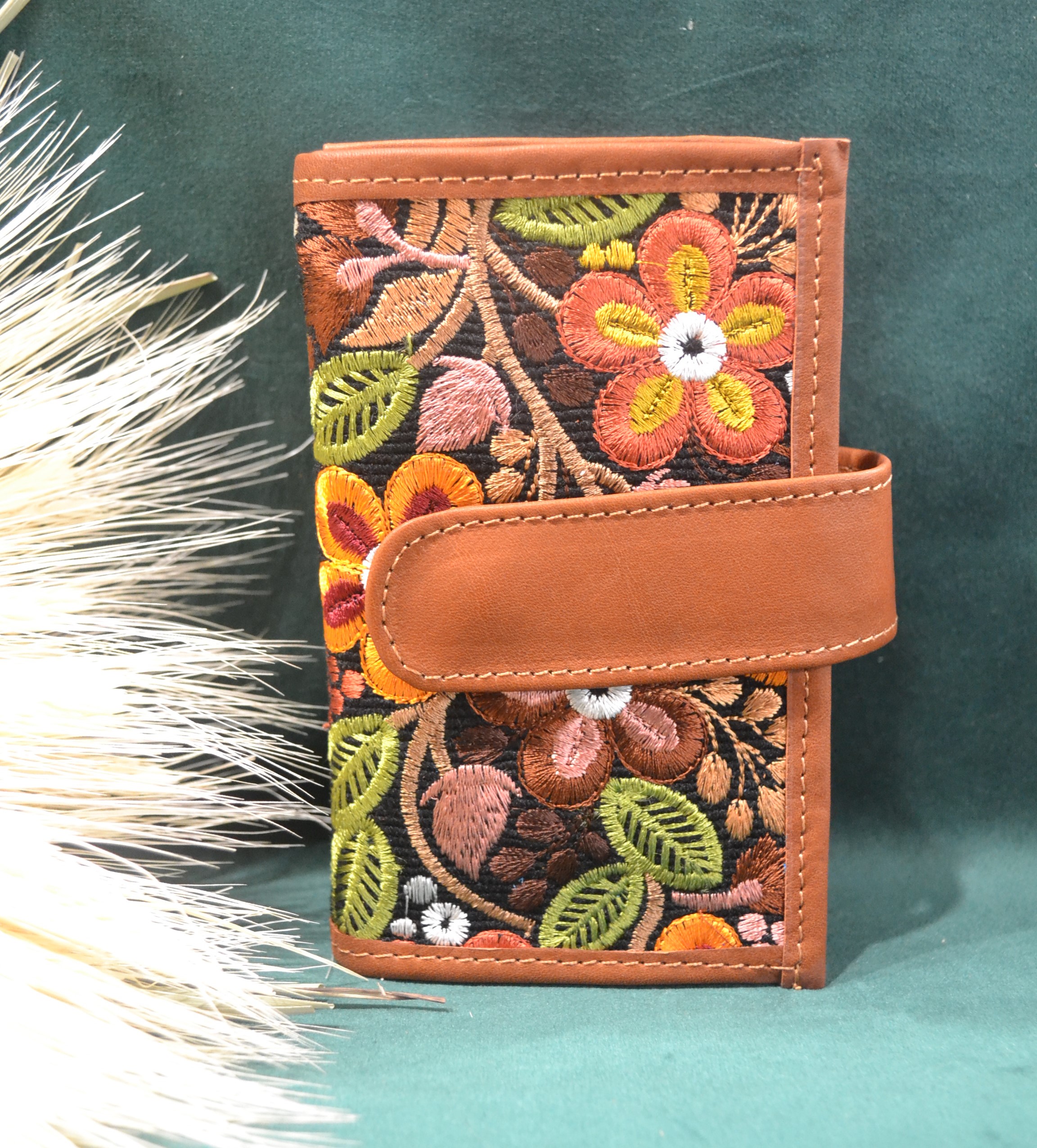 Jeśli szukasz małego zgrabnego portfela z portmonetką to ten model jest dla ciebie . 100 % naturalna jasnobrazowa skóra pokryta kwiatowym kolorowym haftem . Zaprojektowany i uszyty wysoko w Ekwadorskich Andach przez mały rzemieślniczy warsztat kaletniczy. Portfel posiada przegrodę na banknoty i na monety a także kieszonki na karty płatnicze.