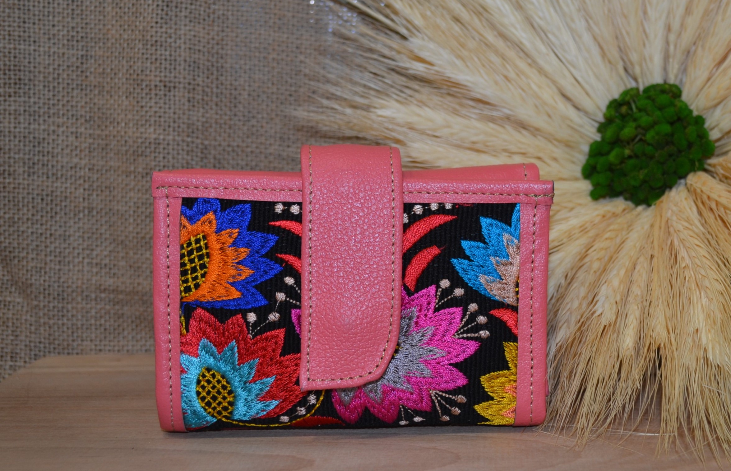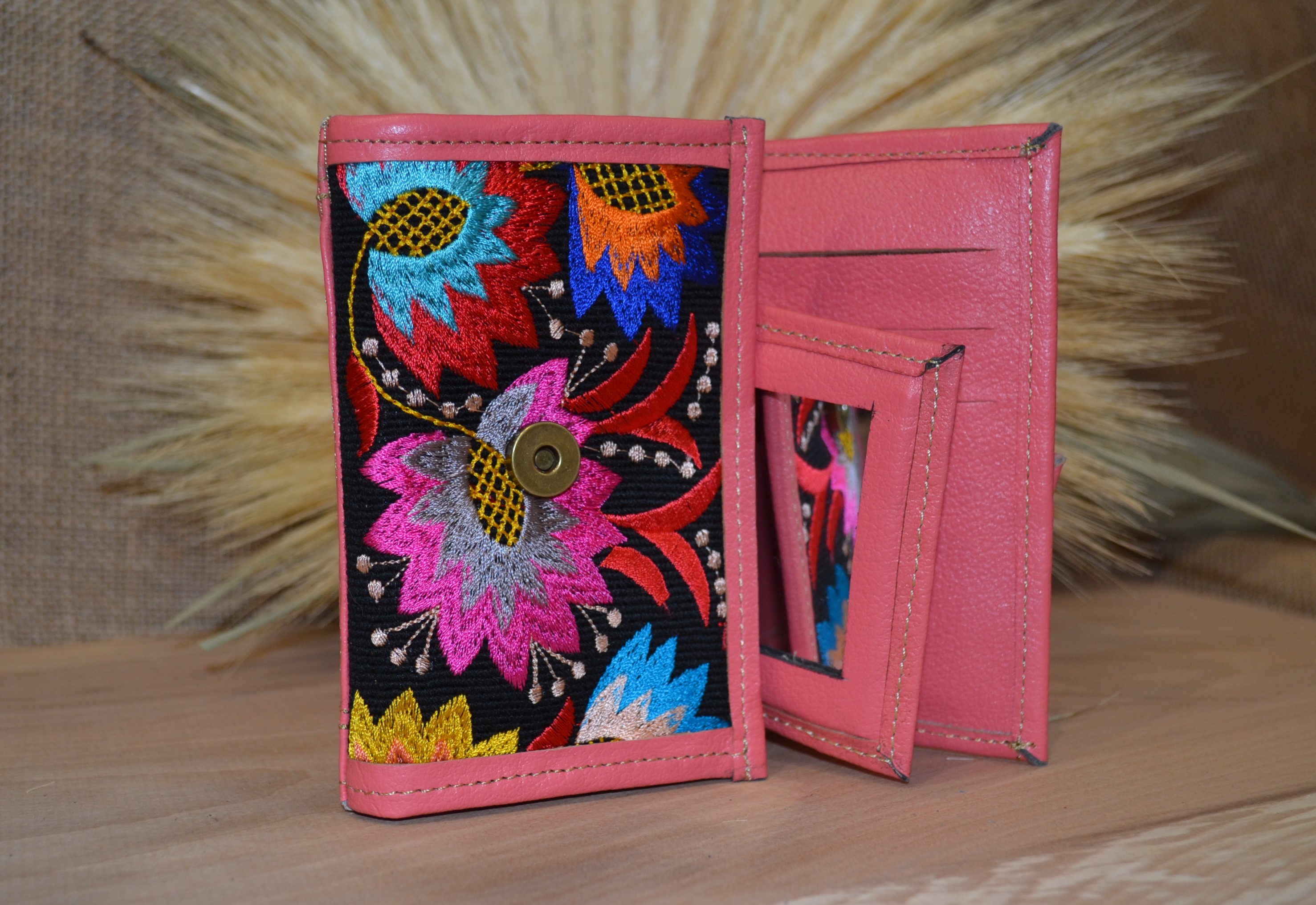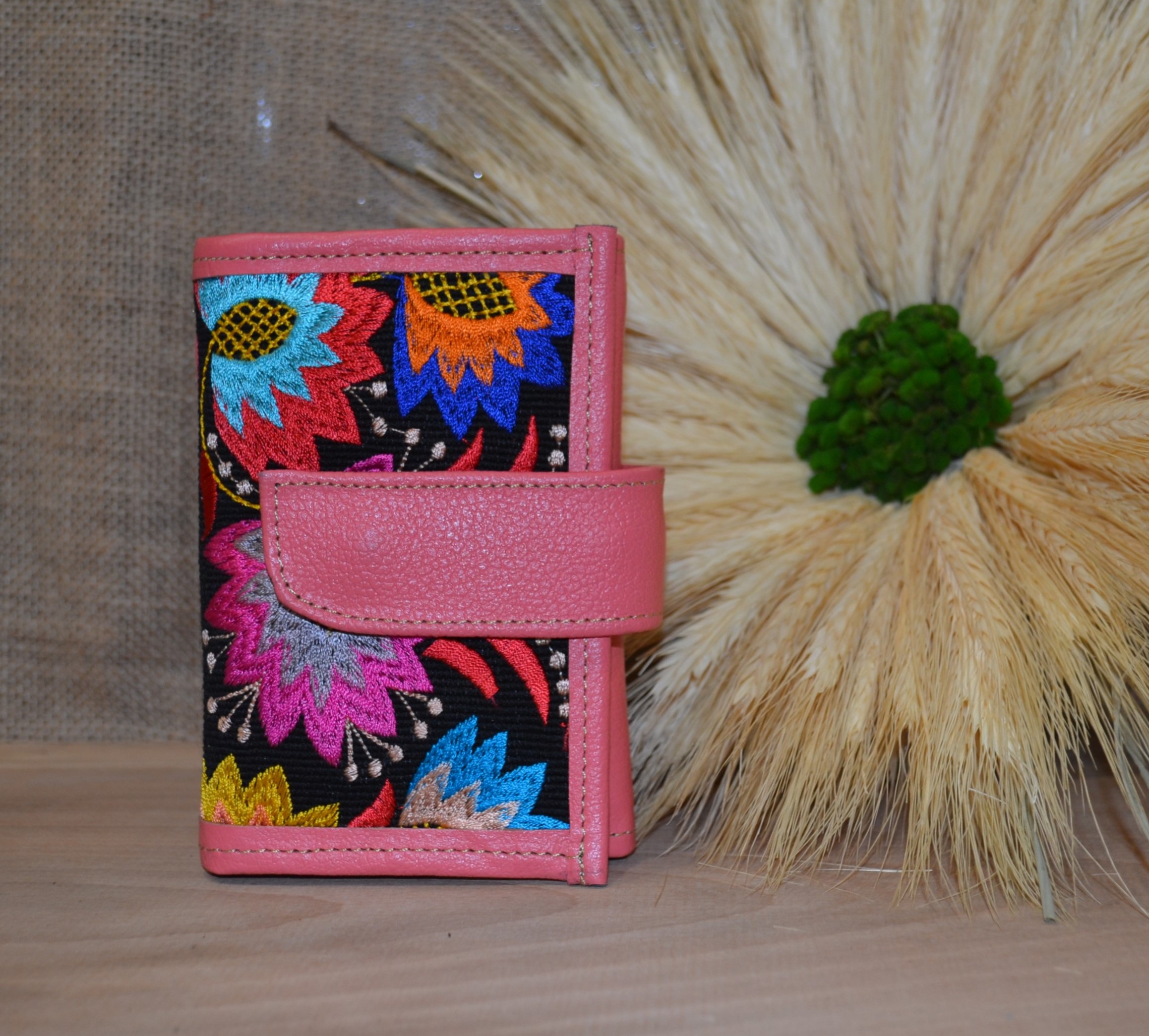 Jeśli szukasz małego zgrabnego portfela z portmonetką to ten model jest dla ciebie . 100 % naturalna różowa skóra pokryta kwiatowym kolorowym haftem . Zaprojektowany i uszyty wysoko w Ekwadorskich Andach przez mały rzemieślniczy warsztat kaletniczy. Portfel posiada przegrodę na banknoty i na monety a także kieszonki na karty płatnicze.