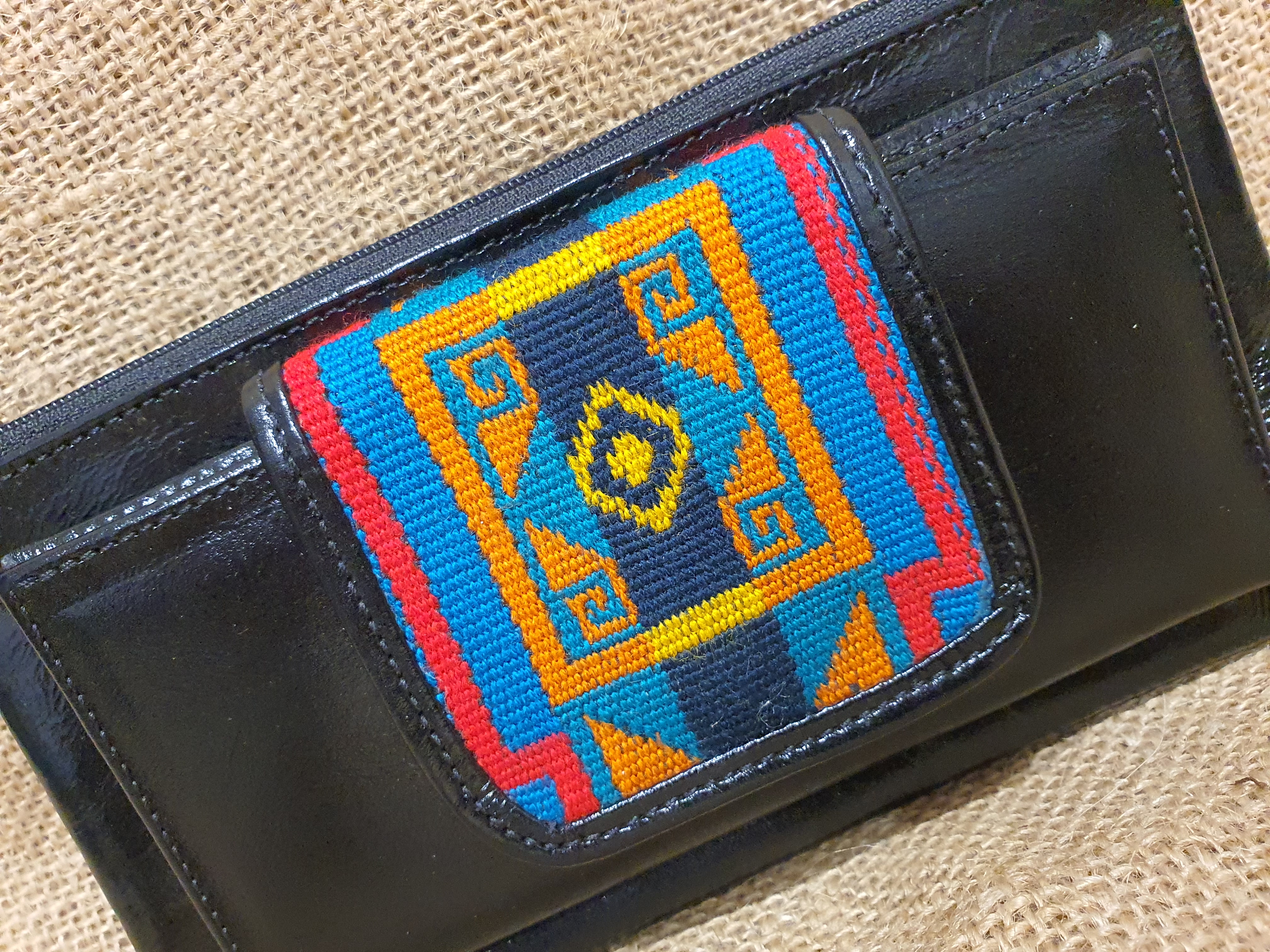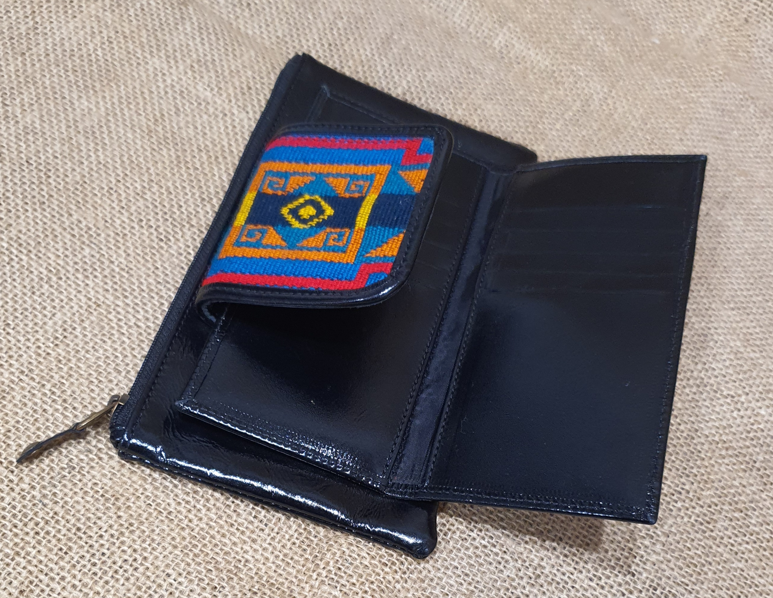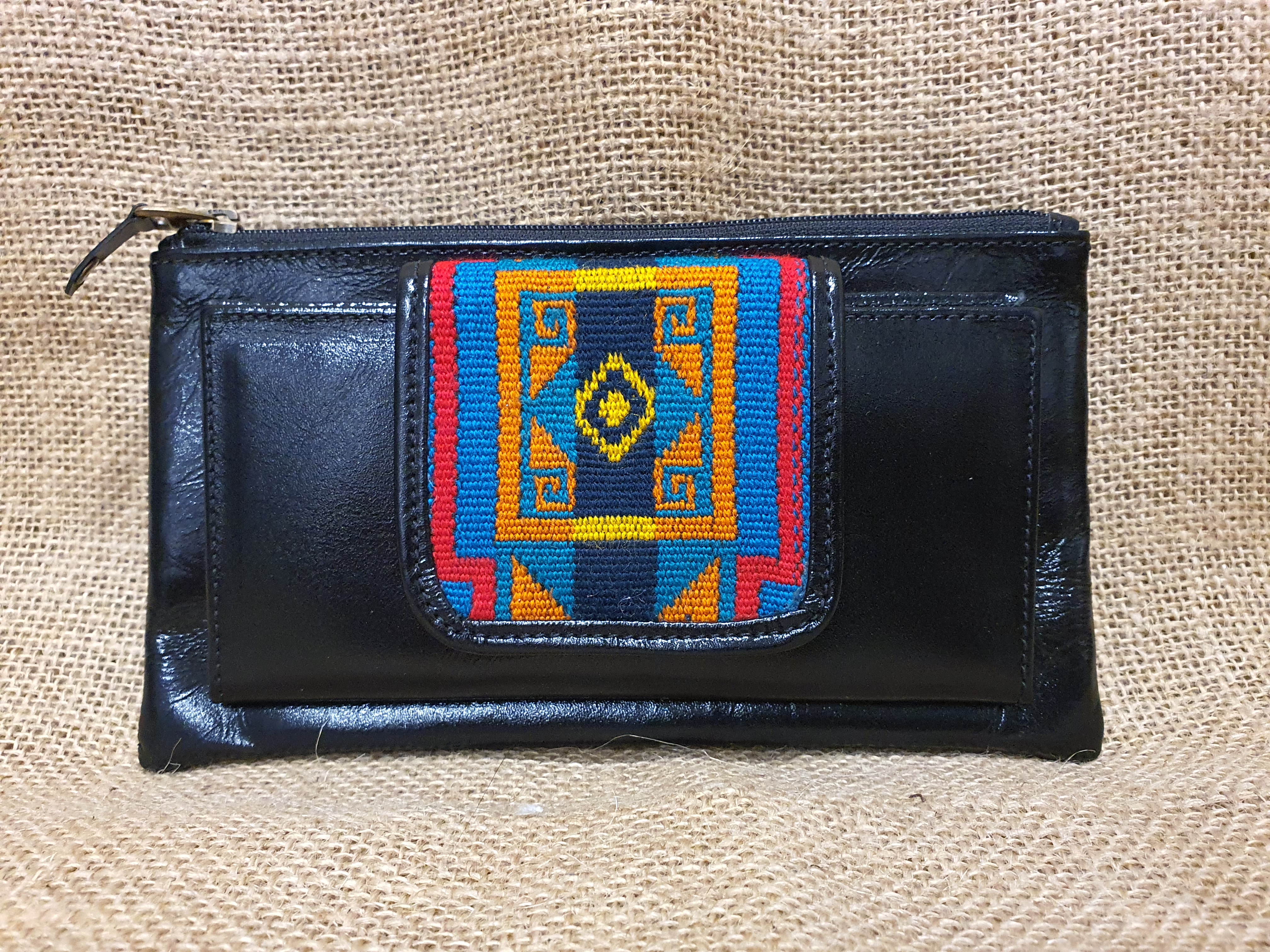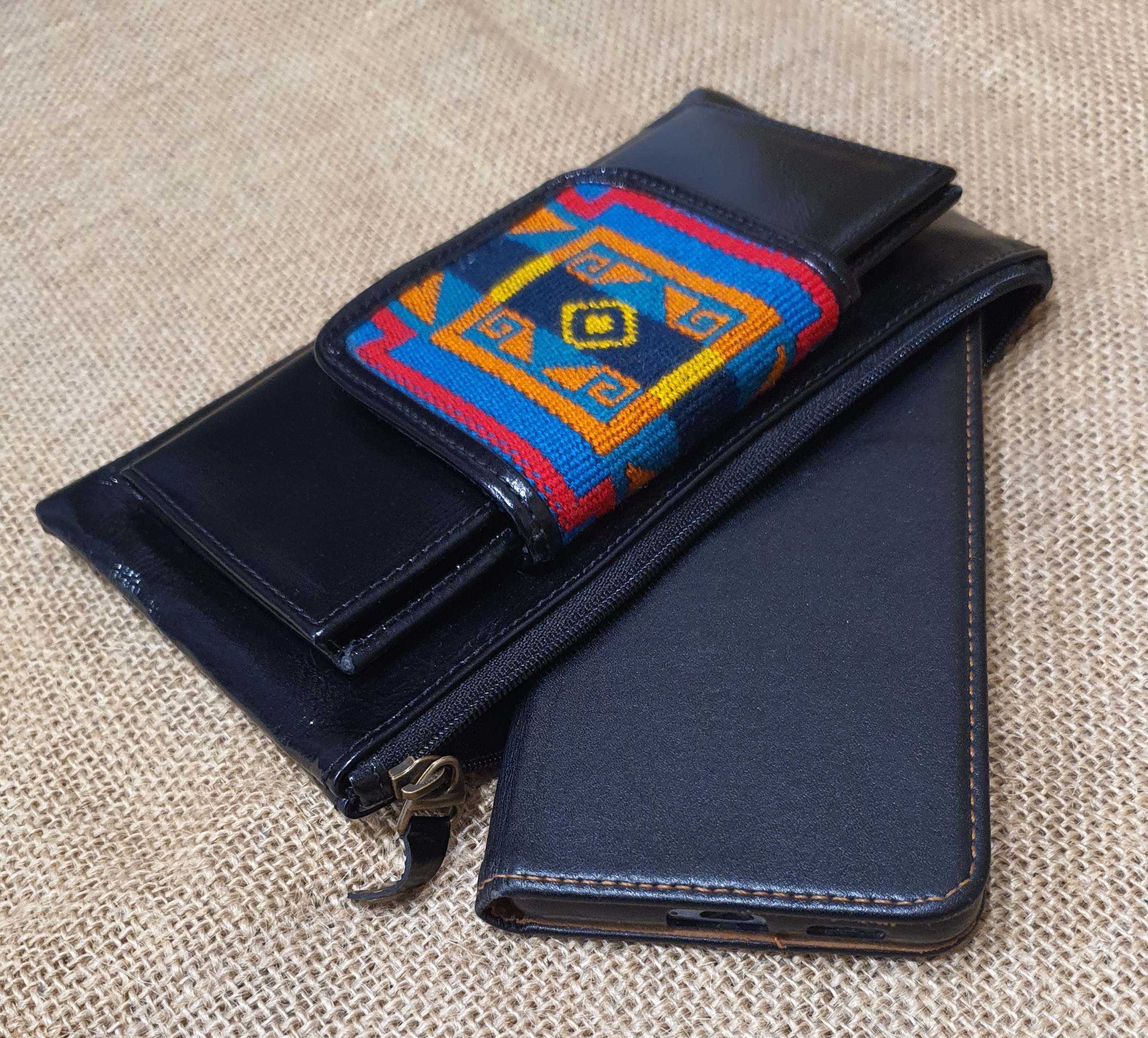 Ten model posiada jedną kieszeń w która włożysz największy smartphone lub pieniądze. kieszonka boczna kryje w sobie miejsce na karty i dokumenty. Całość zdobi piękny haft w stylu kultury Indian Kechua zwany BICHUNGA