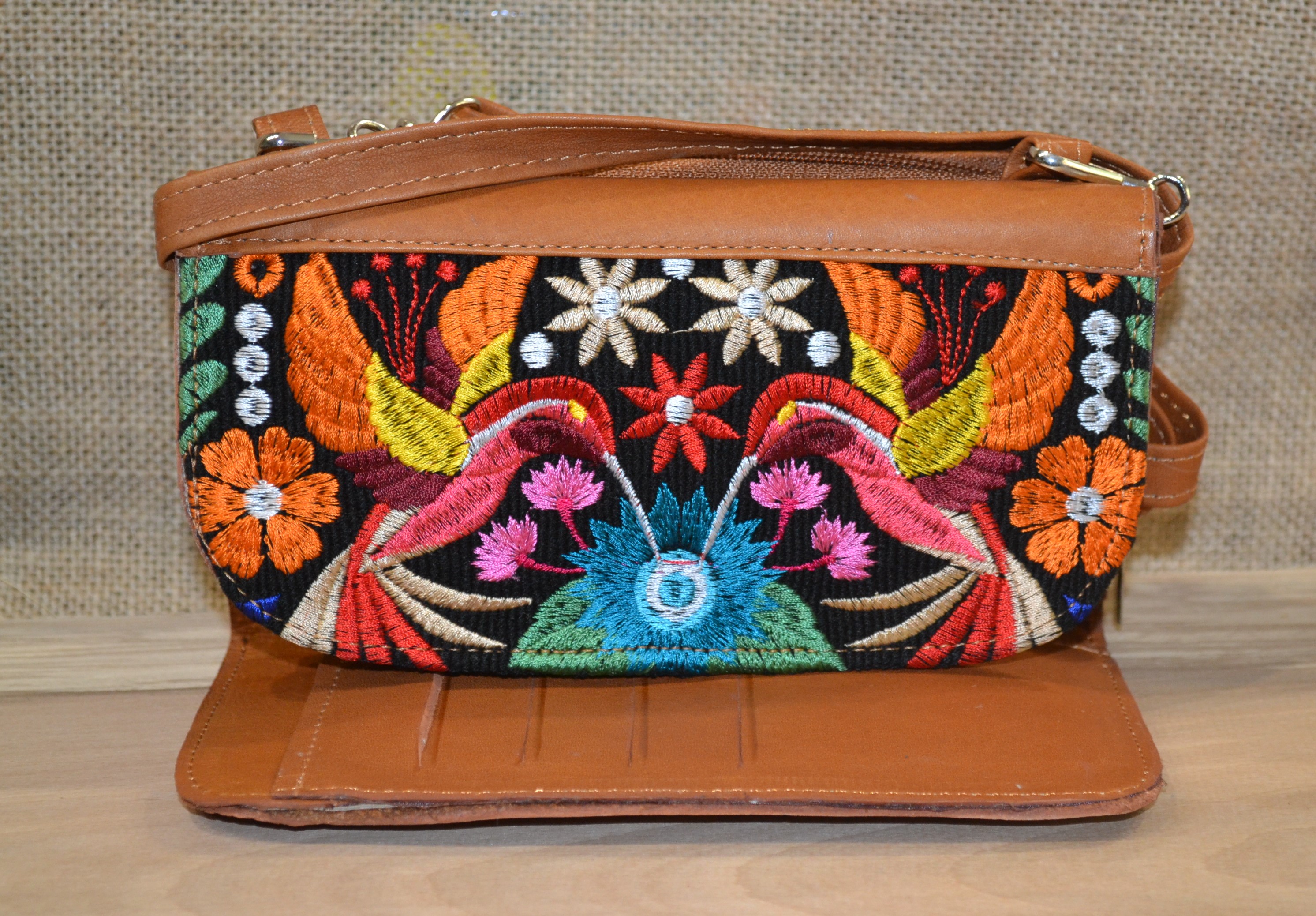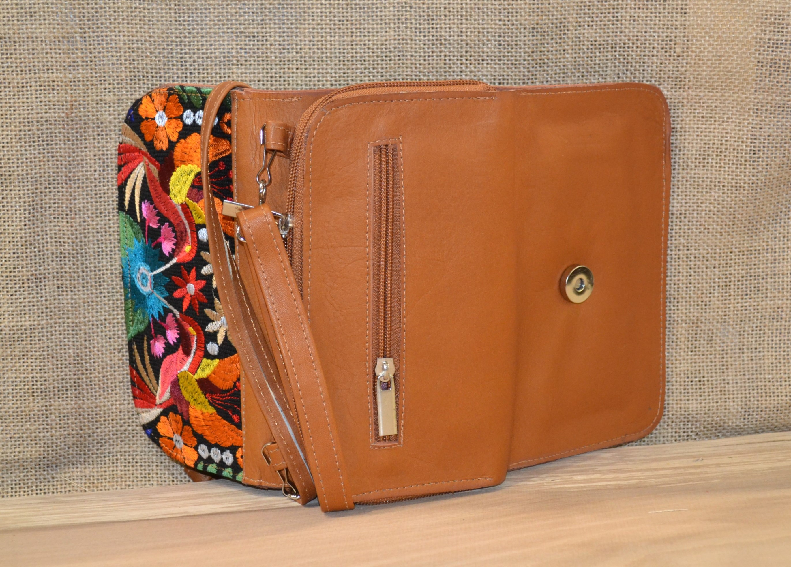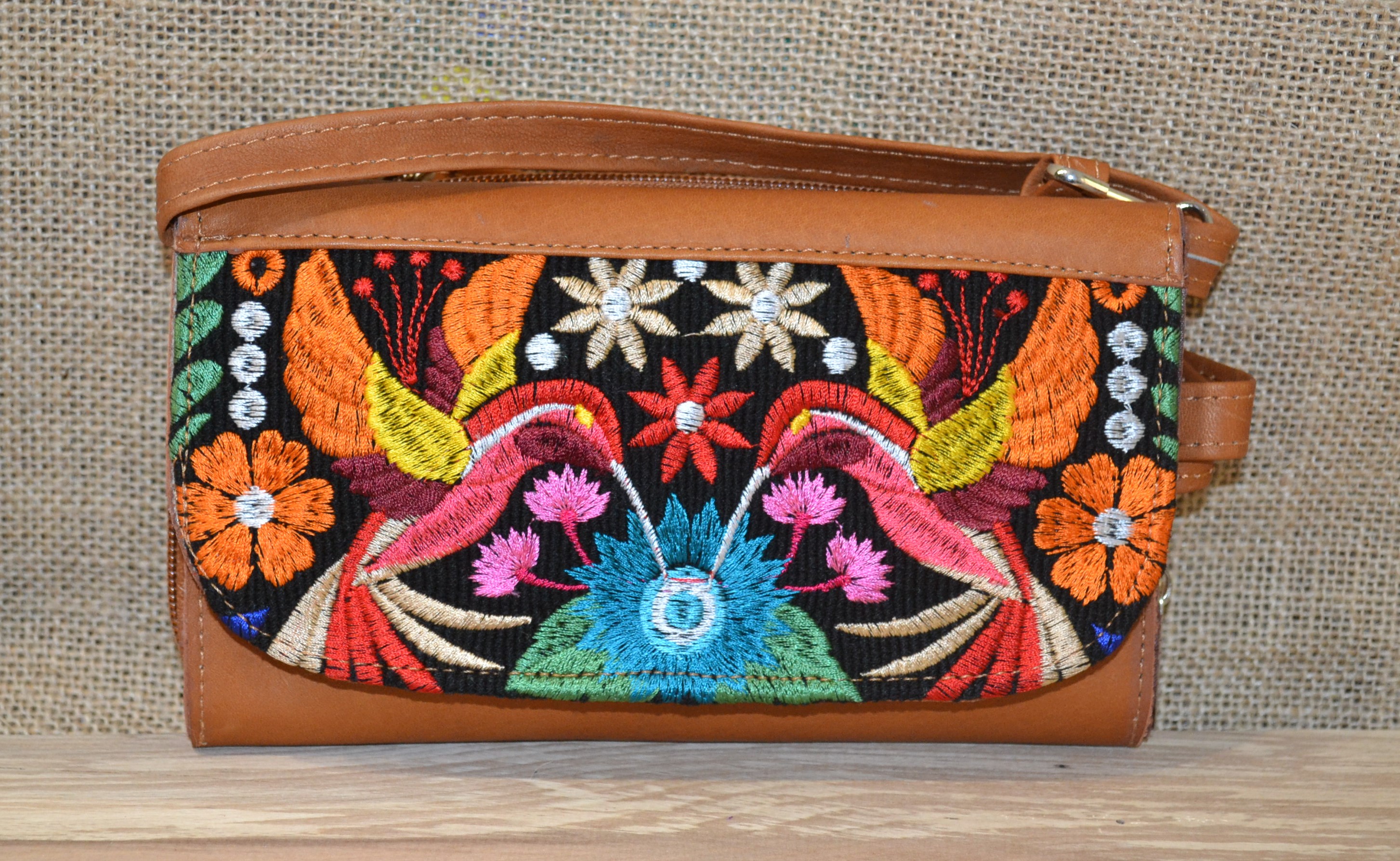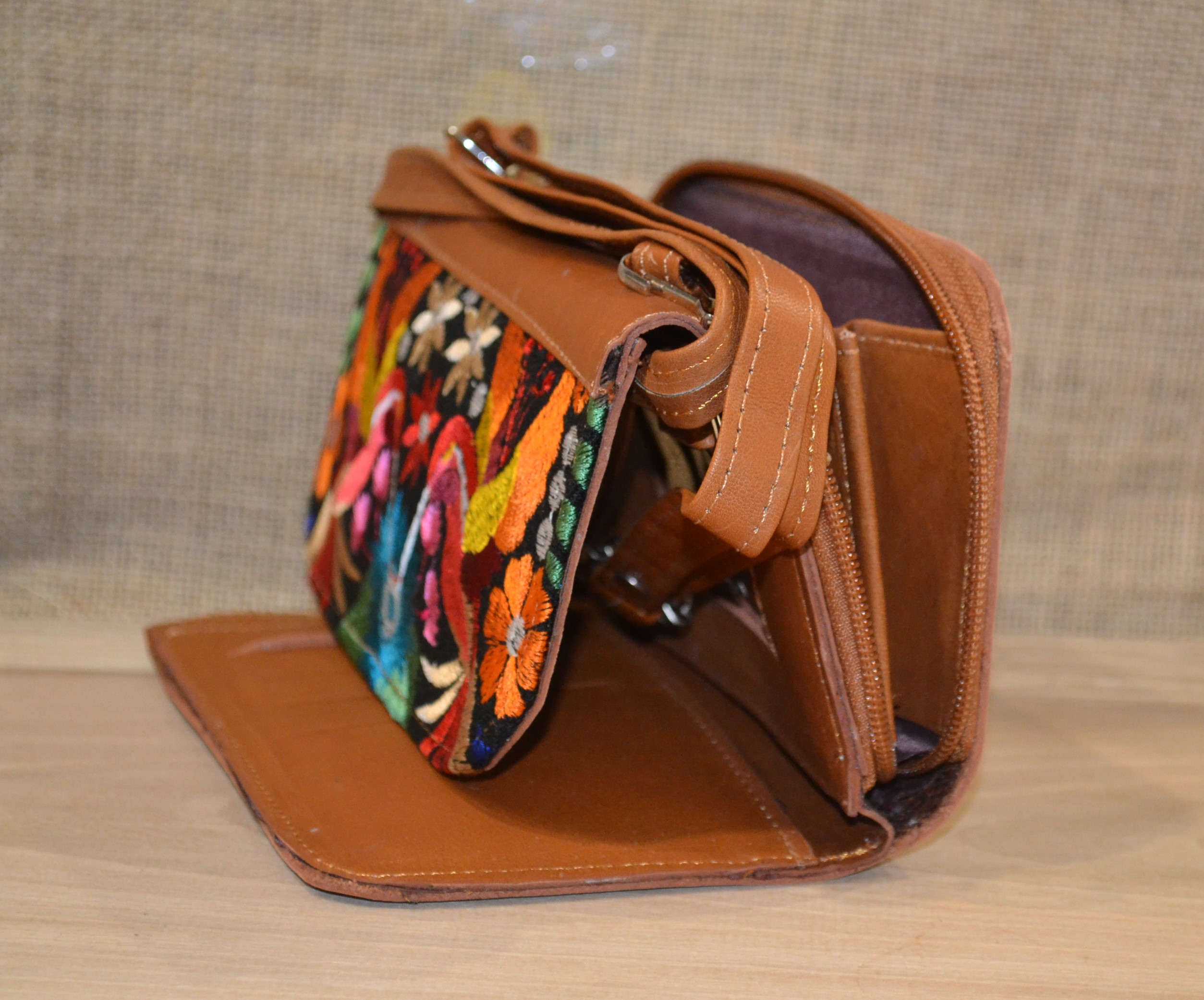 Strona główna » Wyroby ze skóry » Portfel torebka skórzana brązowa z kwiatowym kolorowym haftem .