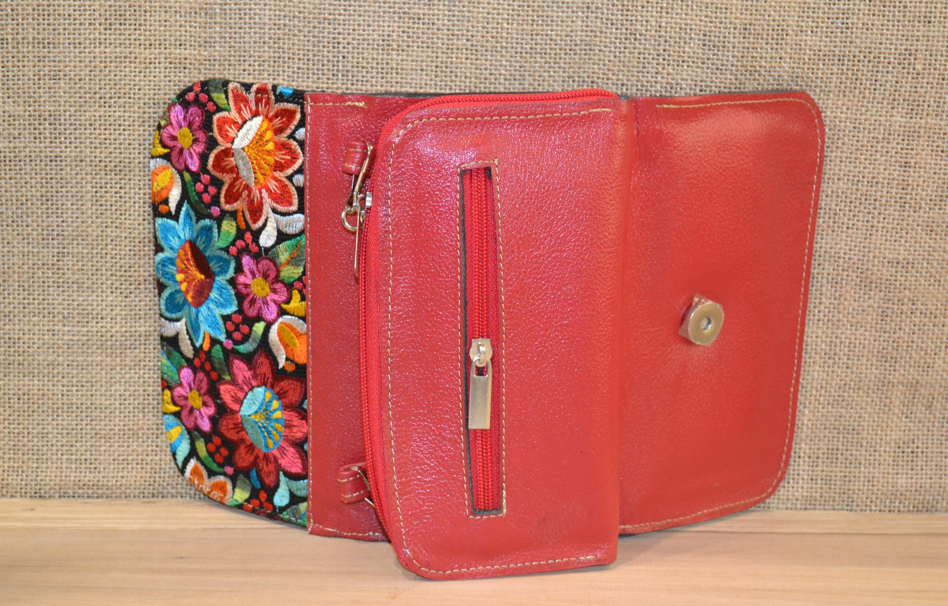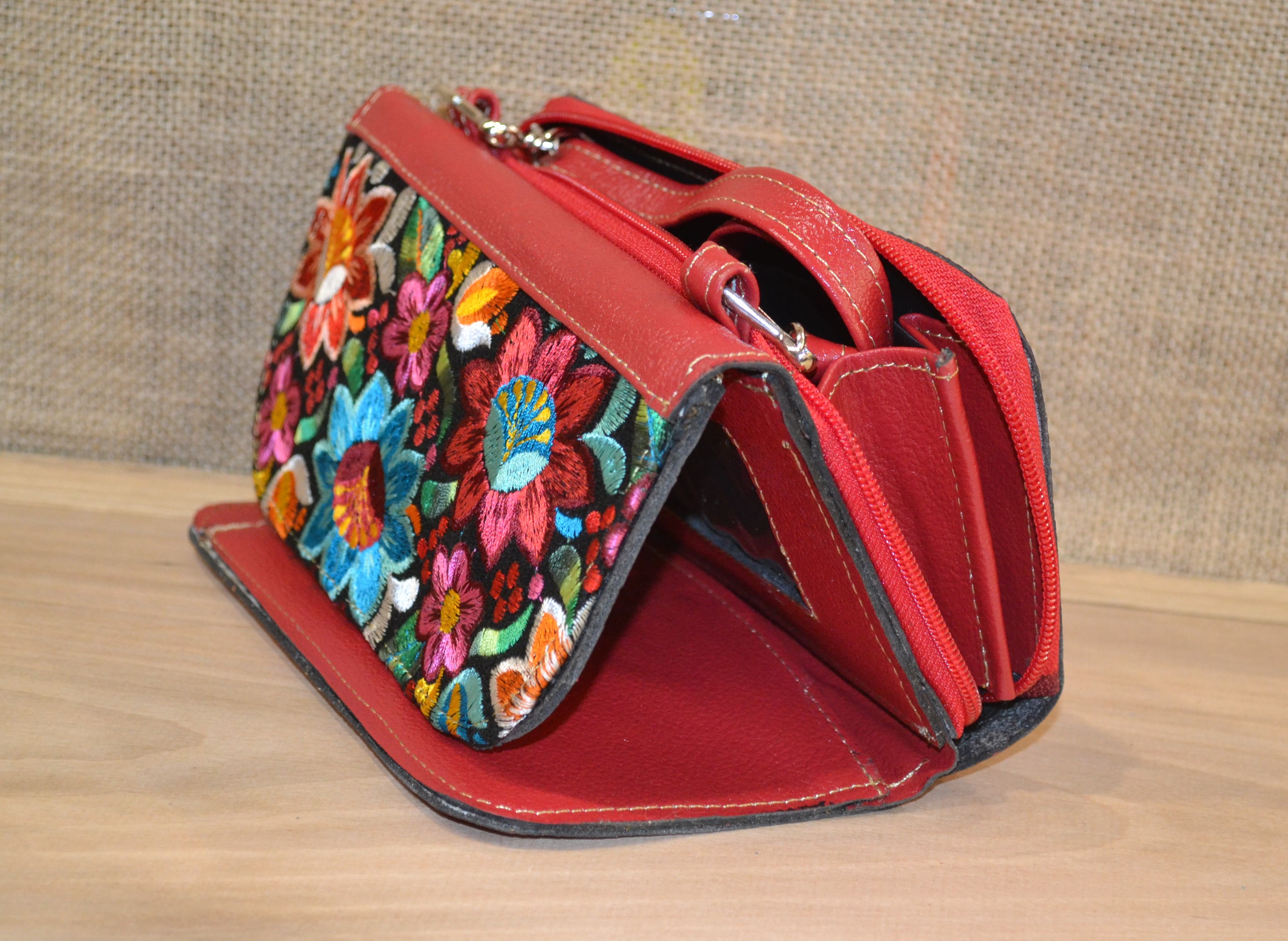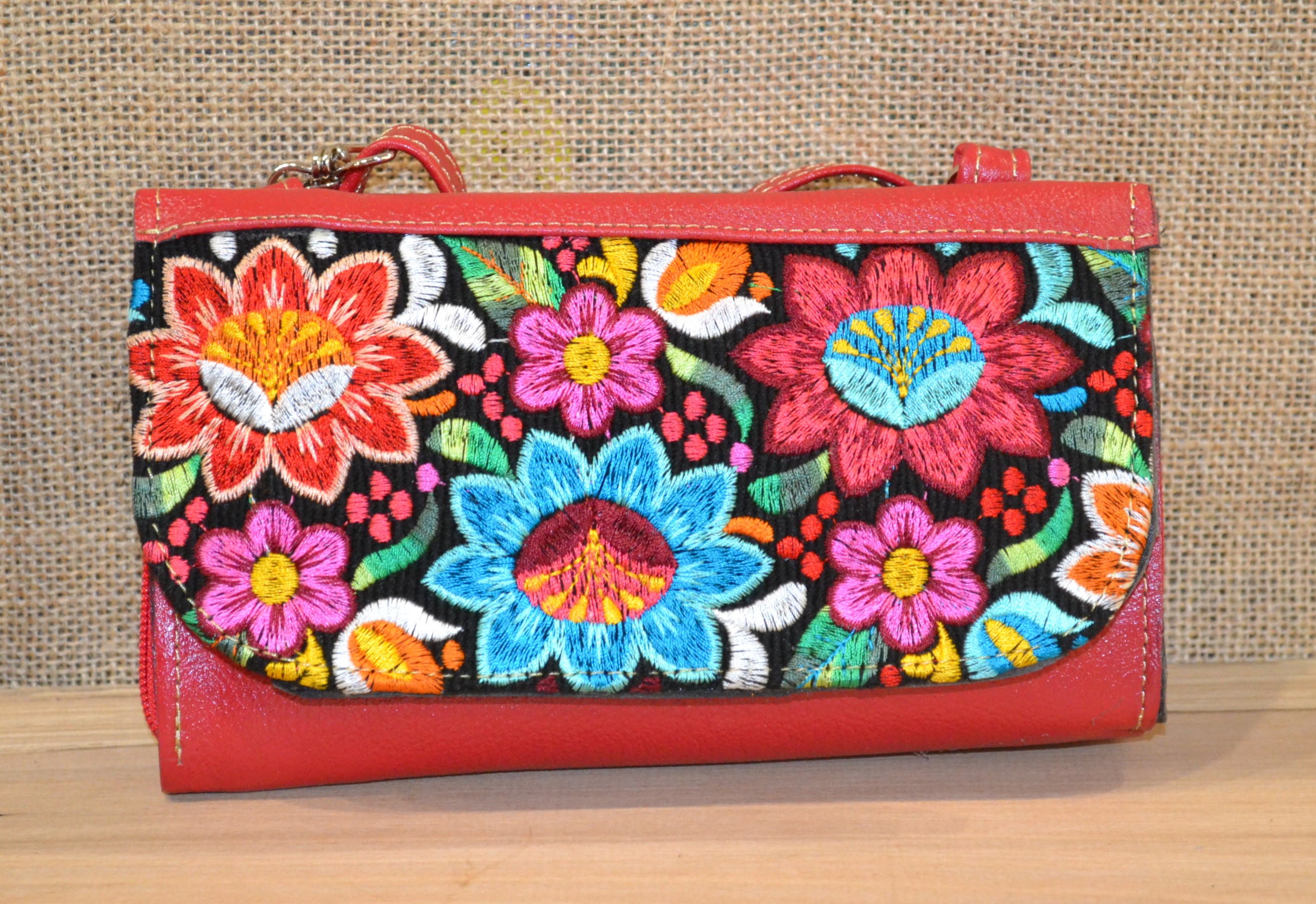 Strona główna » Wyroby ze skóry » Portfel torebka skórzana czerwona z kwiatowym kolorowym haftem .