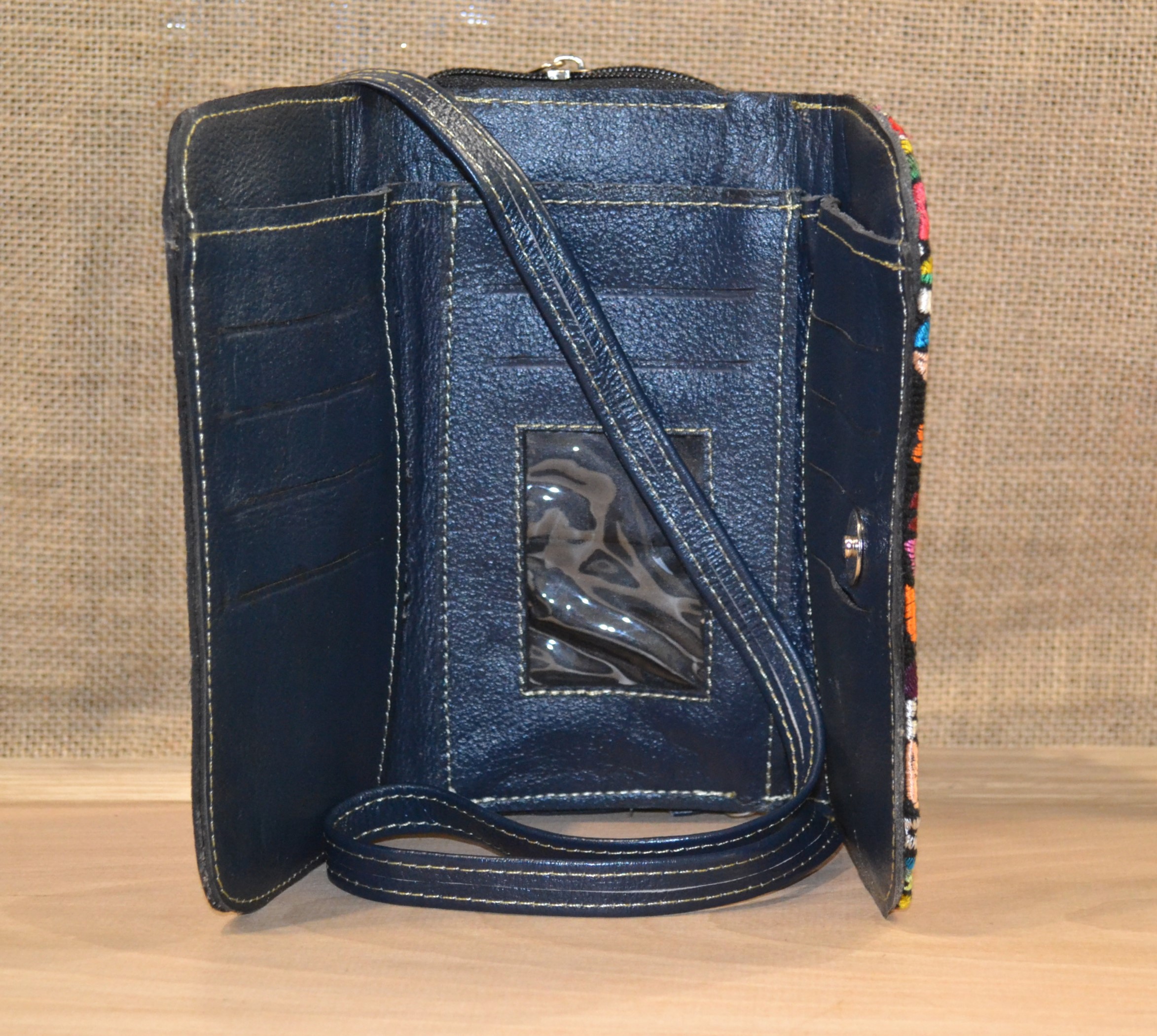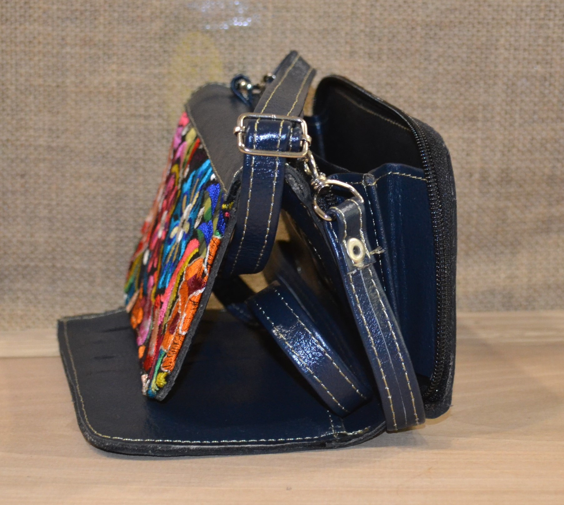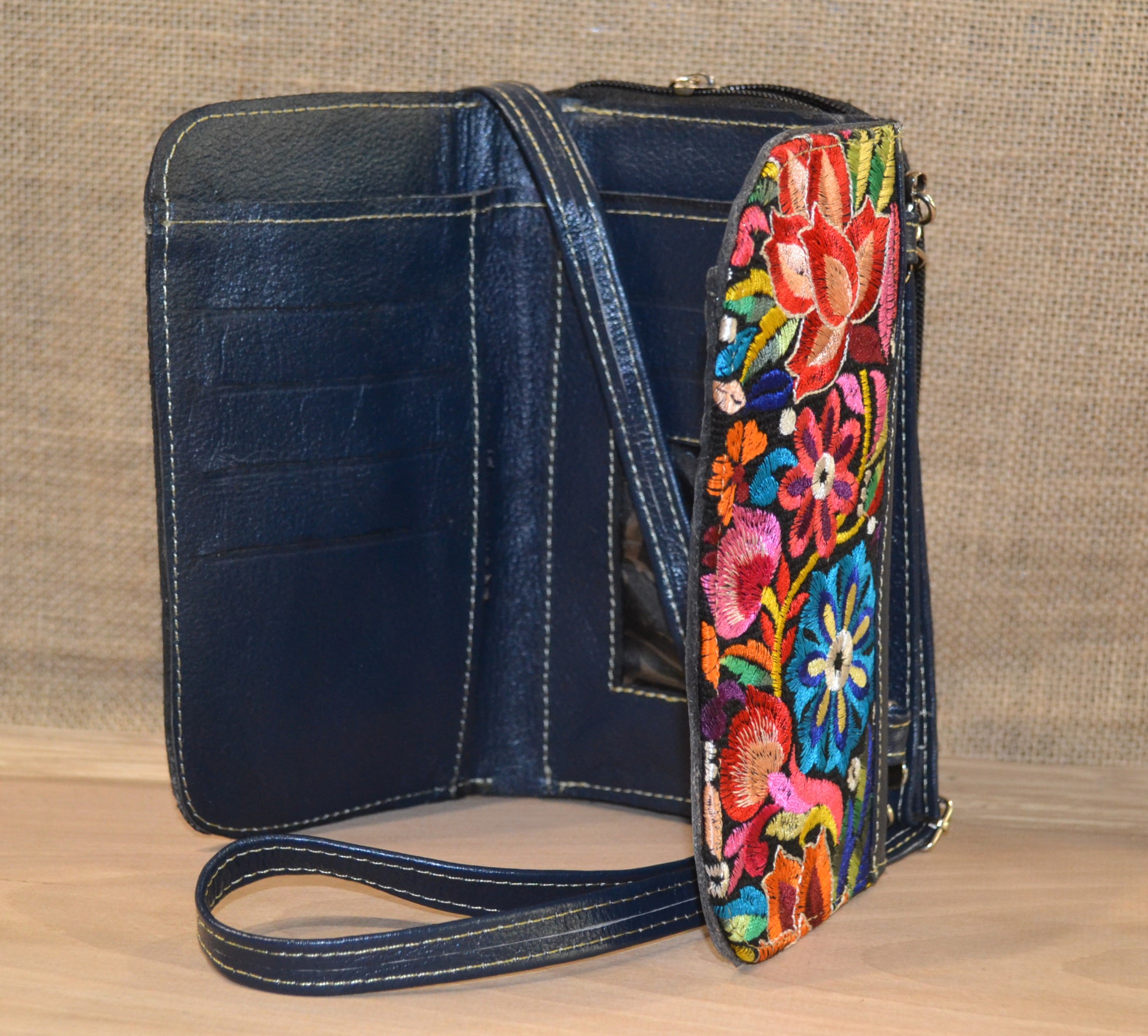 Strona główna » Wyroby ze skóry » Portfel torebka skórzana granatowa z kwiatowym kolorowym haftem