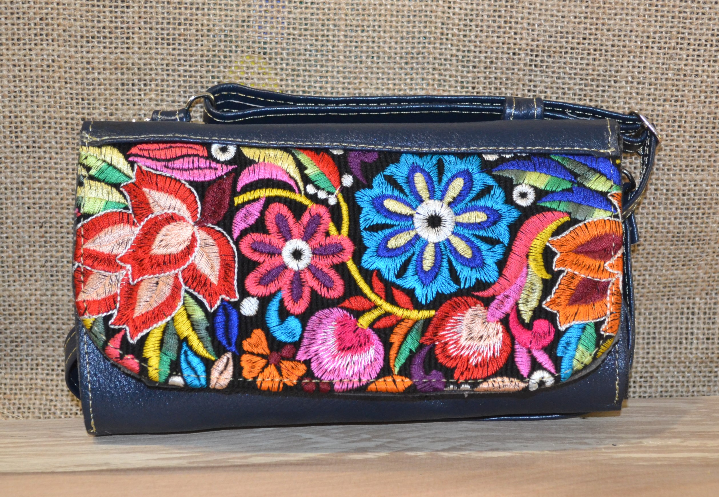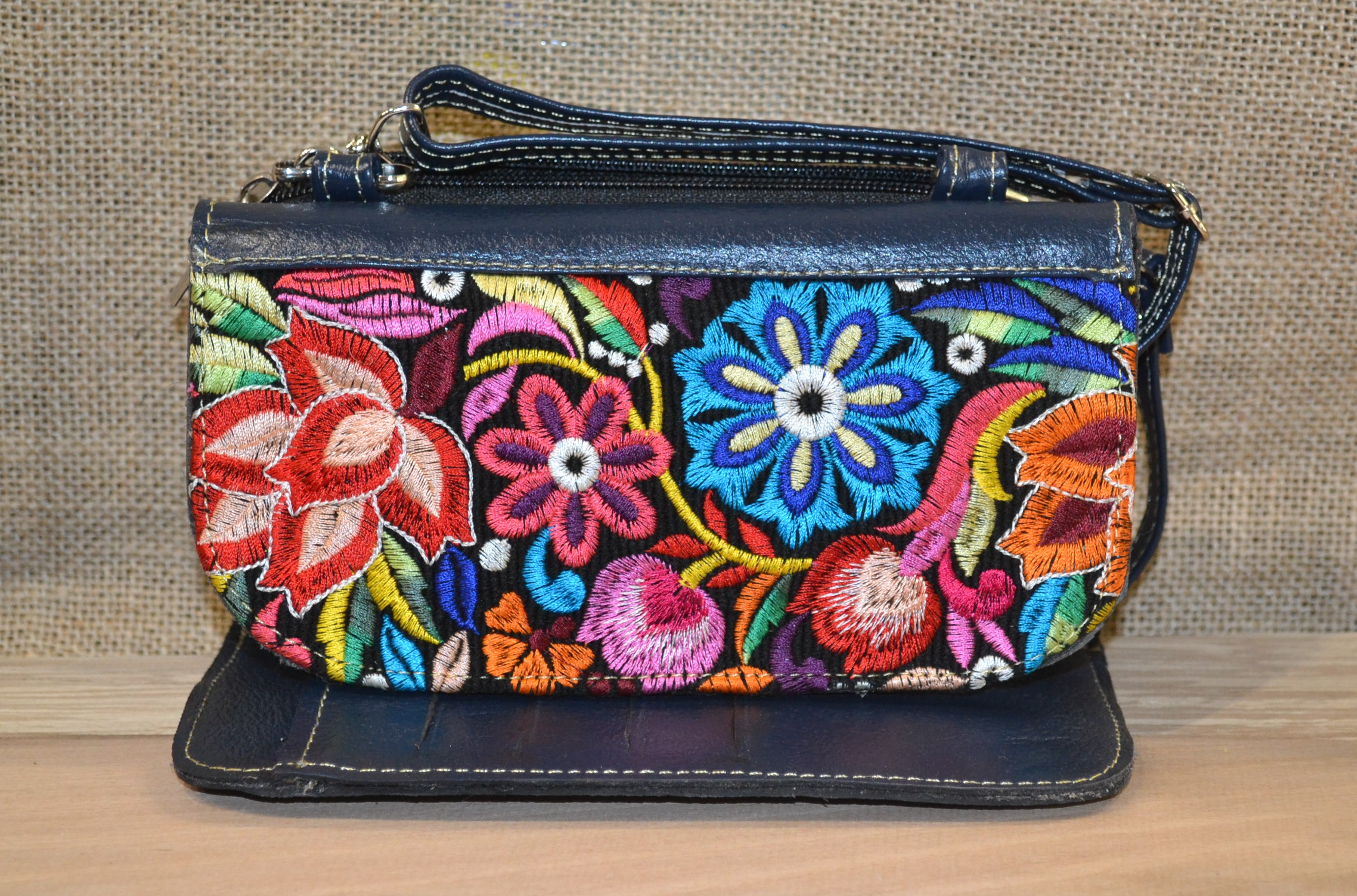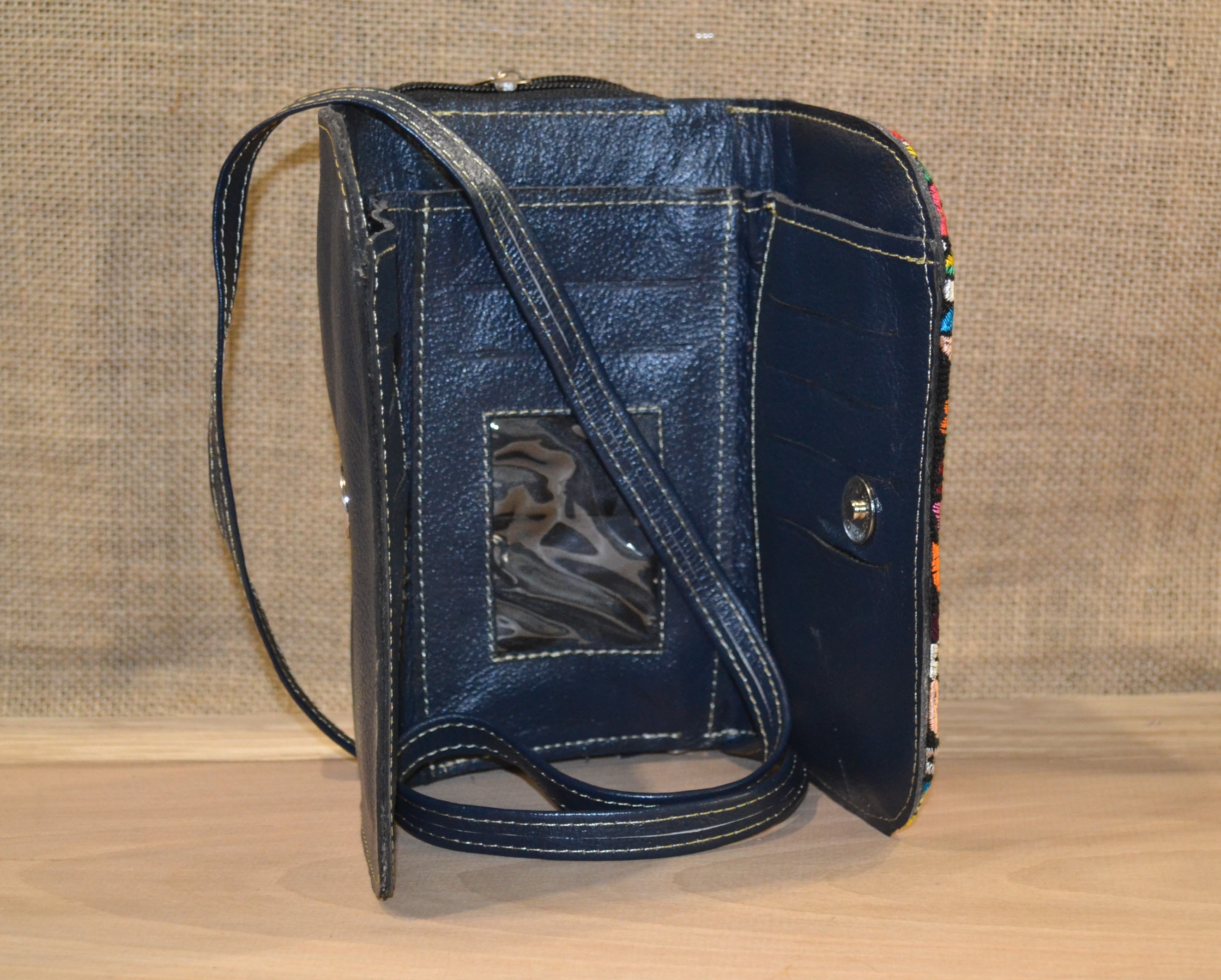 Strona główna » Wyroby ze skóry » Portfel torebka skórzana granatowa z kwiatowym kolorowym haftem