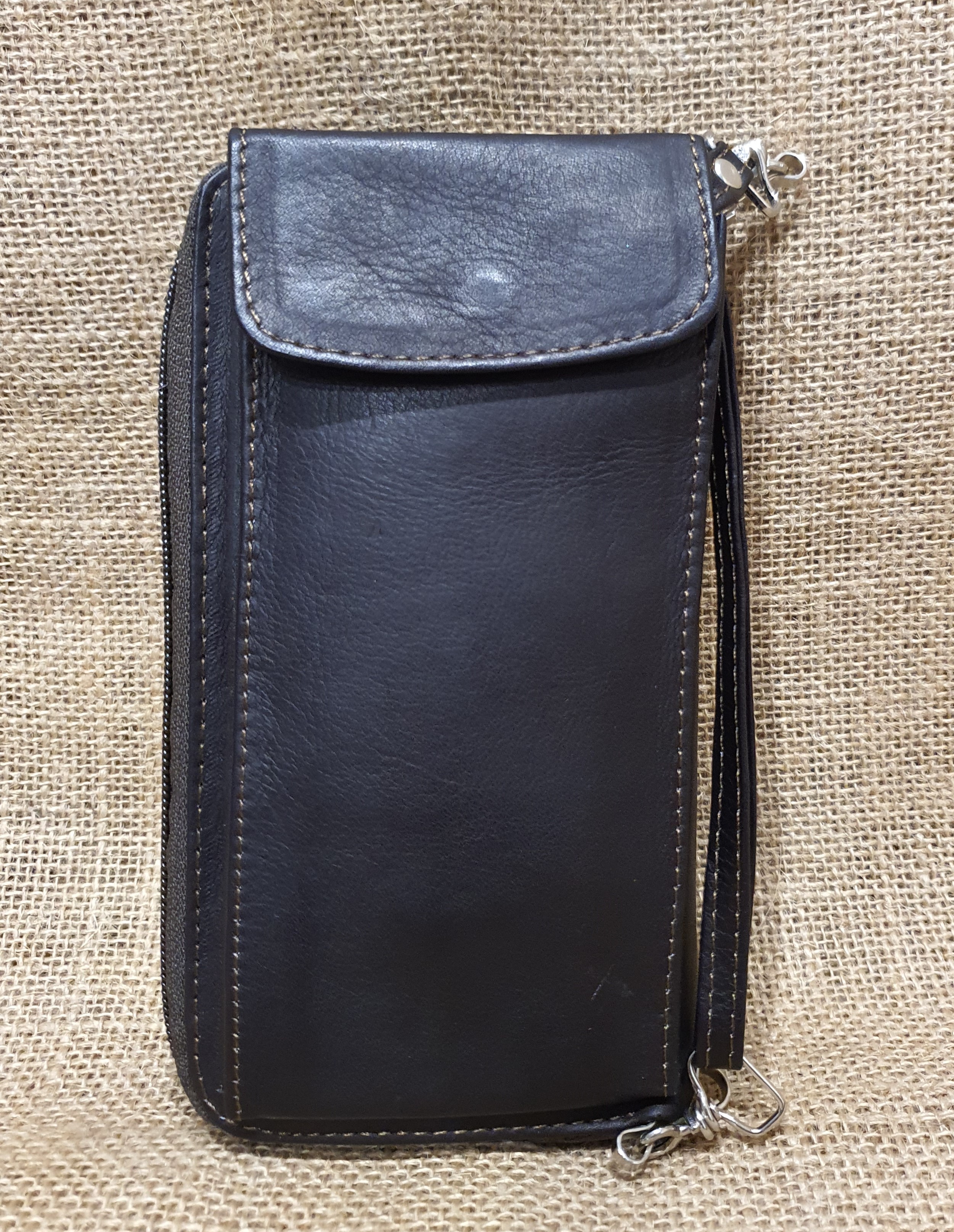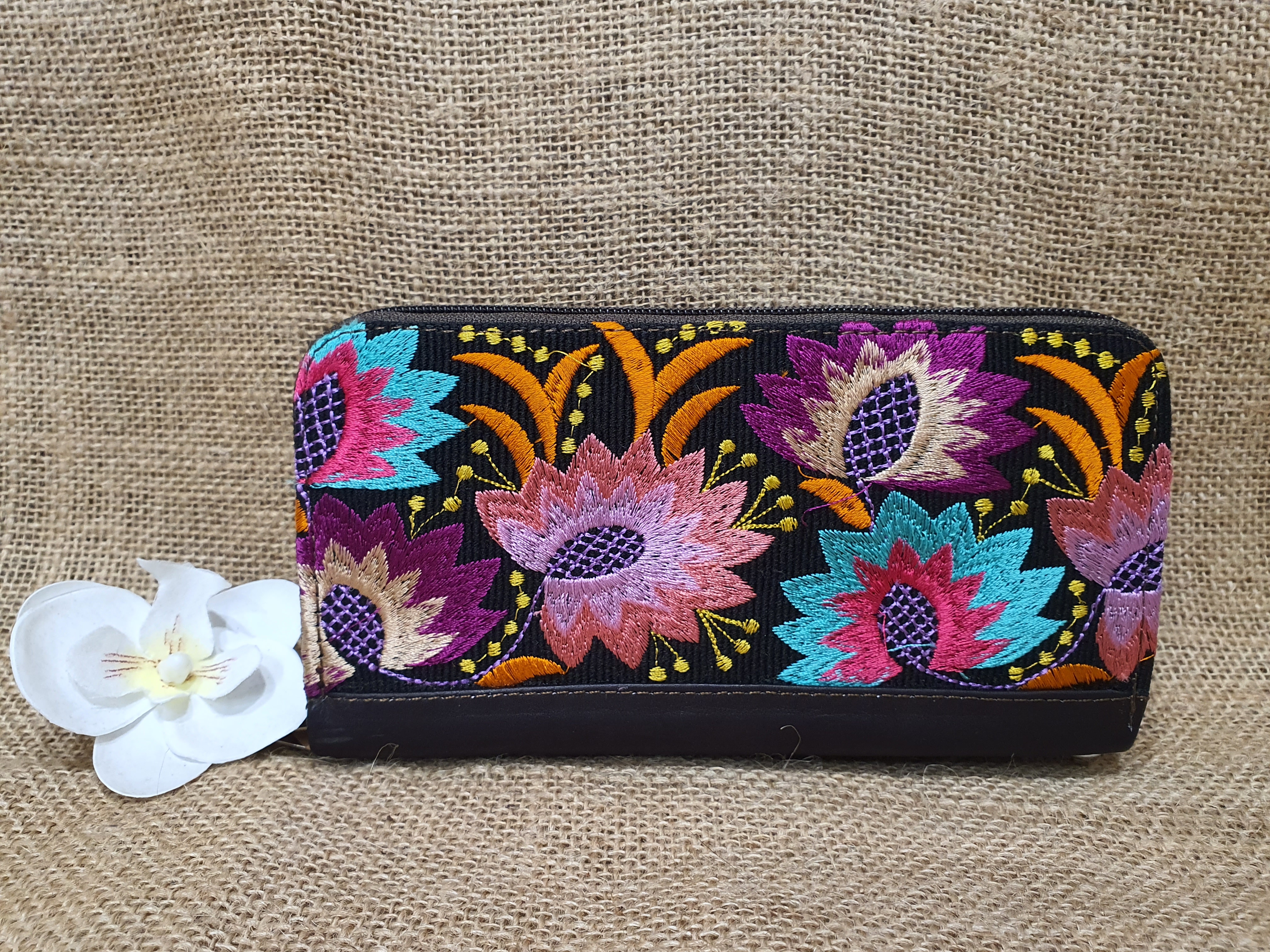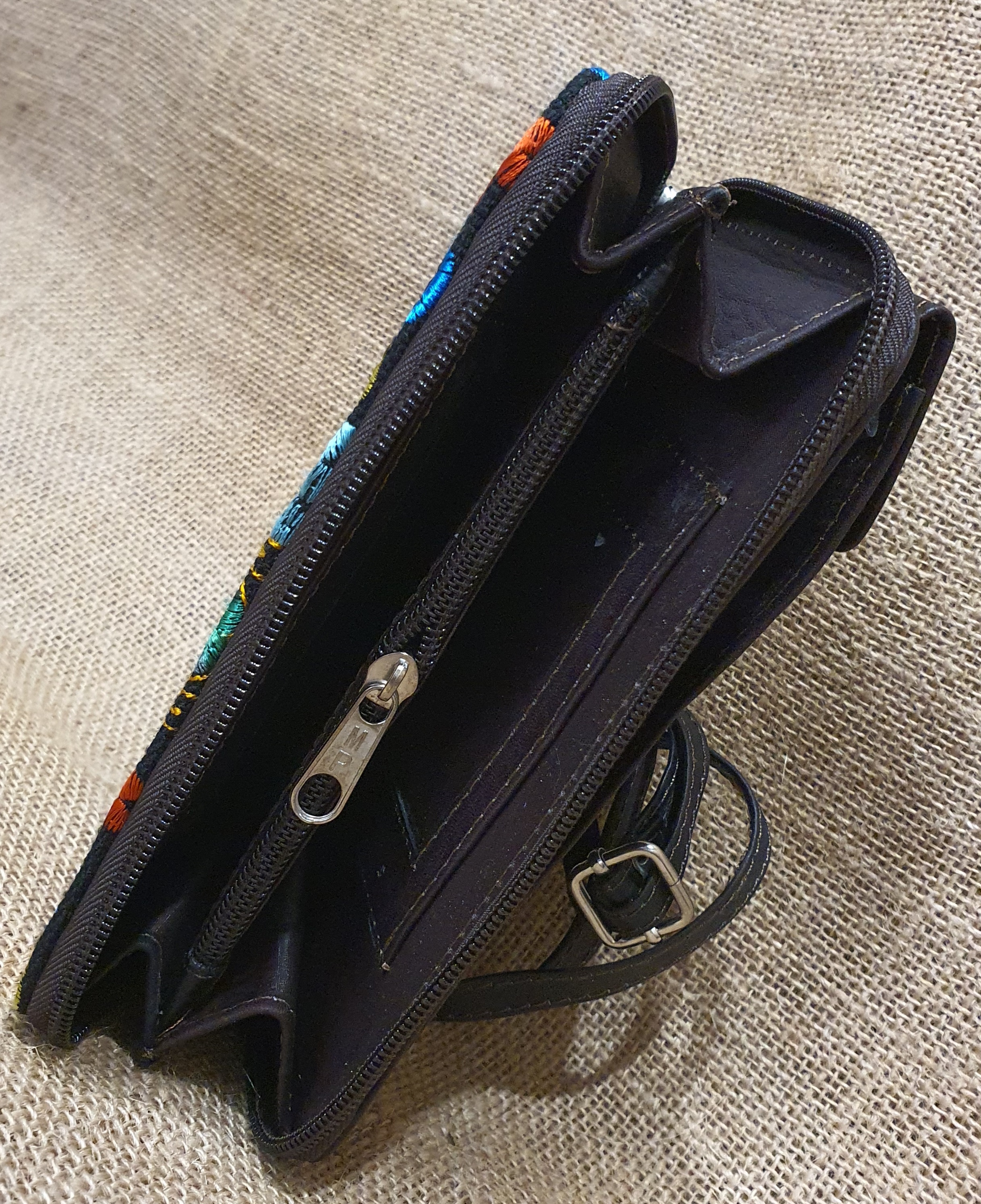 Ten model portfela ma wiele zastosowań . Możesz go nosić założonego przez ramię jako niewielką torebkę lub używając jako zwykły portfel . Tylna część skrywa kieszeń która przeznaczona jest na sporego smartphona. Wnętrze portfela posiada kieszonkę na monety. zamykaną na zamek , kieszonkę na zdjęcie oraz dwie przegrody na banknoty. Całość zamyka zamek błyskawiczny. Naturalna 100 % skóra w ciemnobrązowym kolorze nadaje mu wytrzymałości a kwiatowy ekwadorski haft podkreśla jego unikalność .