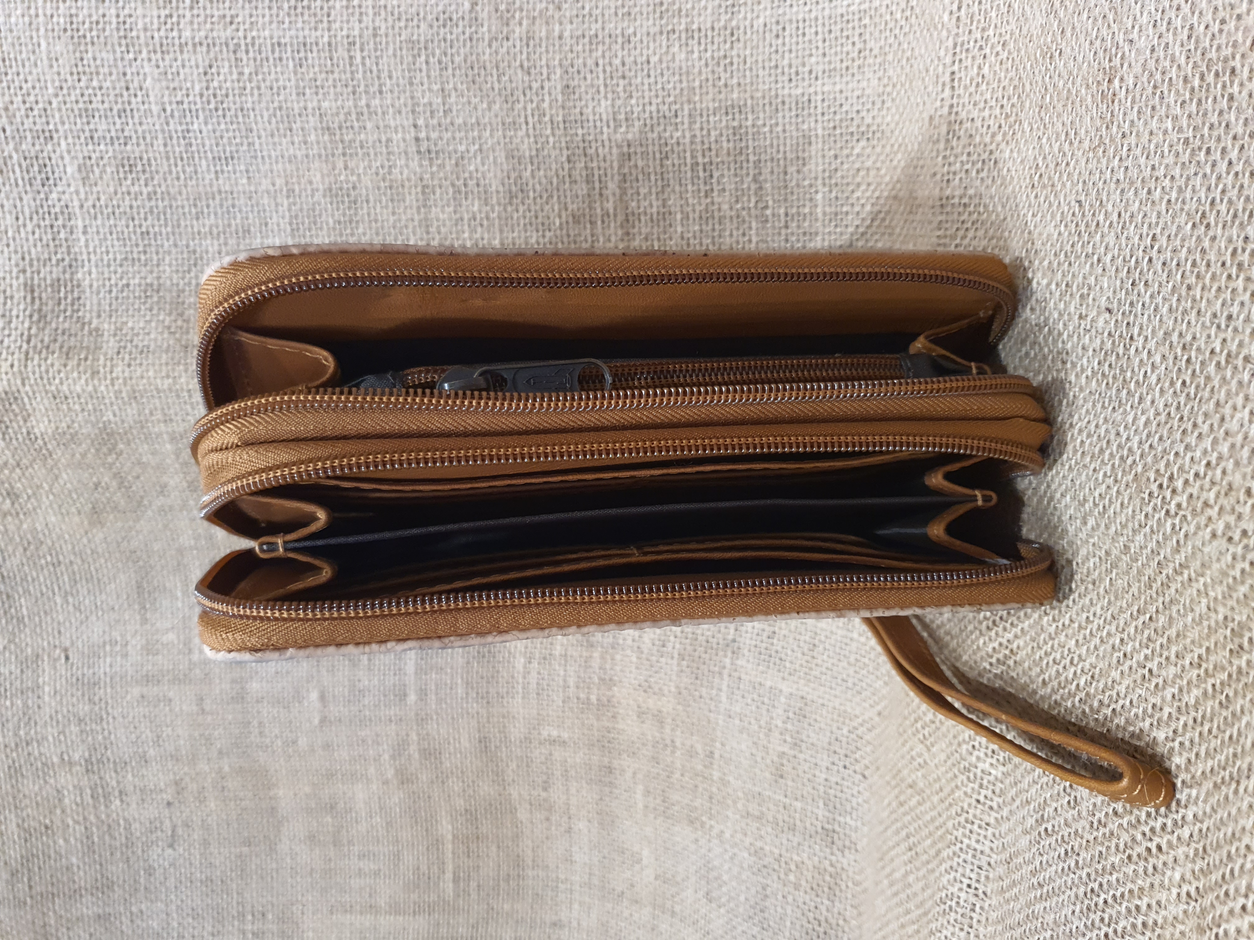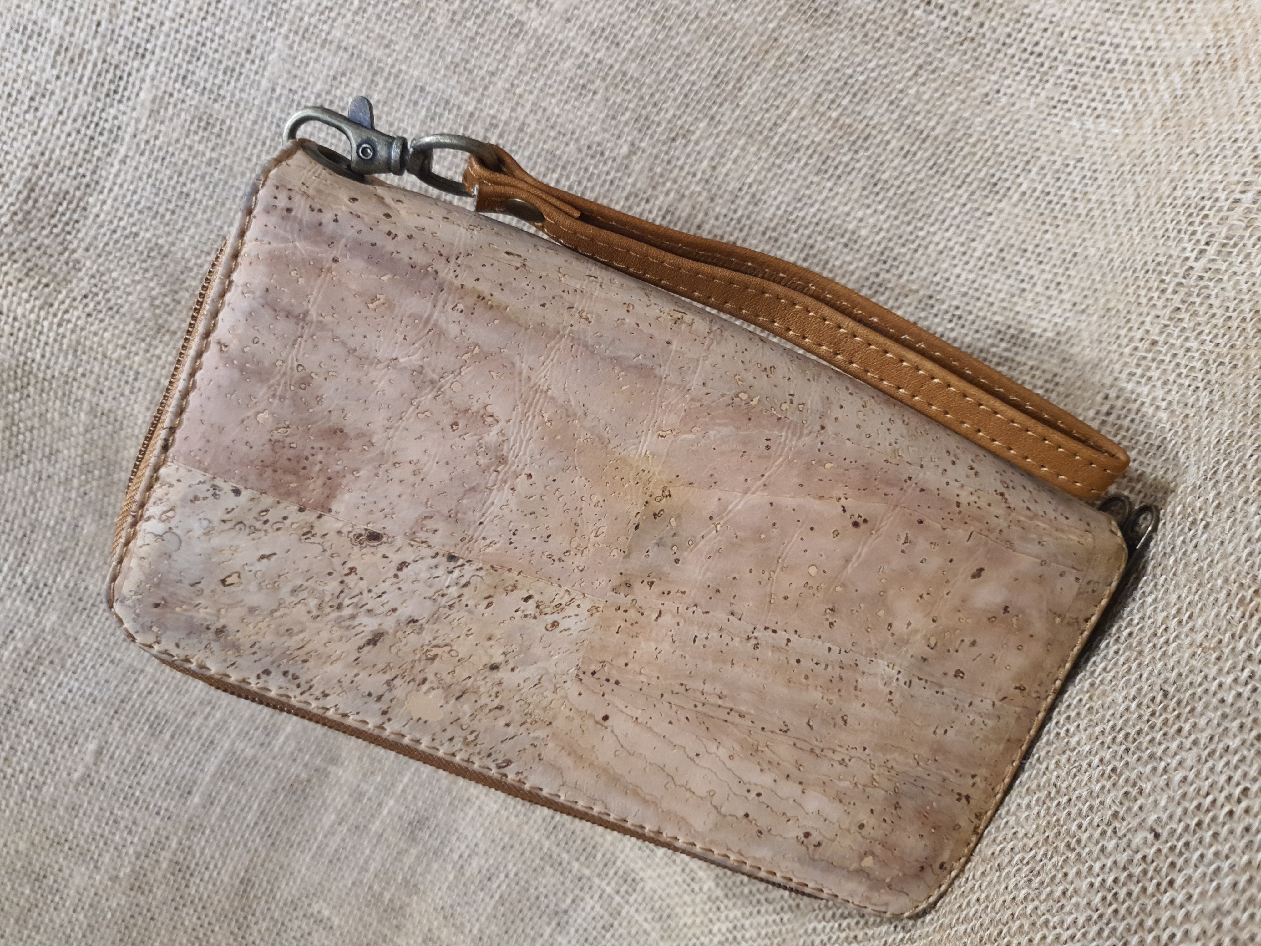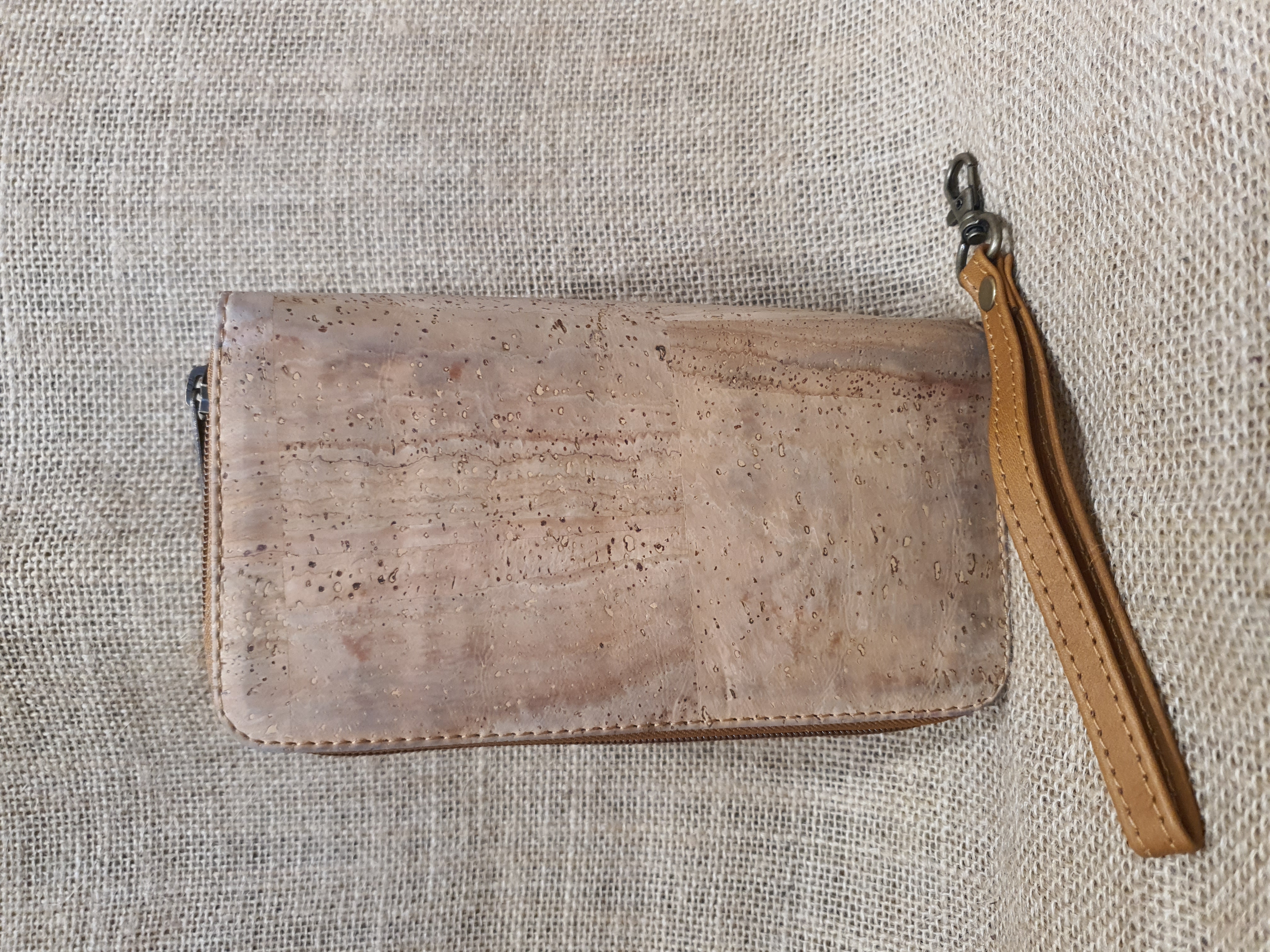 Bardzo przestronny ,nowoczesny portfel  ze 100% skóry i prawdziwego korka . Posiada dwie spore komory a każda z nich ma wiele kieszonek na karty i dokumenty, przegrodę na monety zamykaną na zamek . całość zamykana zamkami błyskawicznymi. portfel doskonale nadaje się na formalne spotkania .