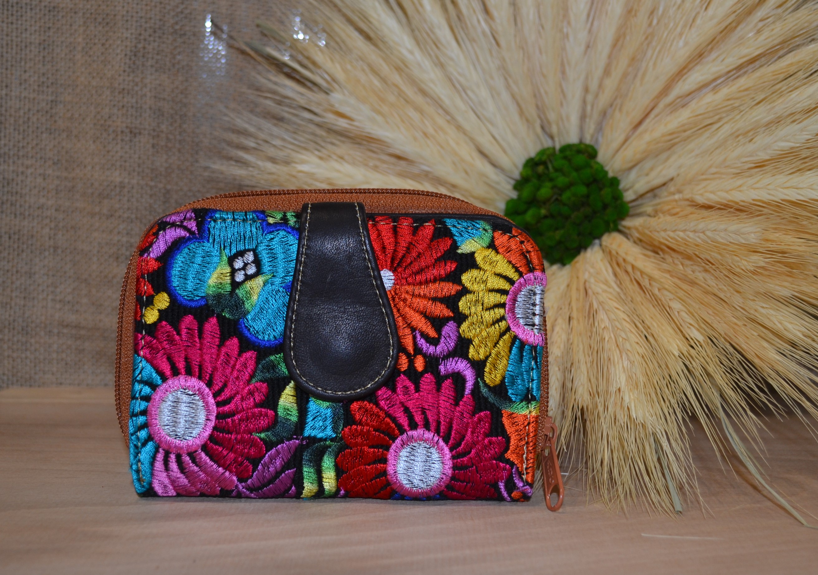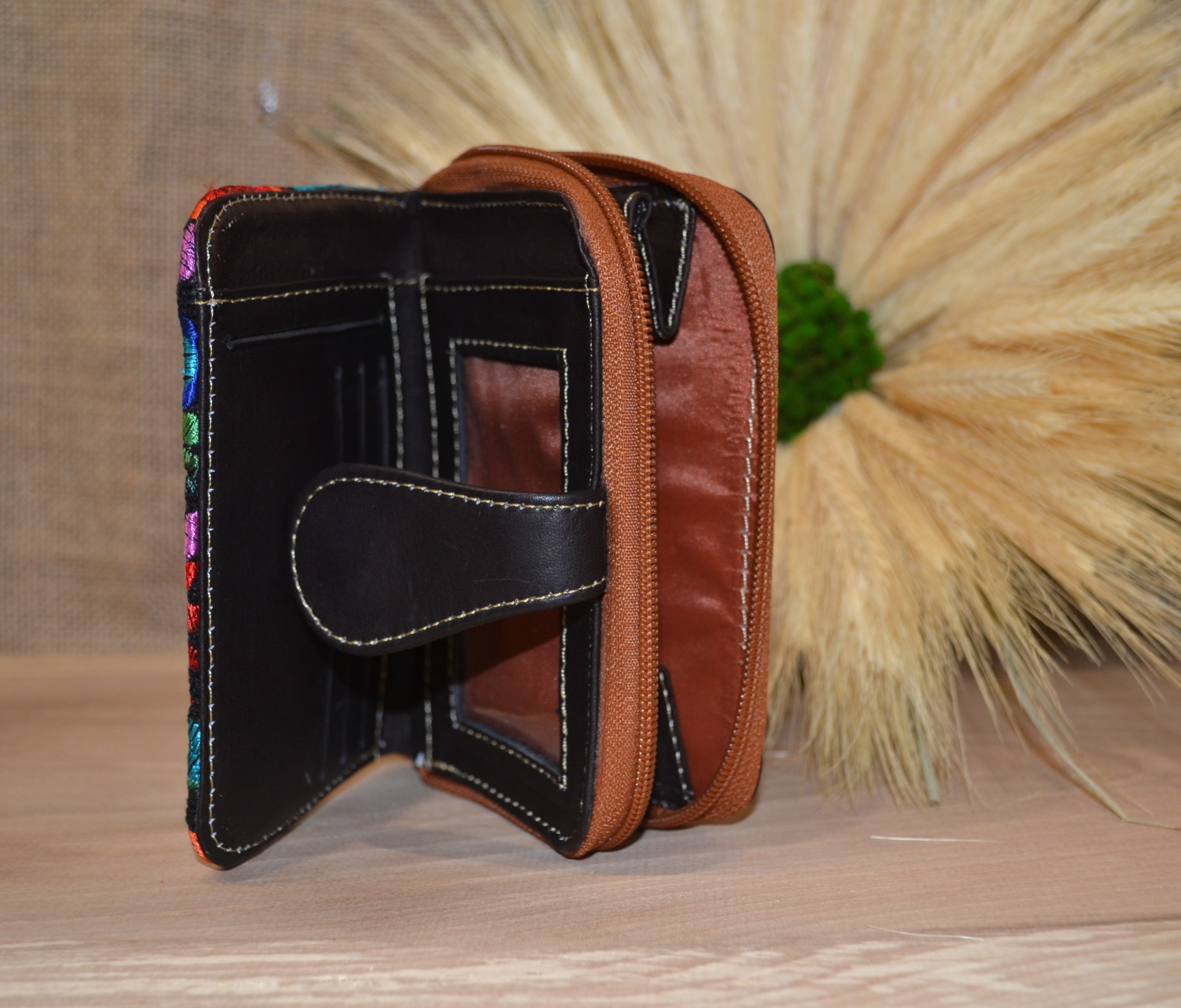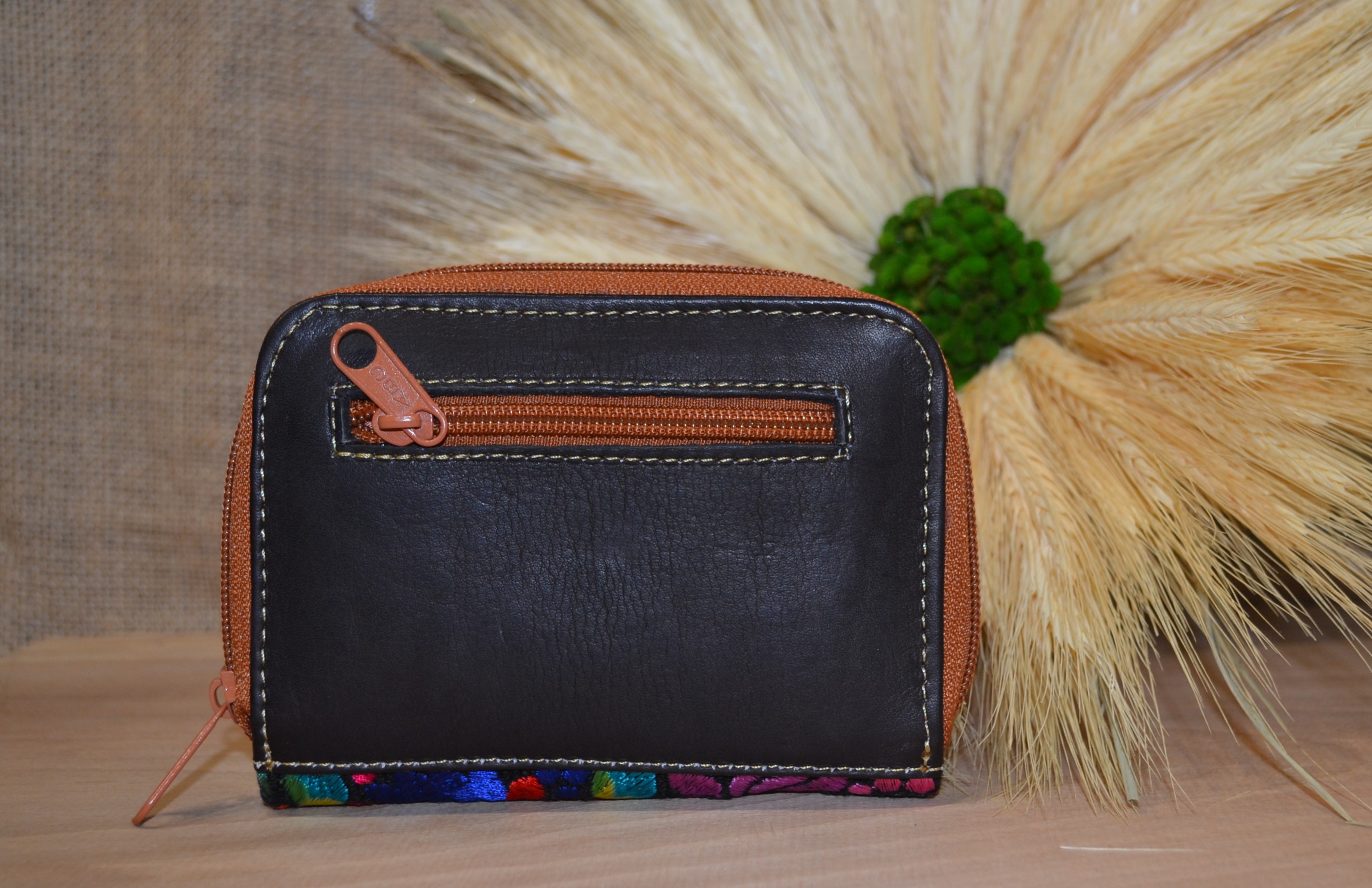 Jeśli potrzebny Tobie mały portfel z portmonetką . Taki który nie zajmuje wiele miejsca lub idealnie mieści się w dłoni . Na szybkie zakupy w małym osiedlowym sklepie lub w wielkim markecie . Zobacz ten model . 100% naturalna brązowa skóra pokryta kolorowym kwiatowym haftem . Zaprojektowany i uszyty wysoko w Ekwadorskich Andach przez mały rzemieślniczy warsztat kaletniczy. Portfel posiada przegrodę na banknoty i na monety a także kieszonki na karty płatnicze.