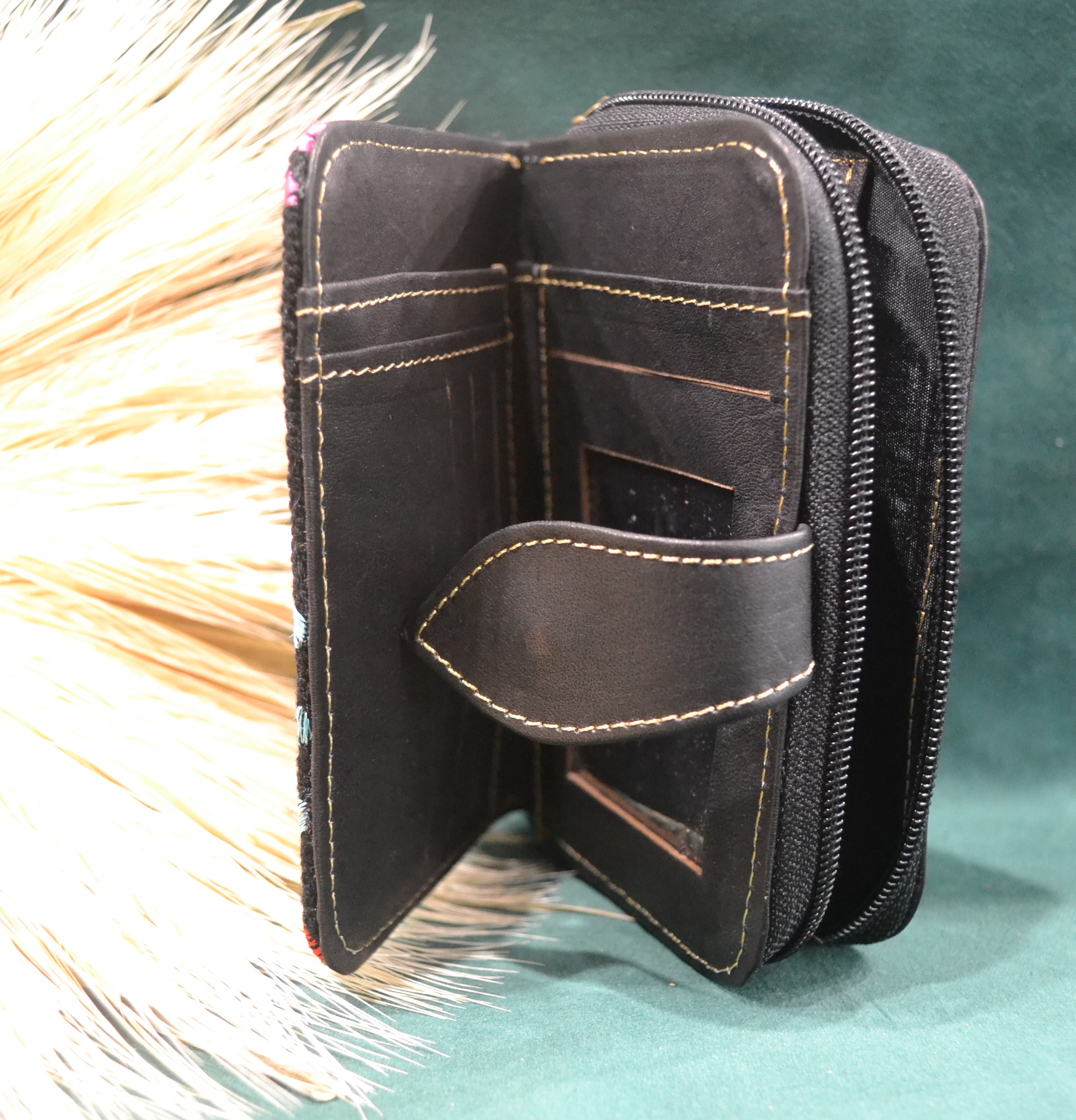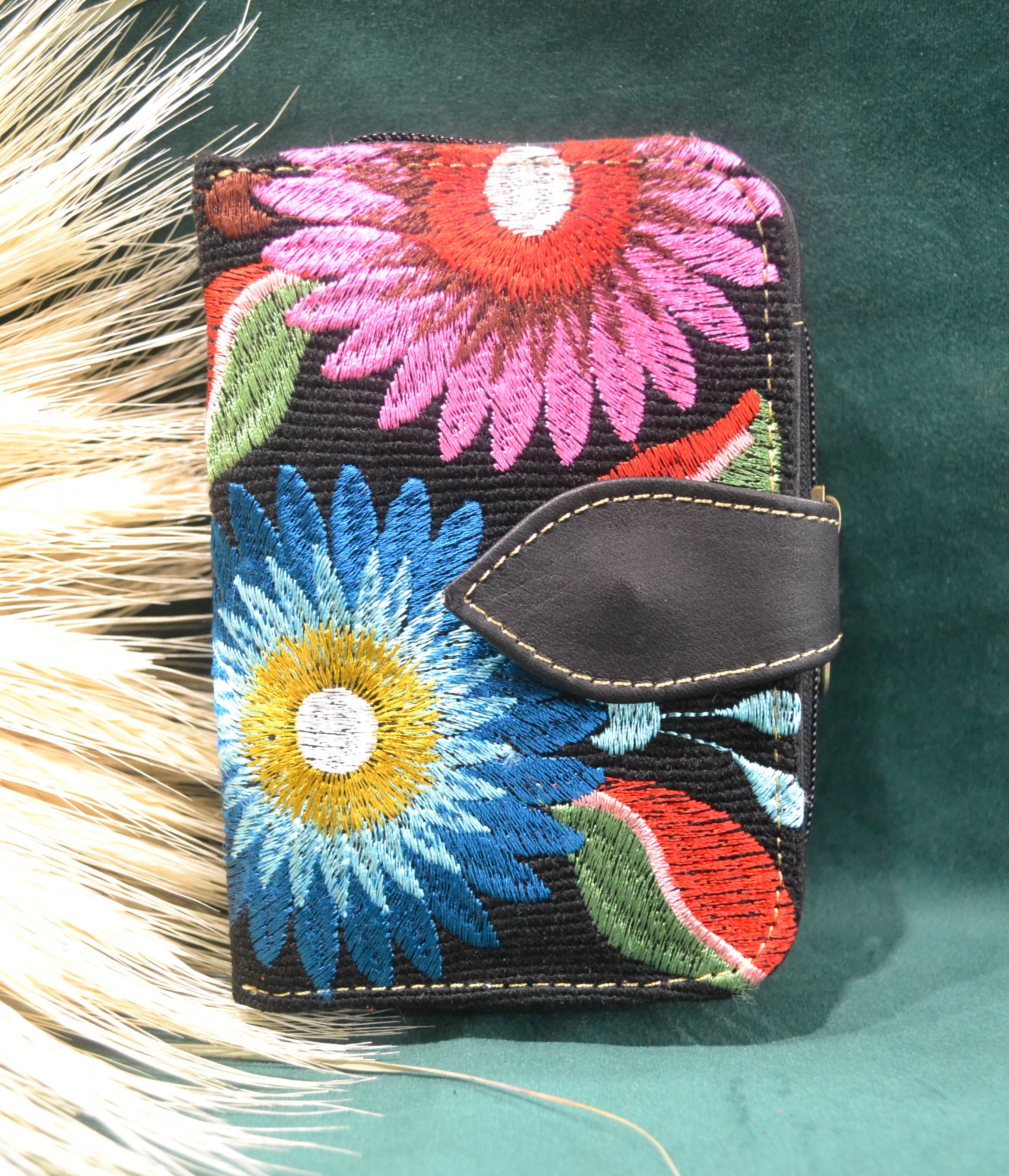 Portmonetka z ciemnobrązowej skóry z kolorowym kwiatowym haftem.Portmonetka z ciemnobrązowej skóry z kolorowym kwiatowym haftem.Portmonetka z ciemnobrązowej skóry z kolorowym kwiatowym haftem.