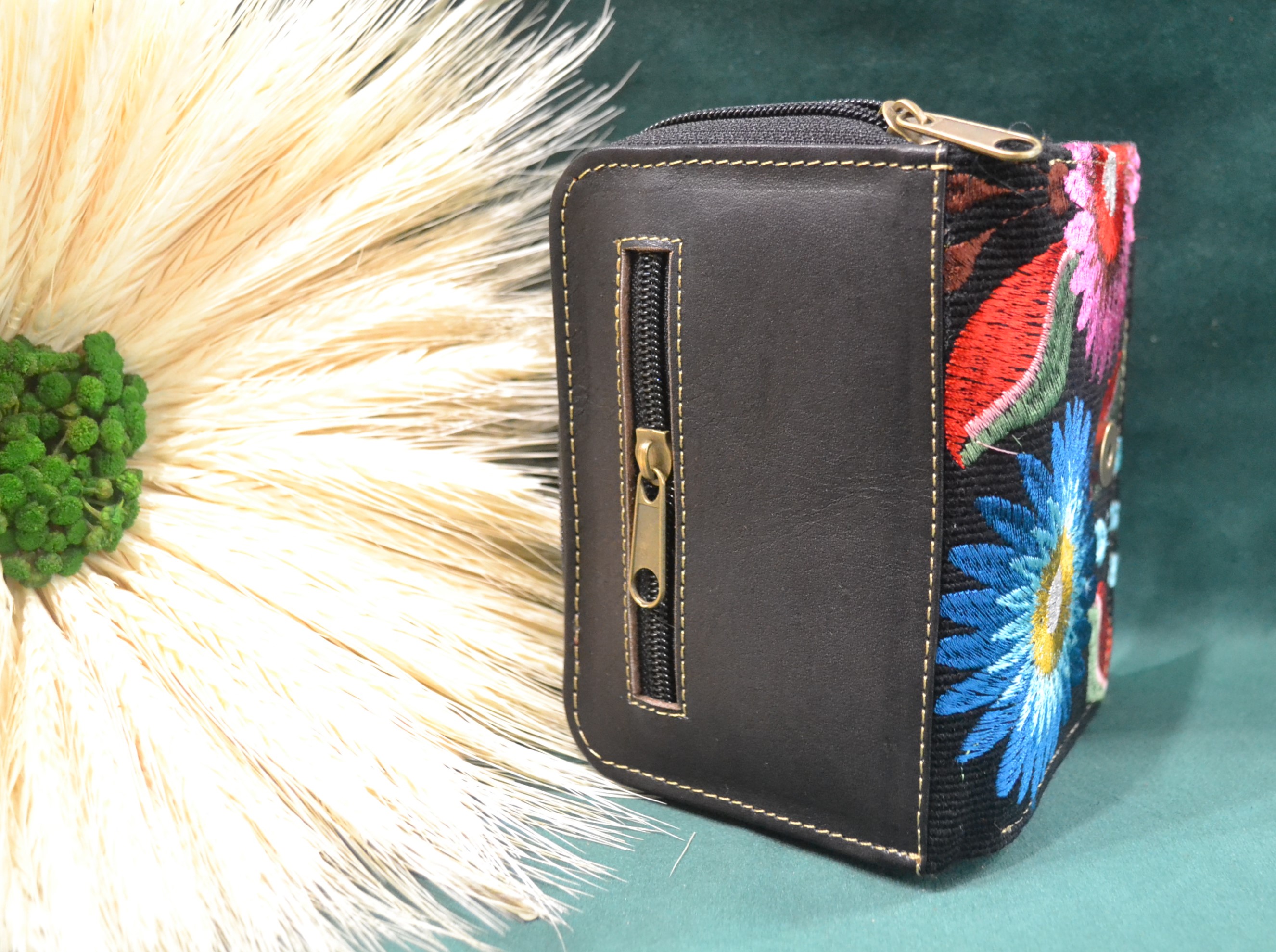 Jeśli potrzebny Tobie mały portfel z portmonetką .  Taki który nie zajmuje wiele miejsca  lub idealnie mieści się w dłoni . Na szybkie zakupy w małym osiedlowym sklepie lub w wielkim markecie .  Zobacz ten model . 100% naturalna ciemnobrązowa skóra pokryta kolorowym  kwiatowym haftem . Zaprojektowany i uszyty wysoko w Ekwadorskich Andach przez mały rzemieślniczy warsztat kaletniczy. Portfel posiada przegrodę na banknoty i na monety a także kieszonki na karty płatnicze.