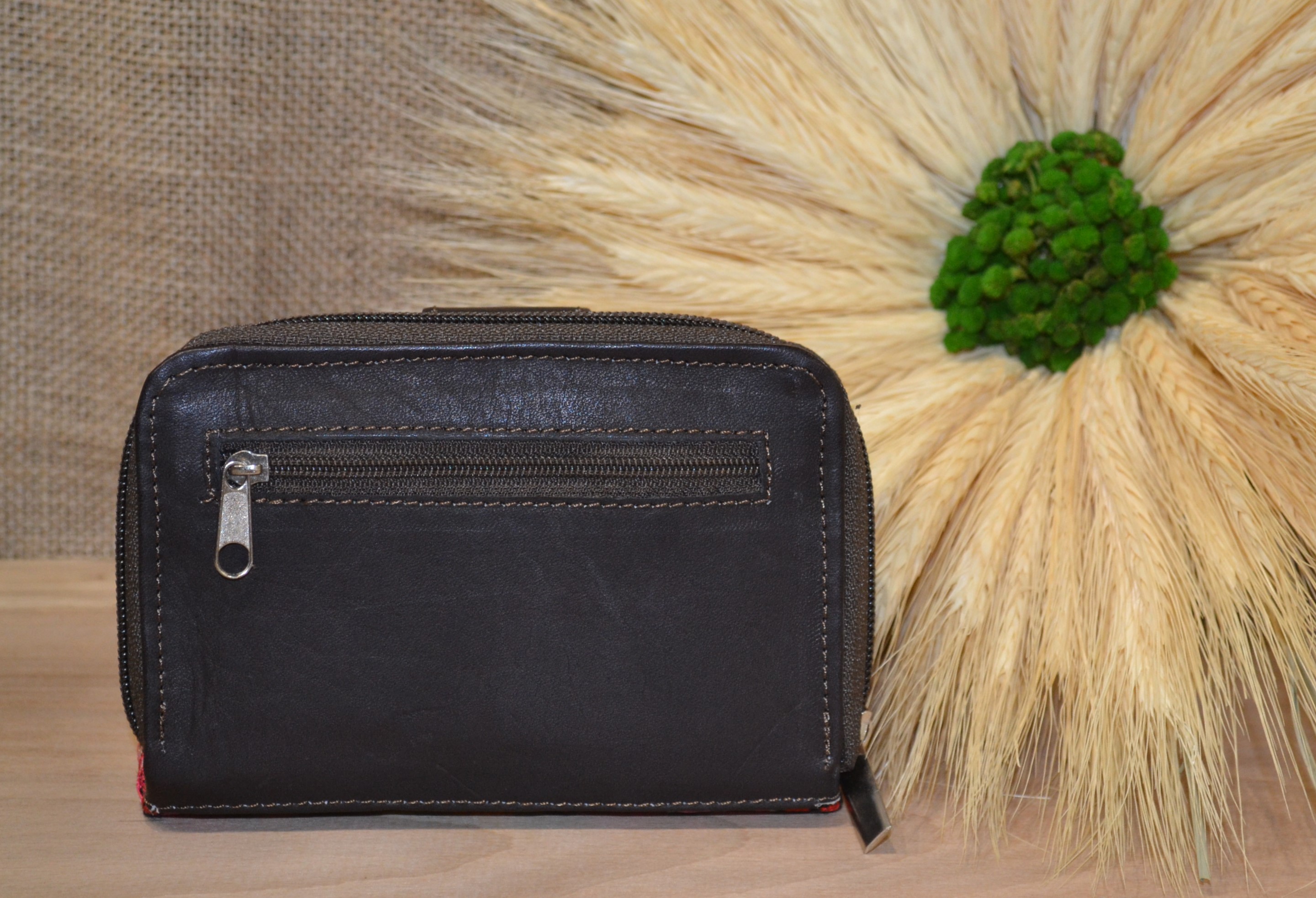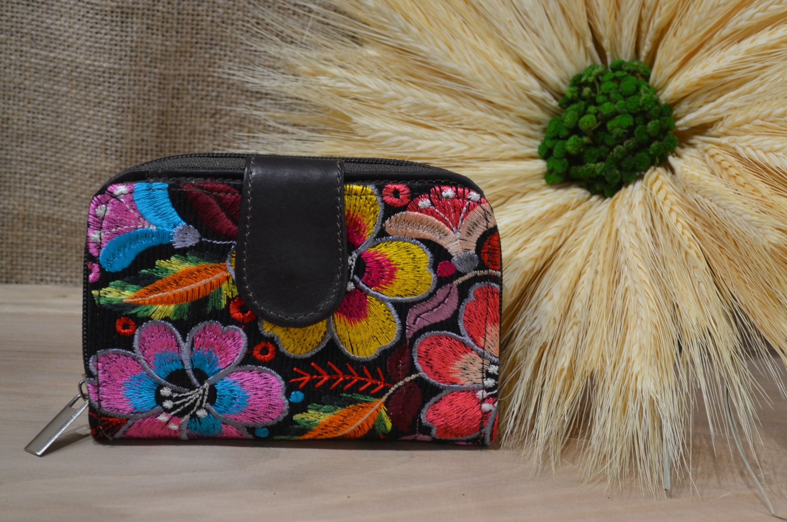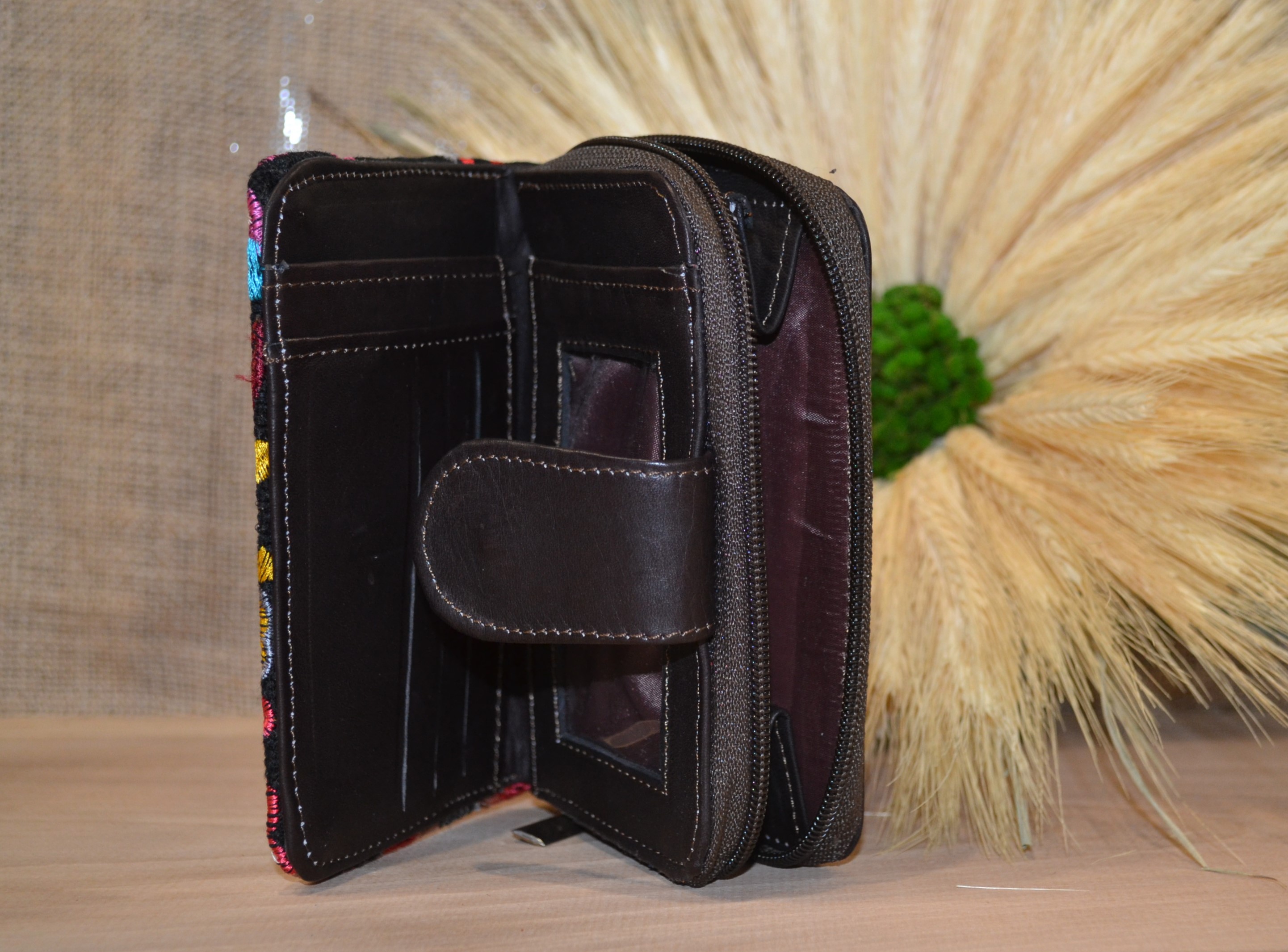 Jeśli potrzebny Tobie mały portfel z portmonetką . Taki który nie zajmuje wiele miejsca lub idealnie mieści się w dłoni . Na szybkie zakupy w małym osiedlowym sklepie lub w wielkim markecie . Zobacz ten model . 100% naturalna ciemnobrązowa skóra pokryta kolorowym kwiatowym haftem . Zaprojektowany i uszyty wysoko w Ekwadorskich Andach przez mały rzemieślniczy warsztat kaletniczy. Portfel posiada przegrodę na banknoty i na monety a także kieszonki na karty płatnicze.