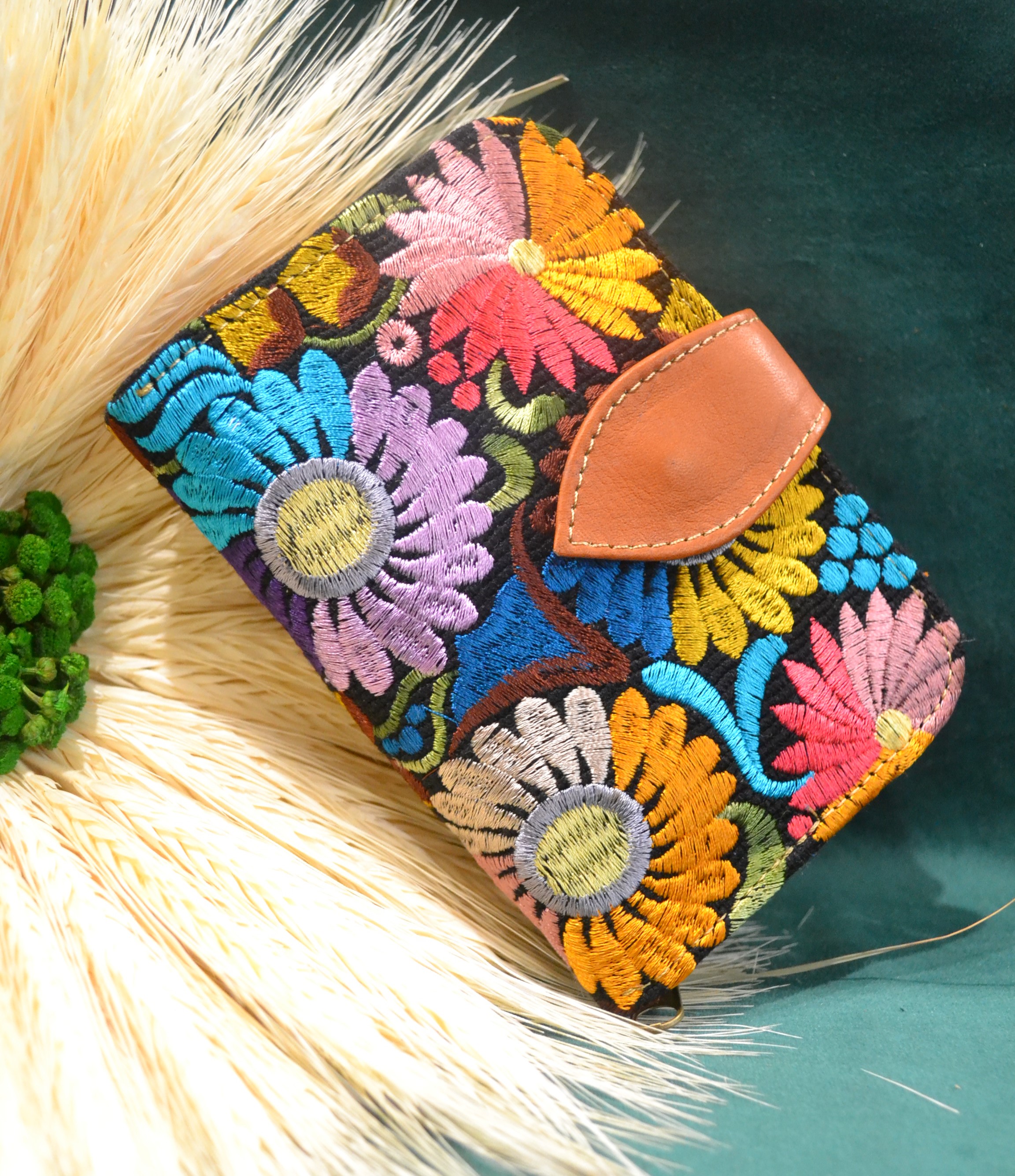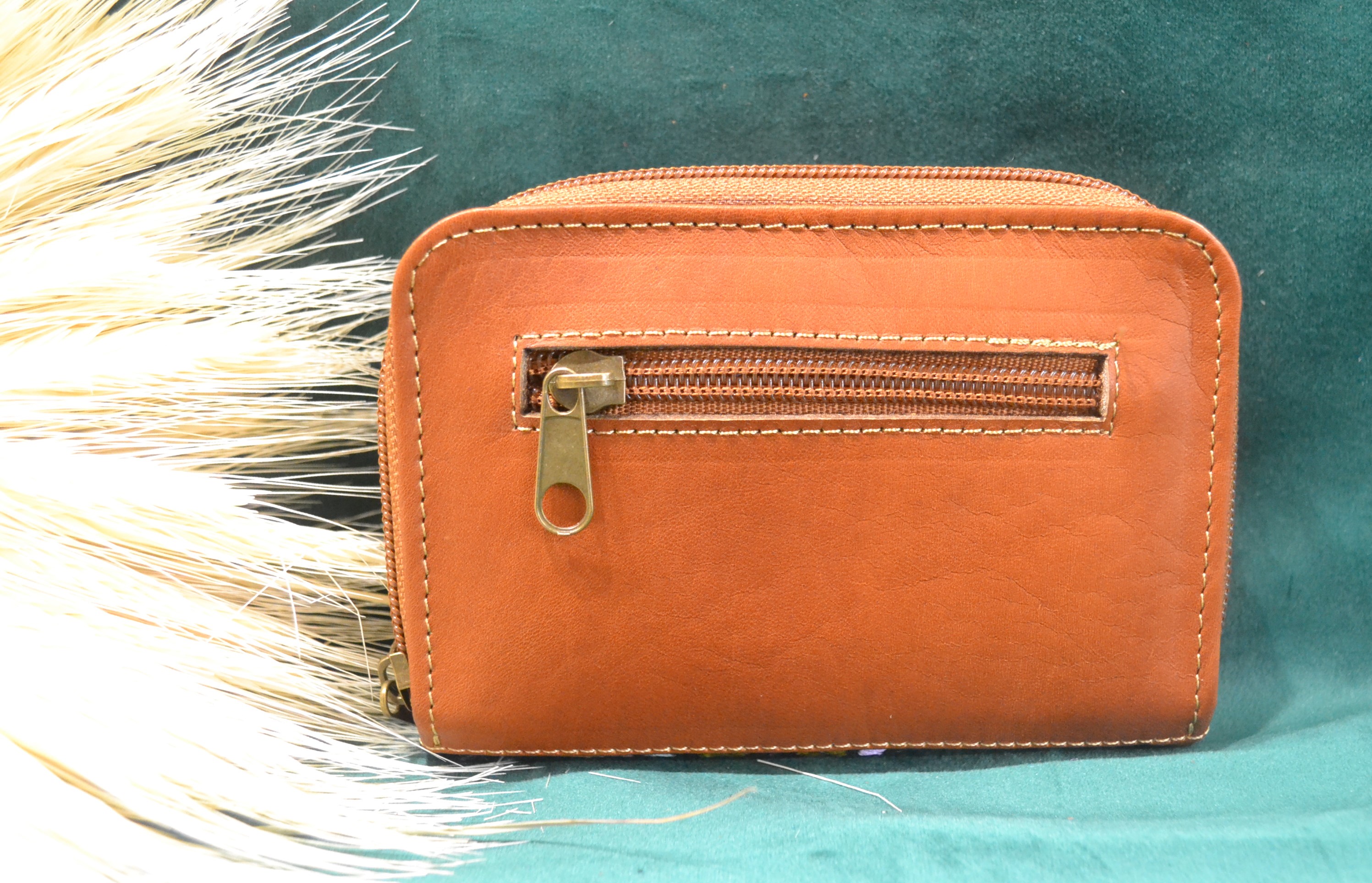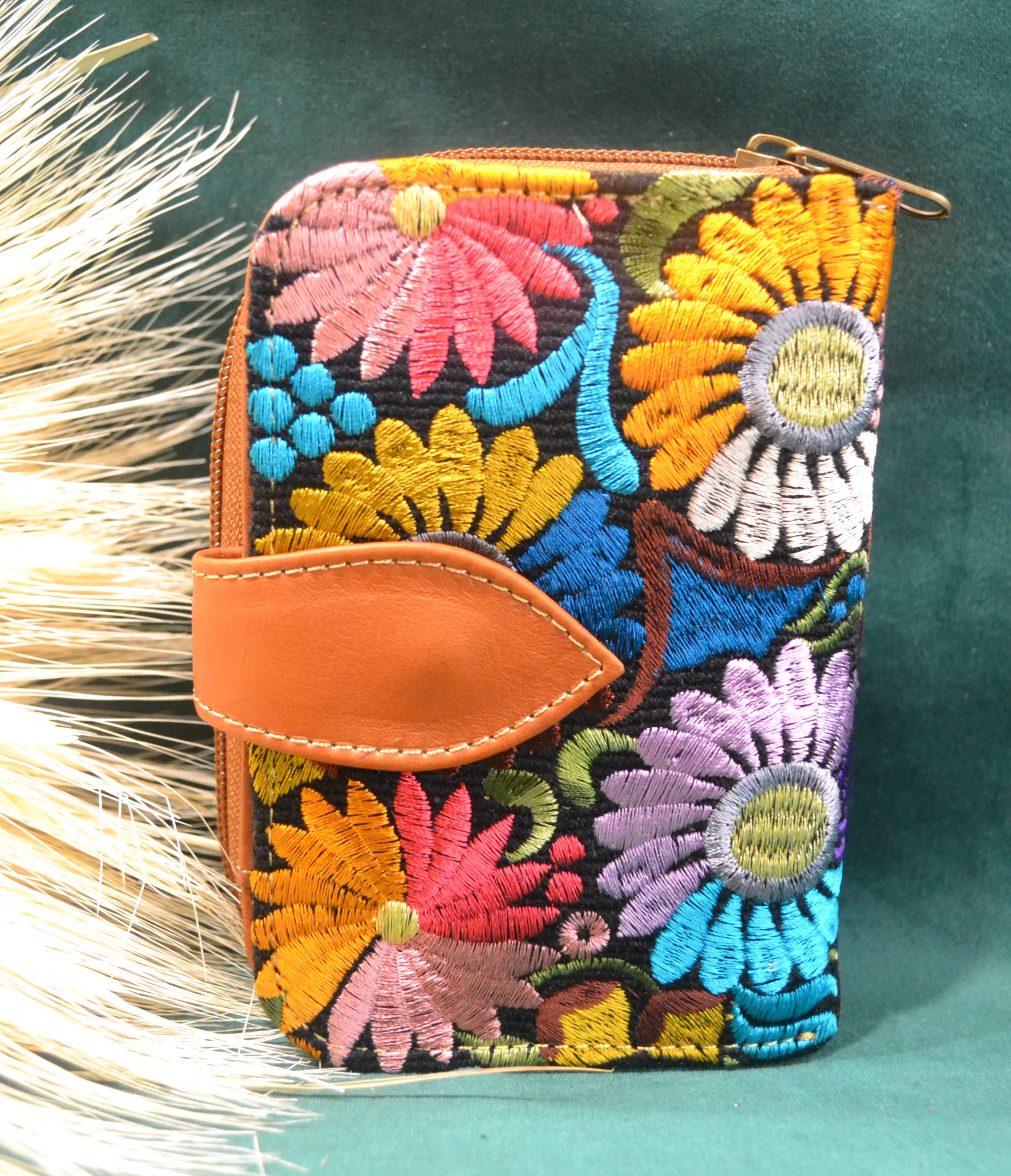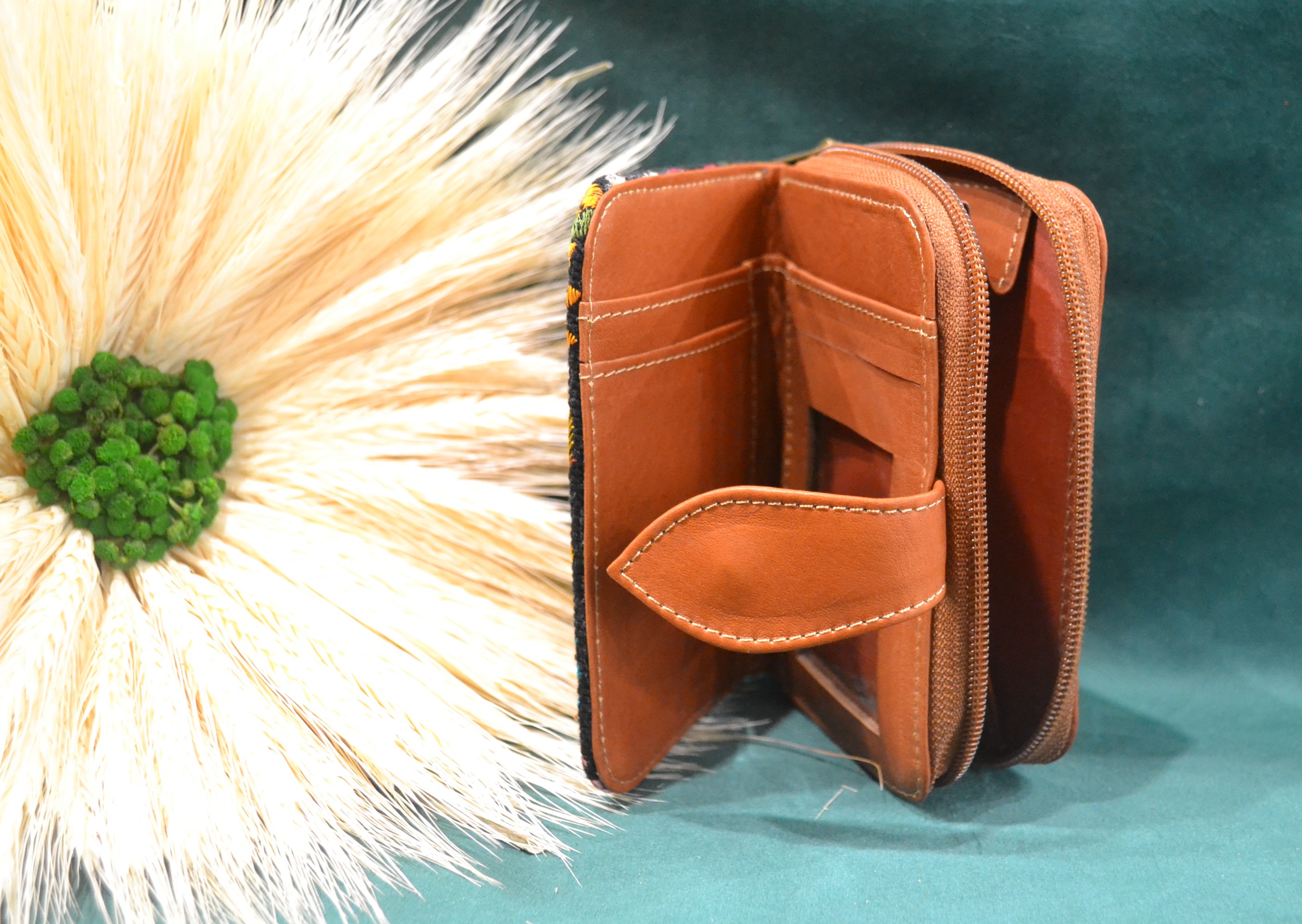 Jeśli potrzebny Tobie mały portfel z portmonetką . Taki który nie zajmuje wiele miejsca lub idealnie mieści się w dłoni . Na szybkie zakupy w małym osiedlowym sklepie lub w wielkim markecie . Zobacz ten model . 100% naturalna jasnobrązowa skóra pokryta kolorowym kwiatowym haftem . Zaprojektowany i uszyty wysoko w Ekwadorskich Andach przez mały rzemieślniczy warsztat kaletniczy. Portfel posiada przegrodę na banknoty i na monety a także kieszonki na karty płatnicze.