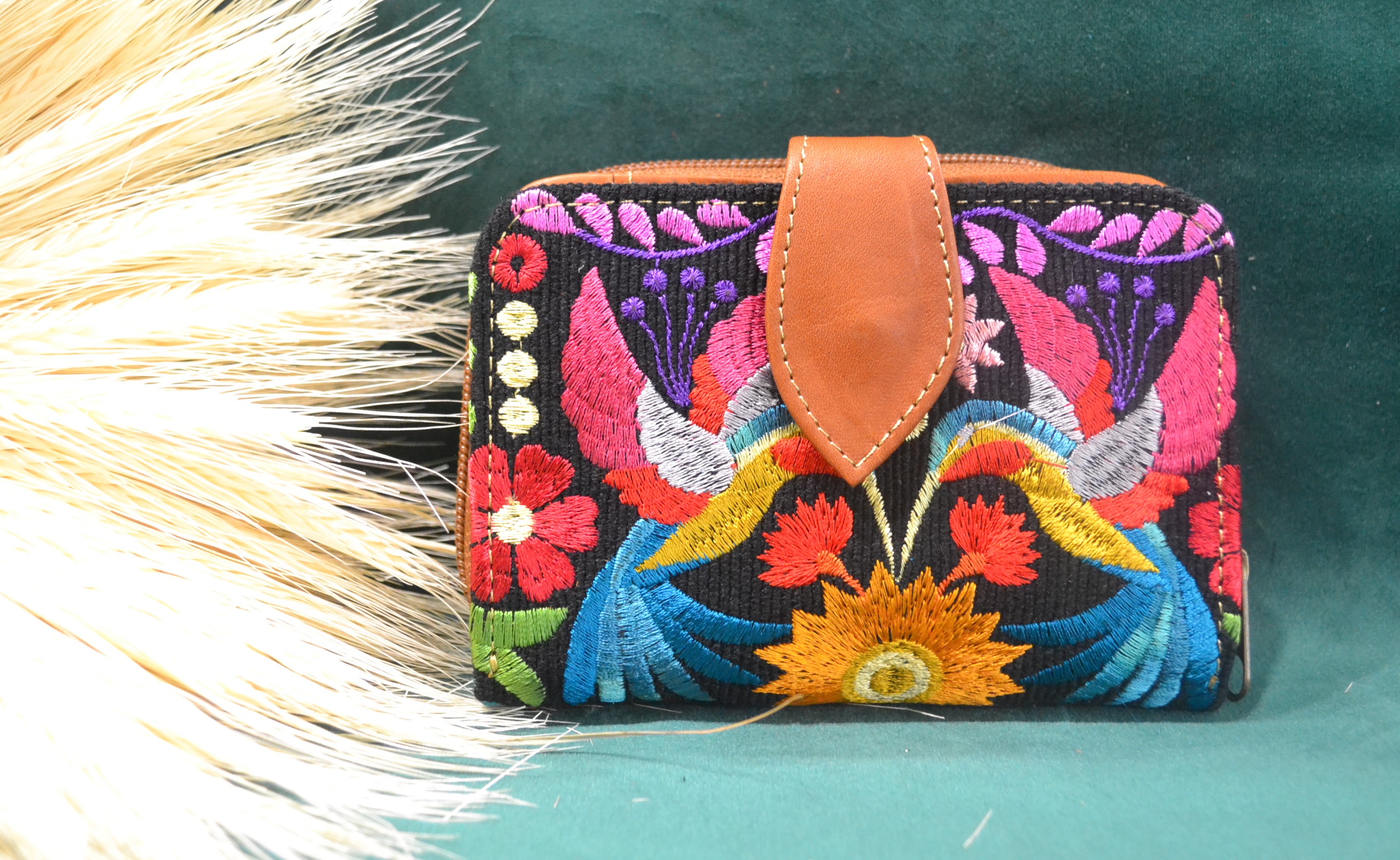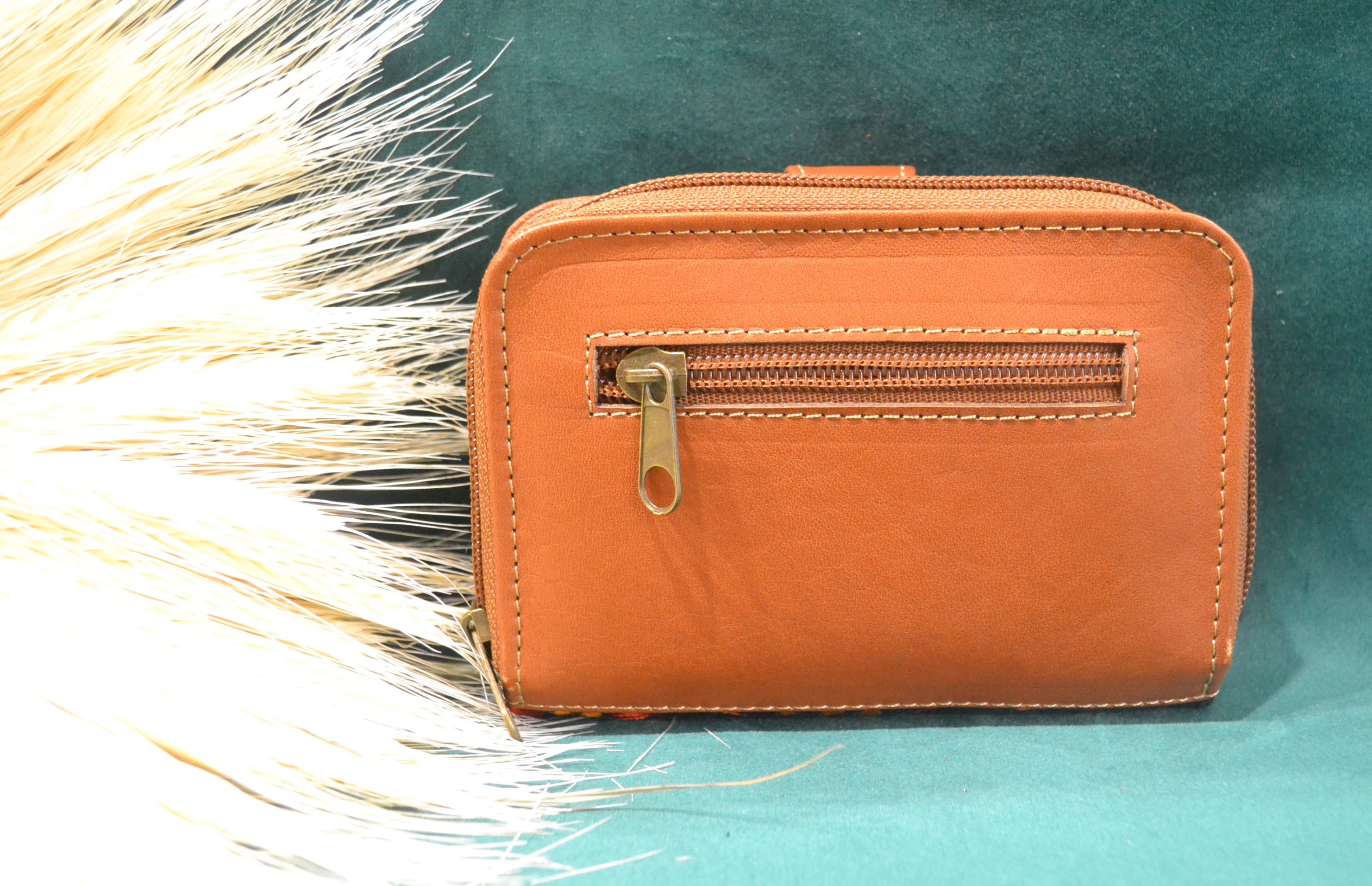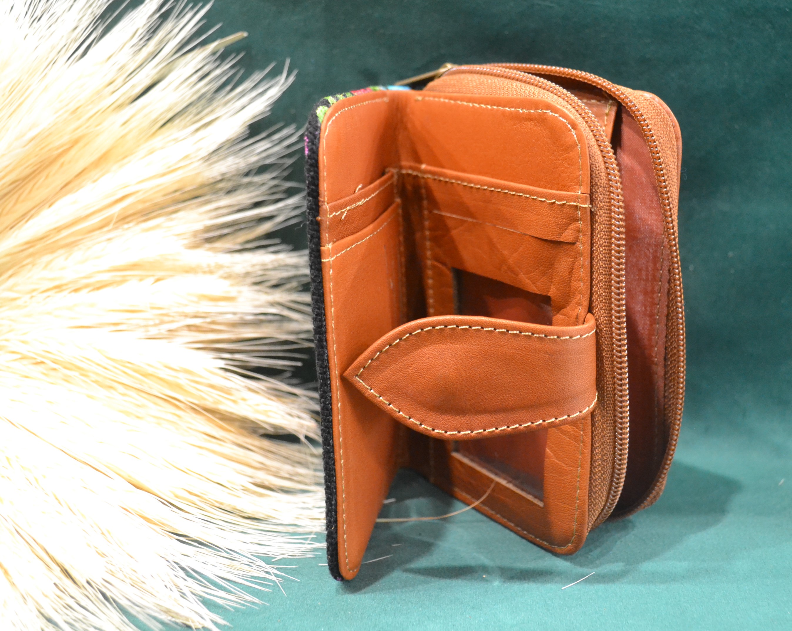 Jeśli potrzebny Tobie mały portfel z portmonetką .  Taki który nie zajmuje wiele miejsca  lub idealnie mieści się w dłoni . Na szybkie zakupy w małym osiedlowym sklepie lub w wielkim markecie .  Zobacz ten model . 100% naturalna jasnobrązowa skóra pokryta kolorowym  kwiatowym haftem . Zaprojektowany i uszyty wysoko w Ekwadorskich Andach przez mały rzemieślniczy warsztat kaletniczy. Portfel posiada przegrodę na banknoty i na monety a także kieszonki na karty płatnicze.