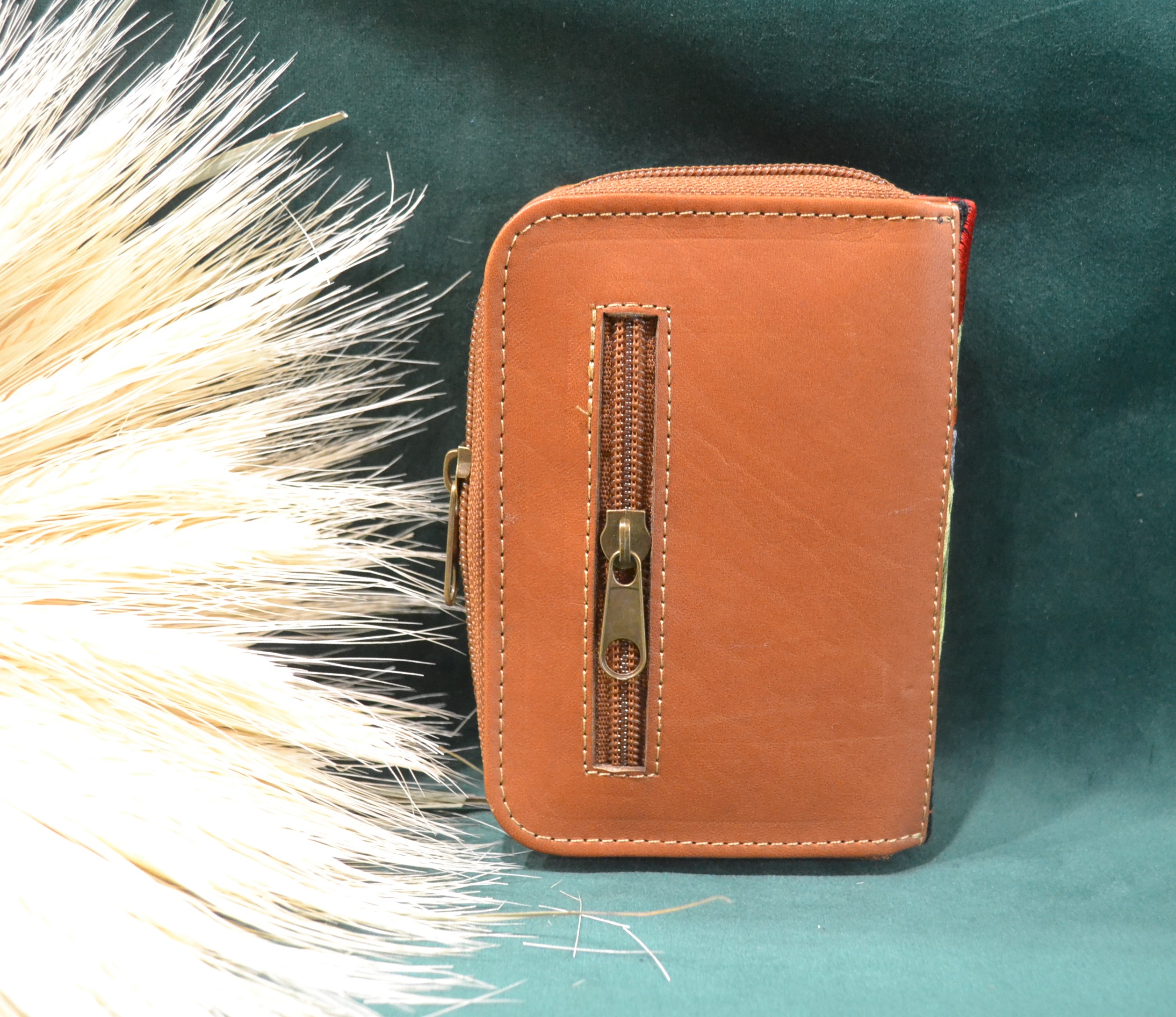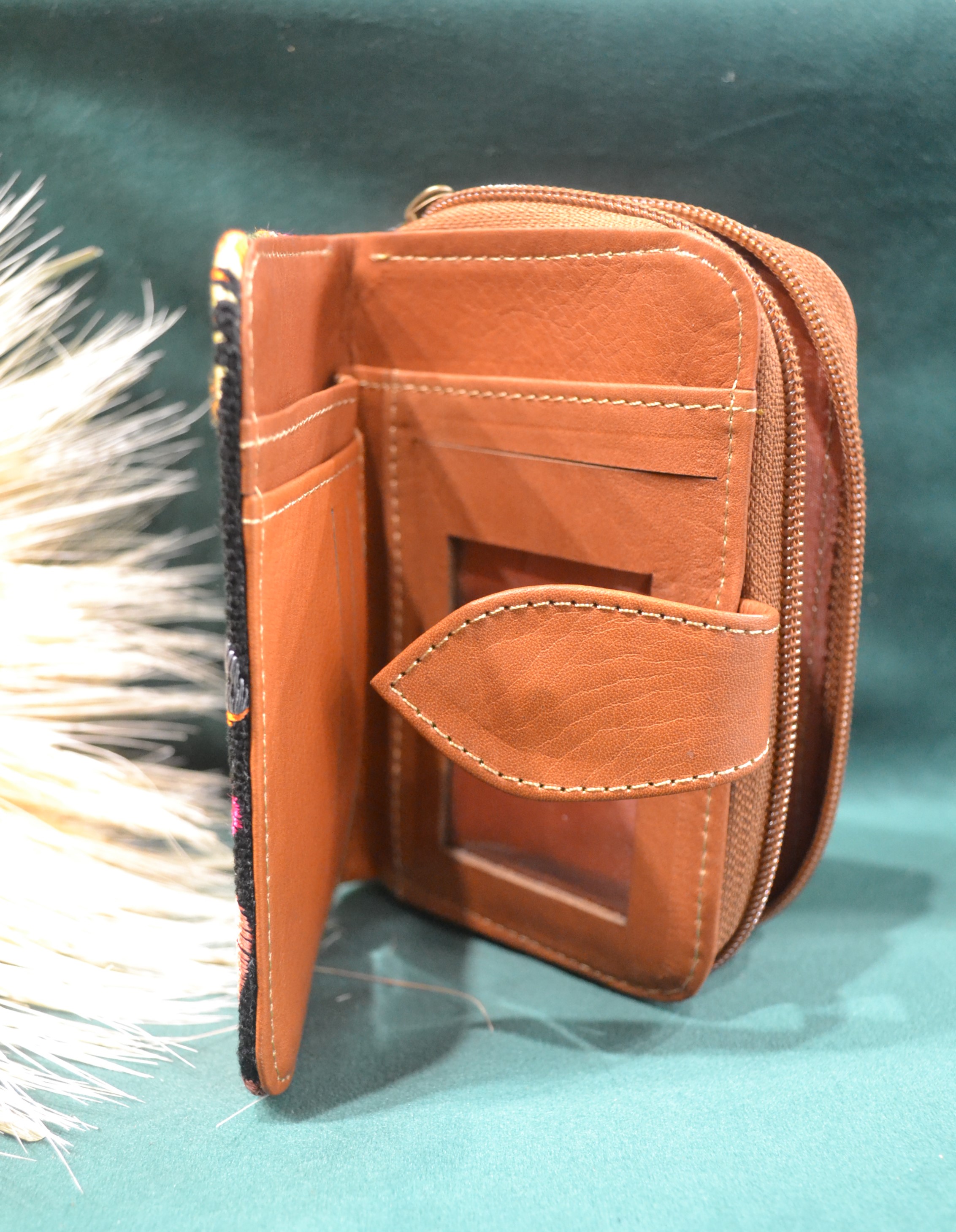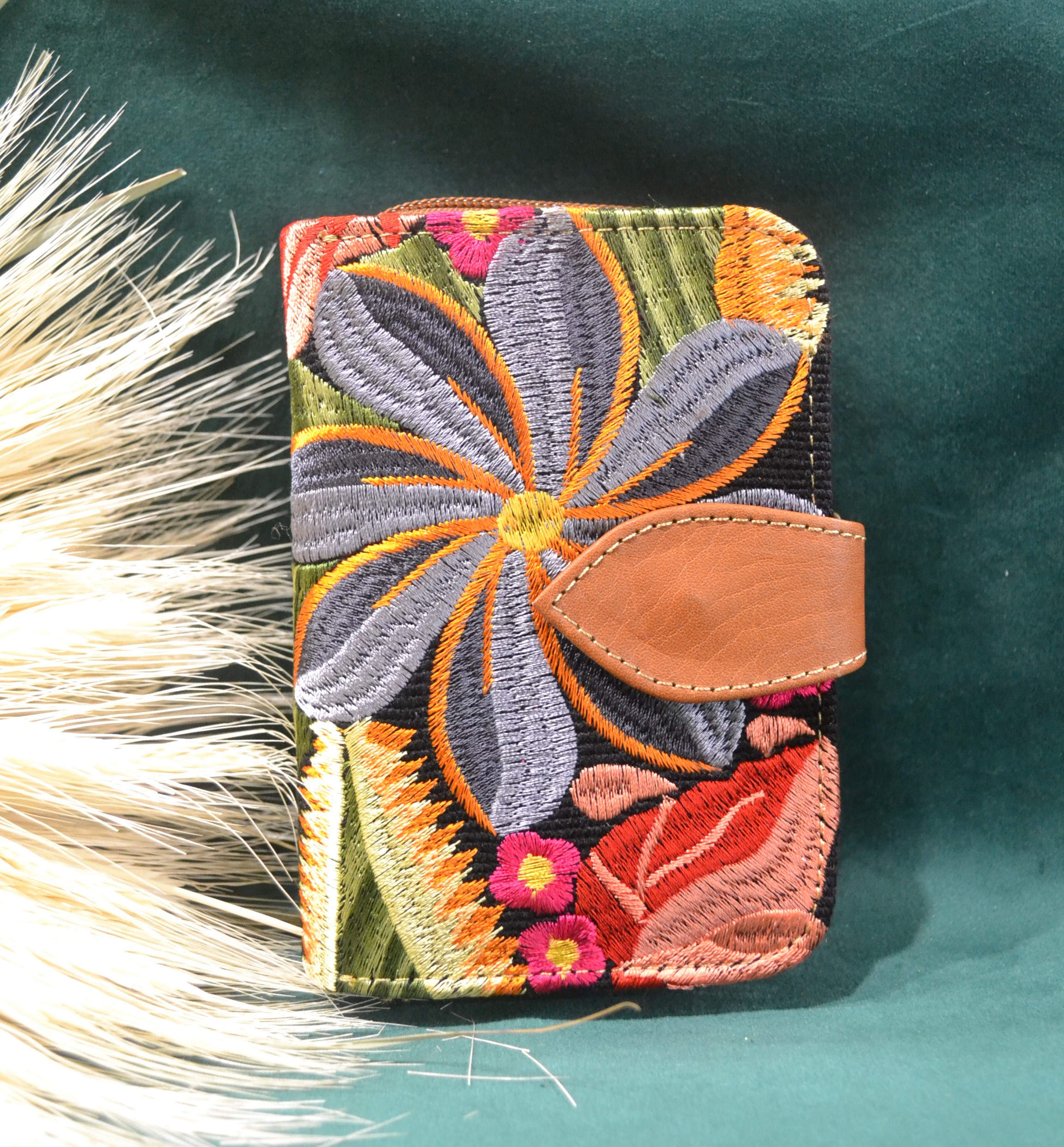 Jeśli potrzebny Tobie mały portfel z portmonetką .  Taki który nie zajmuje wiele miejsca  lub idealnie mieści się w dłoni . Na szybkie zakupy w małym osiedlowym sklepie lub w wielkim markecie .  Zobacz ten model . 100% naturalna jasnobrązowa skóra pokryta kolorowym  kwiatowym haftem . Zaprojektowany i uszyty wysoko w Ekwadorskich Andach przez mały rzemieślniczy warsztat kaletniczy. Portfel posiada przegrodę na banknoty i na monety a także kieszonki na karty płatnicze.