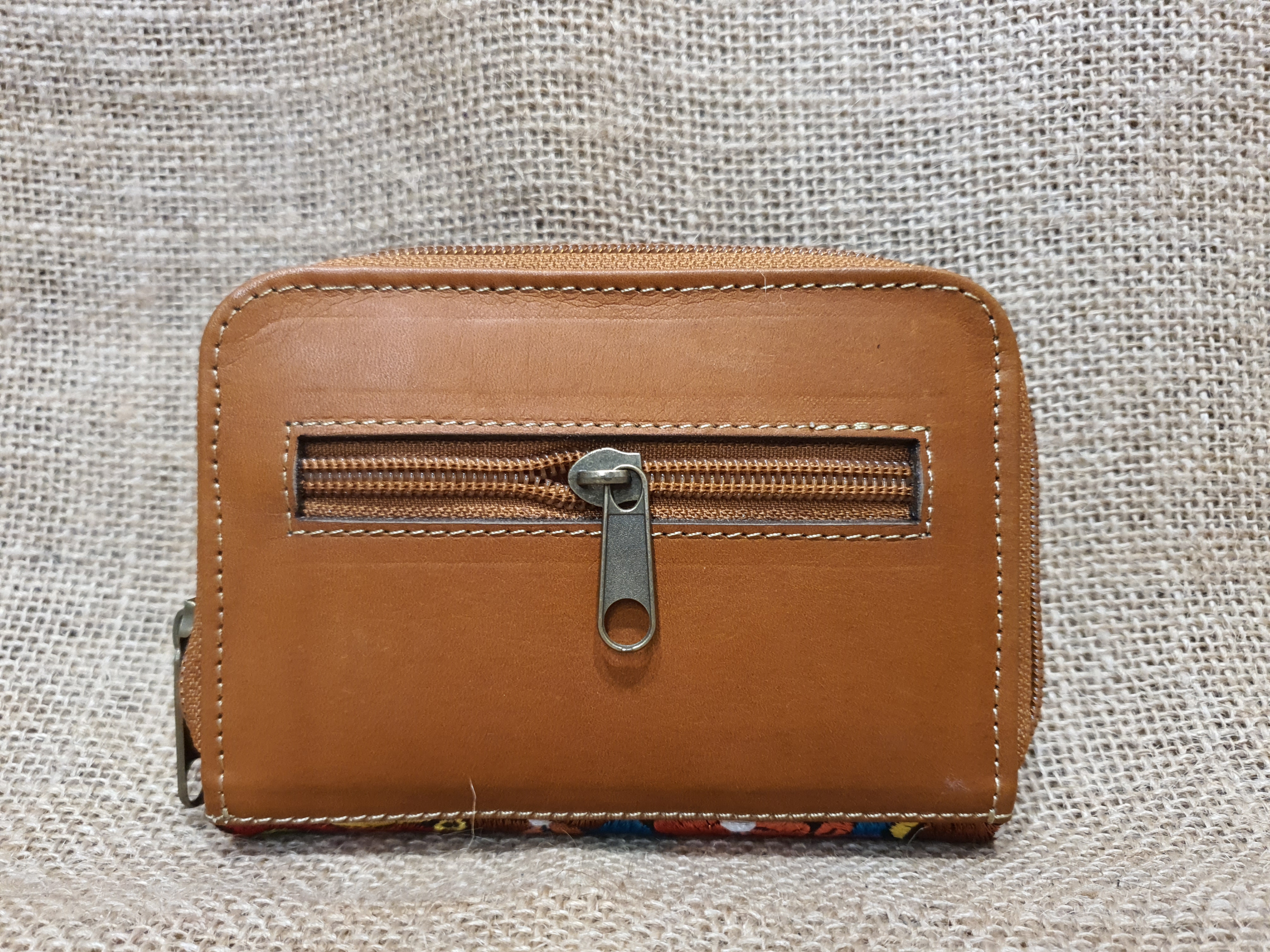 Strona główna » Wyroby ze skóry » Portfele etno ze skóry » Portmonetka z jasnobrązowej skóry z kolorowym kwiatowym haftem.
