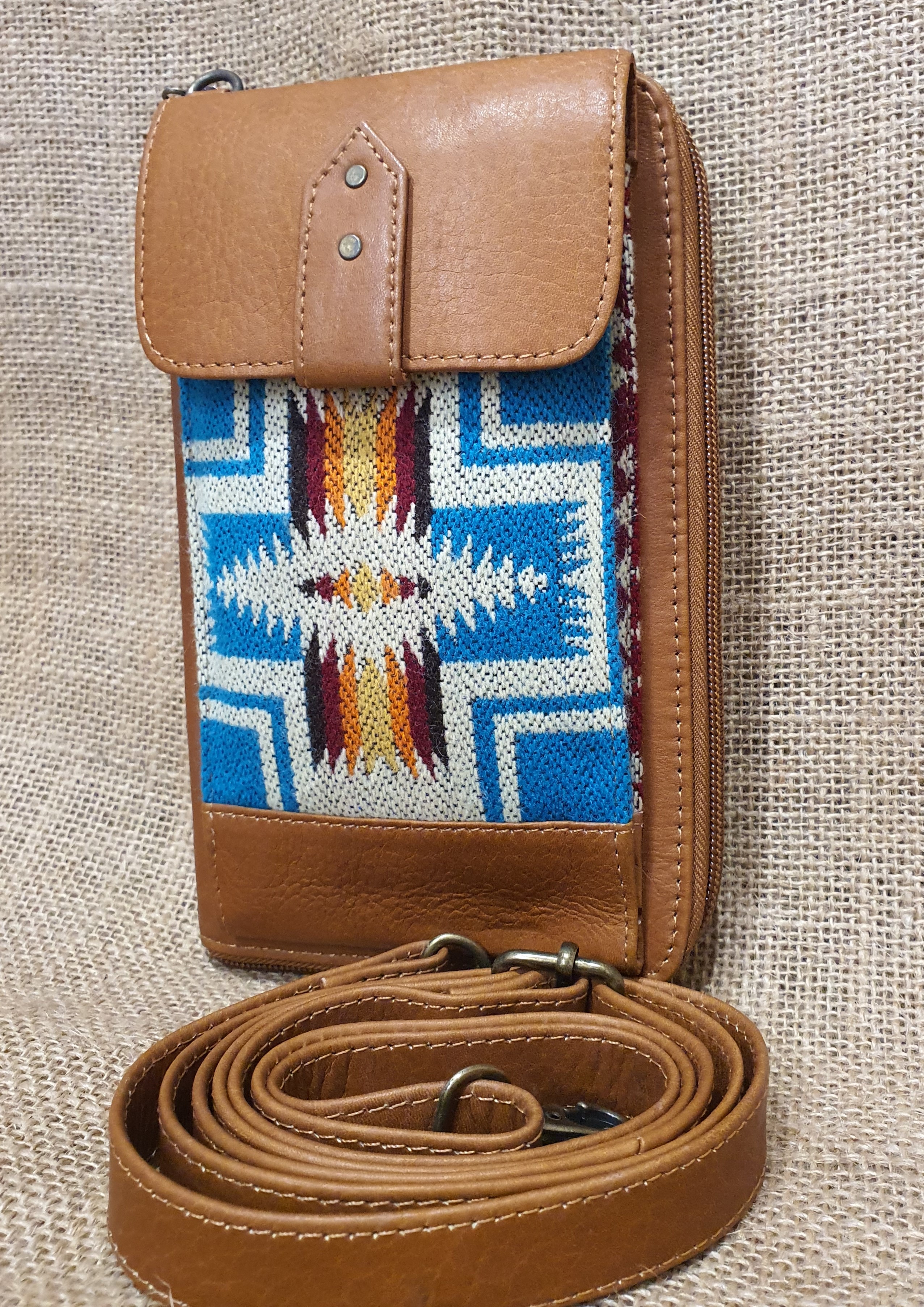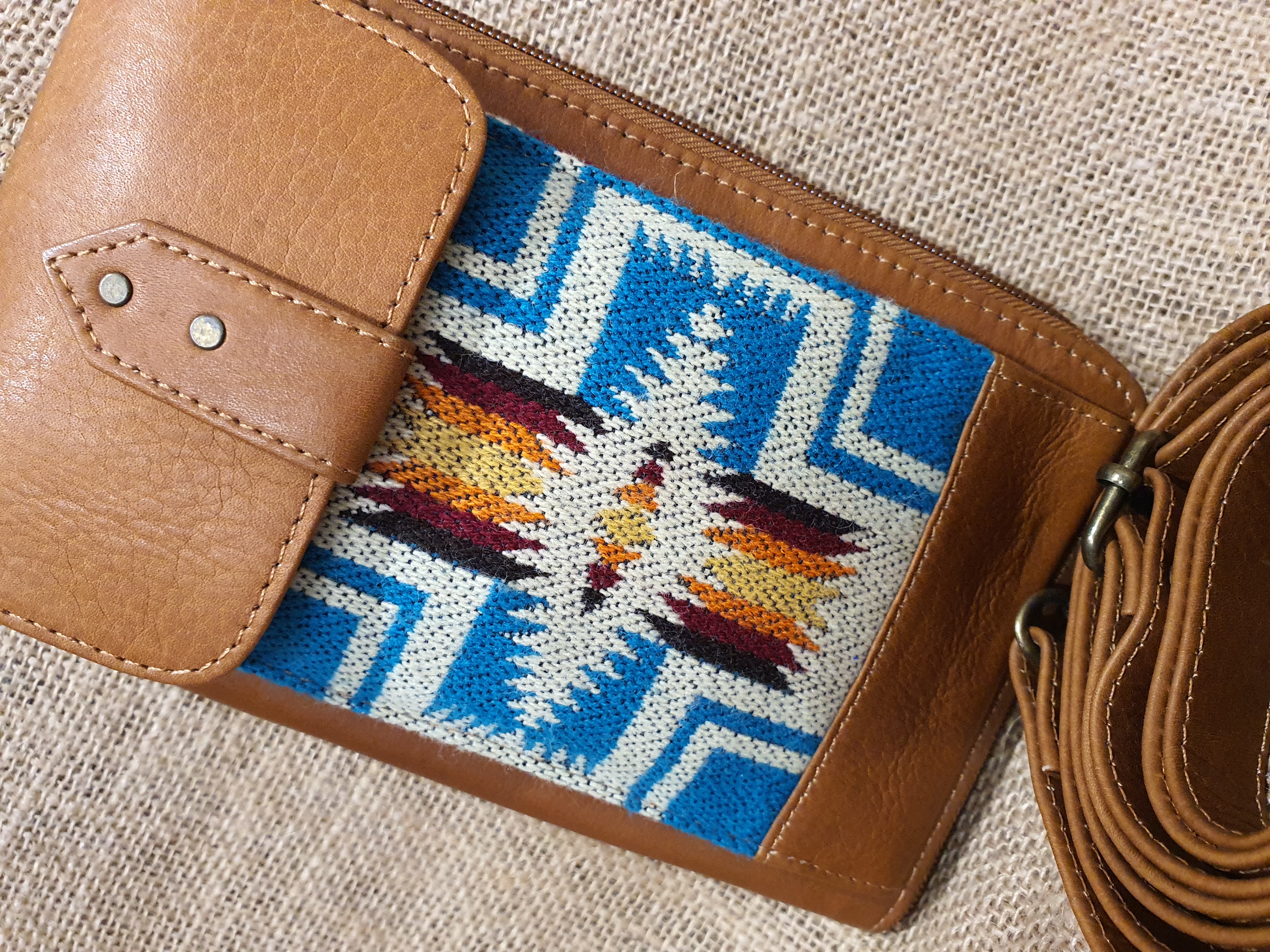 Naturalna 100% skóra w brązowym kolorze i etniczny haft wywodzący się z kultury Indian Kechua zamieszkujących ekwadorskie Andy to elegancja i niepowtarzalny styl którego będą tobie zazdrościć . Zestaw ten można nosić założony przez ramie na dodatkowym odczepianym pasku.