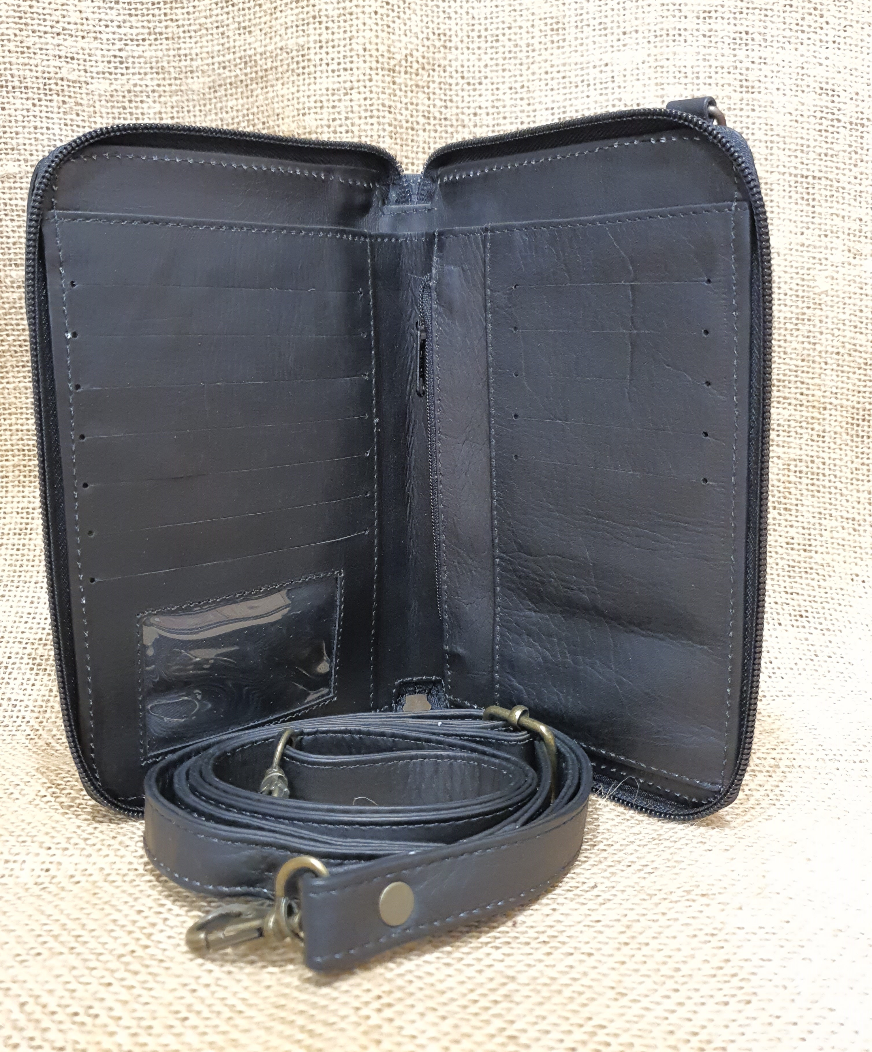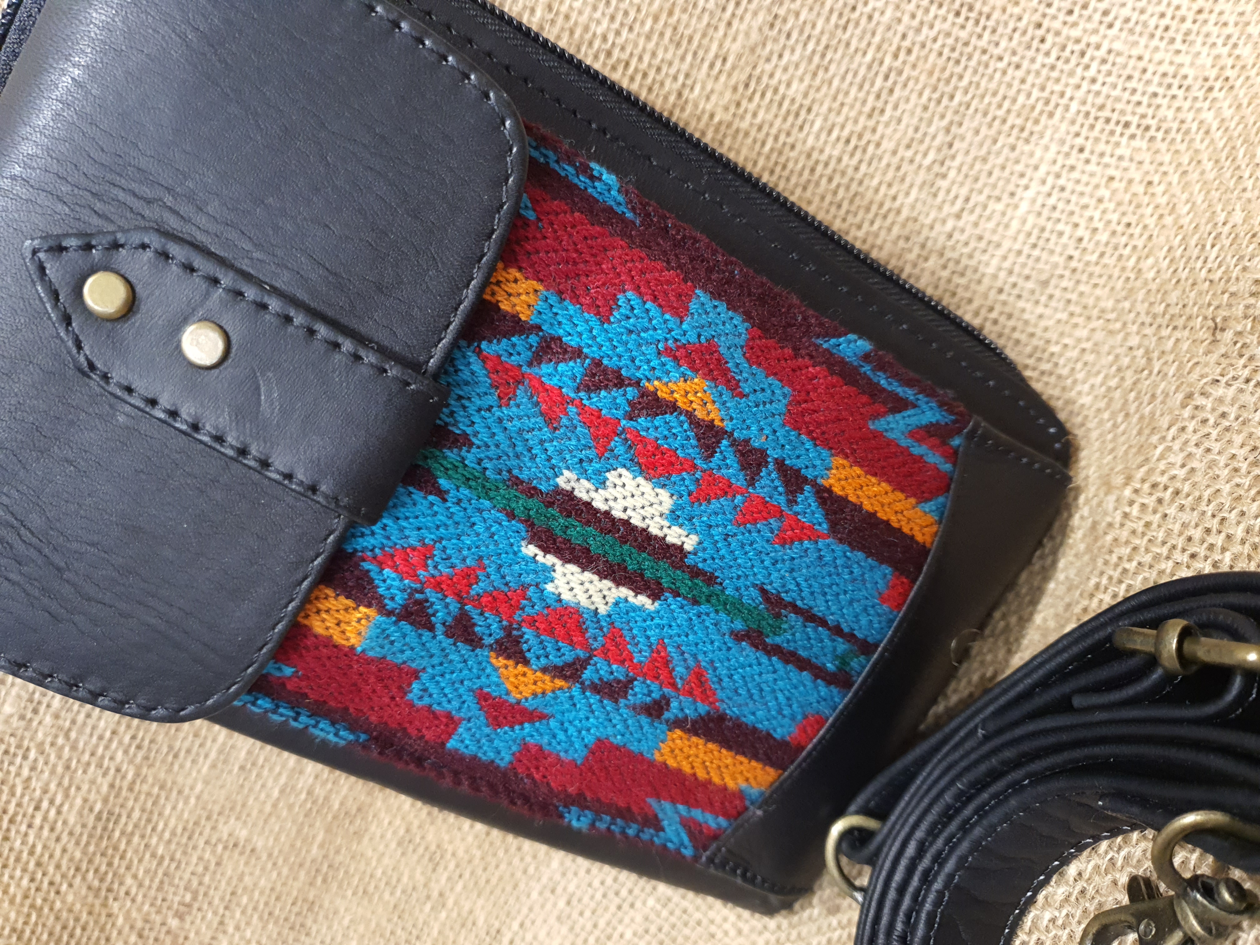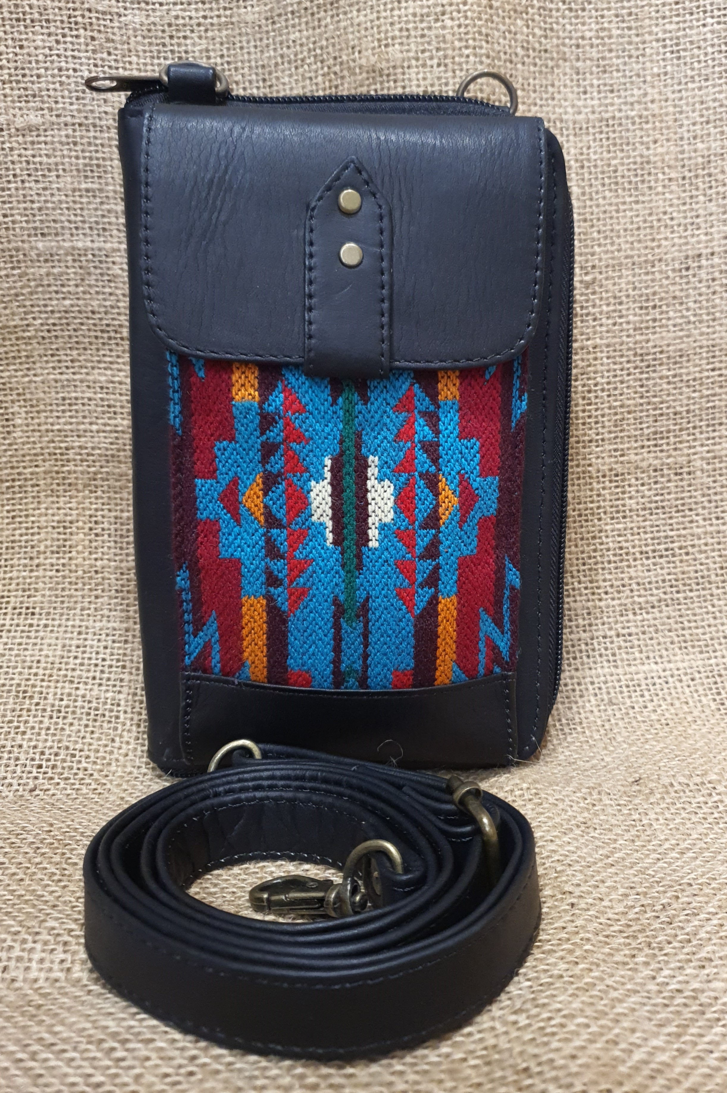 Portfel i etui na telefon w jednym . To idealne połącznie funkcji które potrzebne są tobie w codziennych sprawach. Naturalna 100% skóra w czarnym kolorze i etniczny haft wywodzący się z kultury Indian Kechua zamieszkujących ekwadorskie Andy to elegancja i niepowtarzalny styl którego będą tobie zazdrościć . Zestaw ten można nosić założony przez ramie na dodatkowym odczepianym pasku. Dostępny w kolorach jak na zdjęciu Wymiary: wysokość 20 cm szerokość 13 cm