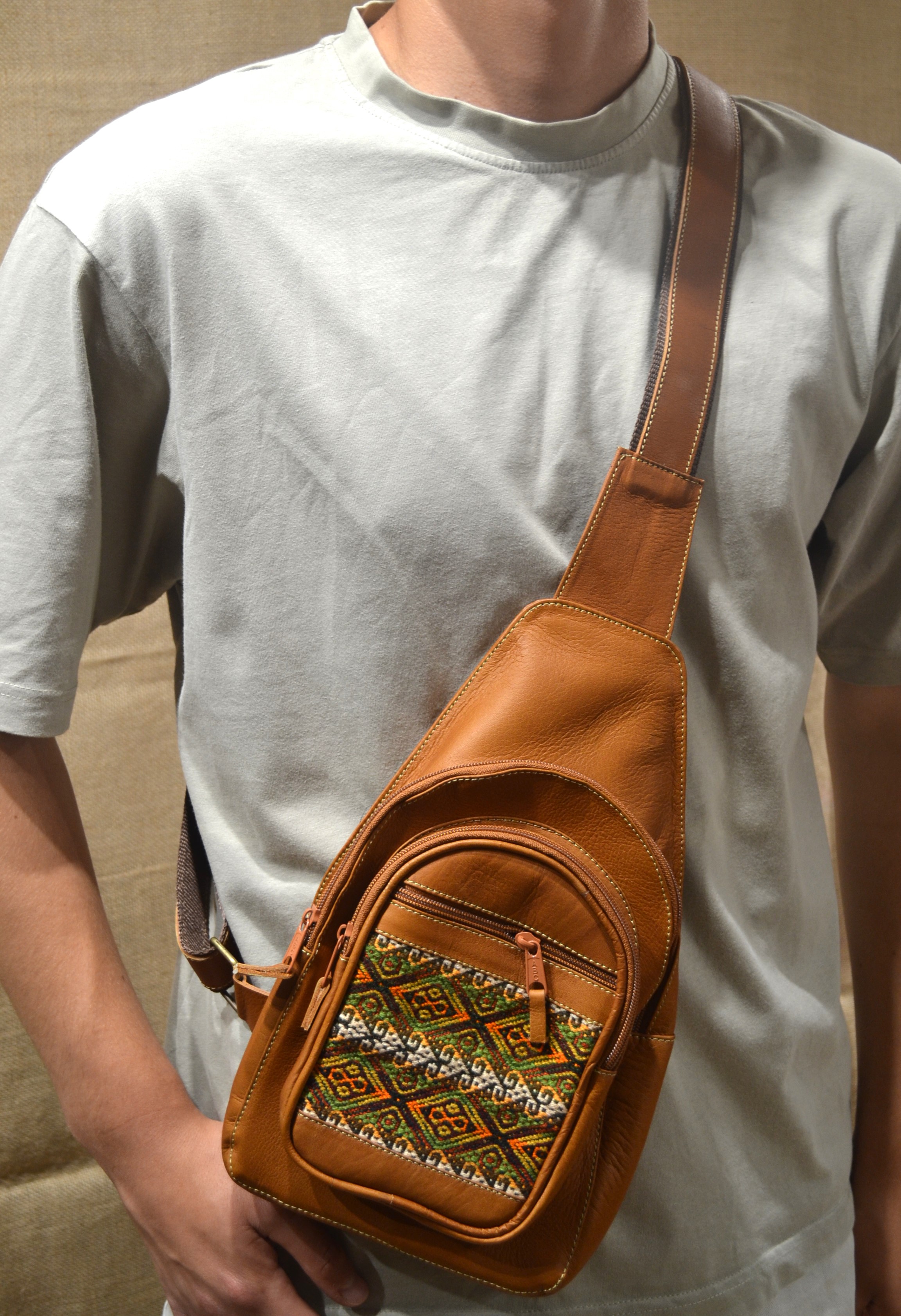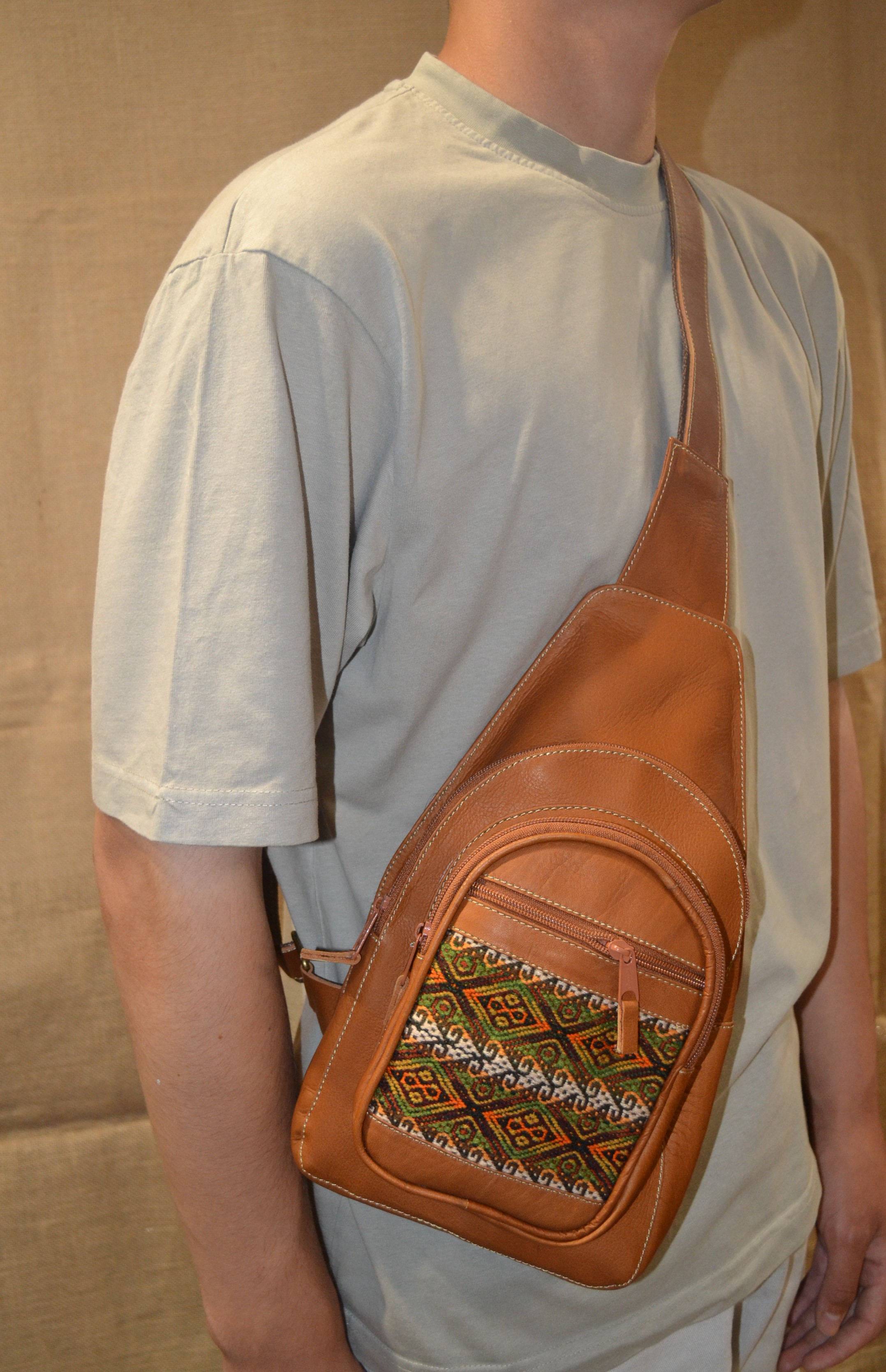 Szukasz torebki innej niż wszystkie , unikalnej w stylu jakiego nikt nie ma . Ten model jest idealny dla ciebie . Naturalna wytrzymała 100%  skóra i haftowane  etniczne detale to idealne połączenie . Tę torebkę można nosić założona przez plecy jak i przez pierś. Jej krój i szeroki pasek sprawiają że idealnie przylega do każdej sylwetki. Posiada cztery kieszenie zamykane zamkiem błyskawicznym.