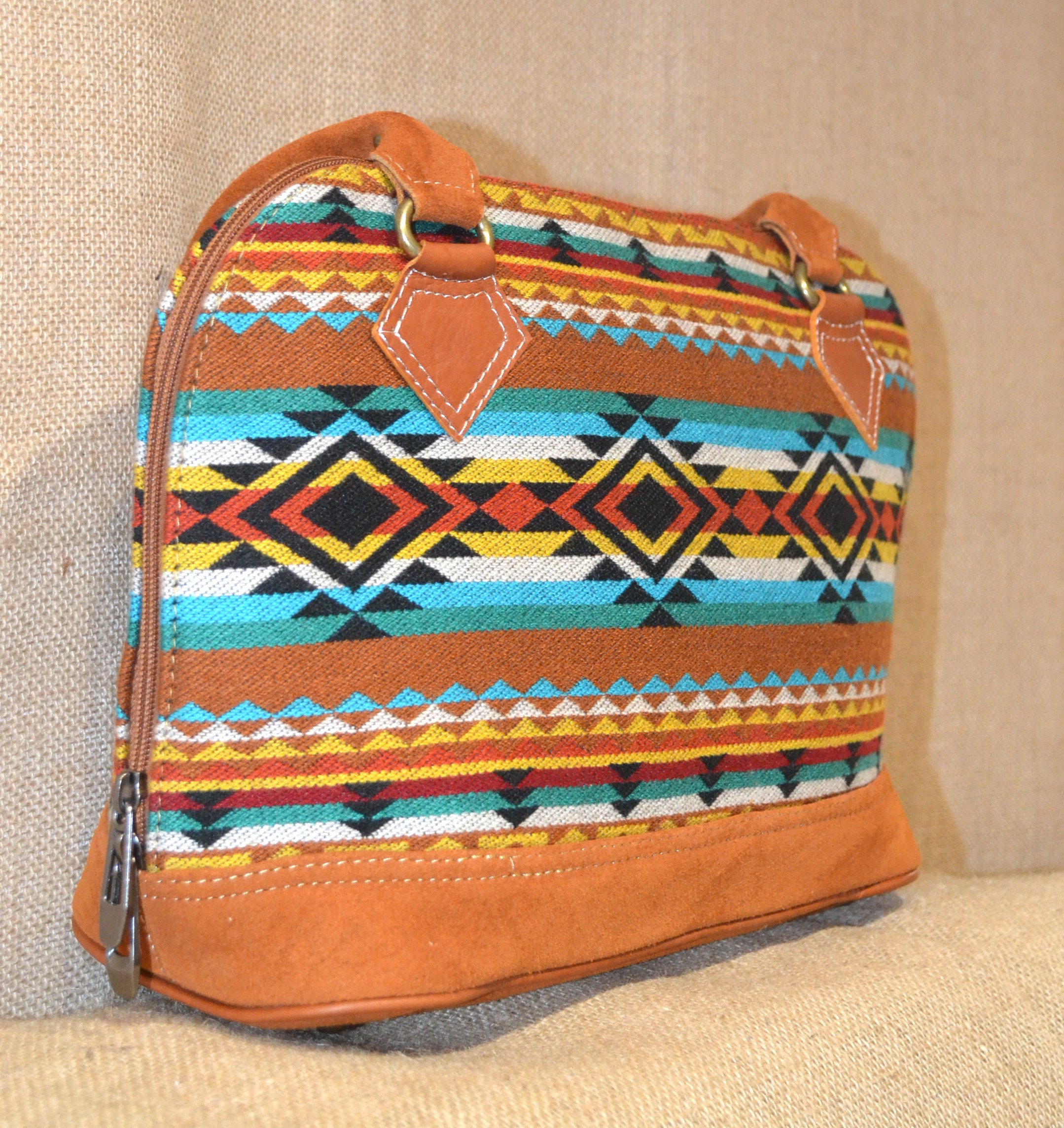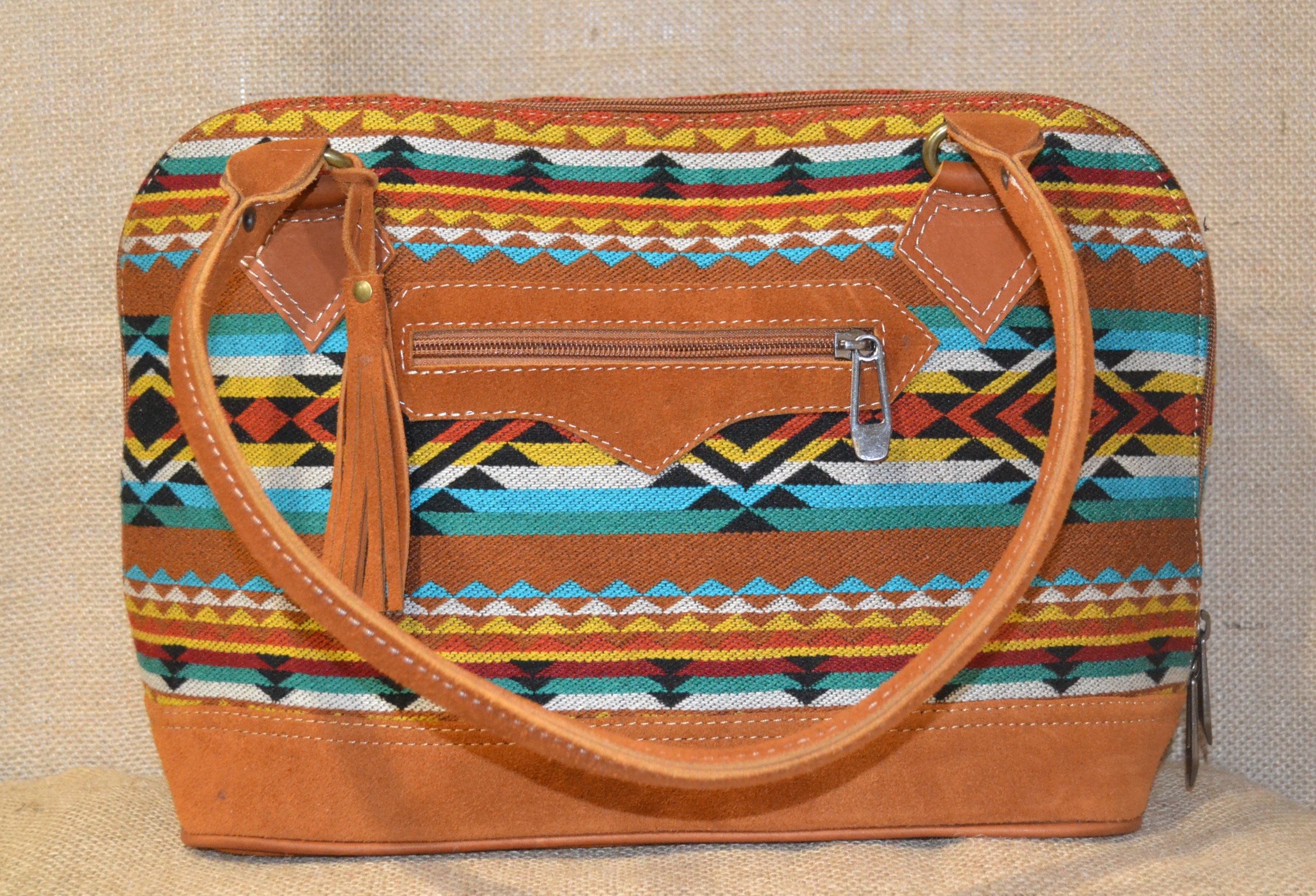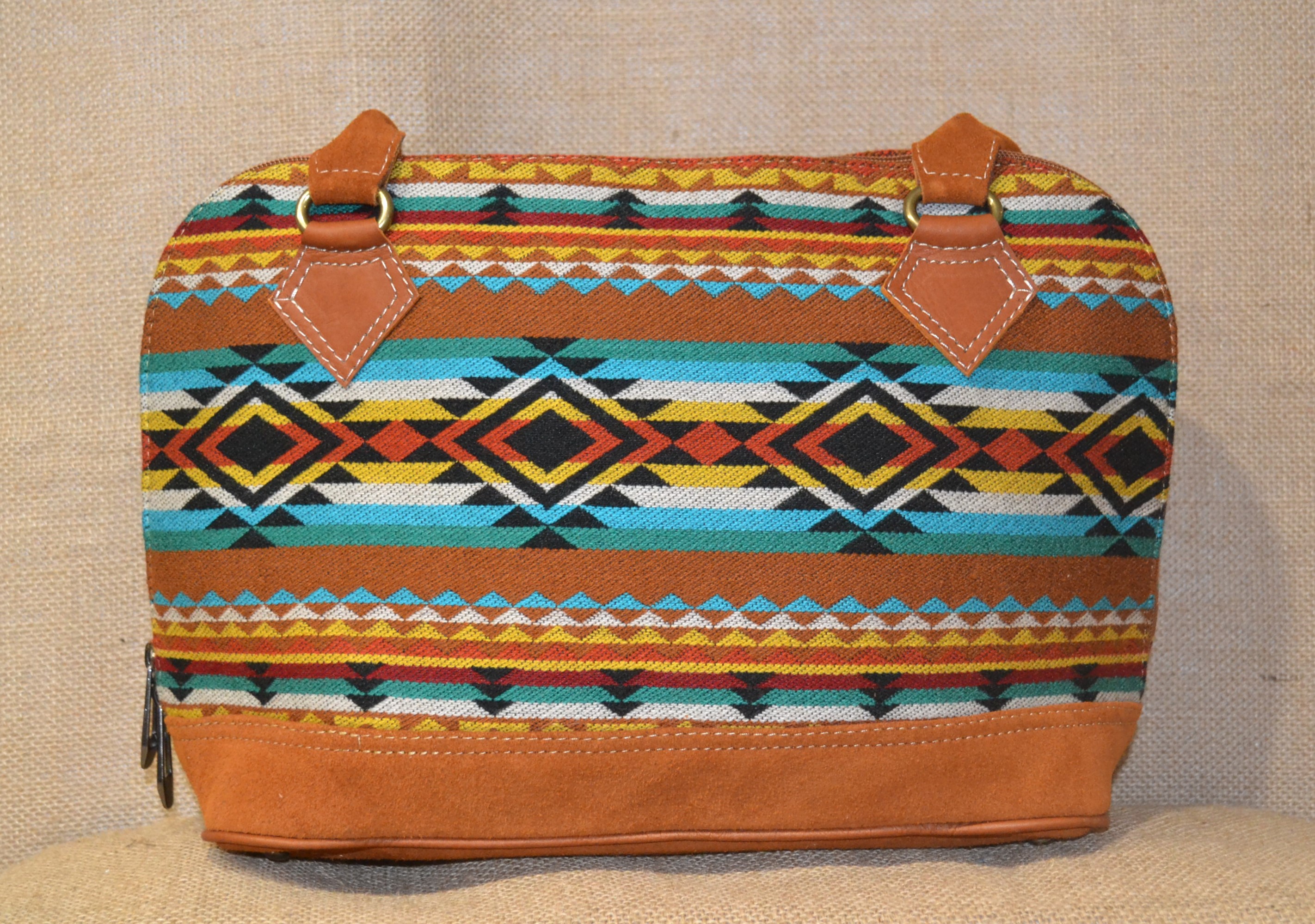 W naszym sklepie mamy dla ciebie idealny model torebki. Jeśli zależy tobie na torebce innej niż te które można kupić na chińskich stronach lub oklepanych wzorach w drogich sieciowych sklepach których funkcjonalność nie jest adekwatna do ceny a cena nie zawsze idzie w parze z jakością . Zobacz! Wykonana w 100 % ręcznie . Szyta w Ekwadorskich Andach w małym warsztacie kaletniczym ze skóry bydlęcej w jasnobrązowym kolorze i wełnianej tkaniny . Tkanina ta utkana na krosnach z wełny owczej , pokryta etnicznymi wzorami w odcieniach brązu , błękitu i czerwieni które od setek lat używane są przez Indian Keczua i stanowią nieodłączny element ich kultury . Solidne wykonie , dobre gatunkowo materiały oraz użyte wzory świadczą o niepowtarzalności tego produktu.