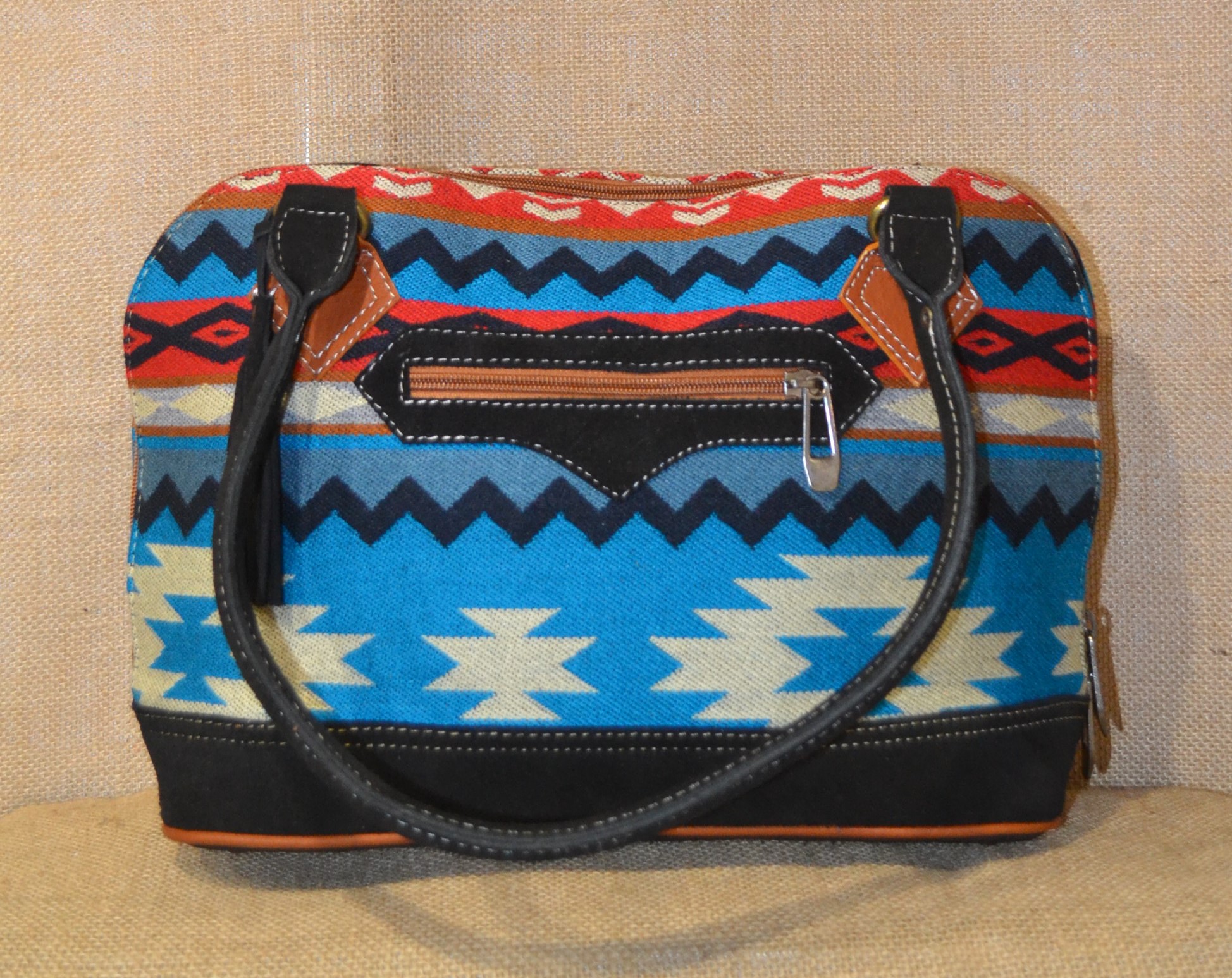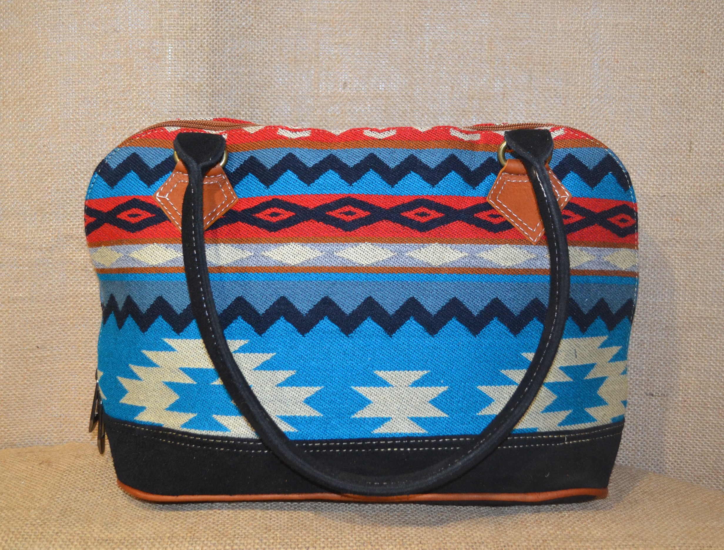 W naszym sklepie mamy dla ciebie idealny model torebki. Jeśli zależy tobie na torebce innej niż te które można kupić na chińskich stronach lub oklepanych wzorach w drogich sieciowych sklepach których funkcjonalność nie jest adekwatna do ceny a cena nie zawsze idzie w parze z jakością . Zobacz! Wykonana w 100 % ręcznie . Szyta w Ekwadorskich Andach w małym warsztacie kaletniczym ze skóry bydlęcej w kolorze czarnym i wełnianej tkaniny . Tkanina ta utkana na krosnach ze100% wełny owczej , pokryta etnicznymi wzorami w odcieniach niebieskiego , czerwonego i szarego koloru które od setek lat używane są przez Indian Keczua i stanowią nieodłączny element ich kultury. Solidne wykonie , dobre gatunkowo materiały oraz użyte wzory świadczą o niepowtarzalności tego produktu.