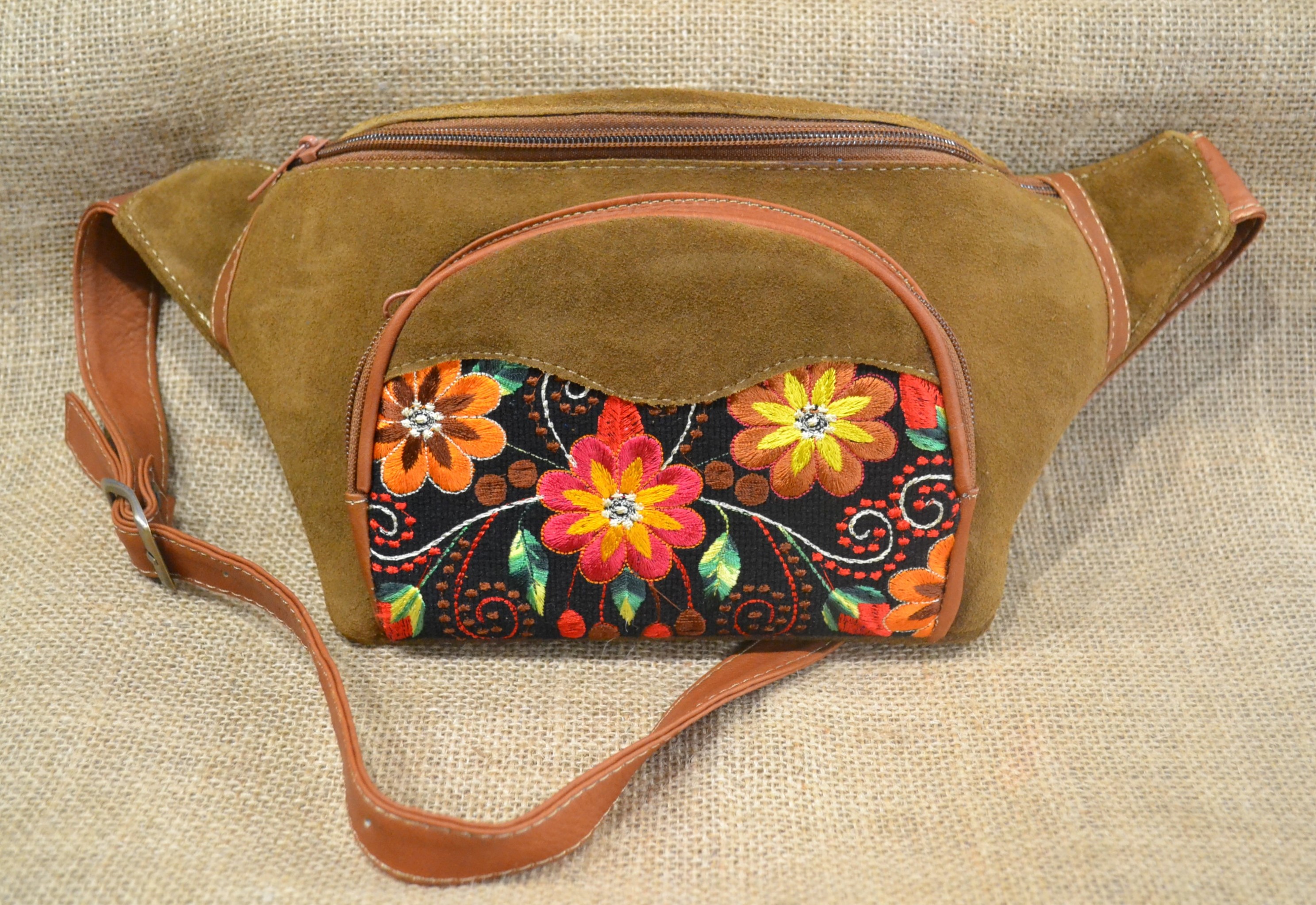 Torebka na biodro z brązowej zamszowej skóry i kwiatowym haftem .