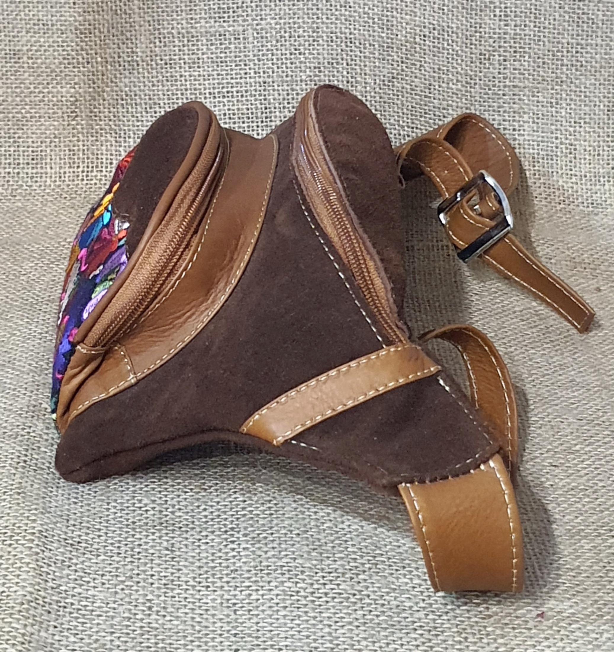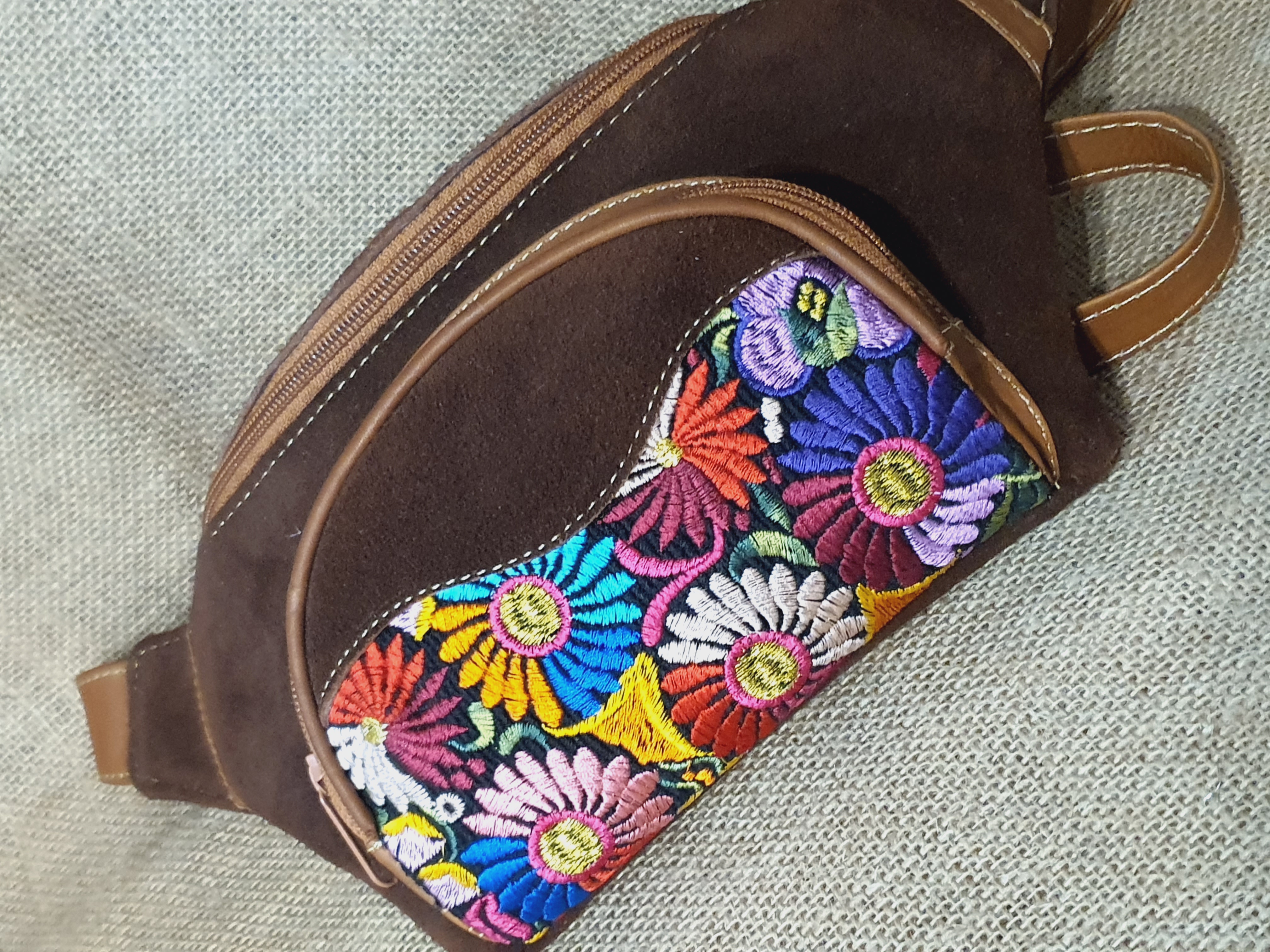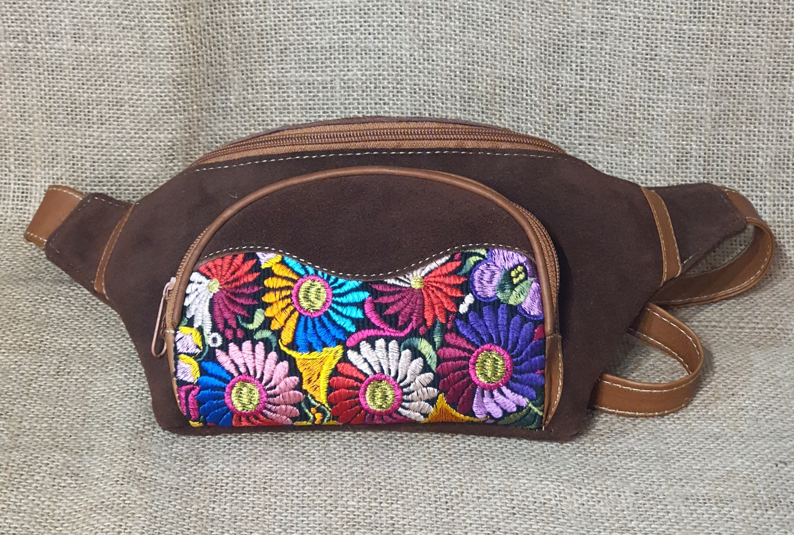 Torebka na biodro z ciemnobrązowej zamszowej skóry i kwiatowym kolorowym haftem .