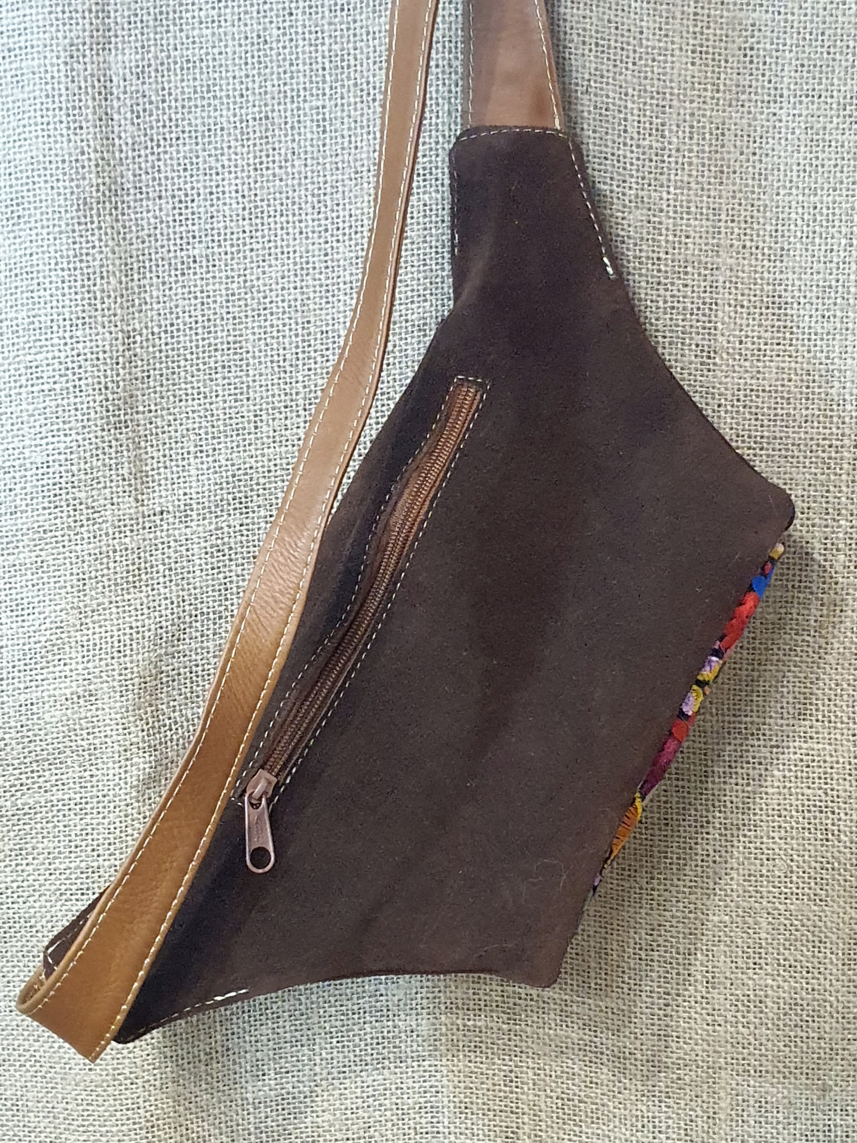 Strona główna » Wyroby ze skóry » Torebka na biodro z ciemnobrązowej zamszowej skóry i kwiatowym kolorowym haftem .