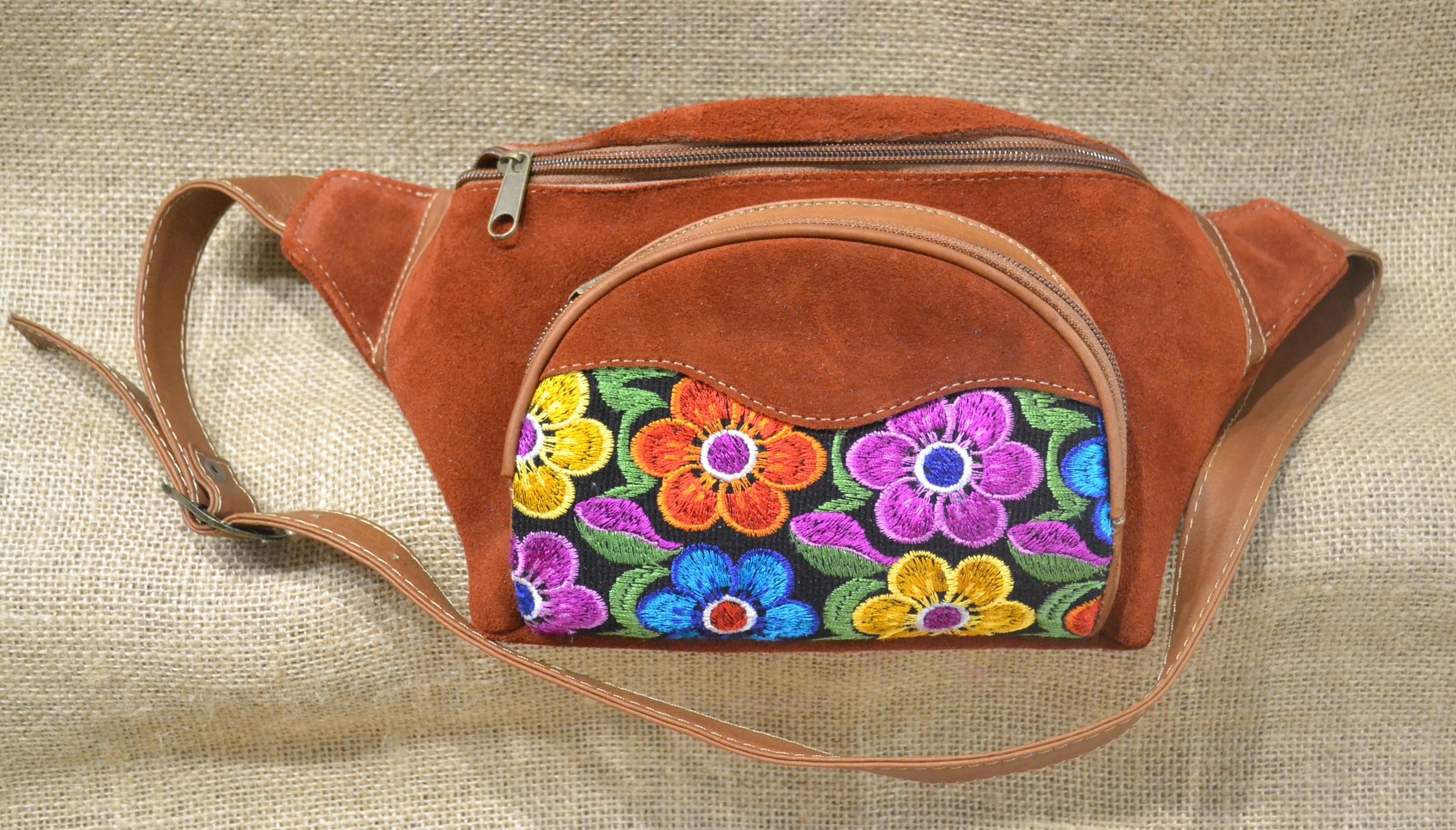 Poczuj się swobodnie z tą 100% skórzaną zamszową torebką typu kangur w kolorze czerwonej cegły która będąc na twoich biodrach da ci swobodę ruchów i wolne ręce podczas twojej kolejnej przygody. Solidne wykonanie oryginalne kolory oraz niepowtarzane wzory haftu przyciągają wzrok.