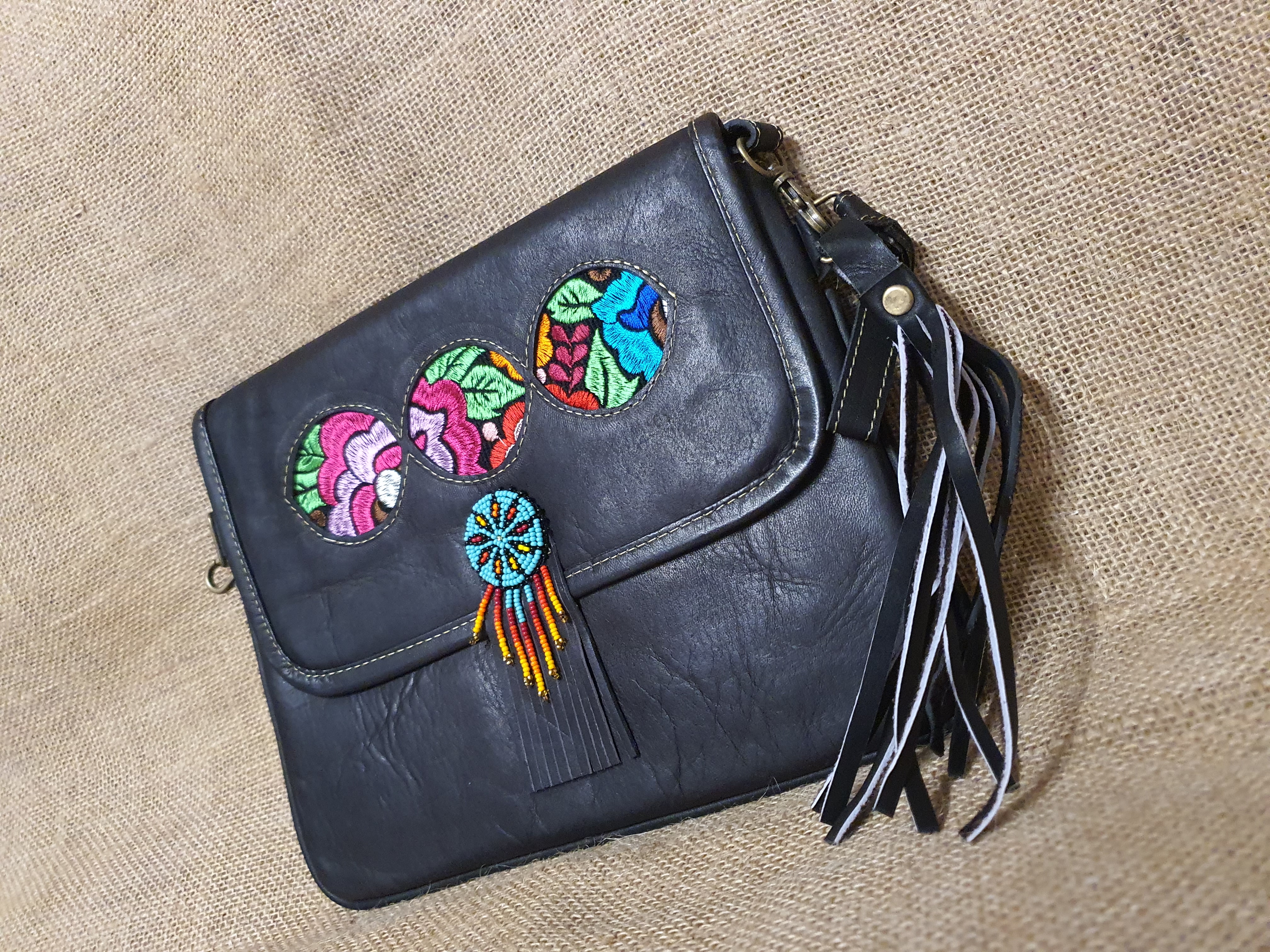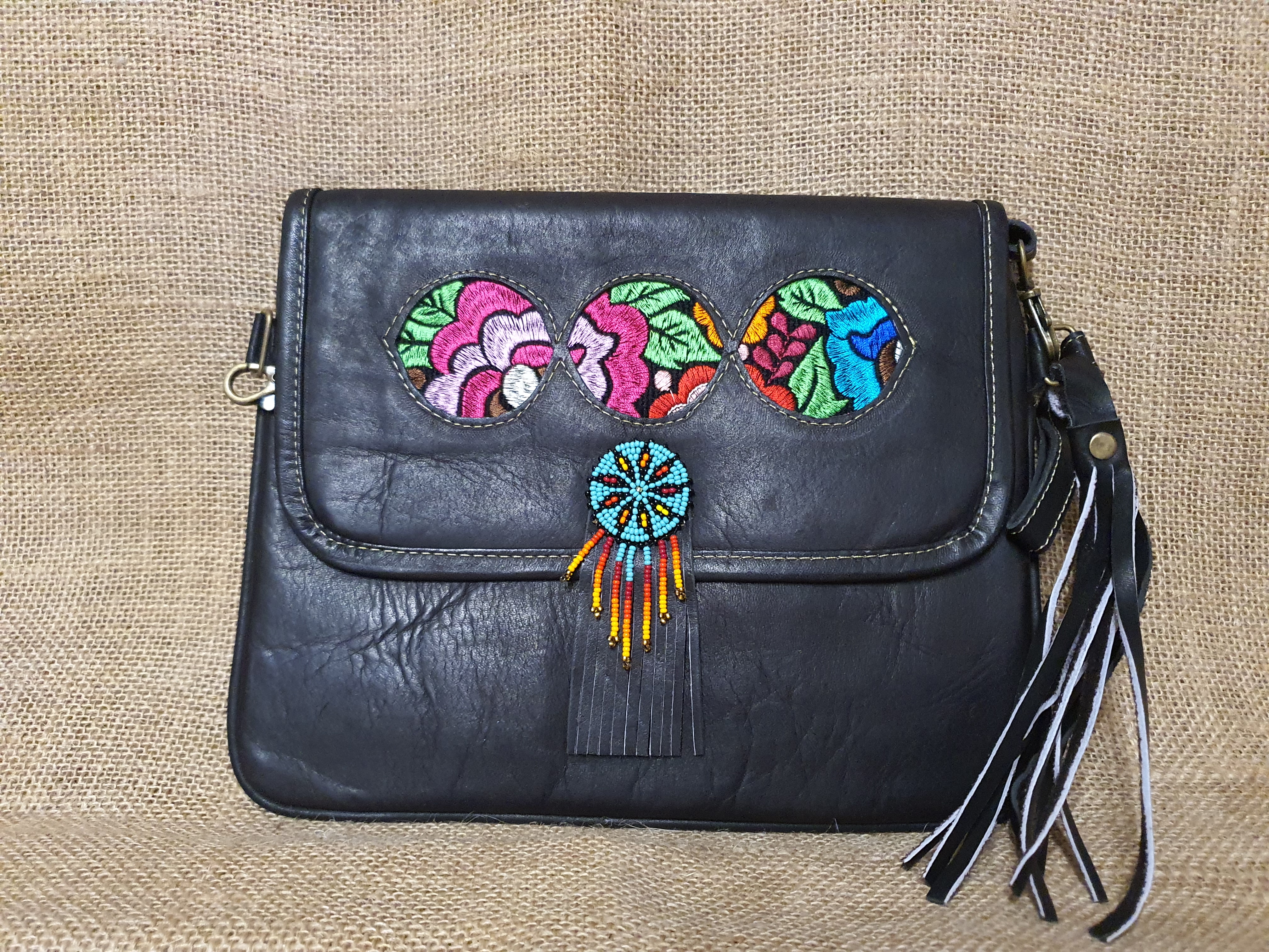 Kolejny styl naszych torebek. Tym razem jest to torebka kopertowa . Jak wszystkie nasze wyroby szyta jest w ekwadorskiej pracowni rzemieślniczej. Wykonana z naturalnej 100% skóry w kolorze ciemnego brązu . Na Klapie umieszczony został haftowany kwiatowy  wzór głęboko zakorzeniony w ekwadorskiej kulturze . Centralną część torebki zdobi aplikacja z koralików MULLO typowa dla tego regionu świata.