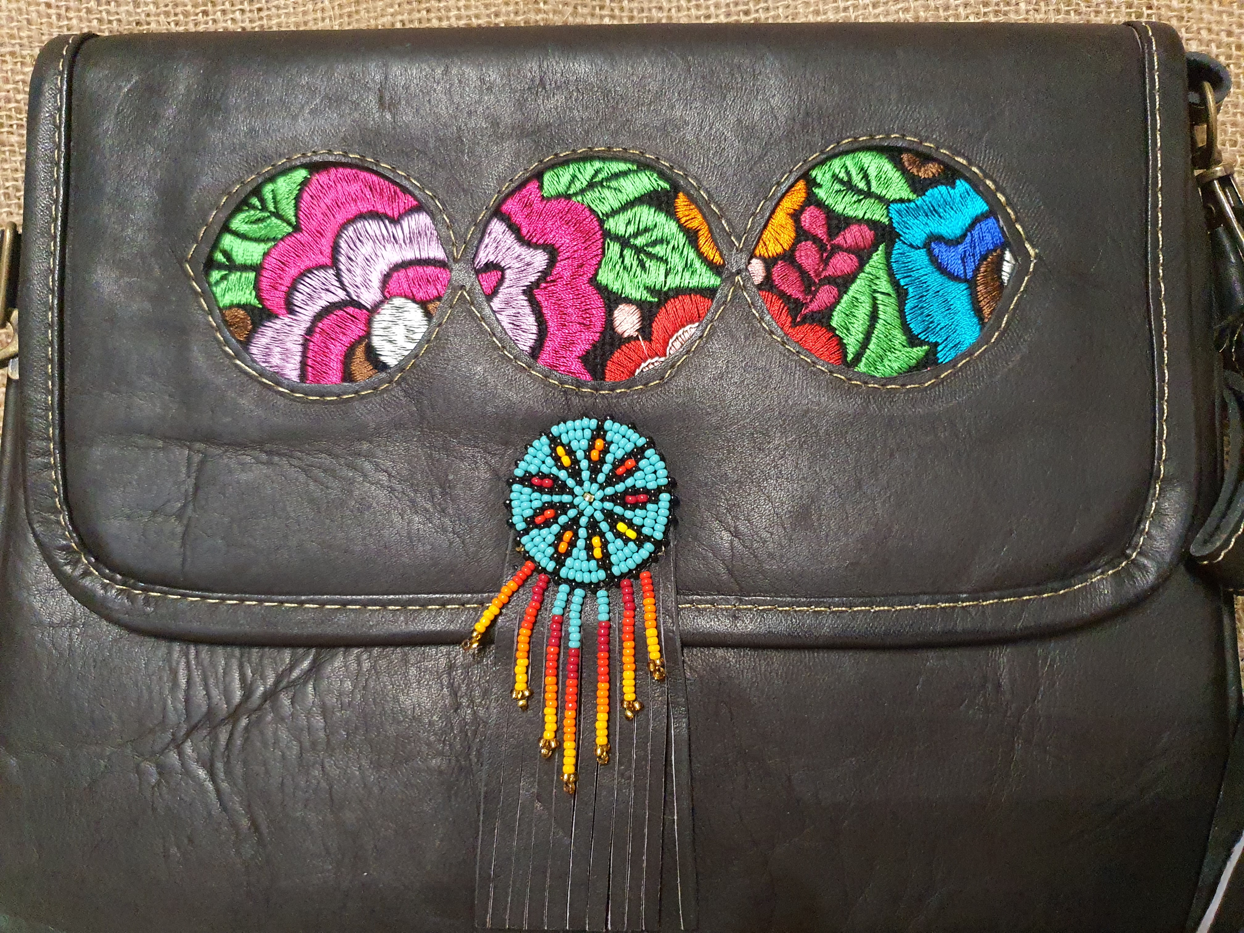 Strona główna » Wyroby ze skóry » Torebka skórzana BOHO kopertówka ciemnobrązowa z koralikami MULLO i haftem kwiatowym .