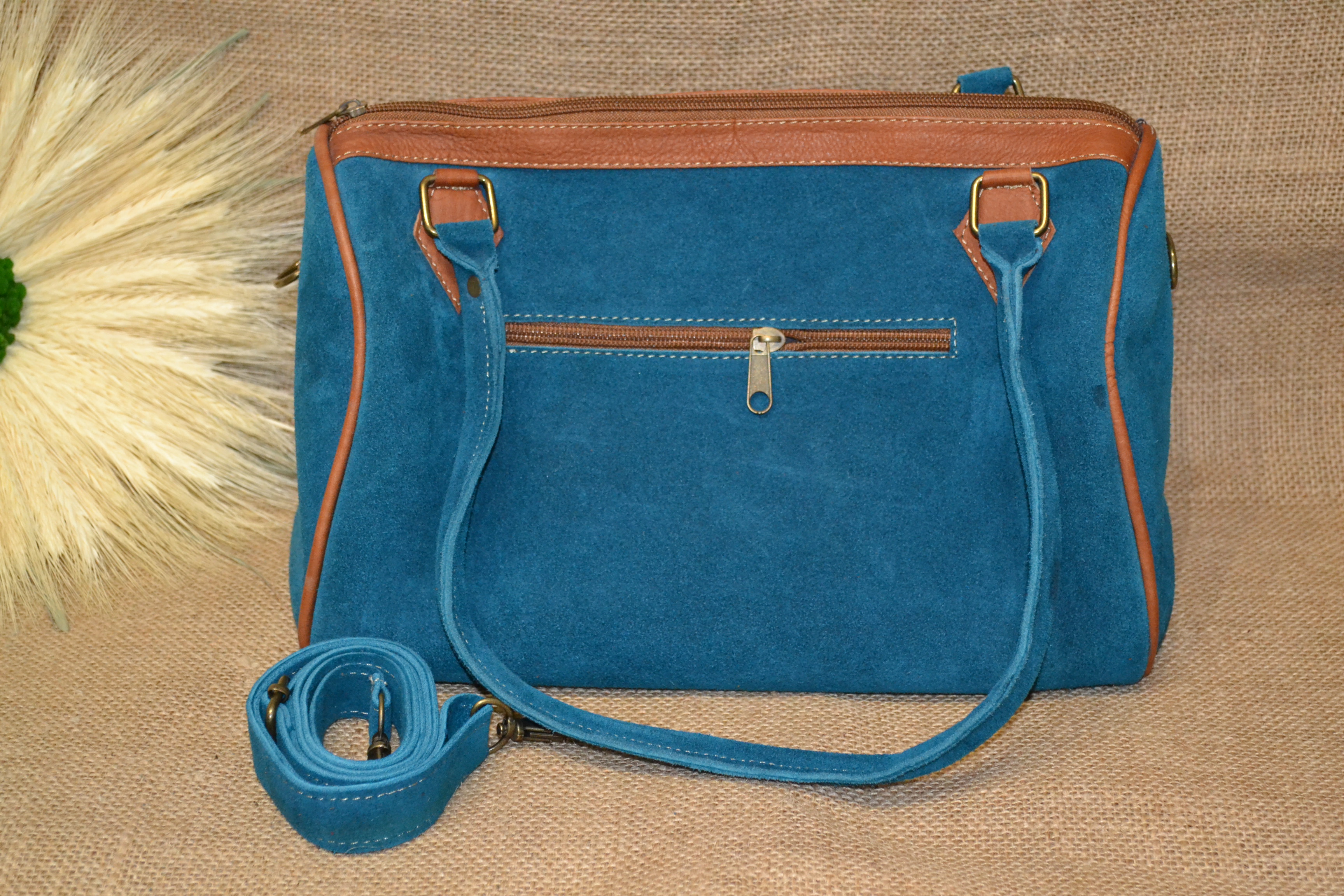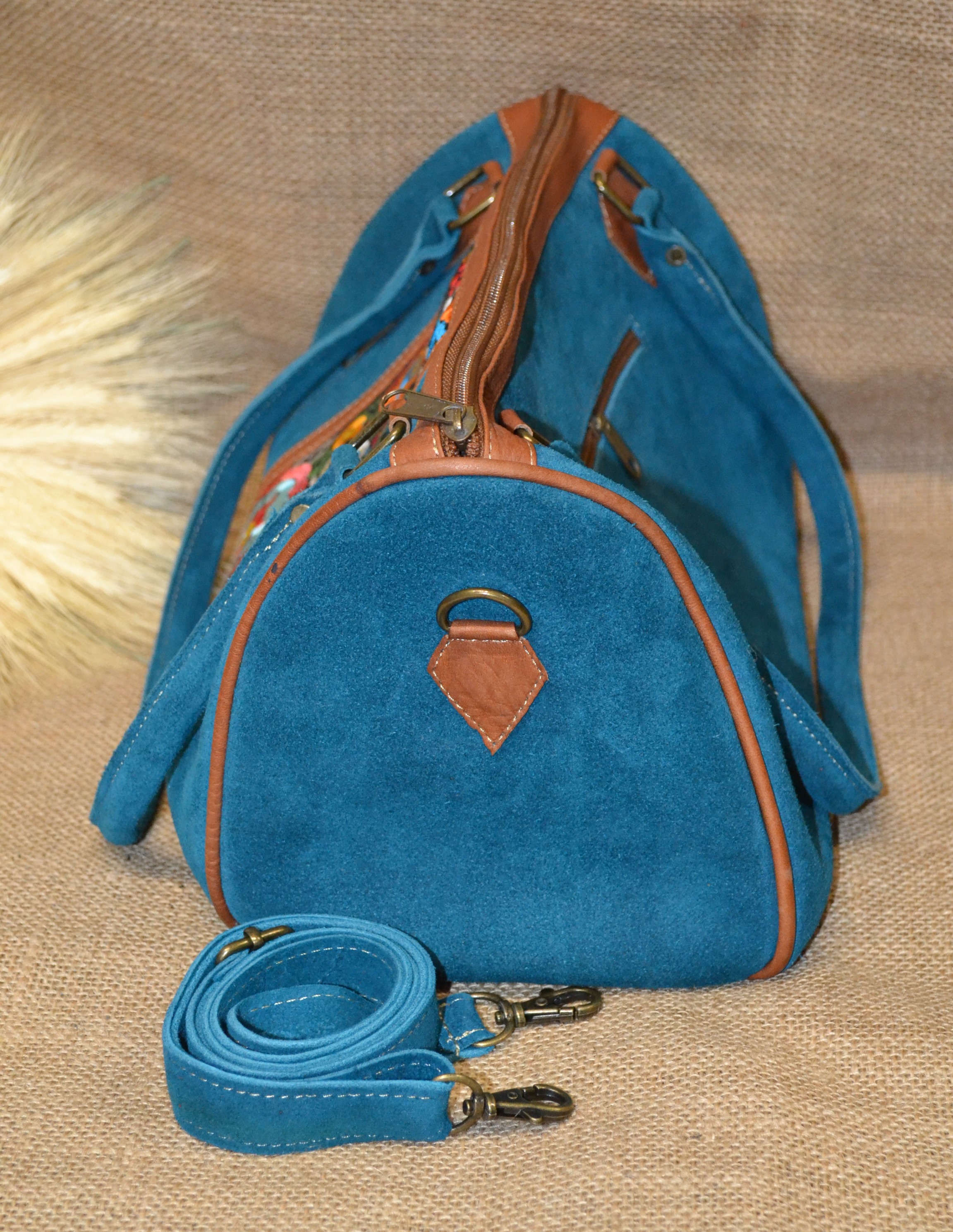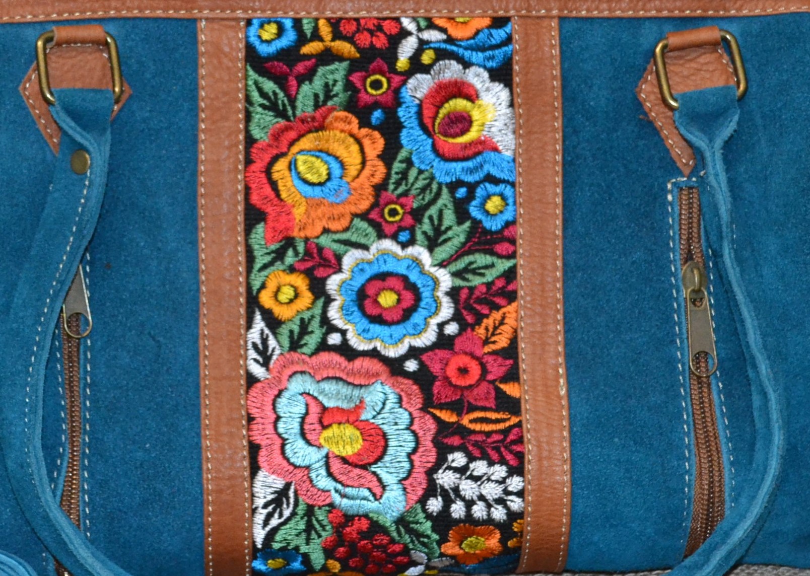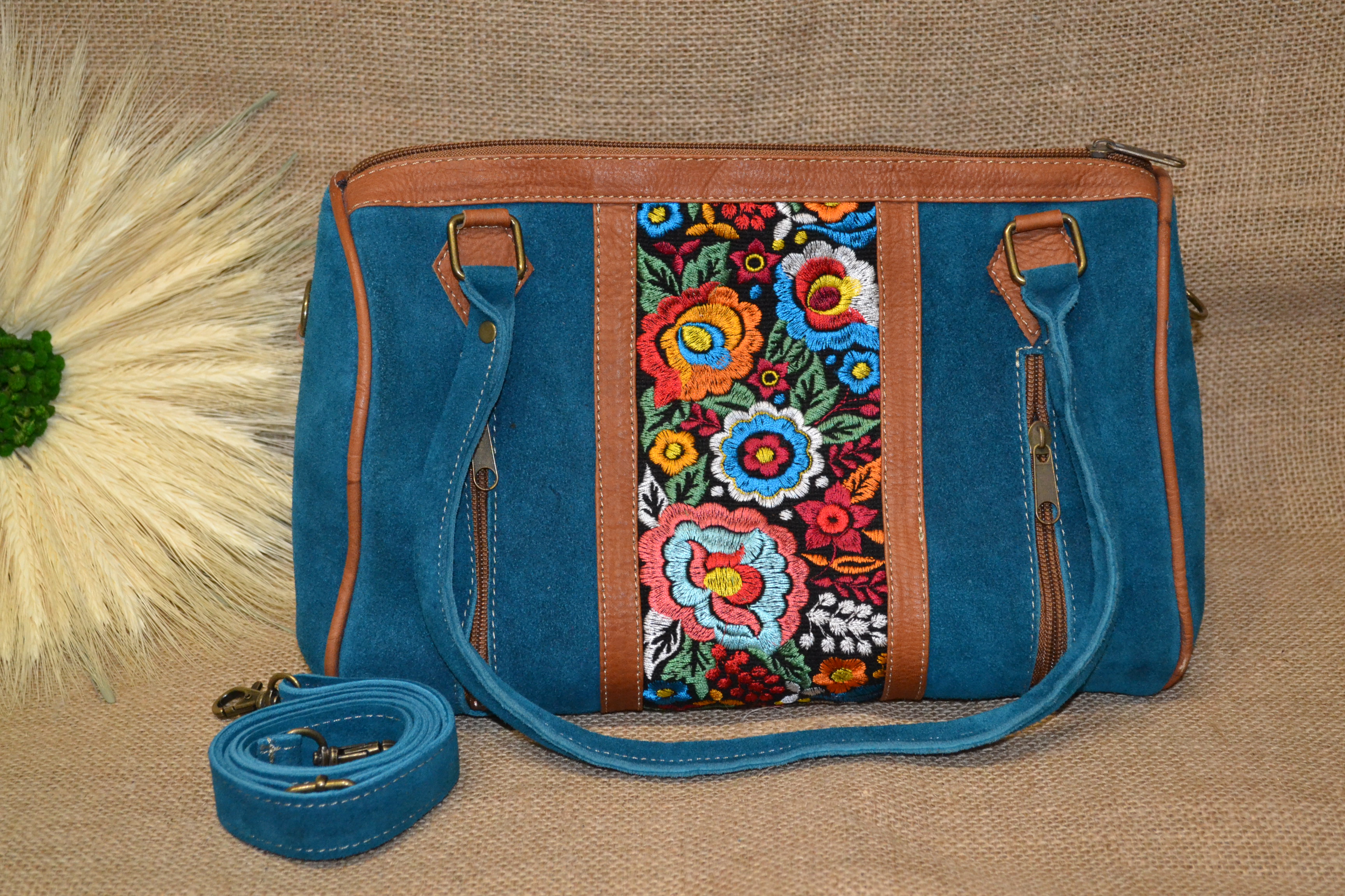 Co powiesz o torebce typu BAUL - kuferek . Wykonana z naturalnej 100% skóry zamszowej w błękitnym kolorze połączonej z kolorowym andyjskim kwiatowym haftowanym wzorem typowym dla ekwadorskiej kultury .
