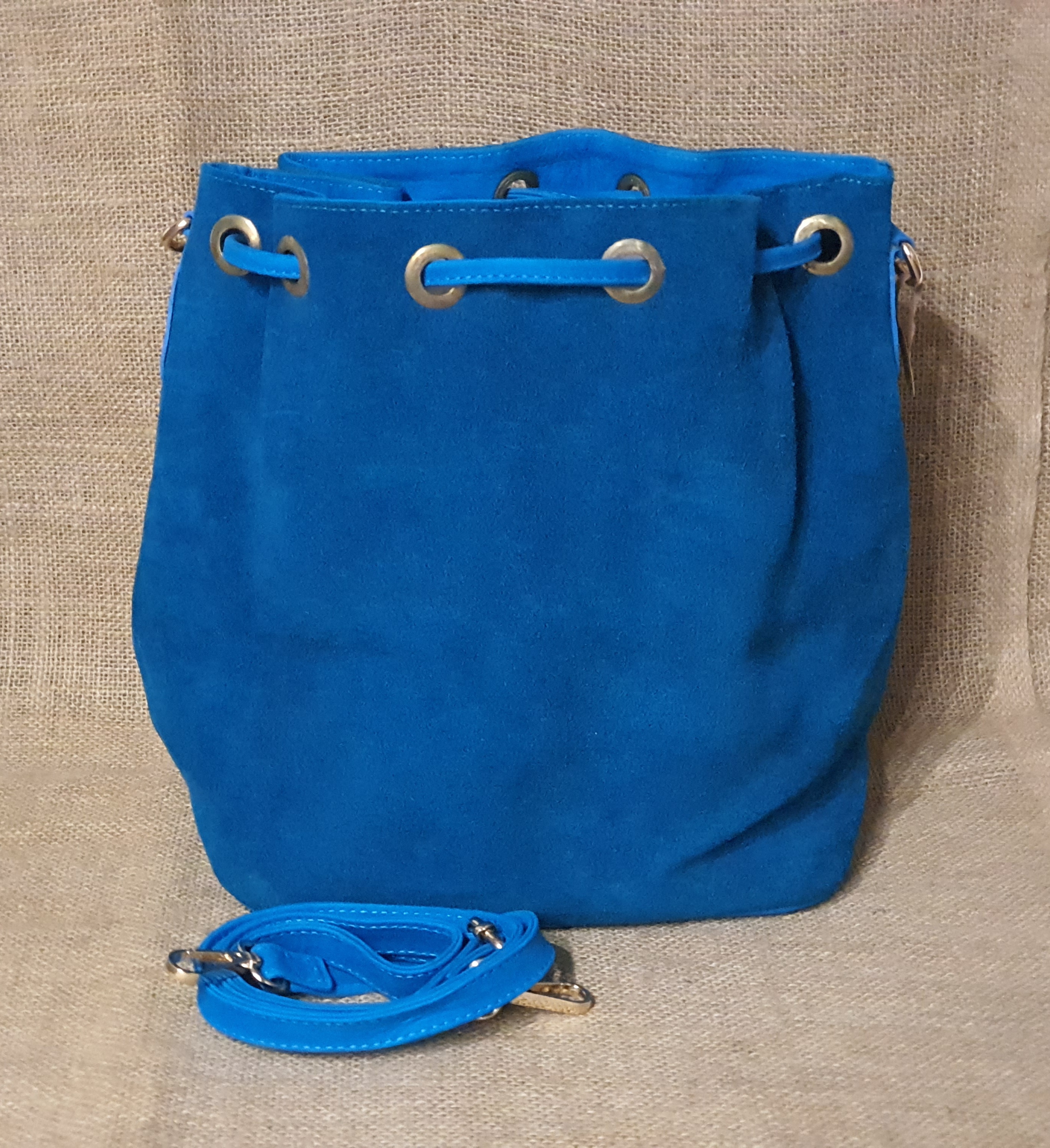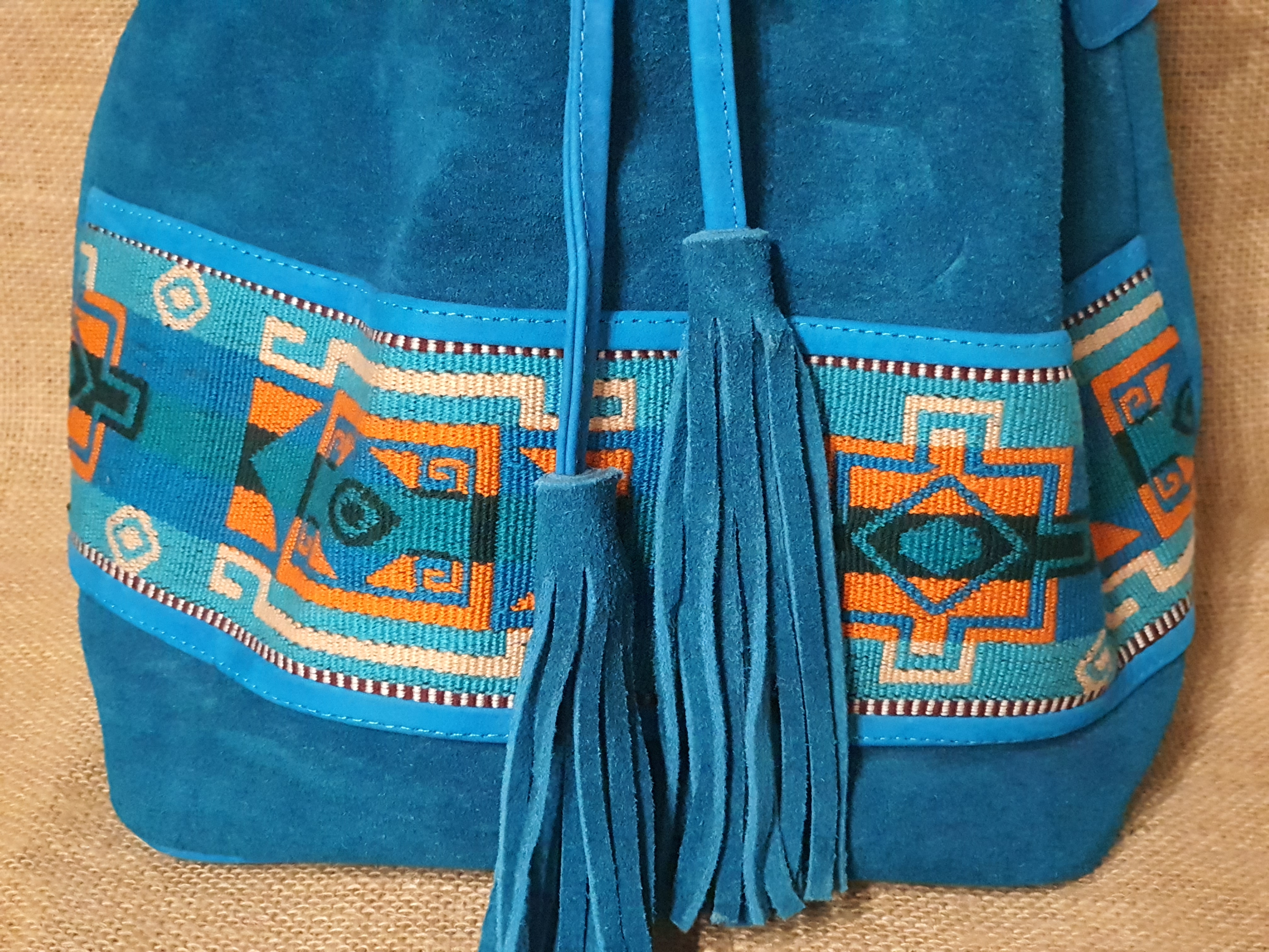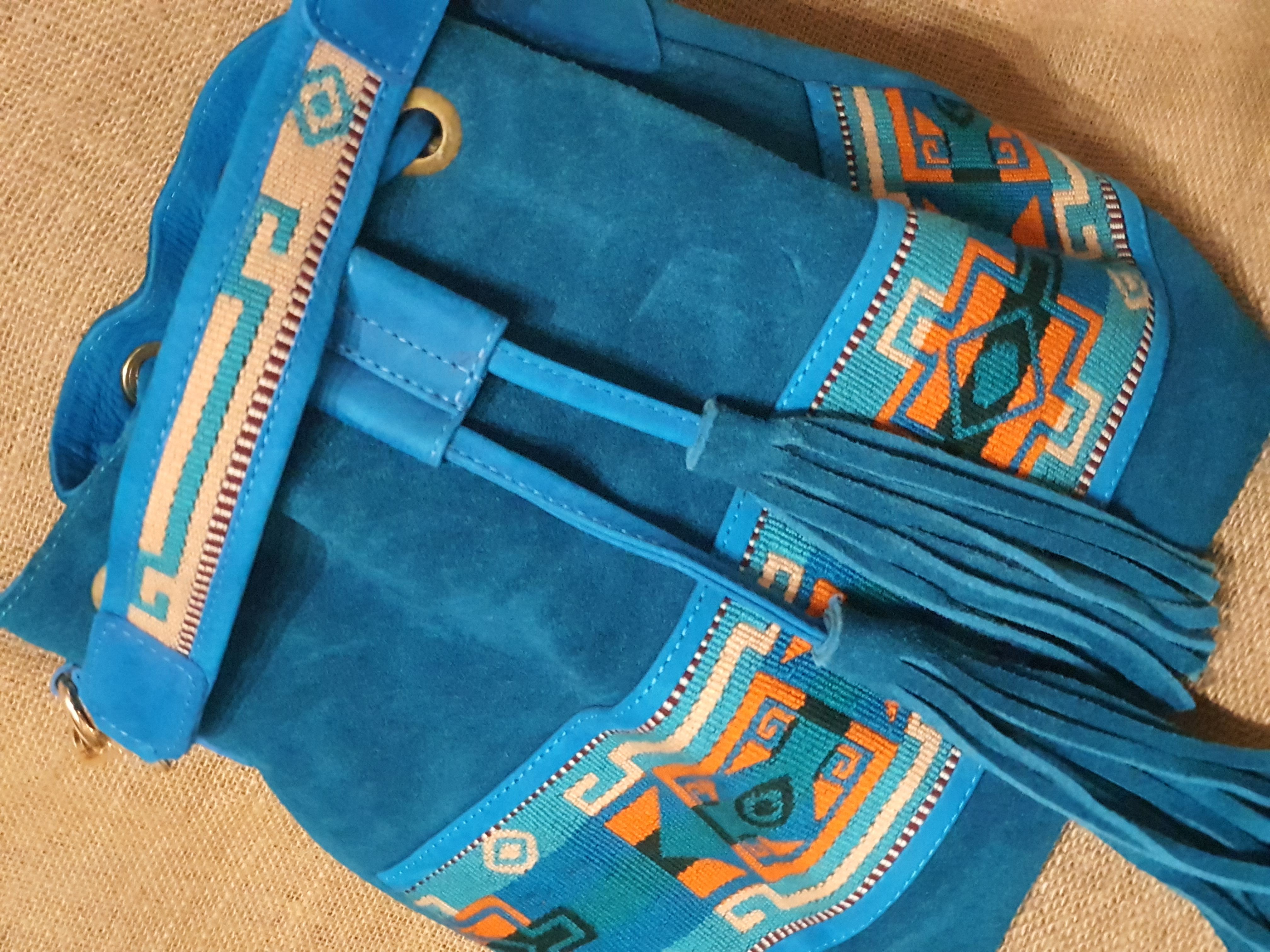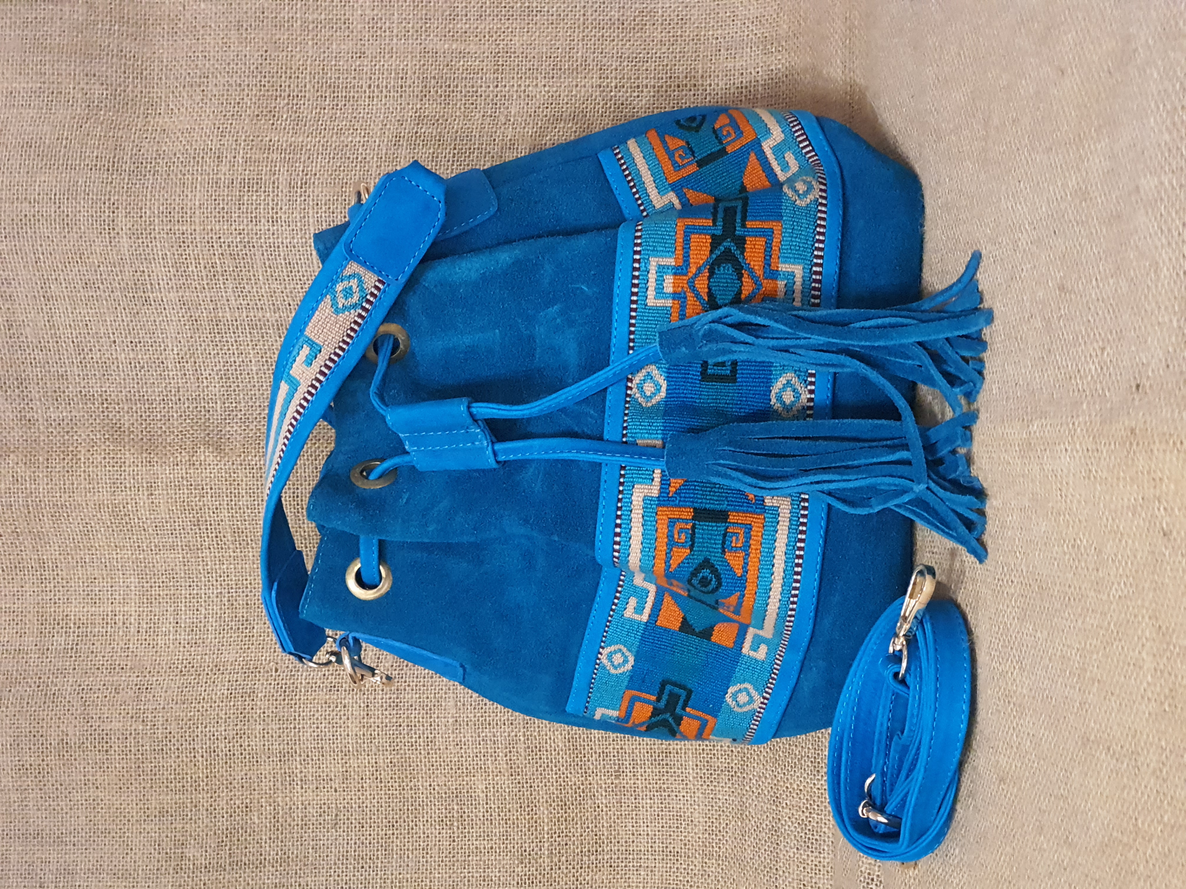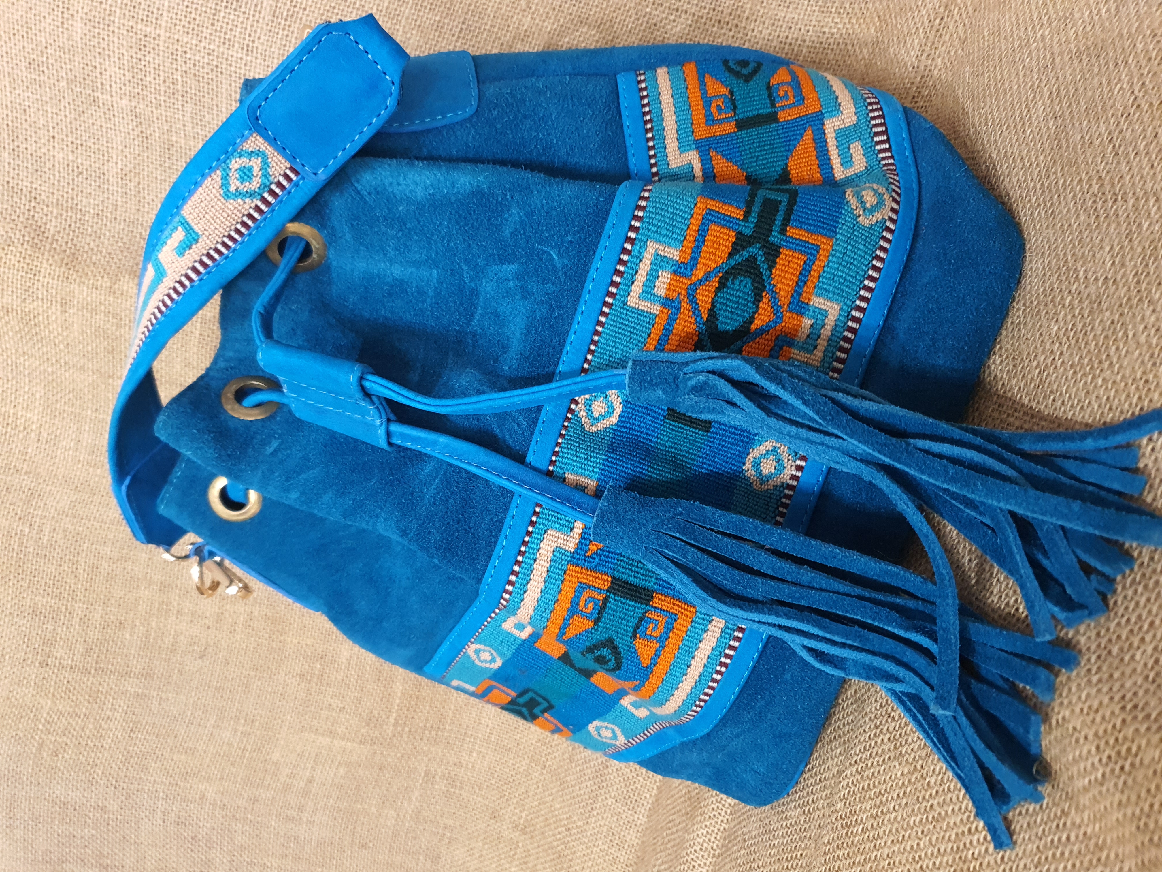 Mamy również inny model wykonany z zamszowej skóry w 100% naturalnej w kolorze błękitnym. Jest to torba typu worek zamykana ściąganym sznurkiem . Jest idealna do codziennego użytku . Posiada przestronne wnętrze z małą zamykaną na zamek kieszonką. Torebkę można nosić dwojako. Trzymając za haftowany uchwyt lub na pasku przez ramię. Frędzle oraz haftowane etniczne detale nadają jej niepowtarzalnego stylu którego nie powinno tobie nigdy brakować nawet podczas załatwiania codziennych spraw .