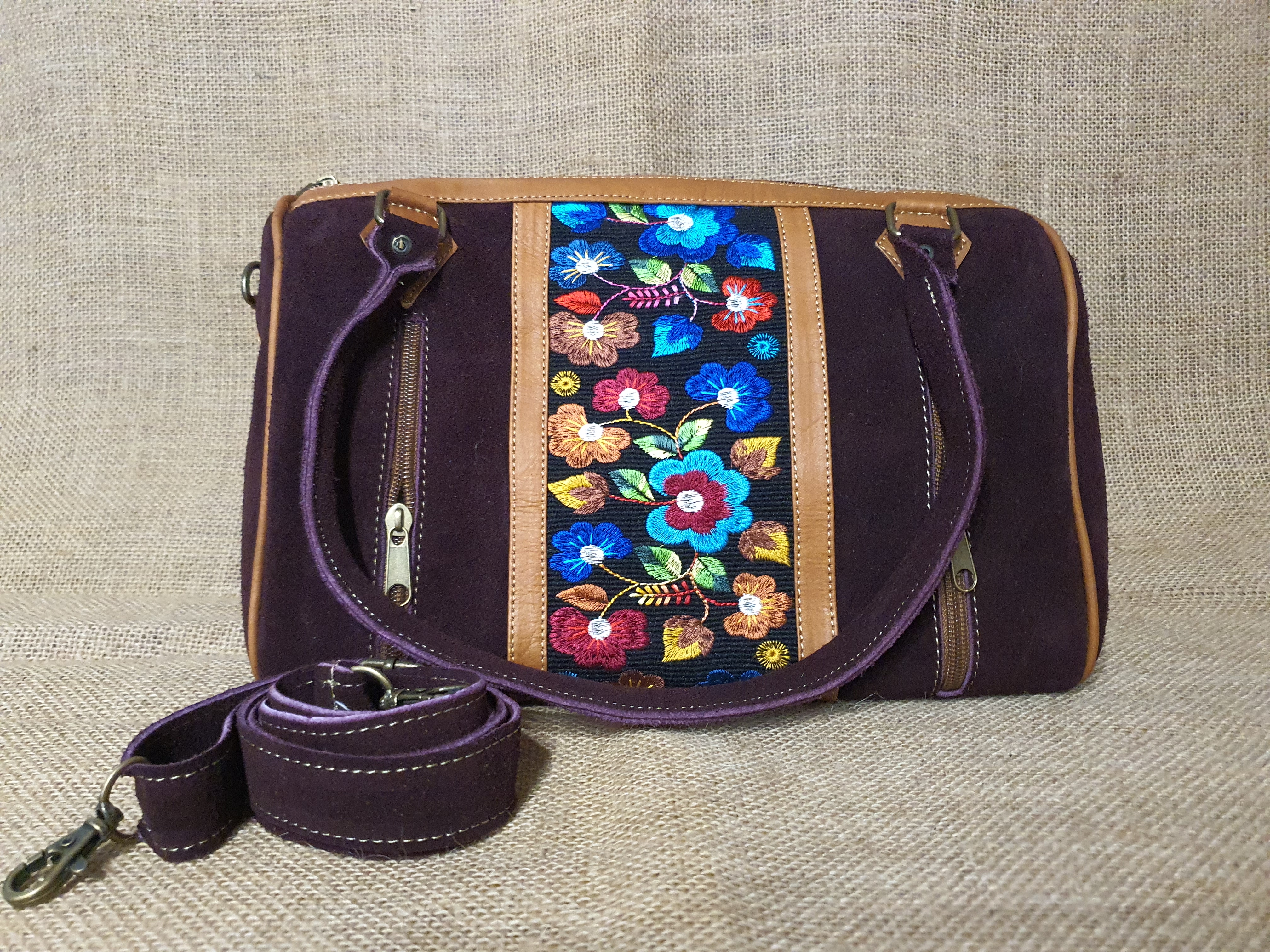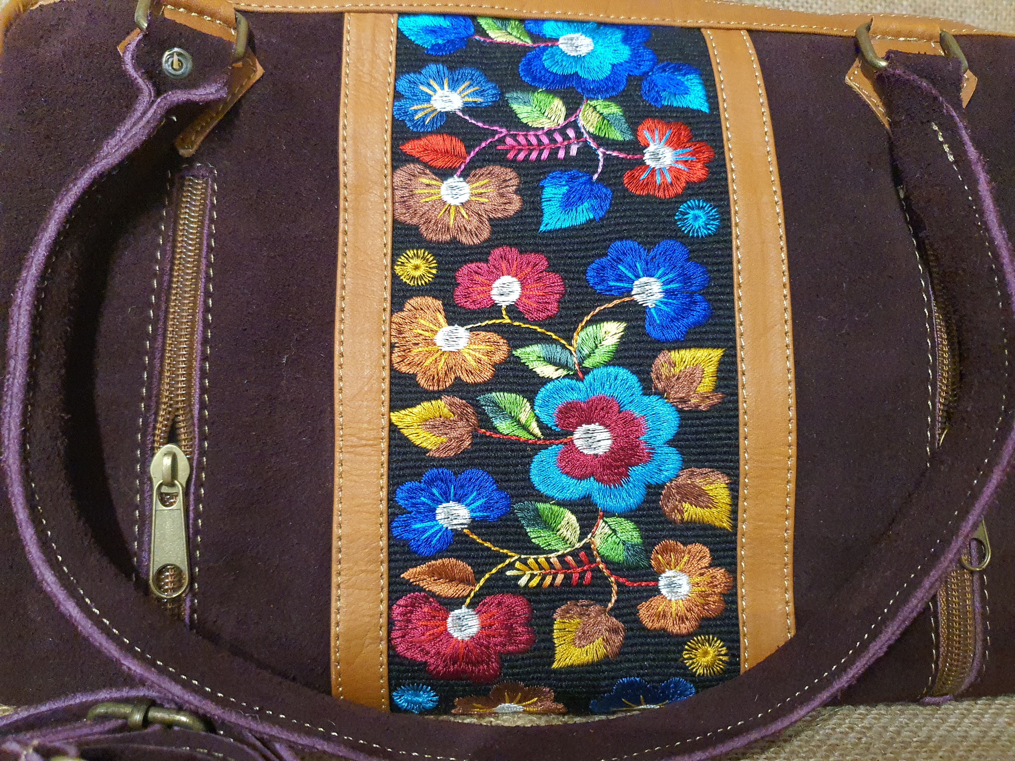 Co powiesz o torebce typu BAUL - kuferek . Wykonana z naturalnej 100% skóry zamszowej w kolorze bordowym połączonej z kolorowym andyjskim kwiatowym haftowanym wzorem typowym dla ekwadorskiej kultury .