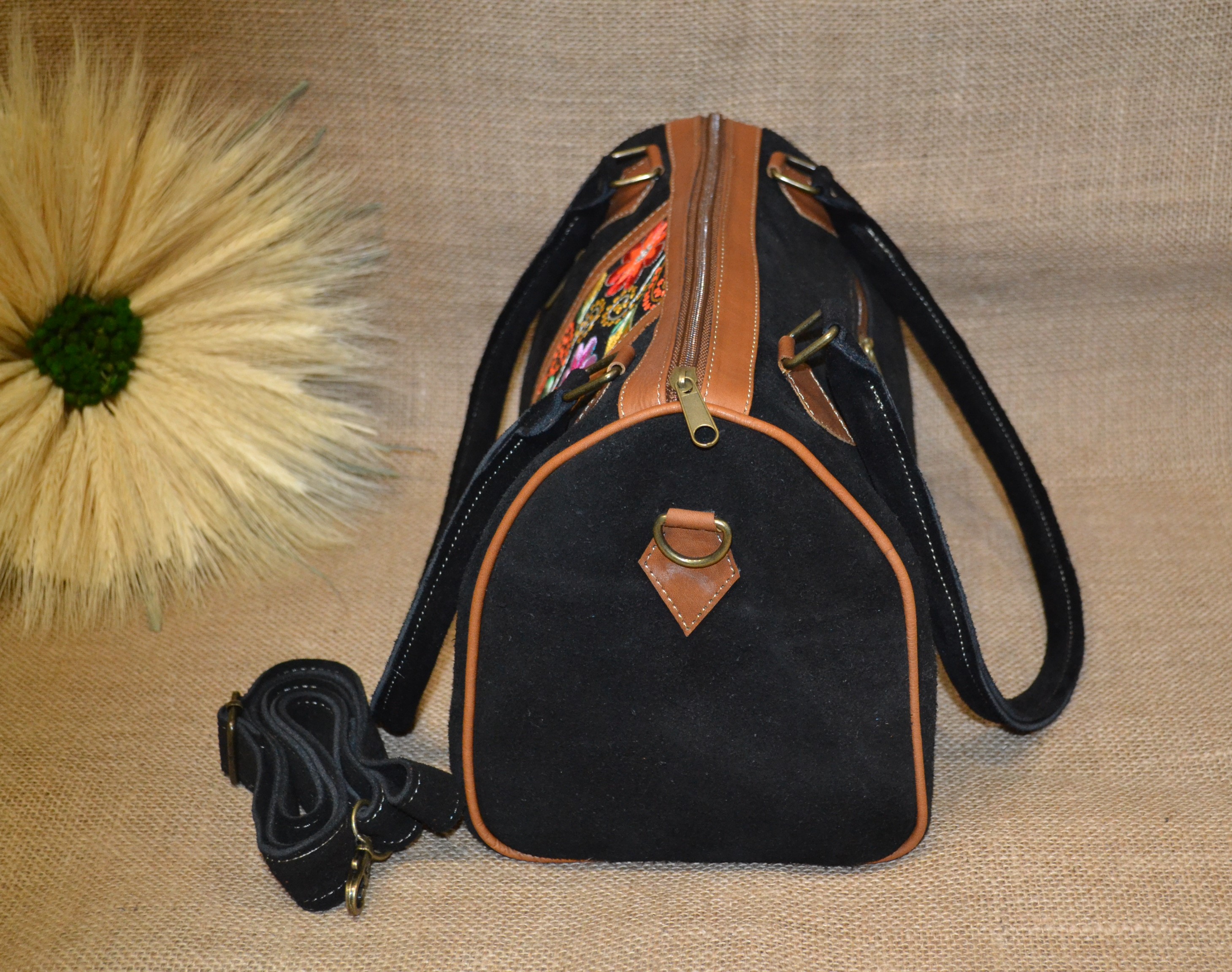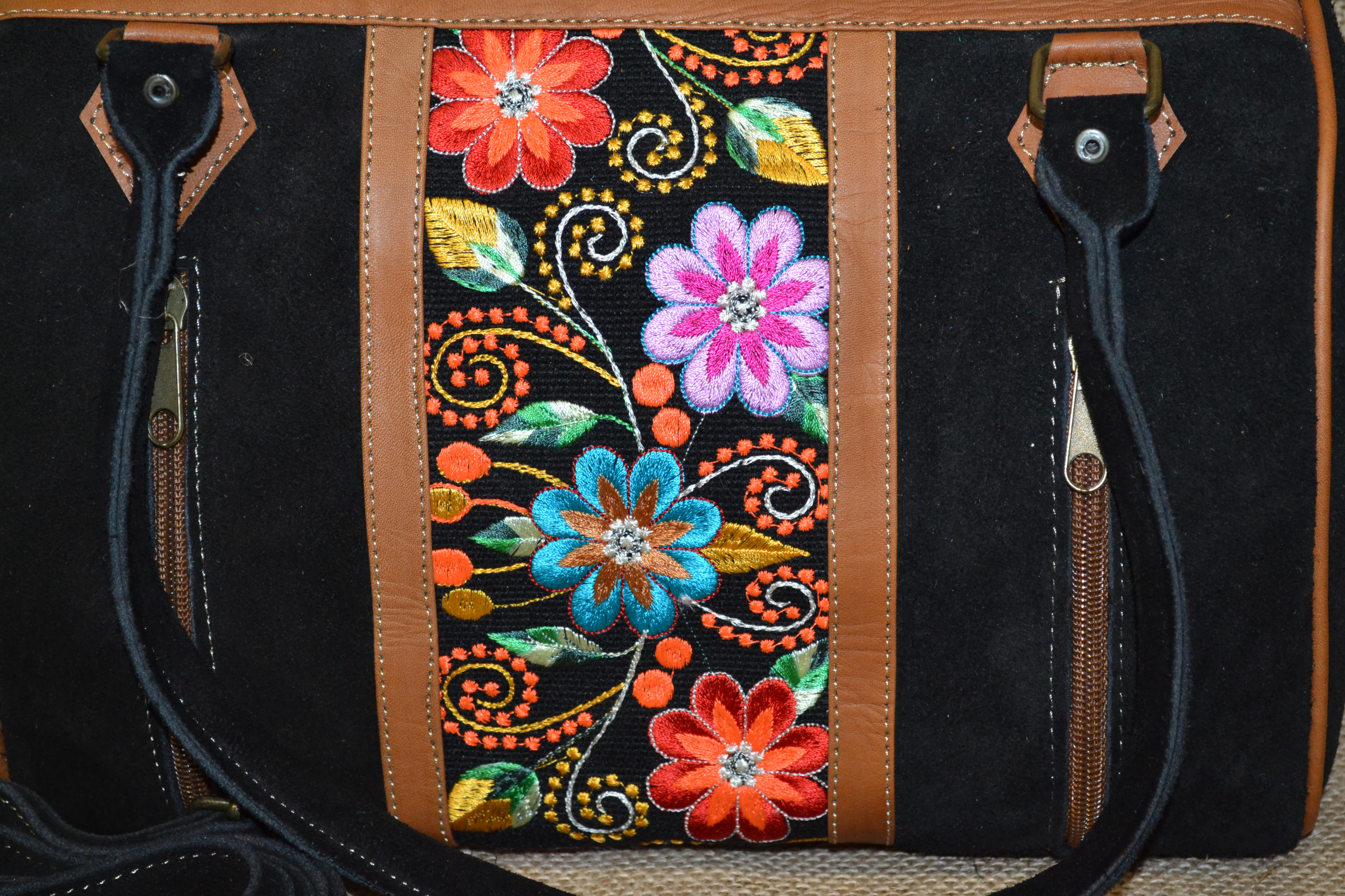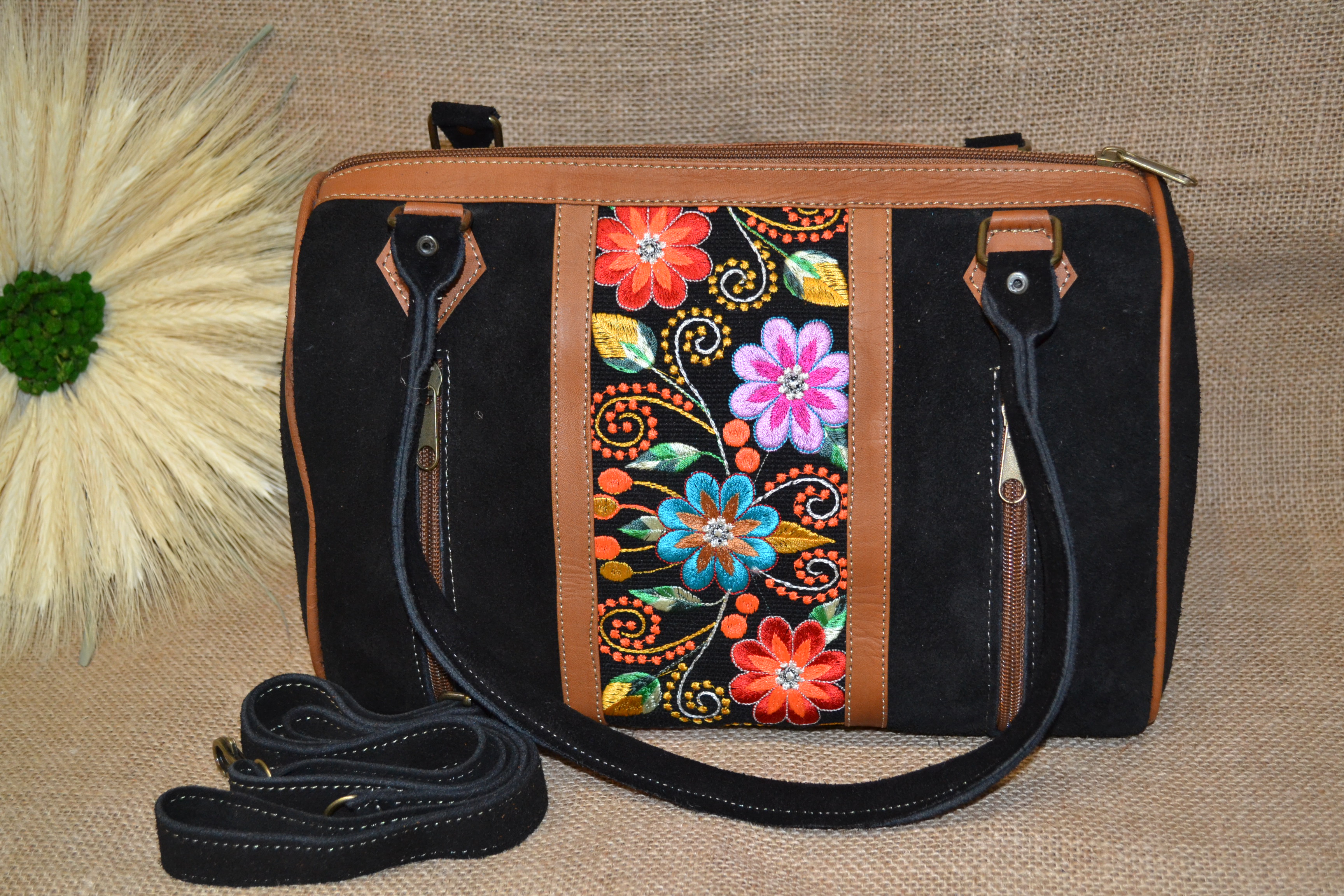 Co powiesz o torebce typu BAUL - kuferek . Wykonana z naturalnej 100% skóry zamszowej w czarnym kolorze połączonej z kolorowym andyjskim kwiatowym haftowanym wzorem typowym dla ekwadorskiej kultury .