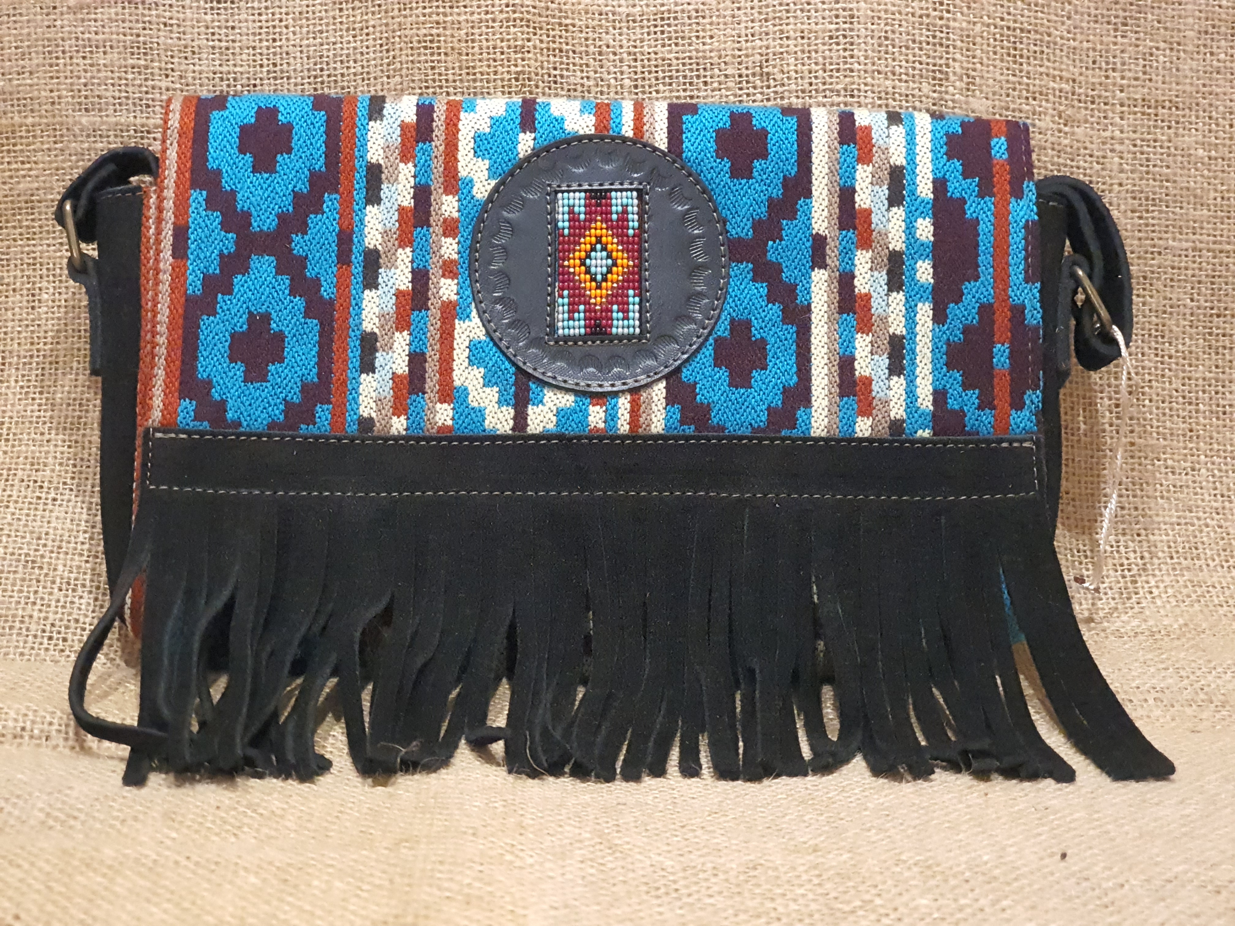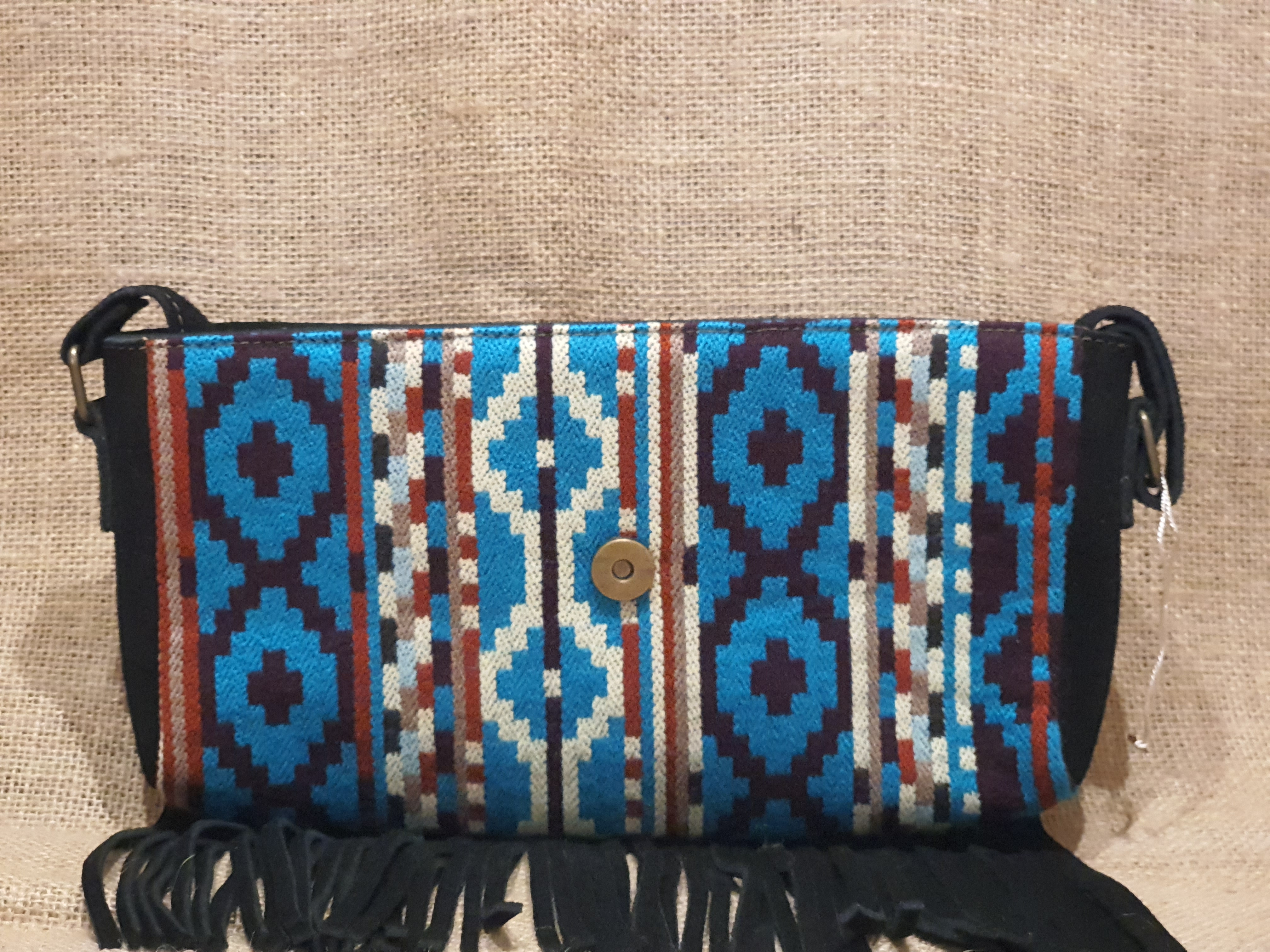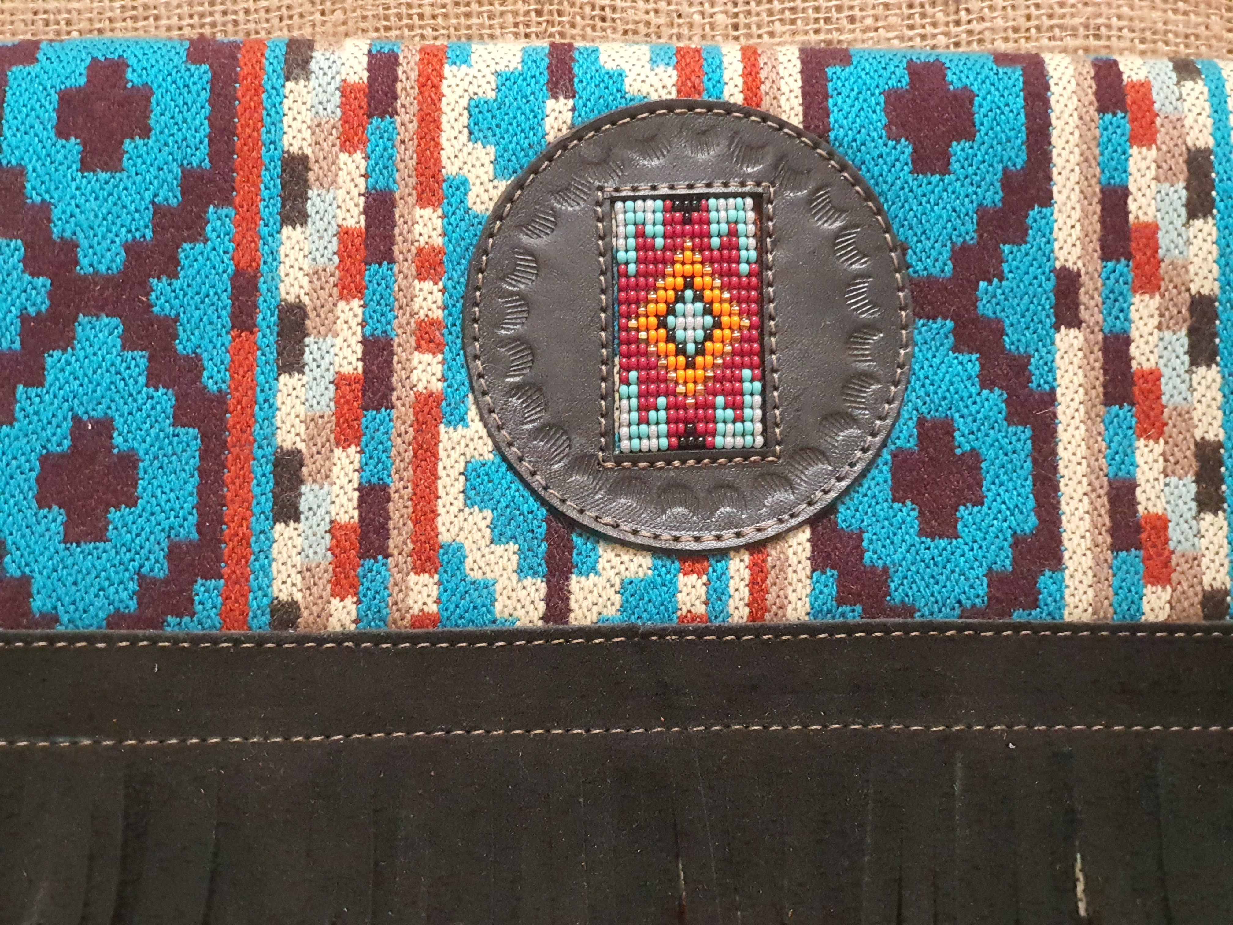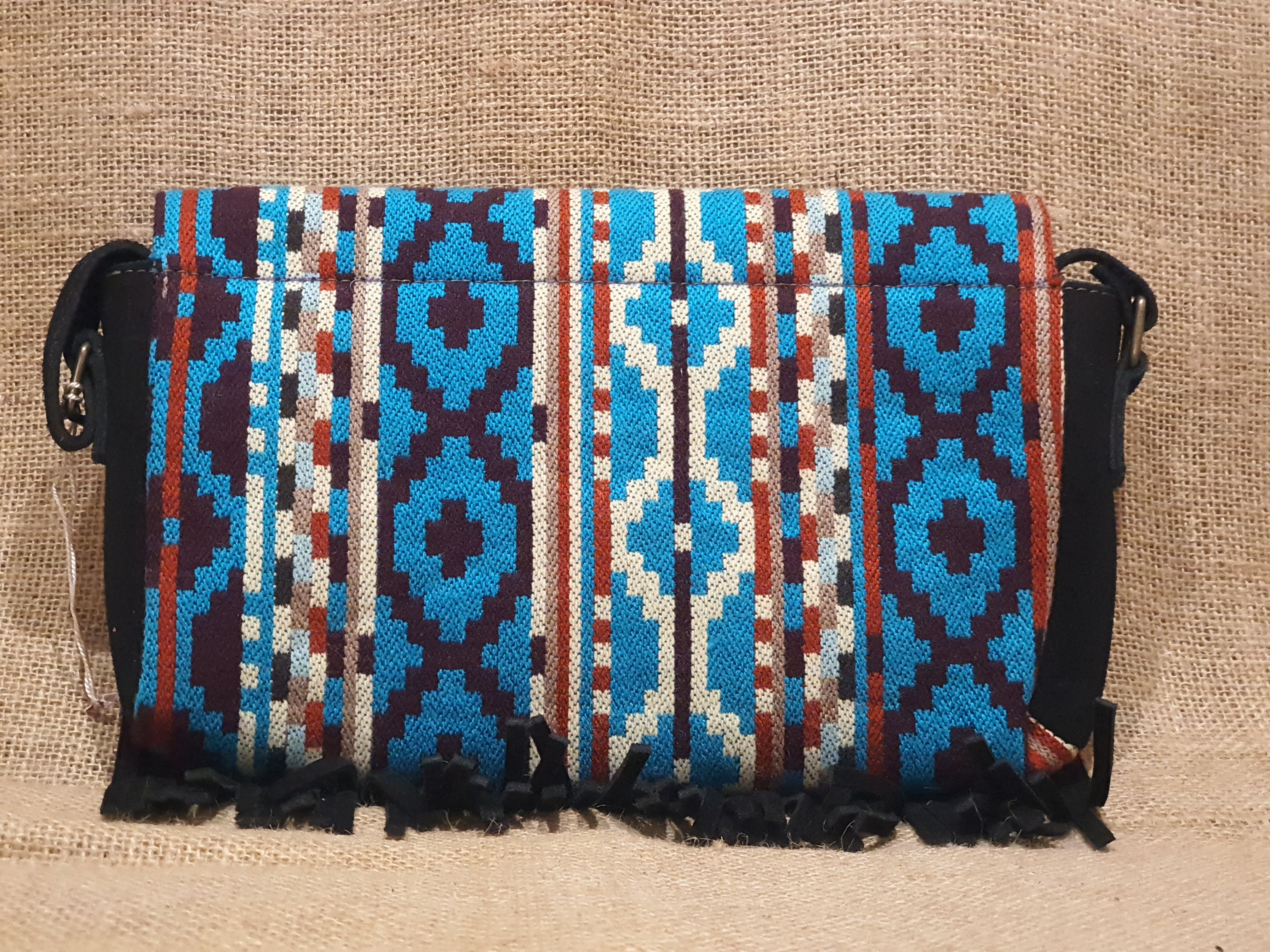 Ten typ torebki andyjskiej wzorowany jest kulturą ludu Indian Kiczua zamieszkującego Ekwadorskie Andy od niepamiętnych czasów do dnia dzisiejszego. Ta rdzenna ludność wypracowała wiele tradycyjnych nie powtarzalnych wzorów które przedstawiają ważne elementy życia ich przedstawicieli. Wzory te w błękitnych odcieniach umieszczone zostały przez rzemieślnika w haftach wykorzystanych do skomponowania tej torebki w połączeniu ze 100% czarną skorą zamszową , koralikami MULLO i frędzlami BOHO tworzą arcydzieło sztuki kaletniczej której nie kupisz nigdzie indziej . Torebka zamykana jest zatrzaskiem magnetycznym.