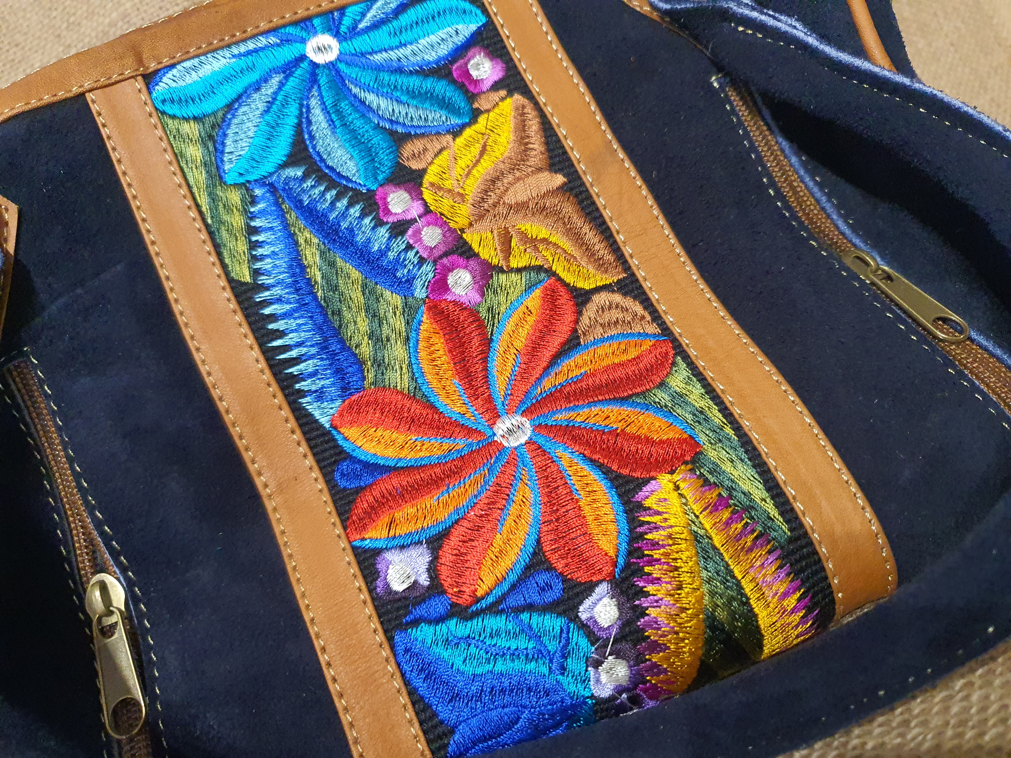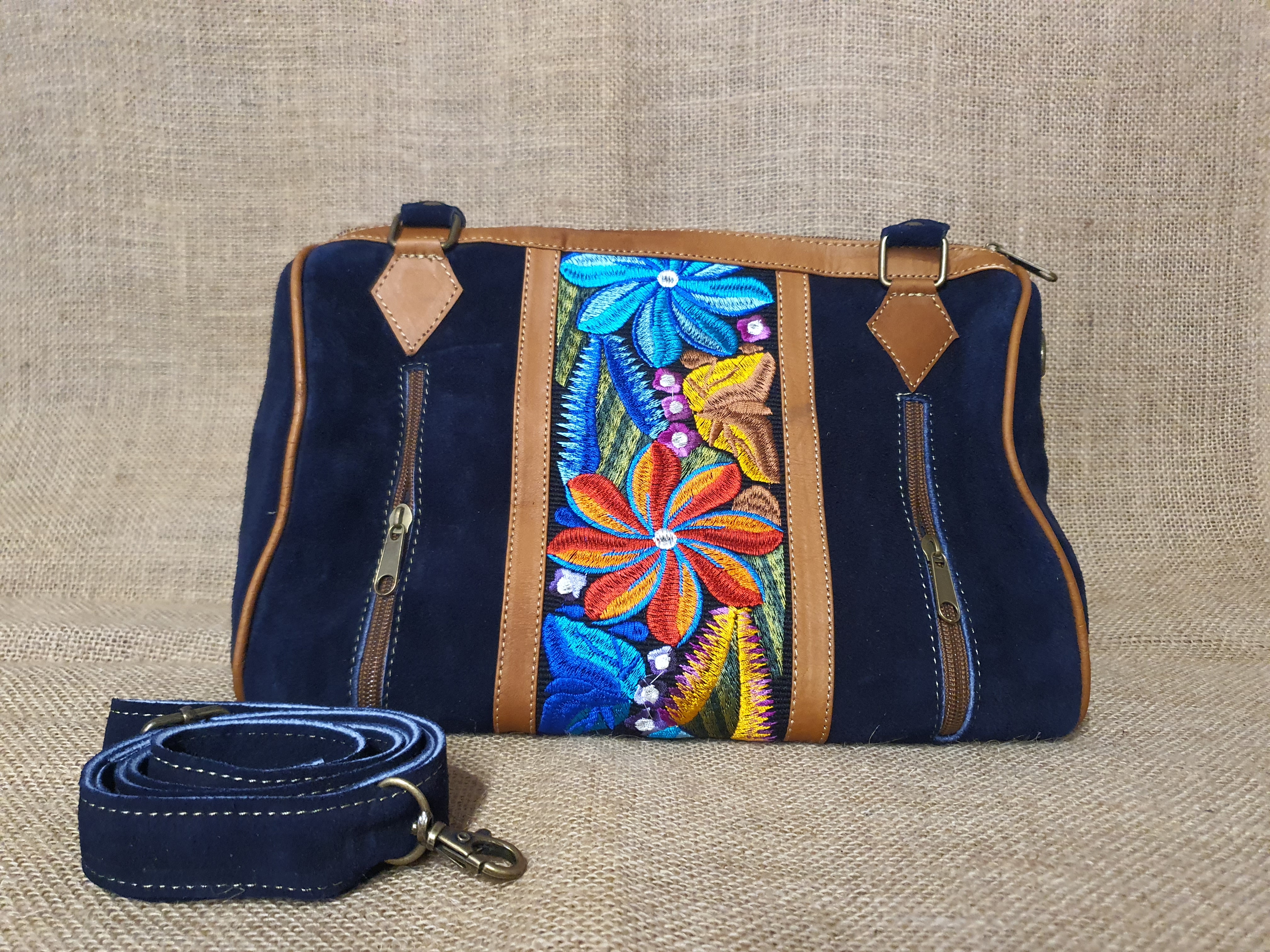 Co powiesz o torebce typu BAUL - kuferek . Wykonana z naturalnej 100% skóry zamszowej w kolorze granatowym  połączonej z kolorowym andyjskim kwiatowym haftowanym wzorem typowym dla ekwadorskiej kultury .