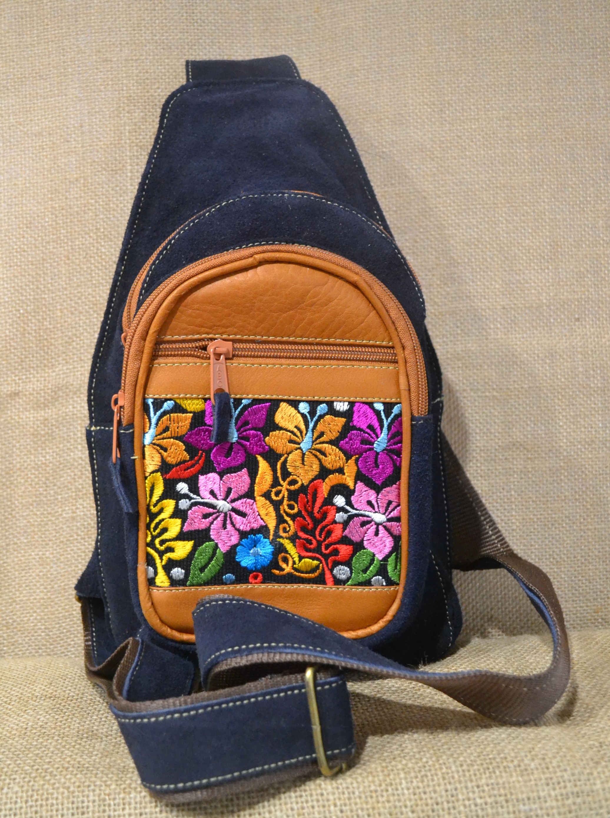 Szukasz torebki innej niż wszystkie , unikalnej w stylu jakiego nikt nie ma . Ten model jest idealny dla ciebie . Sprowadzony przez nas prosto z Ekwadoru . Naturalna  100% wytrzymała skóra zamszowa w kolorze granatowym i haftowane  kolorowe kwiatowe detale to idealne połączenie . Tę torebkę można nosić założona przez plecy jak i przez pierś. Jej krój i szeroki pasek sprawiają że idealnie przylega do każdej sylwetki. Posiada cztery kieszenie zamykane zamkiem błyskawicznym.