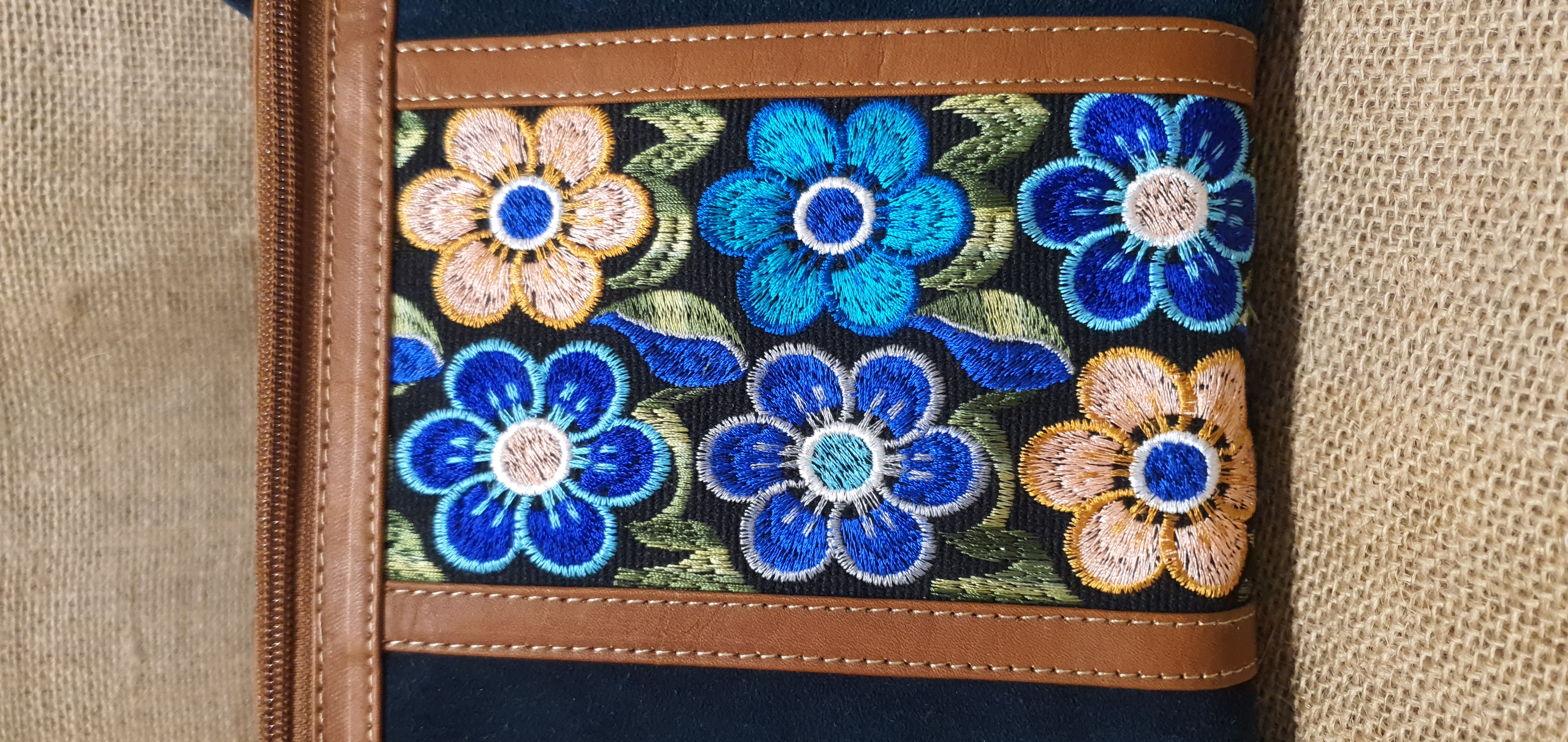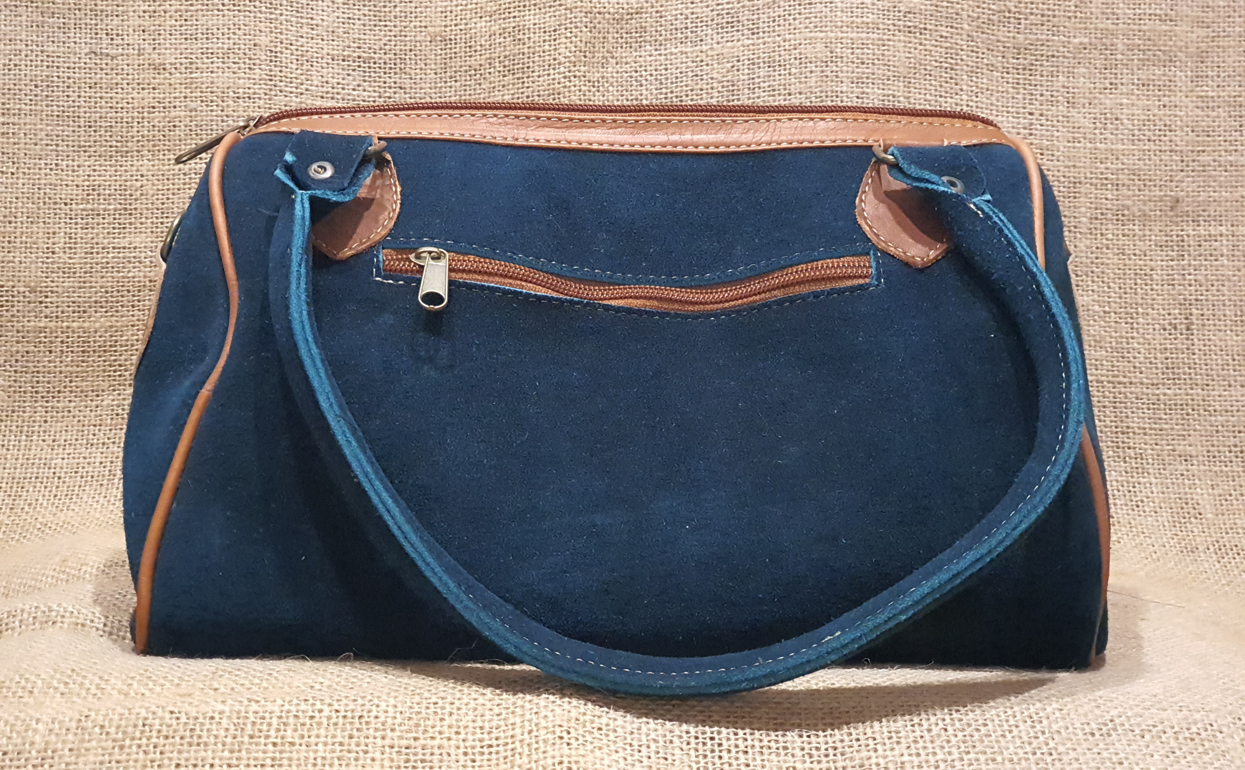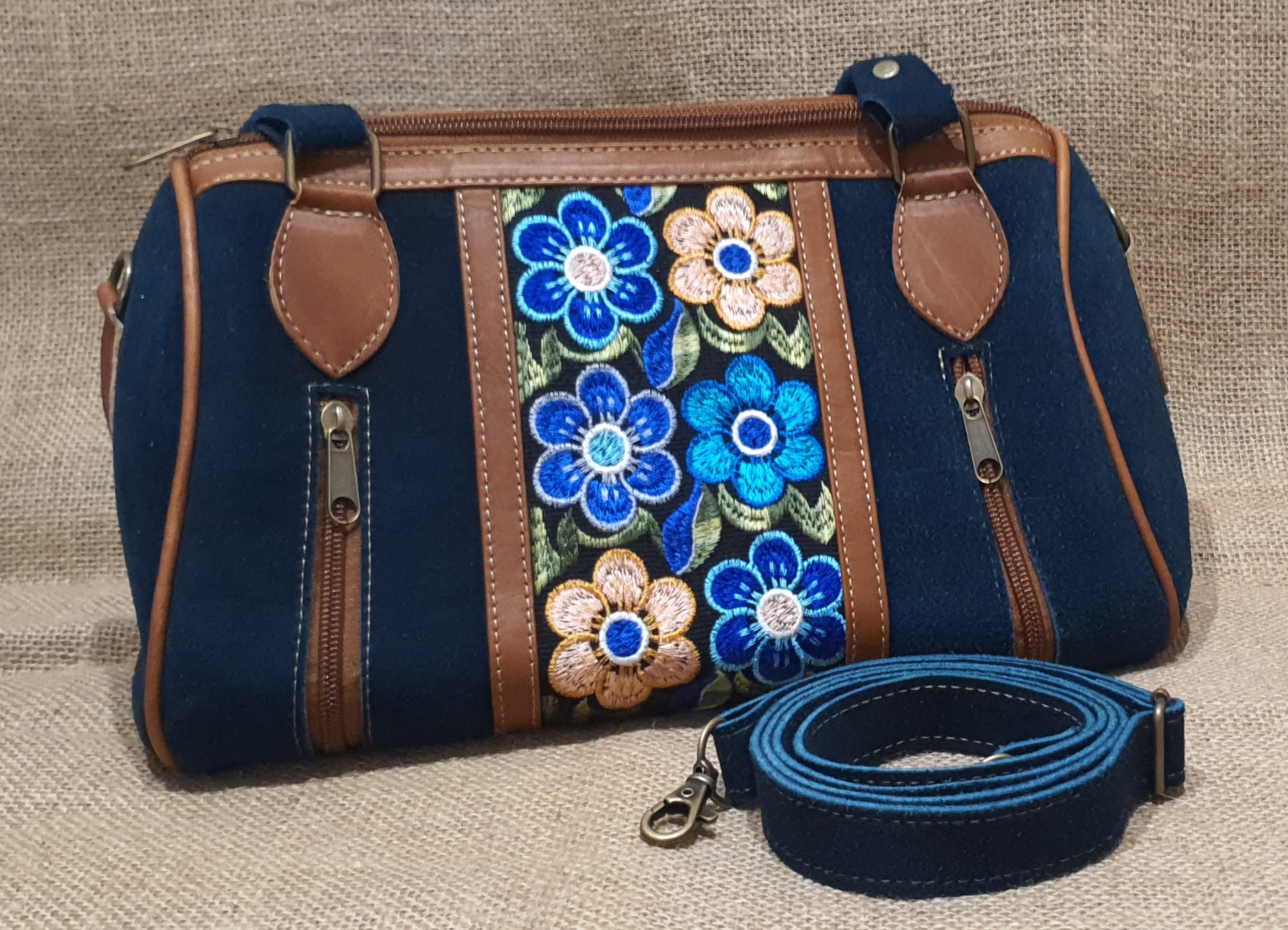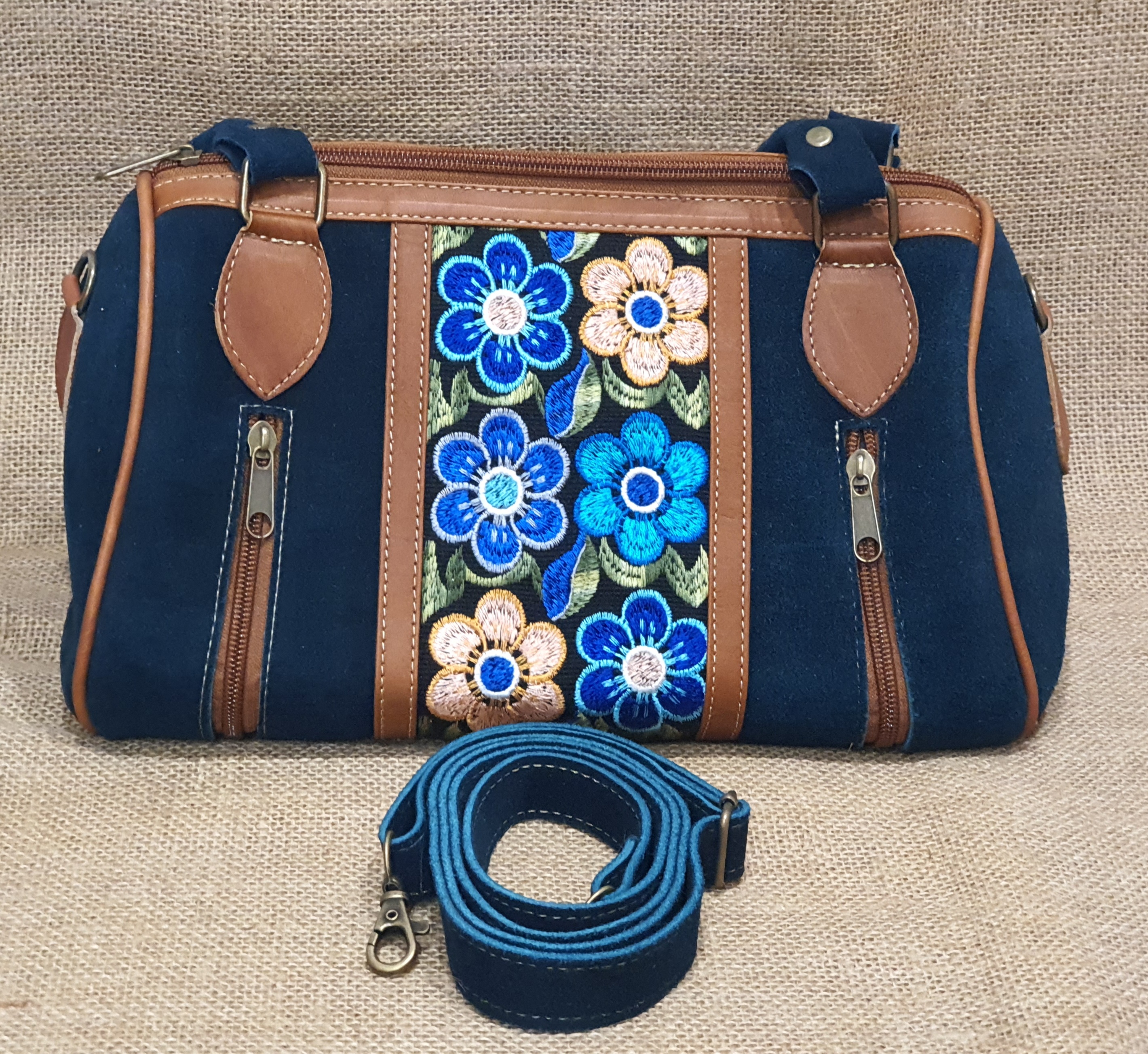 Co powiesz o torebce typu BAUL - kuferek . Wykonana z naturalnej 100% skóry zamszowej w morskim kolorze połączonej z kolorowym andyjskim kwiatowym haftowanym wzorem typowym dla ekwadorskiej kultury .