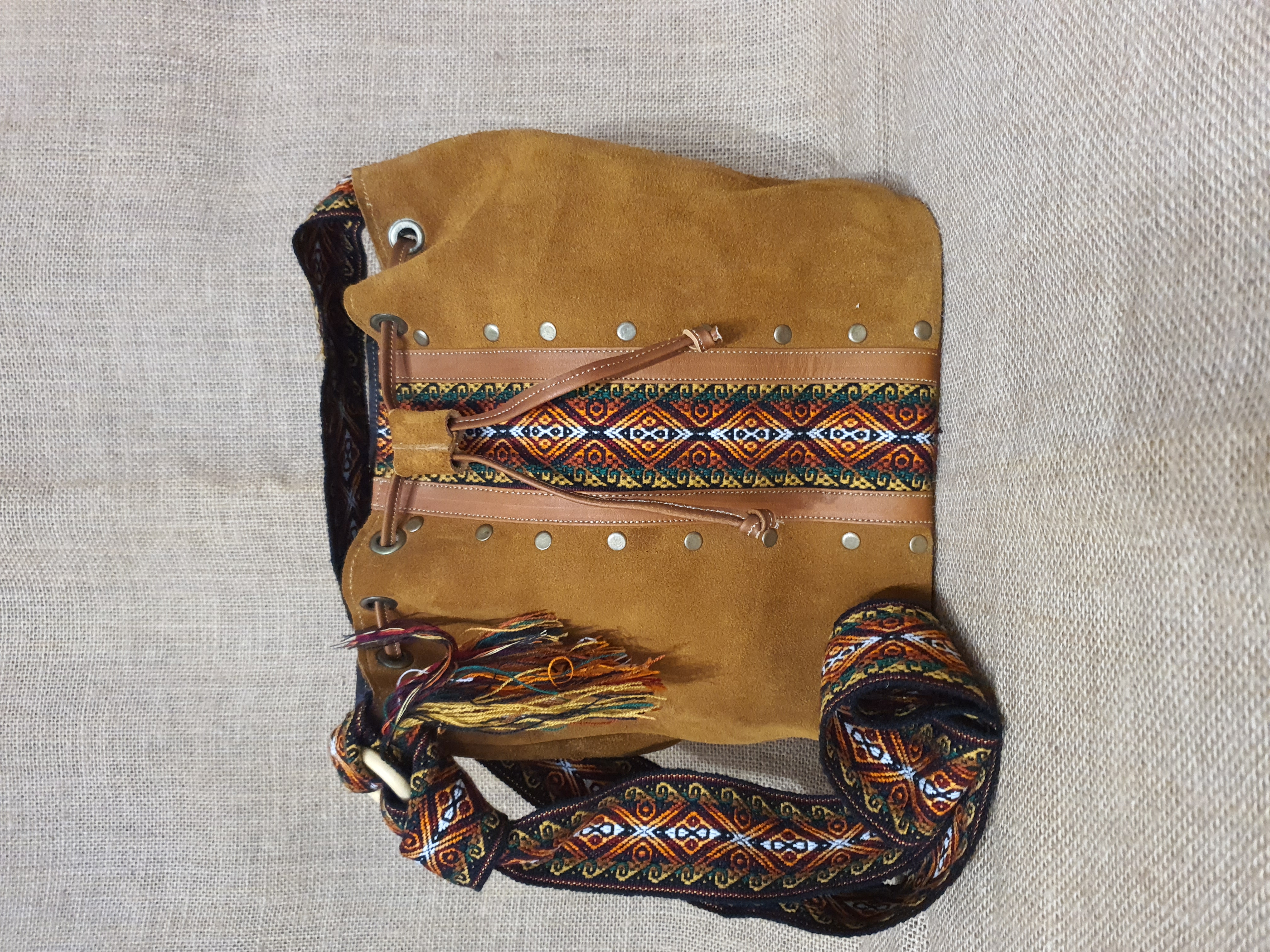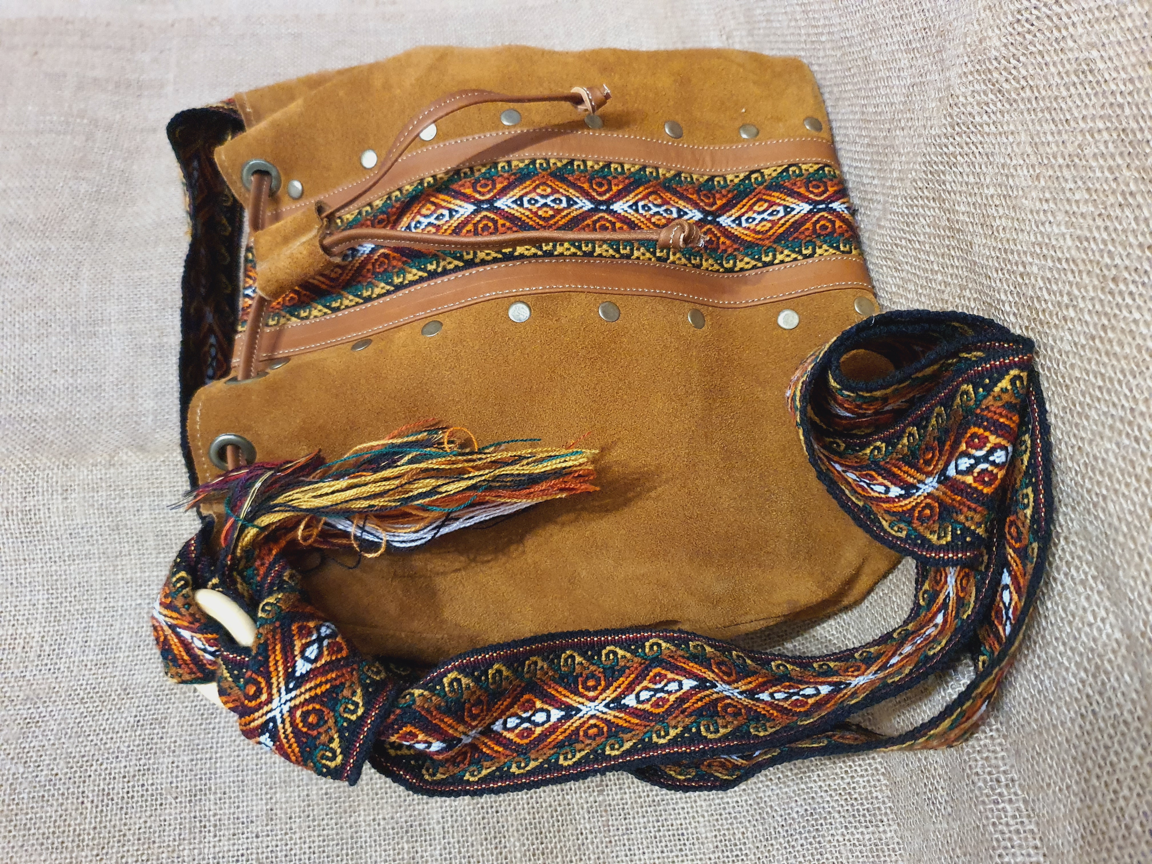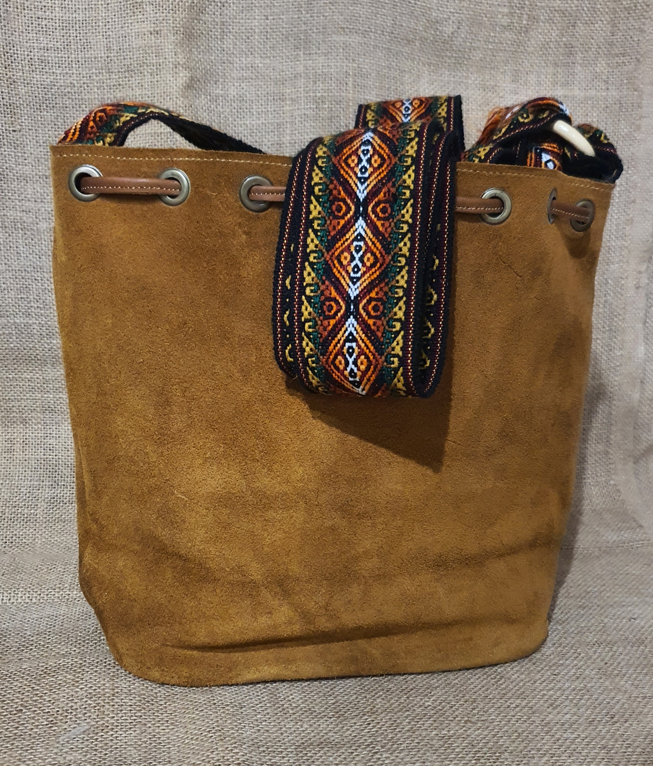 Co powiesz na mix zamszowej jasnobrązowej w 100% naturalnej skóry i oryginalnych etnicznych wzorów pochodzących od Indian Kiczua zamieszkujących po dziś dzień Andyjskie prowincje Ekwadoru . Etniczne wzory zaklęte są w prawdziwym Pasie Chumbi wykonanym z 100% wełny owczej . Torebka ta uszyta została w mały lokalnym warsztacie kaletniczym wysoko w Andach gdzie natura i kultura Indian wciąż nadają rytm codziennego dnia . Torebka typu worek ściągana rzemieniem nadaje się idealnie na codzienne sprawy z jakimi musisz się mierzyć każdego dnia. Torba posiada centralną komorę w która wszyto małą kieszonkę na drobiazgi całość zamykana jest na zamek błyskawiczny.