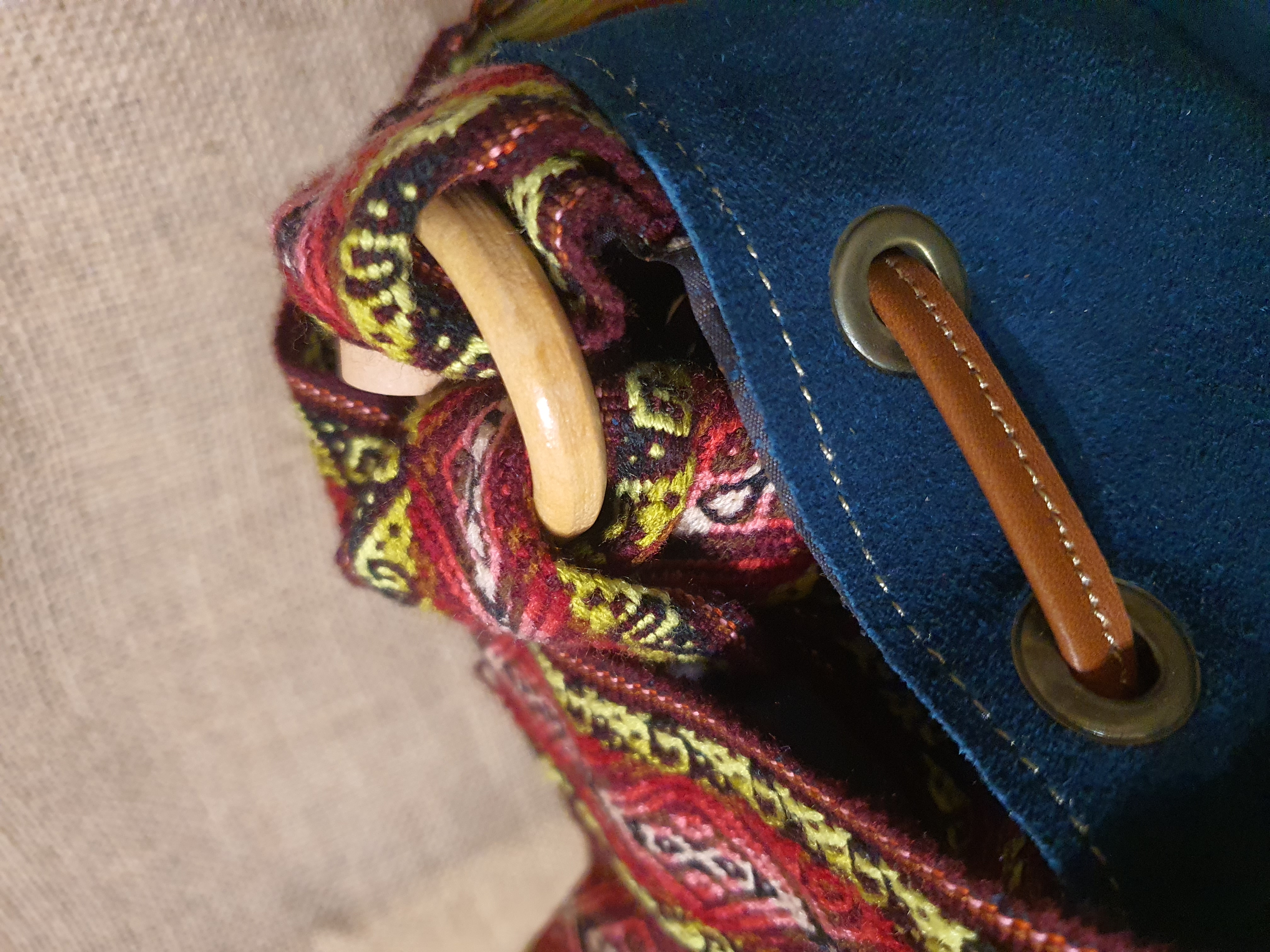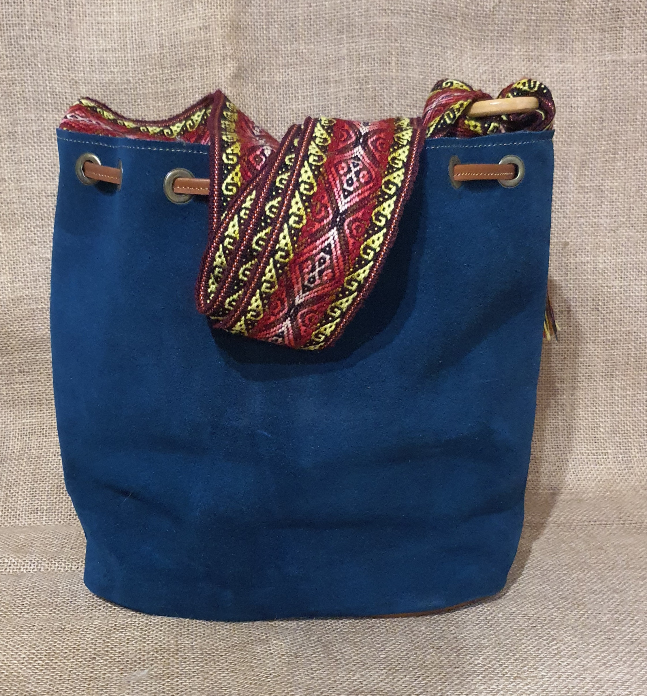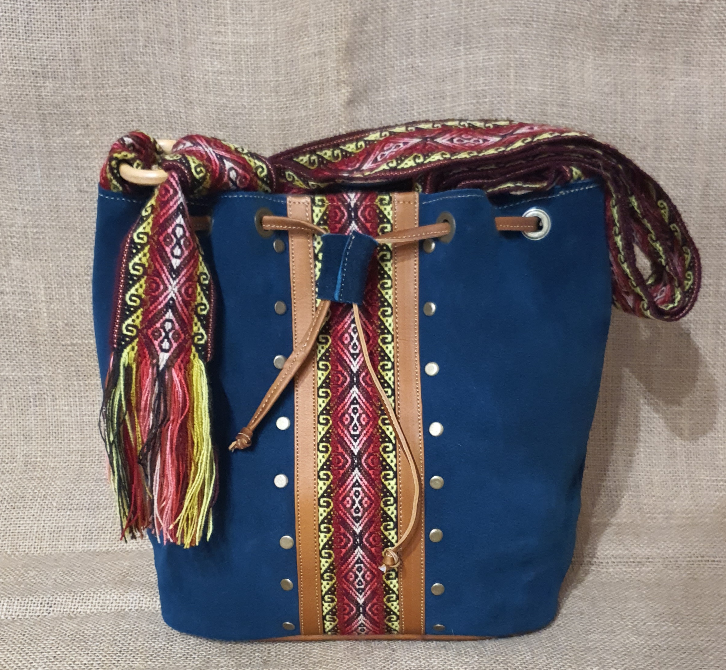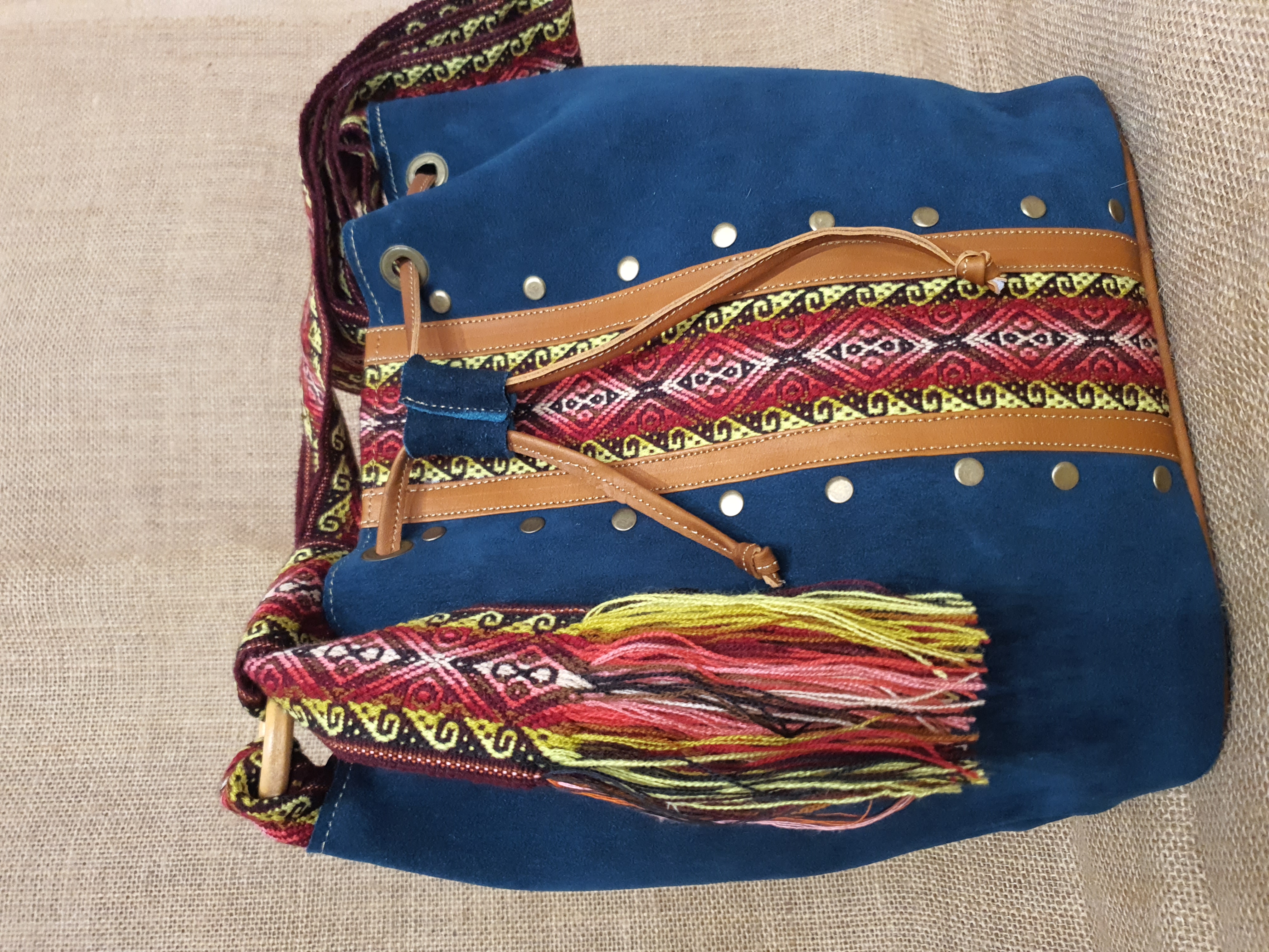 Co powiesz na mix zamszowej w kolorze morskim w 100% naturalnej skóry i oryginalnych etnicznych wzorów pochodzących od Indian Kiczua zamieszkujących po dziś dzień Andyjskie prowincje Ekwadoru . Etniczne wzory zaklęte są w prawdziwym Pasie Chumbi wykonanym z 100% wełny owczej . Torebka ta uszyta została w mały lokalnym warsztacie kaletniczym wysoko w Andach gdzie natura i kultura Indian wciąż nadają rytm codziennego dnia . Torebka typu worek ściągana rzemieniem nadaje się idealnie na codzienne sprawy z jakimi musisz się mierzyć każdego dnia. Torba posiada centralną komorę w która wszyto małą kieszonkę na drobiazgi całość zamykana jest na zamek błyskawiczny.