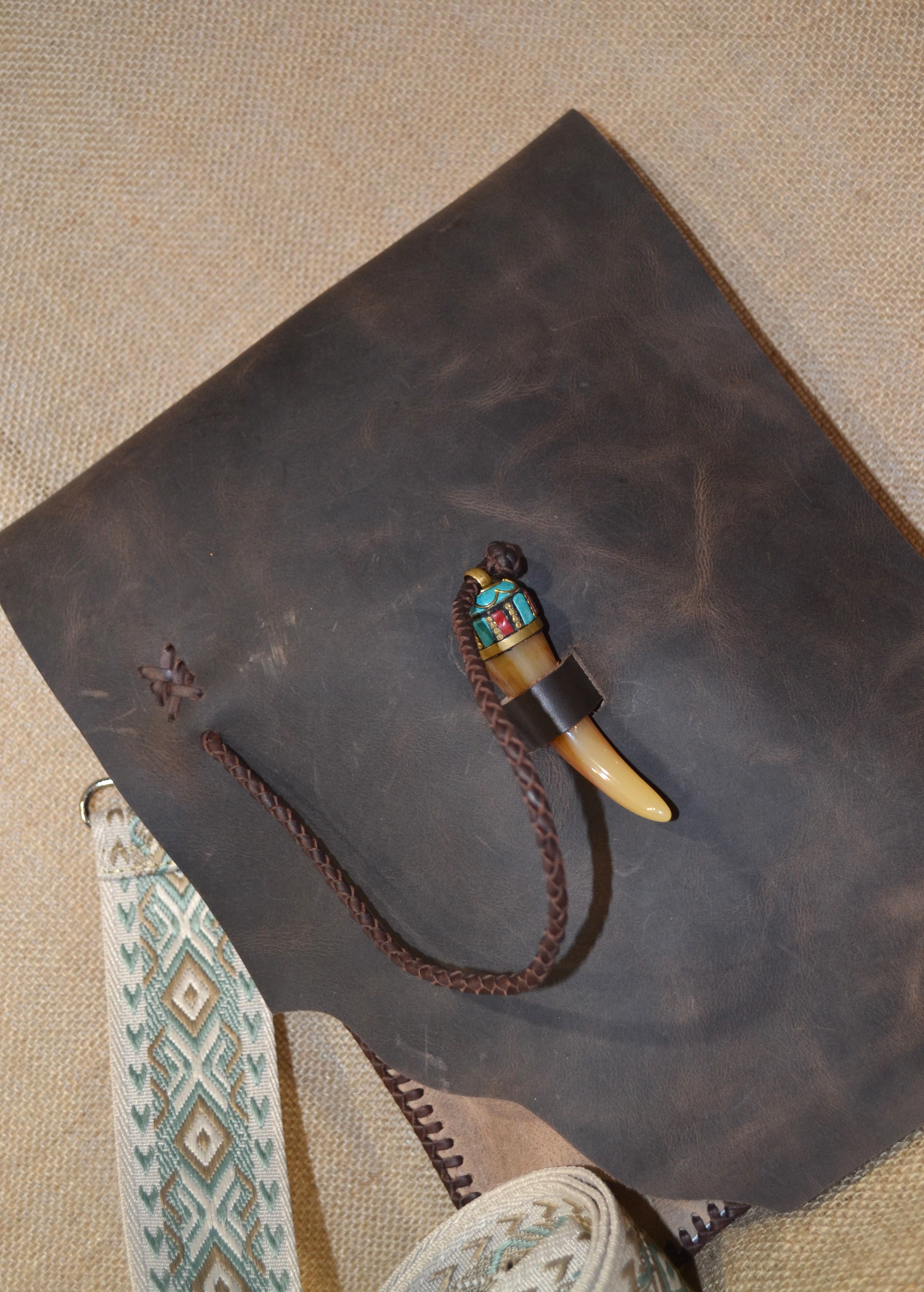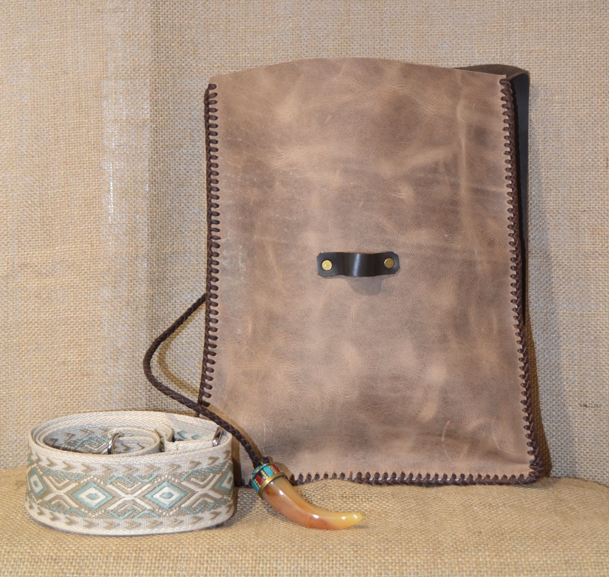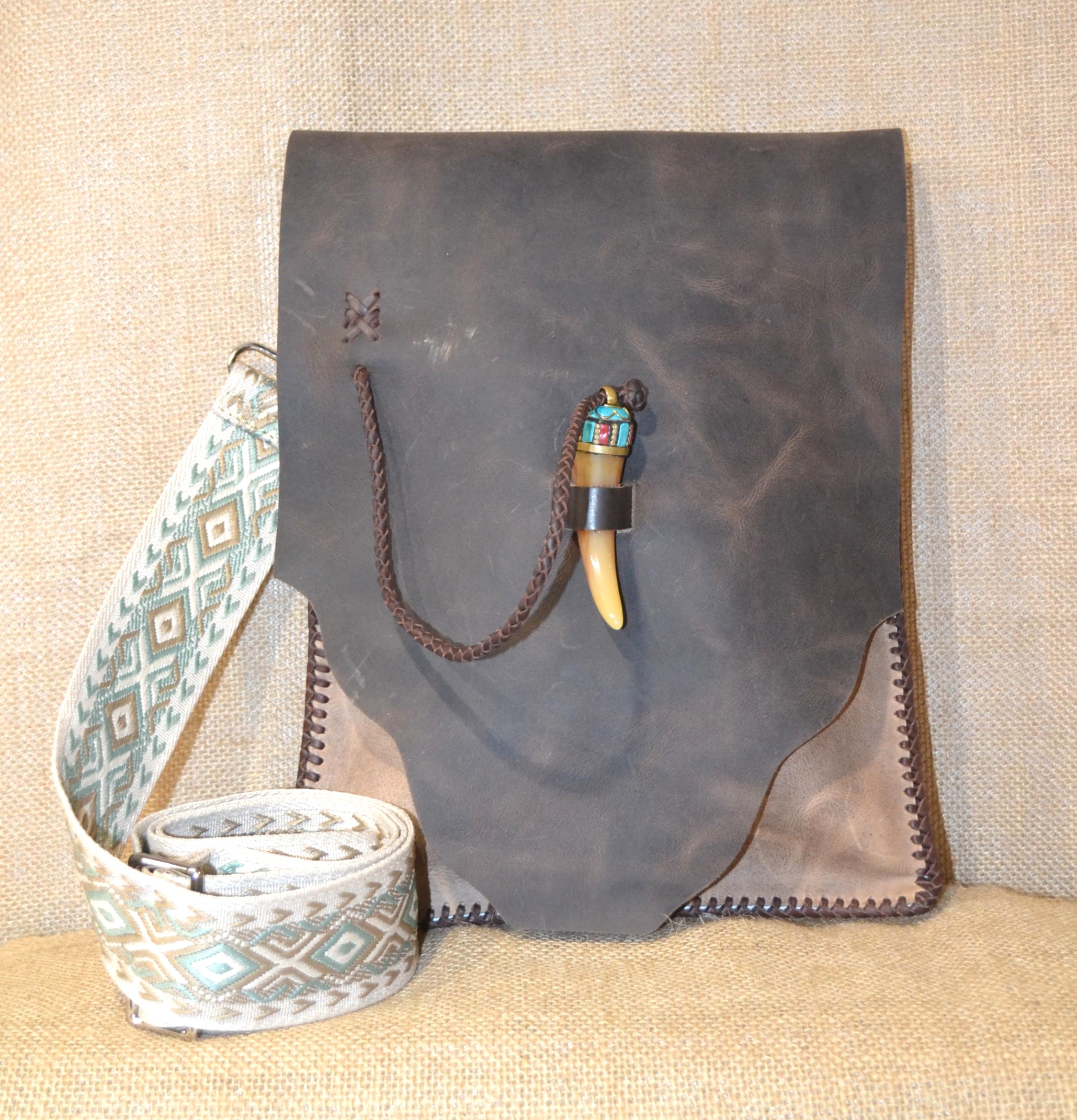 Torebka w stylu vintage . Uszyta w całości ze skóry bydlęcej . Wszystkie elementy torebki zostały zszyte ze sobą ręcznie rzemieniem , specjalnym plecionym szwem. Przednia strona torebki wykonana została z surowej skóry , tylna część oraz klapa zamykająca wnętrze torebki to skórzana imitacja wielkiego liścia . Zamknięcie torebki wykonane zostało z końcówki rogu zawieszonego na plecionym rzemieniu . Torebka zawieszona została na tradycyjnym Ekwadorskim pasie chumbi pokrytym etnicznymi andyjskimi wzorami , wykonanym z wełny owczej . Całość wygląda jak wyjęta prosto z Amazońskiej Dżungli .