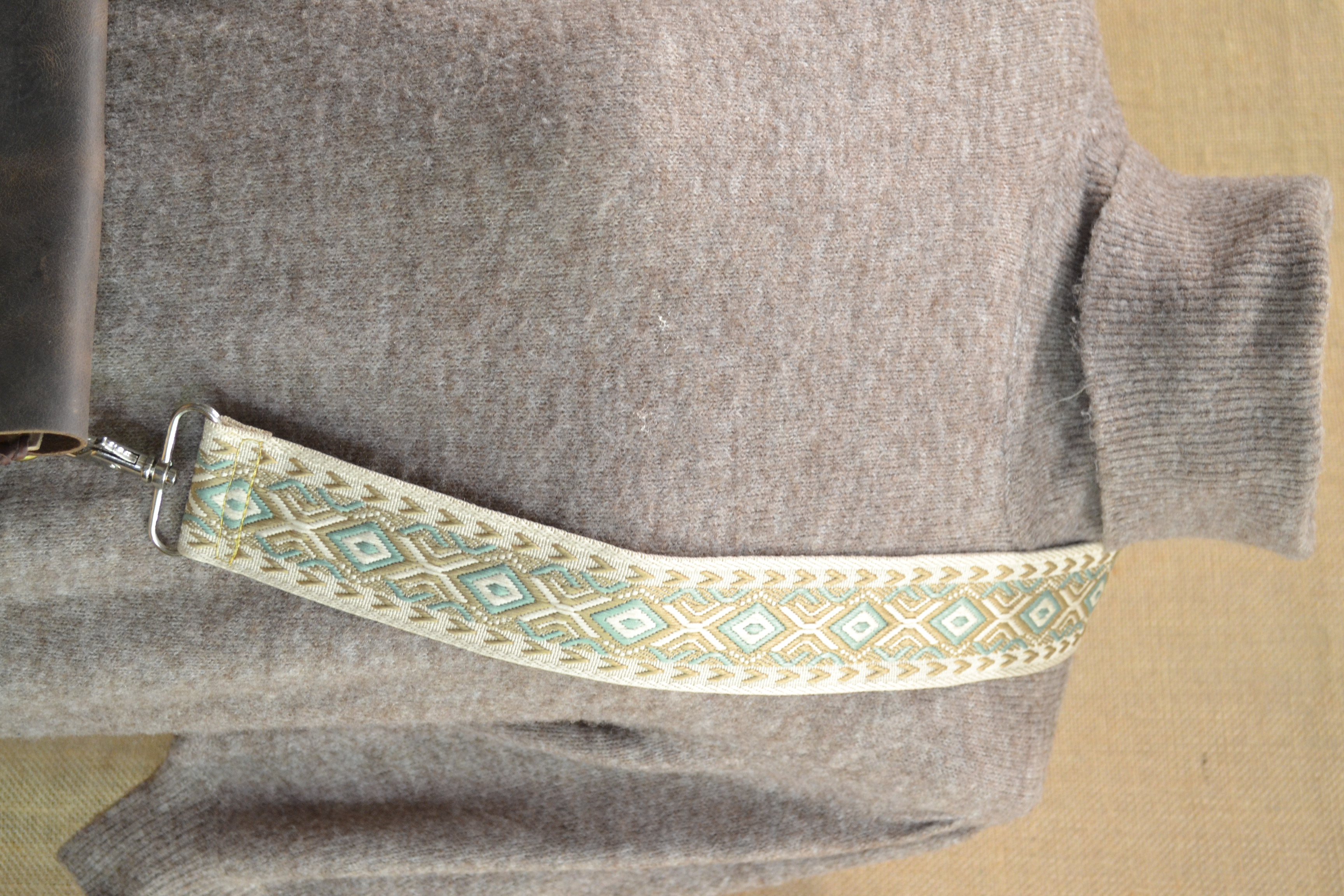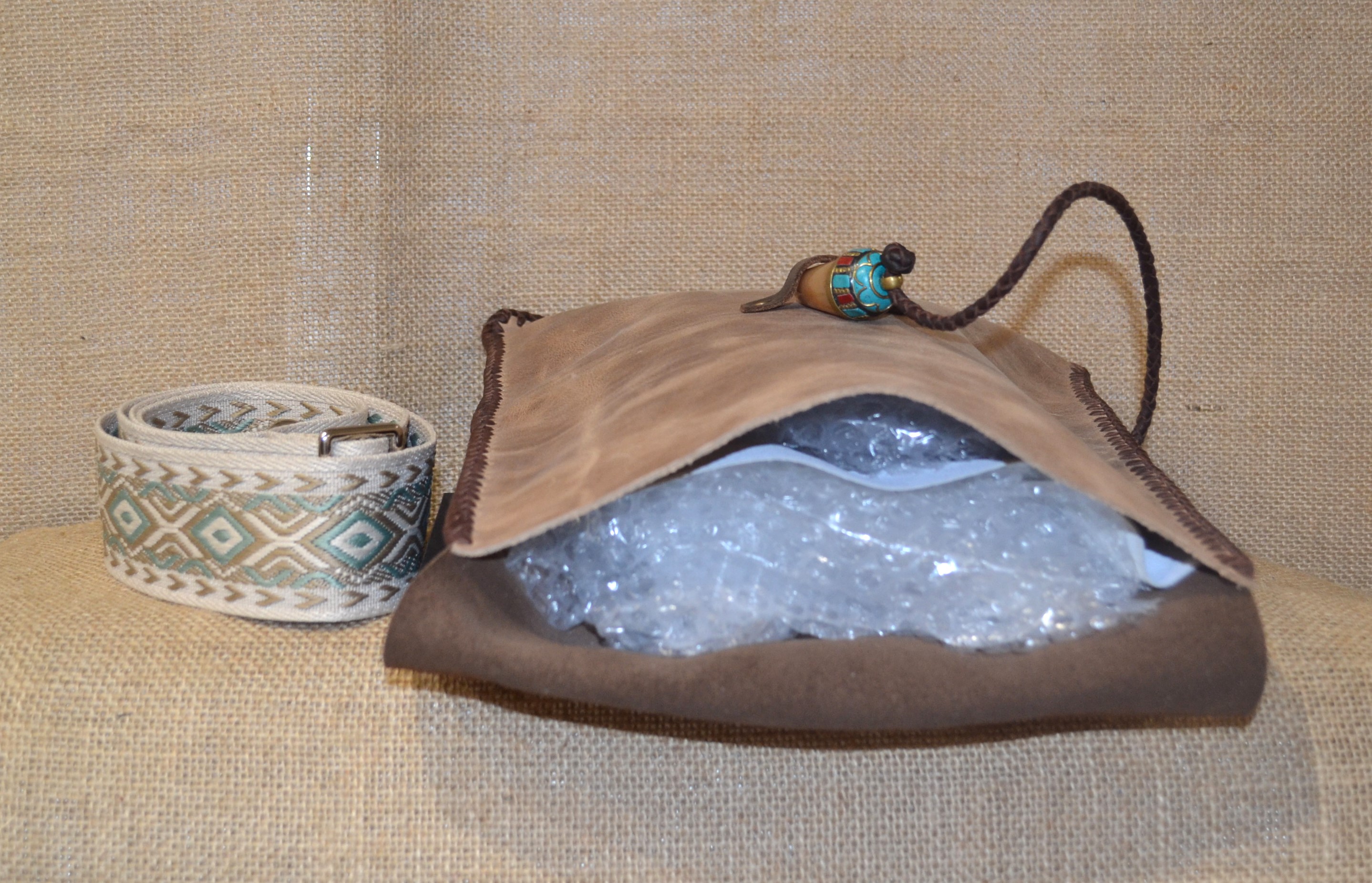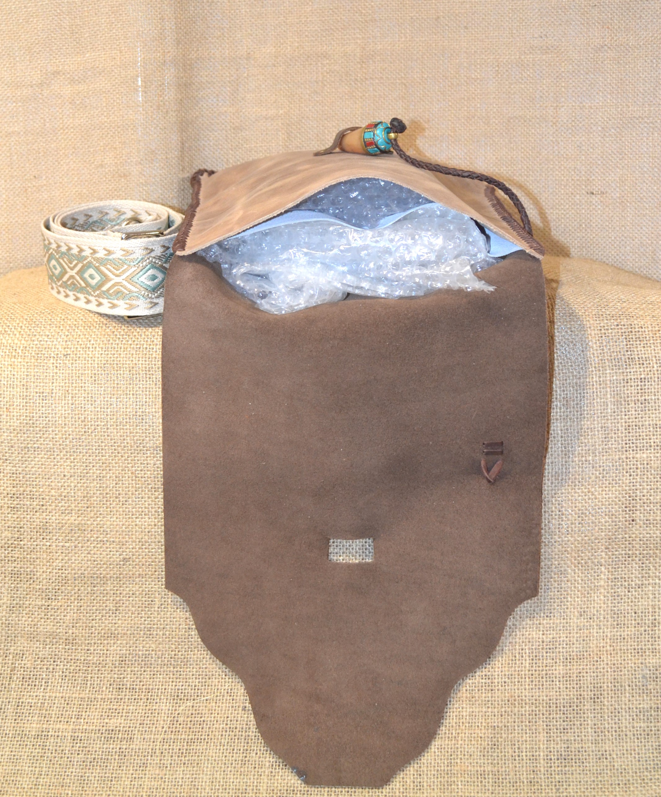 Torebka w stylu vintage . Uszyta w całości ze skóry bydlęcej . Wszystkie elementy torebki zostały zszyte ze sobą ręcznie rzemieniem , specjalnym plecionym szwem. Przednia strona torebki wykonana została z surowej skóry , tylna część oraz klapa zamykająca wnętrze torebki to skórzana imitacja wielkiego liścia . Zamknięcie torebki wykonane zostało z końcówki rogu zawieszonego na plecionym rzemieniu . Torebka zawieszona została na tradycyjnym Ekwadorskim pasie chumbi pokrytym etnicznymi andyjskimi wzorami , wykonanym z wełny owczej . Całość wygląda jak wyjęta prosto z Amazońskiej Dżungli .