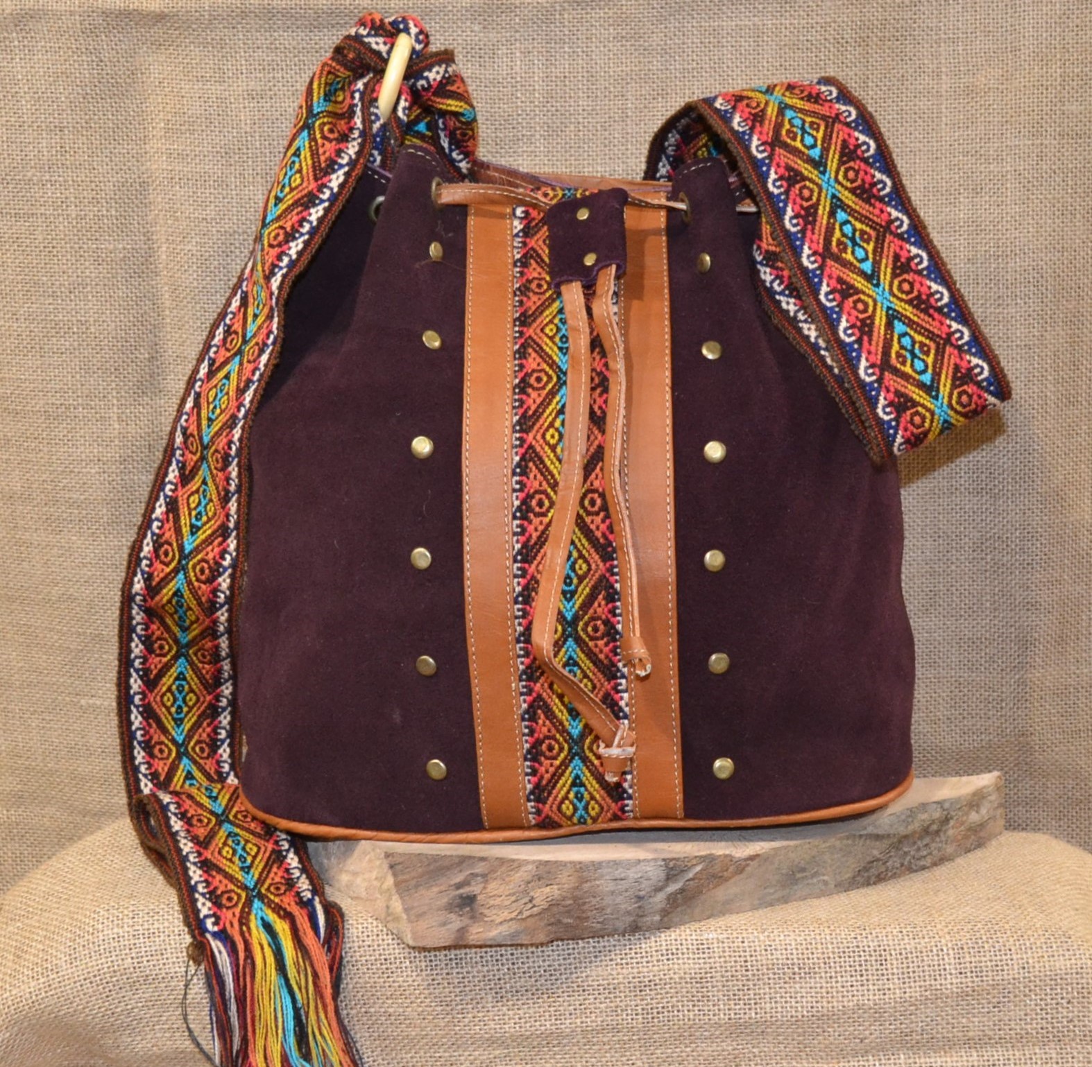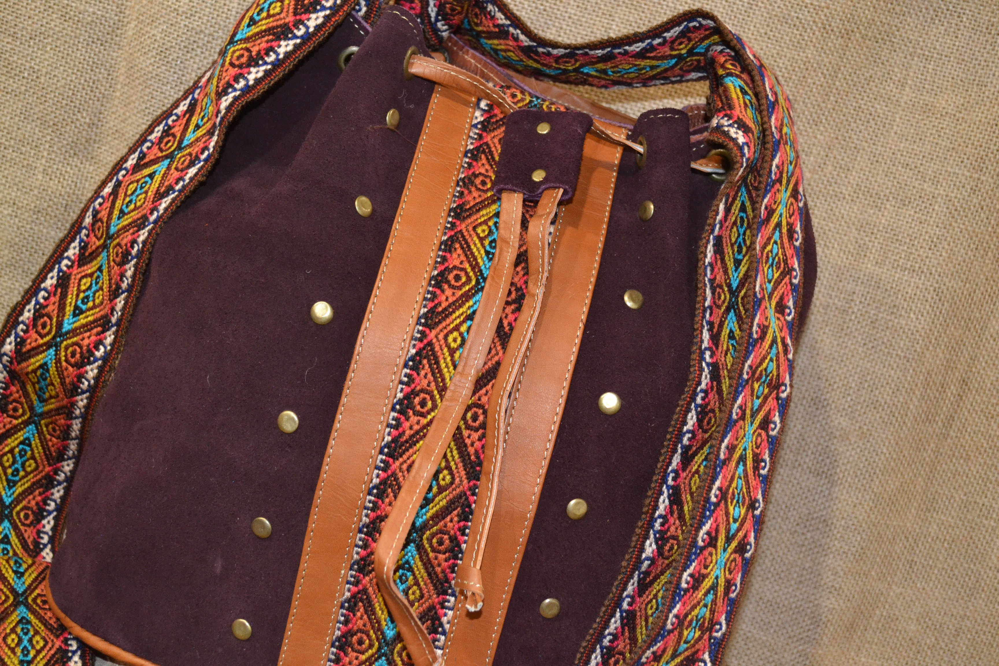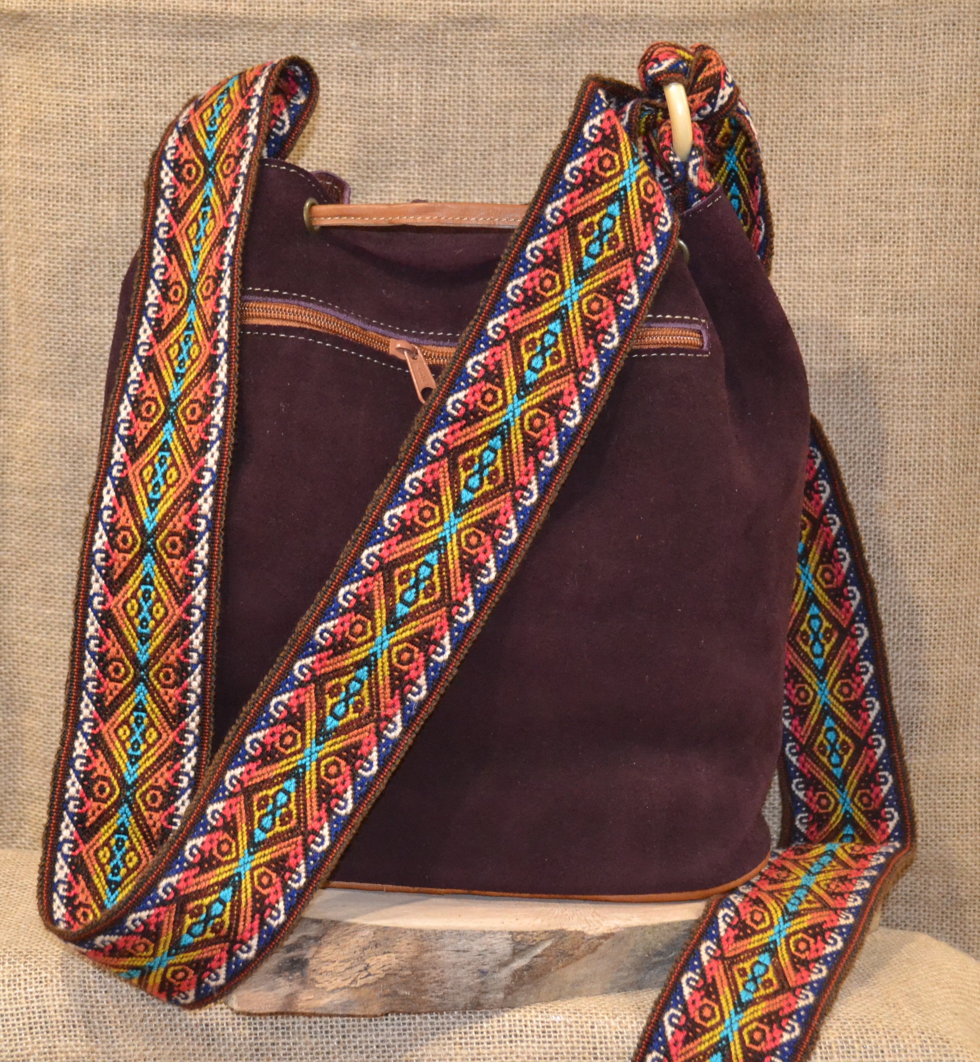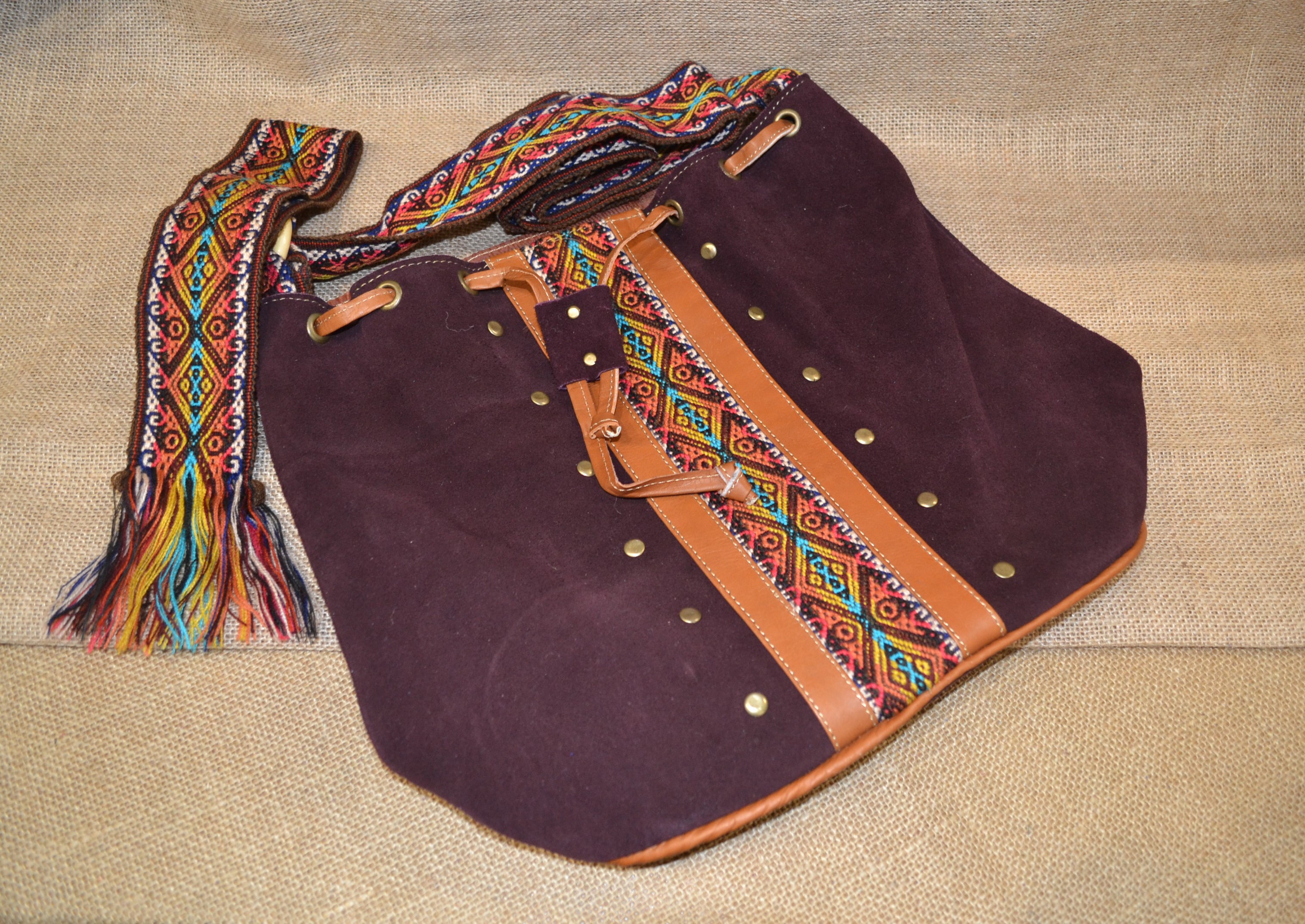 Co powiesz na mix zamszowej 100% naturalnej skóry w bordowym kolorze i oryginalnych etnicznych wzorów pochodzących od Indian Kiczua zamieszkujących po dziś dzień Andyjskie prowincje Ekwadoru . Etniczne wzory zaklęte są w prawdziwym Pasie Chumbi wykonanym z 100% wełny owczej . Torebka ta uszyta została w mały lokalnym warsztacie kaletniczym wysoko w Andach gdzie natura i kultura Indian wciąż nadają rytm codziennego dnia . Torebka typu worek ściągana rzemieniem nadaje się idealnie na codzienne sprawy z jakimi musisz się mierzyć każdego dnia. Torba posiada centralną komorę w która wszyto małą kieszonkę na drobiazgi całość zamykana jest na zamek błyskawiczny.