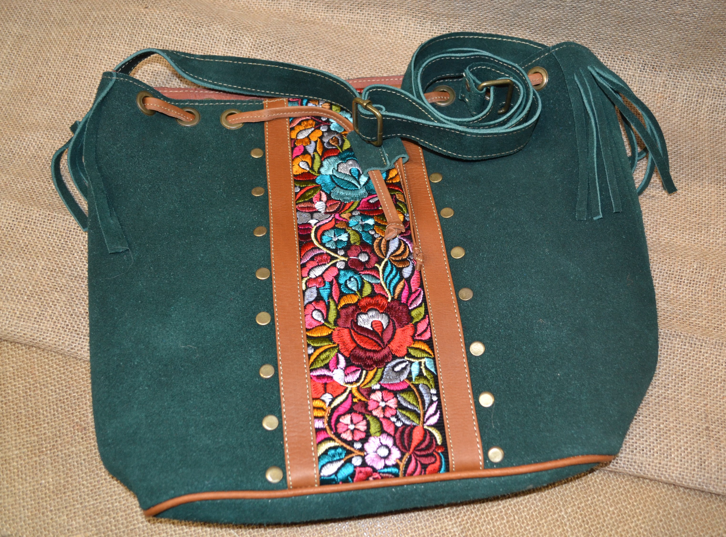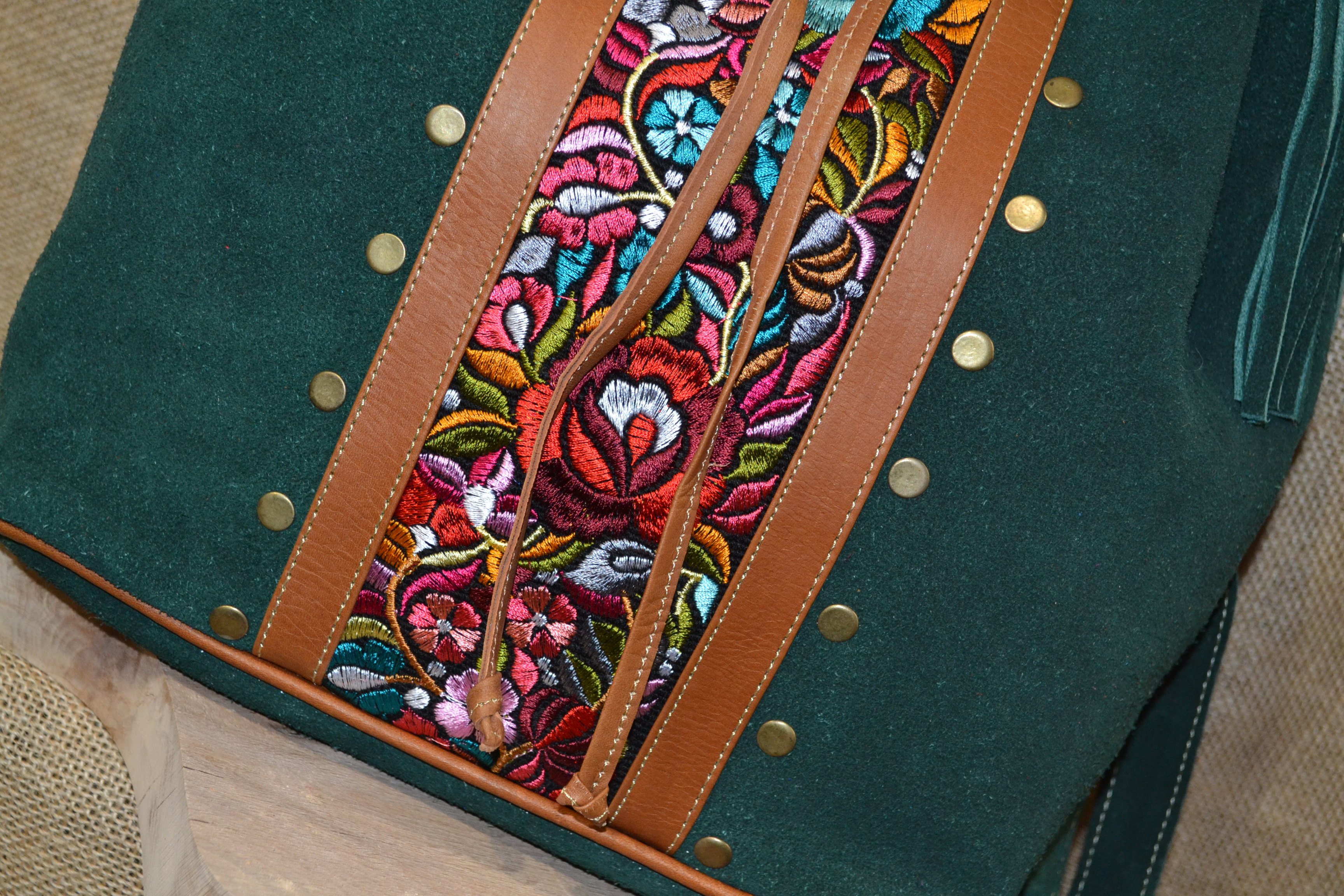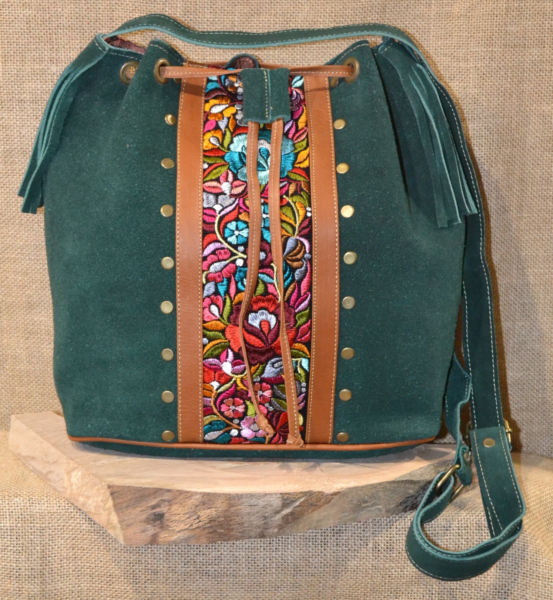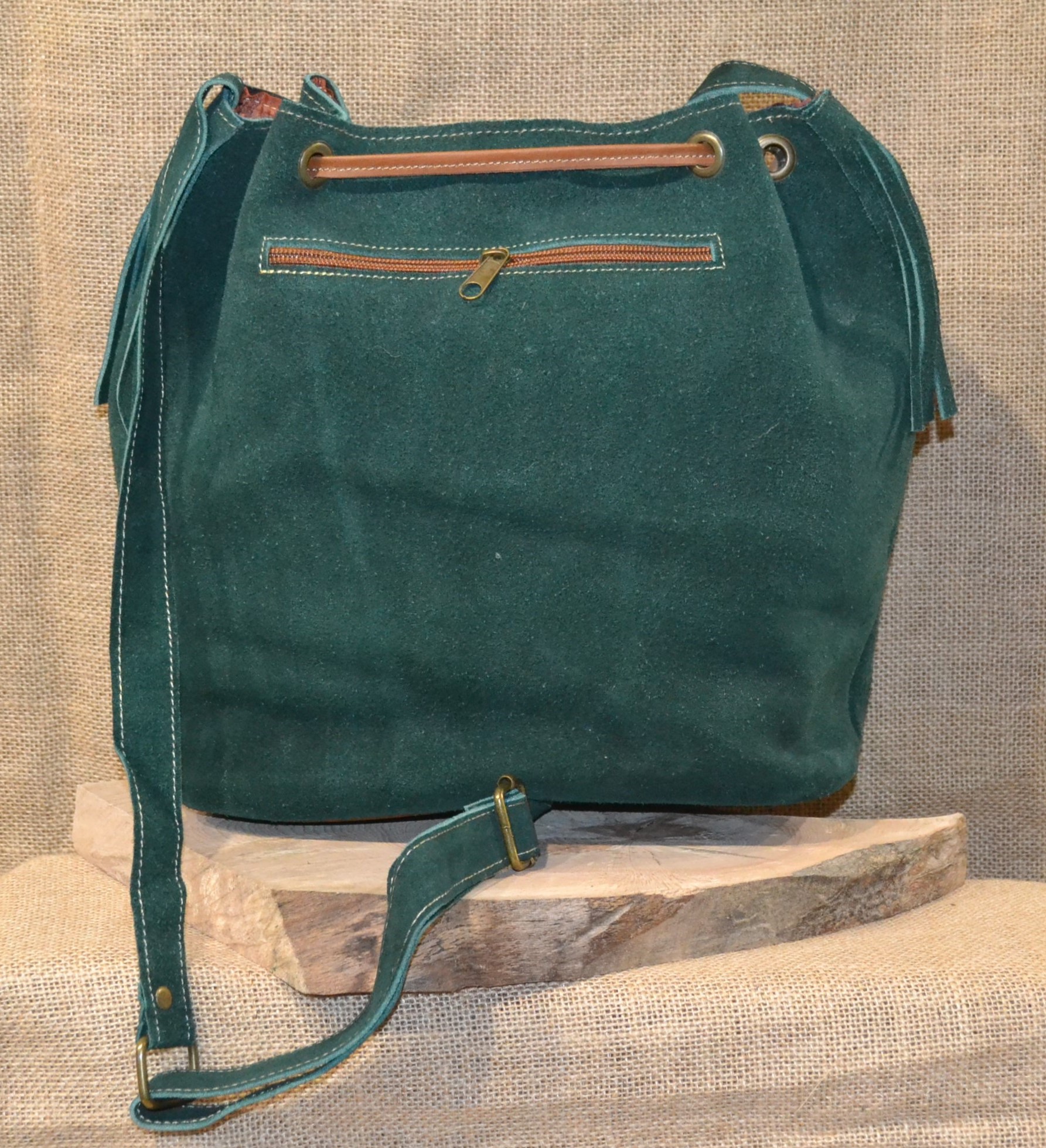 Co powiesz na mix zamszowej 100% naturalnej skóry w ciemnozielonym kolorze i oryginalnych etnicznych wzorów pochodzących od Indian Kiczua zamieszkujących po dziś dzień Andyjskie prowincje Ekwadoru . Torebka ta uszyta została w mały lokalnym warsztacie kaletniczym wysoko w Andach gdzie natura i kultura Indian wciąż nadają rytm codziennego dnia . Torebka typu worek ściągana rzemieniem nadaje się idealnie na codzienne sprawy z jakimi musisz się mierzyć każdego dnia. Torba posiada centralną komorę w która wszyto małą kieszonkę na drobiazgi.