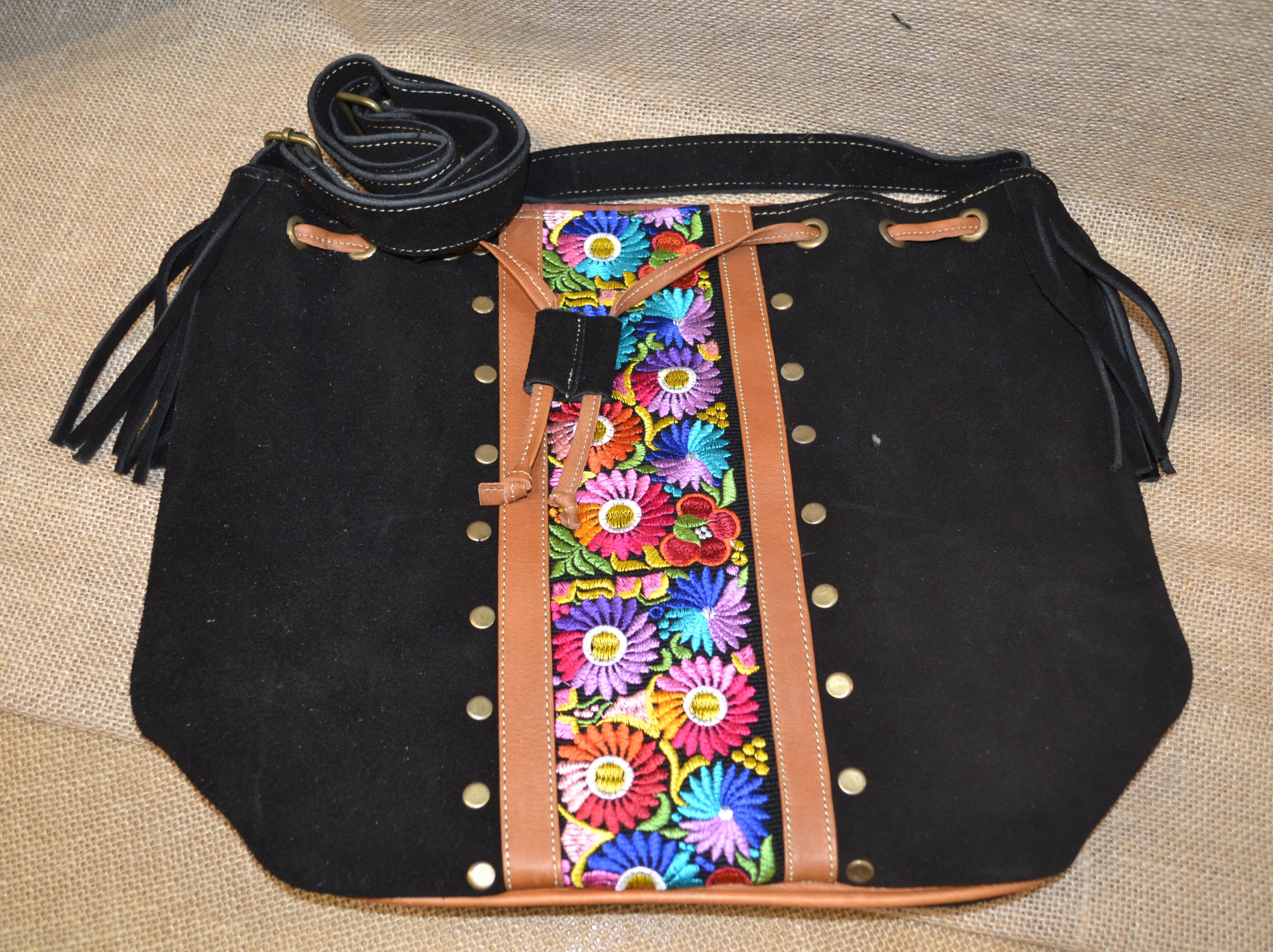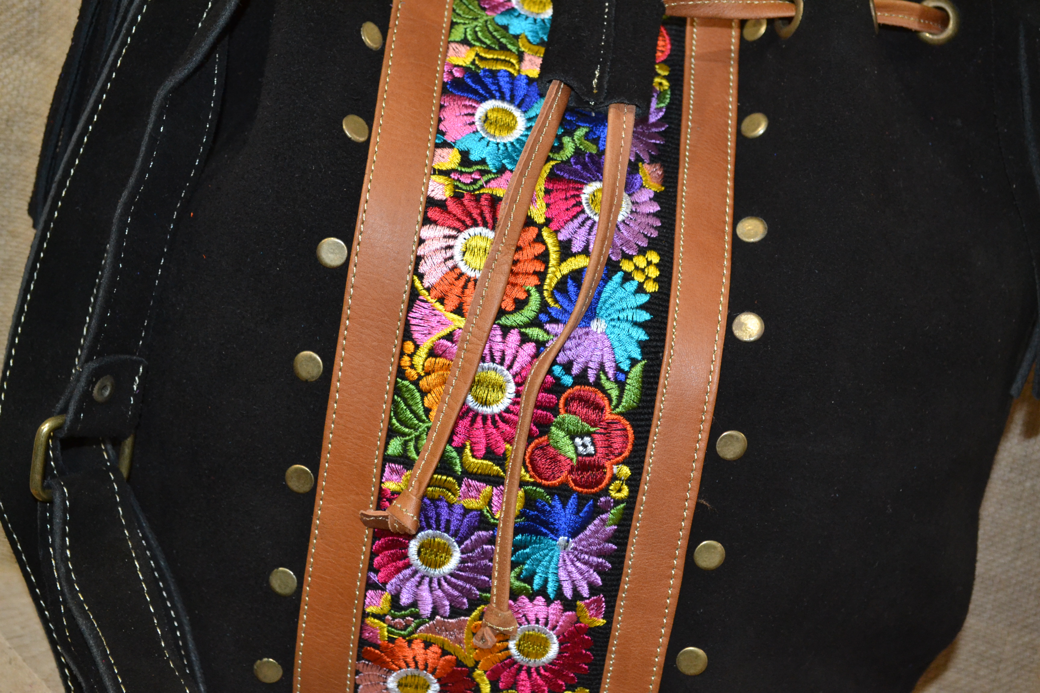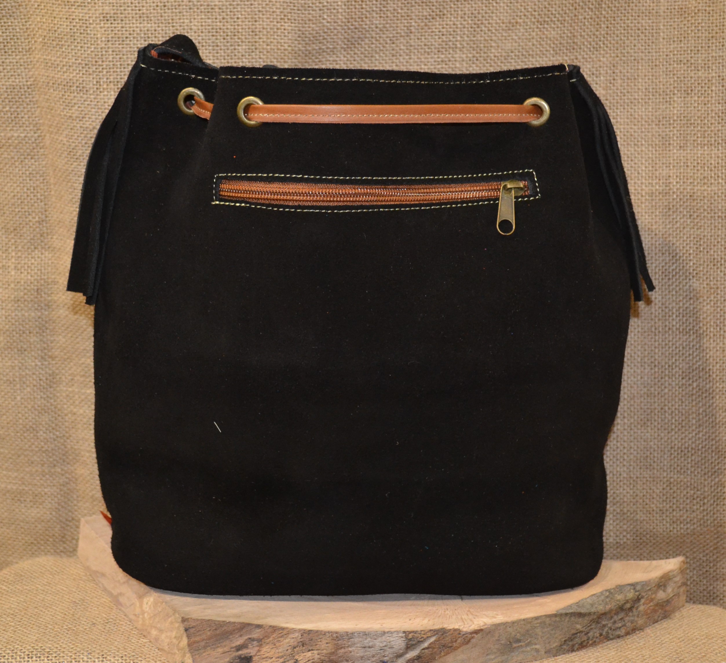 Co powiesz na mix zamszowej 100% naturalnej skóry w czarnym kolorze i oryginalnych etnicznych wzorów pochodzących od Indian Kiczua zamieszkujących po dziś dzień Andyjskie prowincje Ekwadoru . Torebka ta uszyta została w mały lokalnym warsztacie kaletniczym wysoko w Andach gdzie natura i kultura Indian wciąż nadają rytm codziennego dnia . Torebka typu worek ściągana rzemieniem nadaje się idealnie na codzienne sprawy z jakimi musisz się mierzyć każdego dnia. Torba posiada centralną komorę w która wszyto małą kieszonkę na drobiazgi.